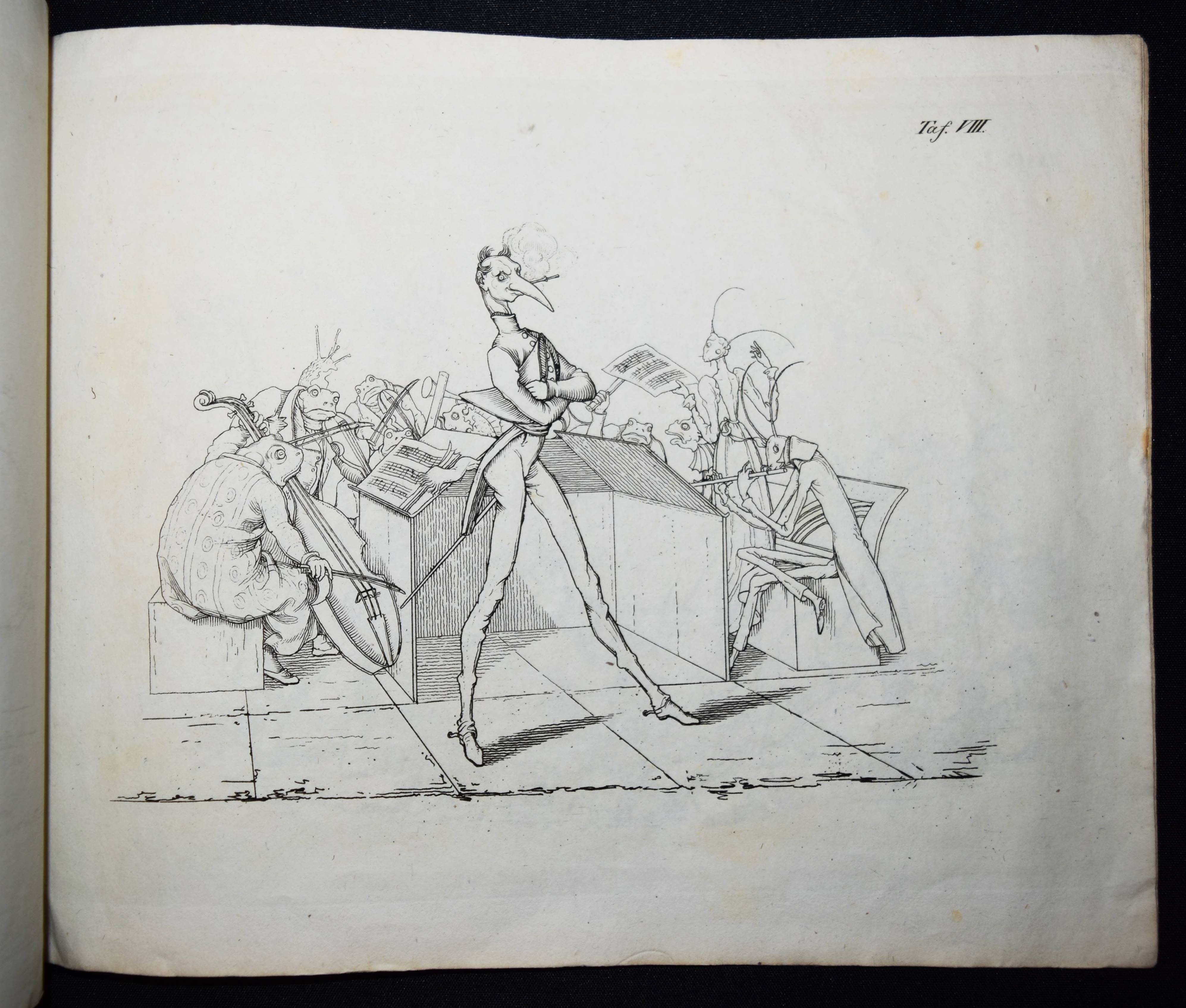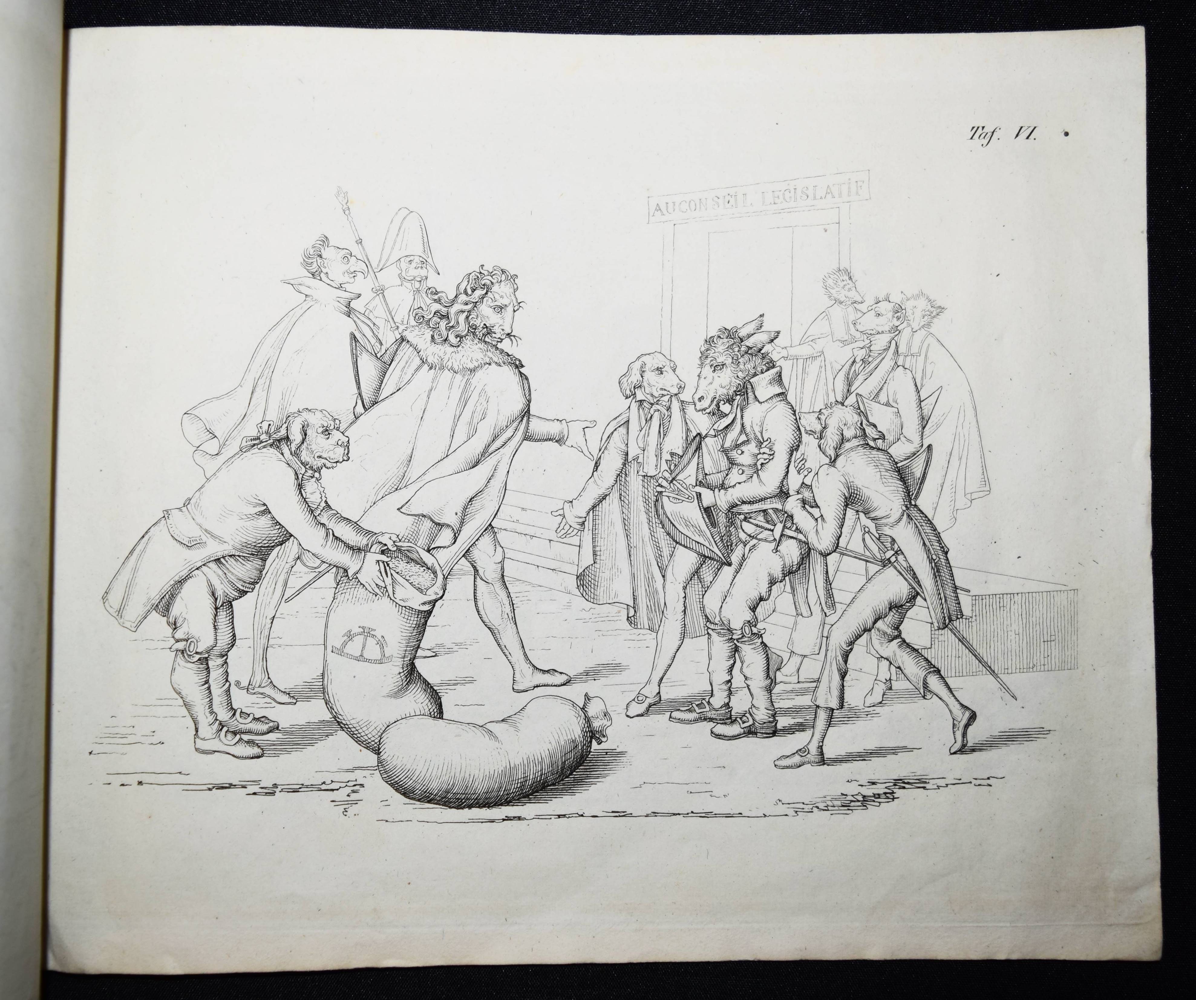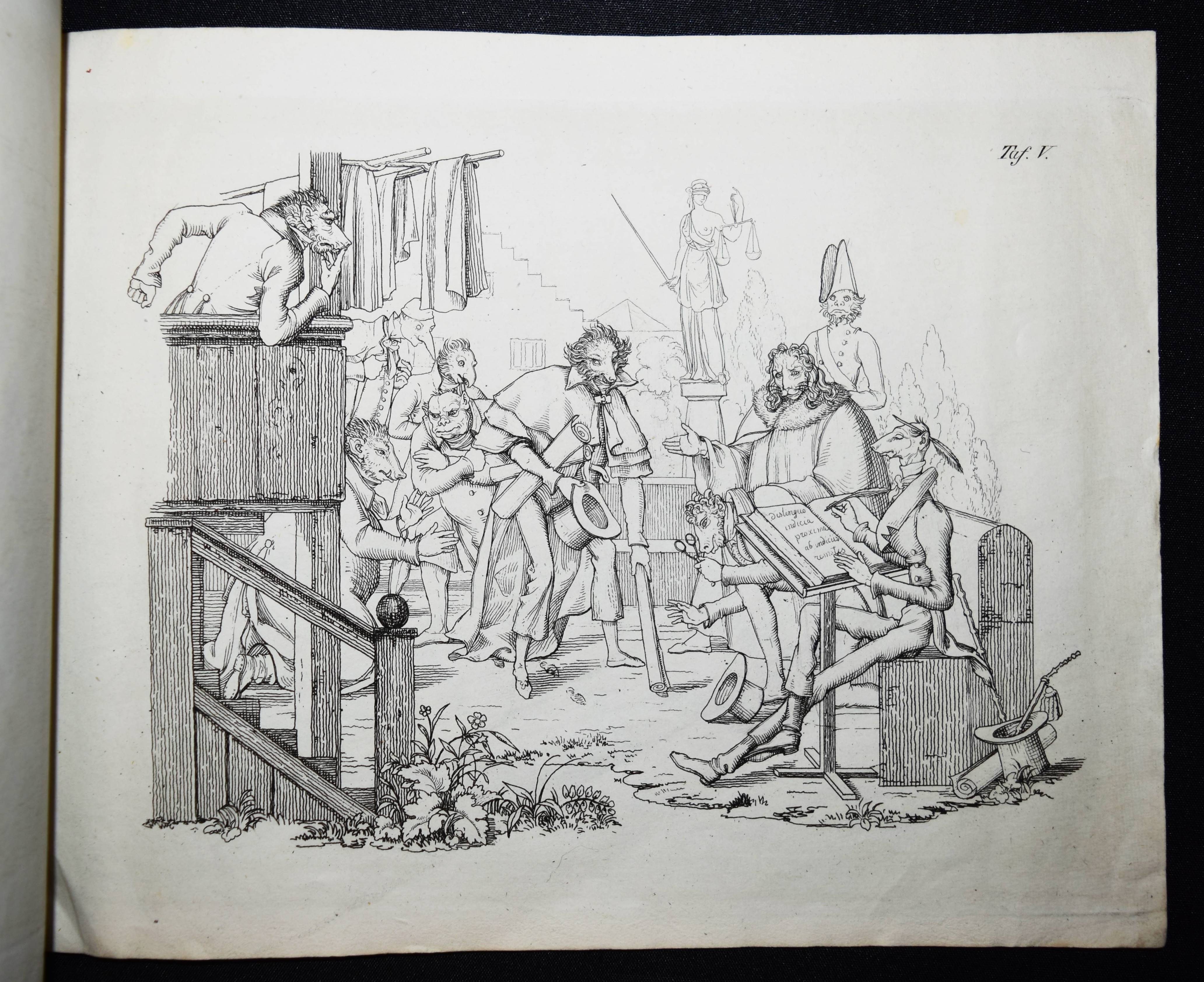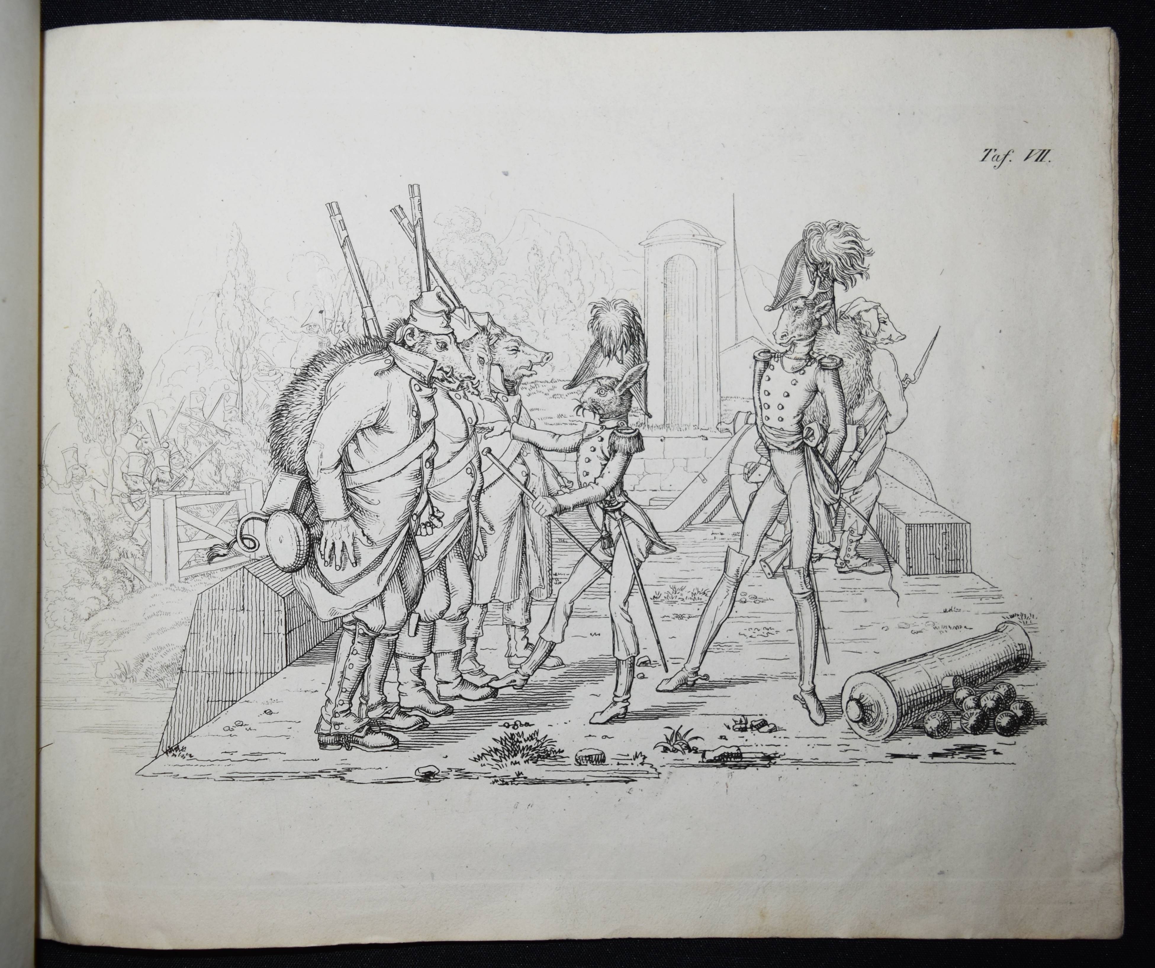 Fröhlich, Abraham Emanuel. Hundert neue Fabeln. (Und): M(artin) Distelli’s Umrisse zu A. E. Fröhlichs Fabeln. 2 Bände. Aarau, Sauerländer 1825 u. (1829). Kl.-8° u. Quer-8°. 104 S.; gestoch. illustr. Titel u. 9 Kupfer-Tafeln. Typogr. OBr. Bodemann 266.1. Rümann 328. – Erste Ausgabe, mit den skurrilen Umrisskupfern von Martin Disteli (1802-1844). – „Frisch nach dem Leben gezeichnet und ohne aufdringliche Hervorhebung der Moral wie um ihrer selbst willen da, begründeten sie mit einem Schlage ihres Dichters Ruf. Eine zweite vermehrte Auflage (1829) begleitete der bekannte Martin Disteli aus Olten mit einem Hefte kecker satirischer Umrisse“ (ADB VIII, 131). – Die Radierungen „entstanden seit ca. 1828… witzig-lebendige, karikierende Darstellungen von Tiergruppen in menschlichen Kostümen bzw. Uniformen und politisch-gesellschaftlich akzentuierten Situationen“ (U. Bodemann). – Umschlag des Textbandes etwas fleckig, Text teils stärker stockfleckig, der Tafelband sauber und sehr gut erhalten.