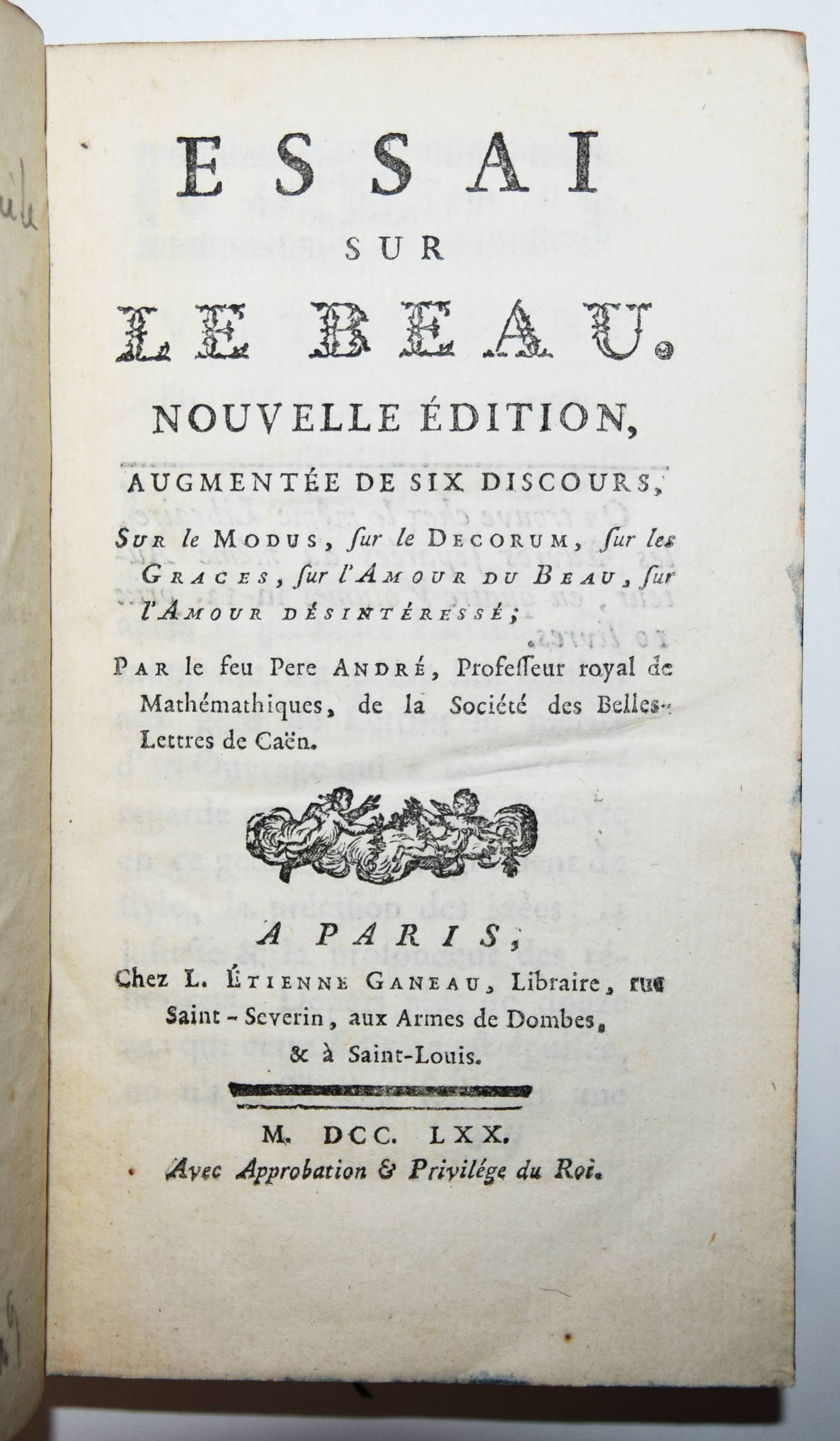 (L’Isle) André, (Yves Marie de). Essai sur le beau. Nouvelle édition, augmentée de six discours, sur le modus, sur le decorum, sur les graces, sur l’amour du beau, sur l’amour désintéressé. 2 Teile in 1 Band. Paris, Etienne Ganeau 1770. 8°. VII, (5), 501 S. Marm. Kalbslederband d. Zt. mit goldgepr. Rückenschild u. floraler Rückenvergoldung. De Bakker-Sommervogel I, 334. – Erweiterte Neuauflage des Klassikers zur Ästhetik. – Die Erstausgabe von 1741 enthielt nur vier und nicht wie hier zehn „Discours“. Das Werk beeinflusste massgeblich die Kunst- und Architekturtheorie der Zeit. – Der franz. Jesuit, Mathematiker und Philosoph Y. M. André (1675-1765) war Prof. für Mathematik in Caen. – Gelenke etwas berieben, schönes dekorativ gebundenes Exemplar.