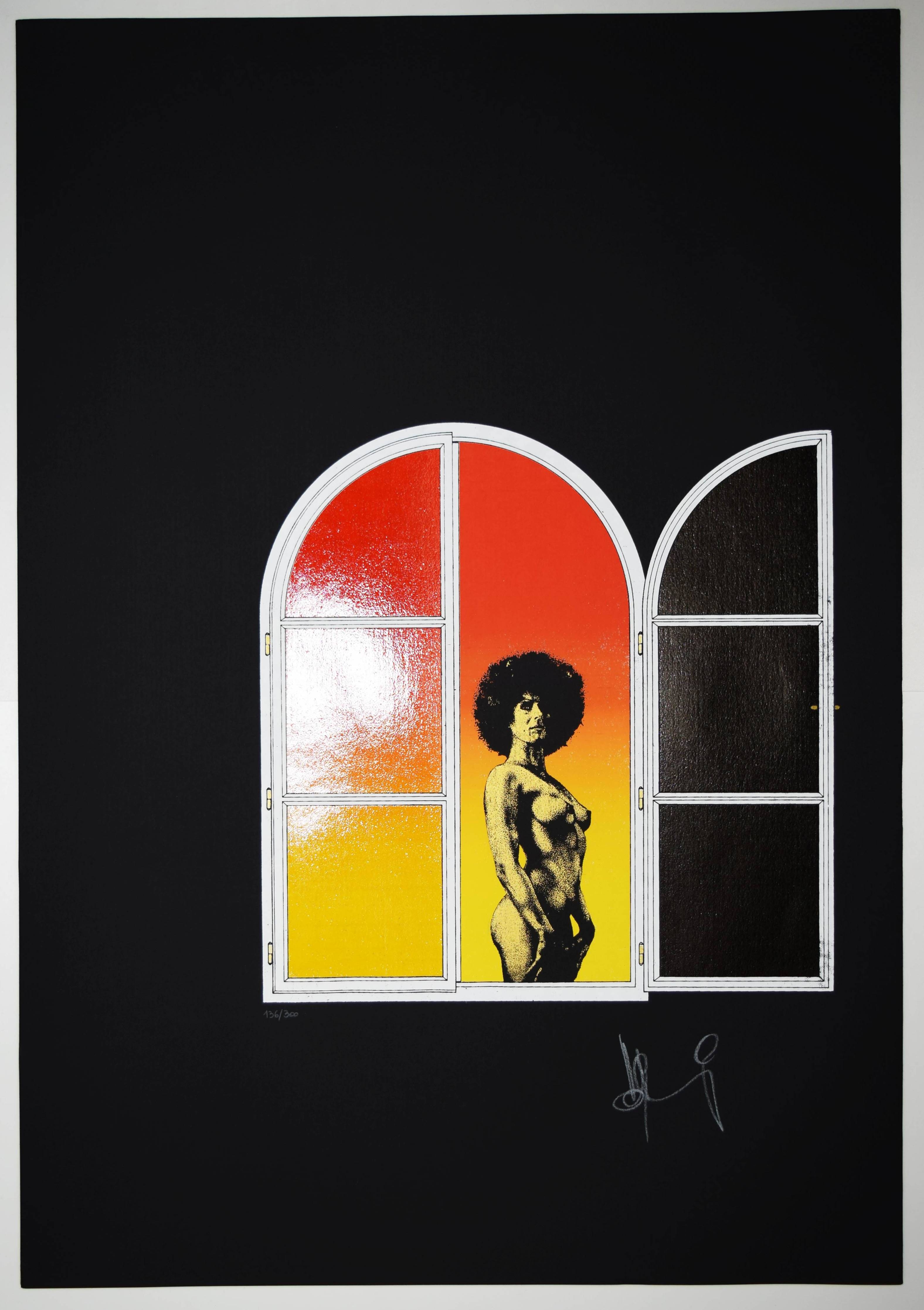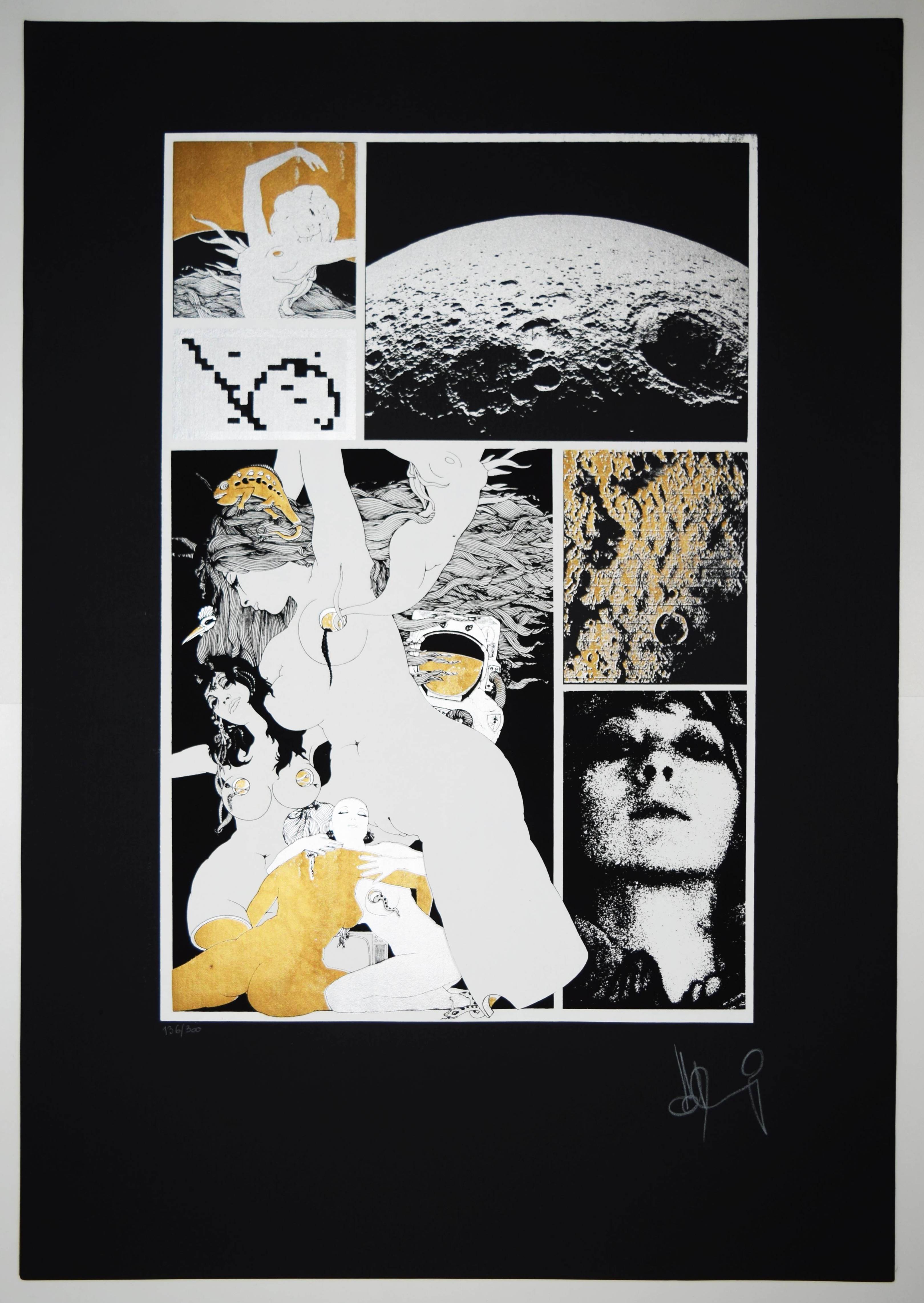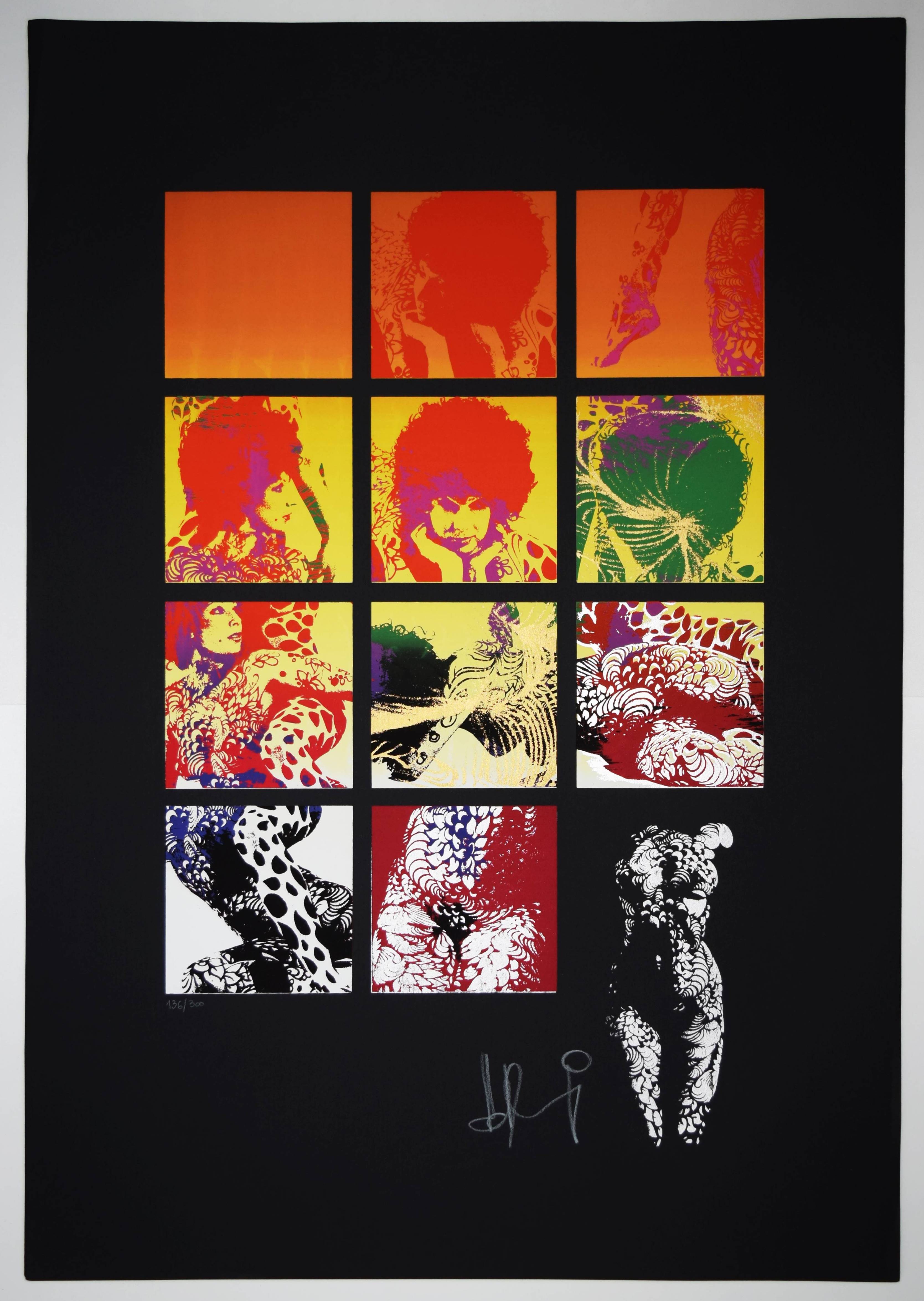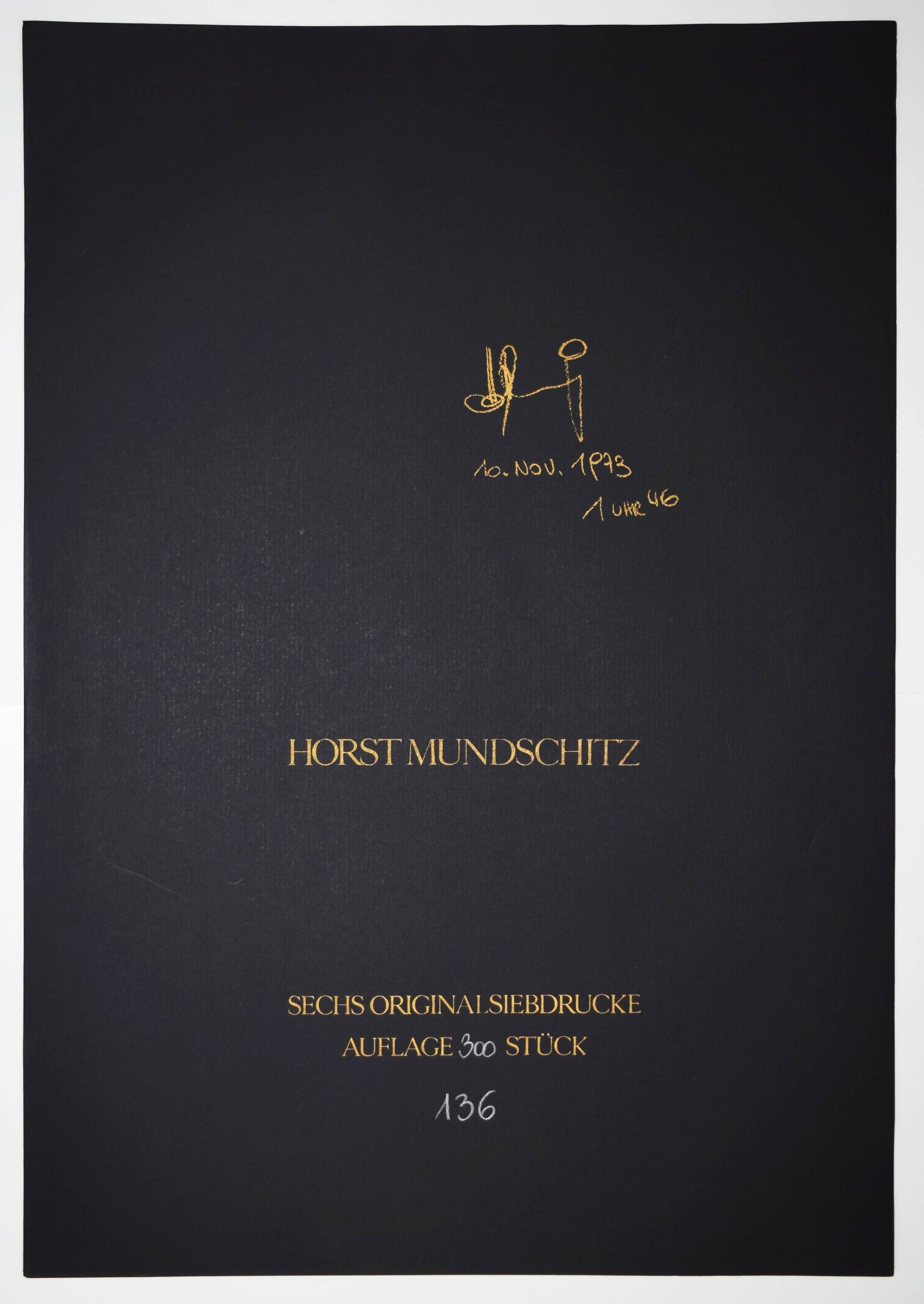 Mundschitz, Horst (1942-1989). Sechs Original Siebdrucke. Wien, Selbstverlag (1973). Imperial-Folio (68 x 37 cm.). Titelblatt in Gold u. 6 signierte u. farbige Orig.-Serigraphien. Eines von 300 num. u. sign. Exemplaren. – Zeittypische Pop-art-Arbeiten in psychedelischen Farben. – Der Wiener Maler, Zeichner und Graphiker H. Mundschitz, war Ende der sechziger Jahre auch als Rennfahrer auf Lotus aktiv, seine Werke wurden auf verschiedenen Ausstellungen zuletzt 1999 in Dornbirn und St. Pölten anlässlich der Ausstellung „Die Kunst zu wandeln. DAS LABYRINTH Mythos und Wirklichkeit“ präsentiert. – Tadellos.