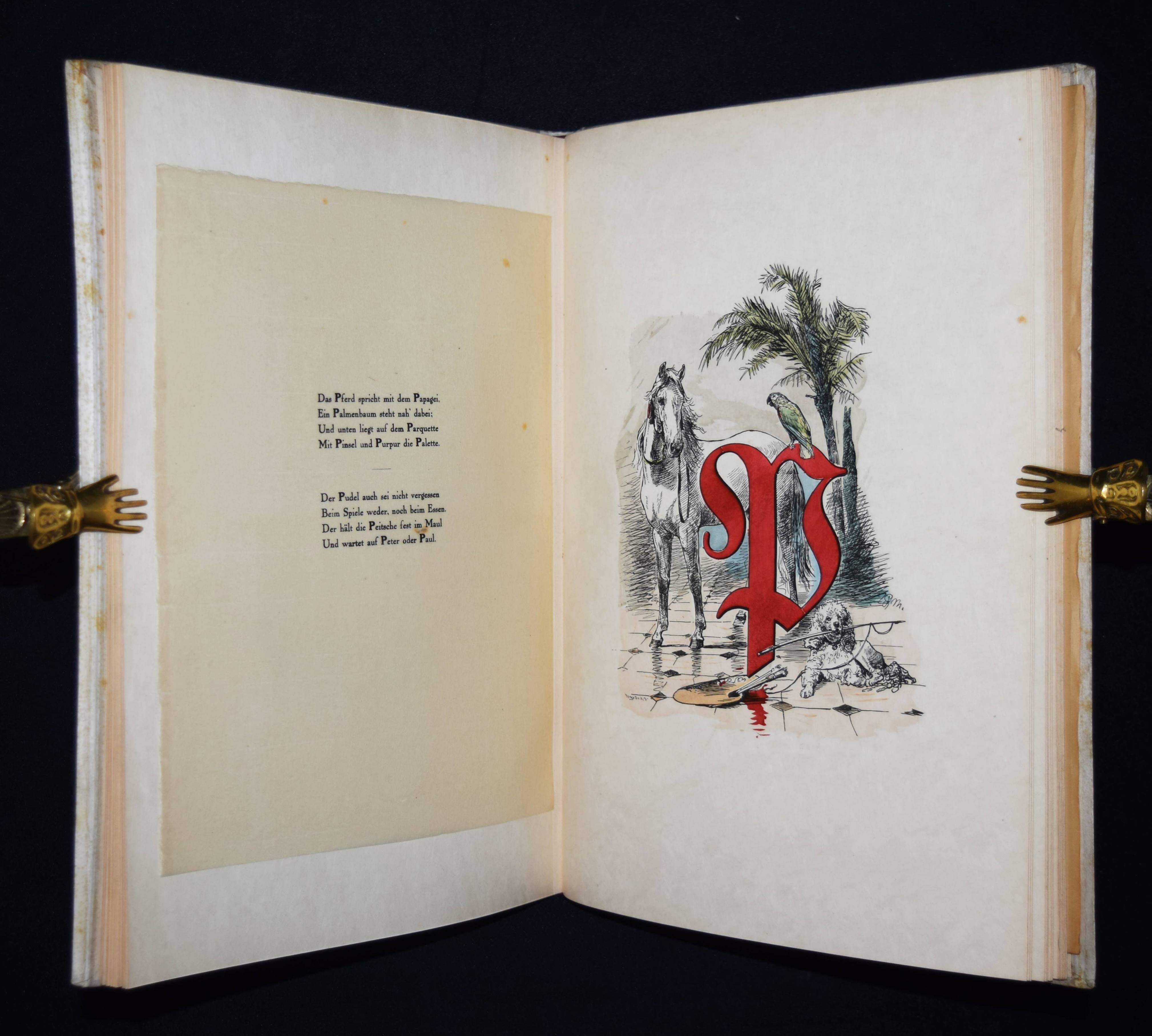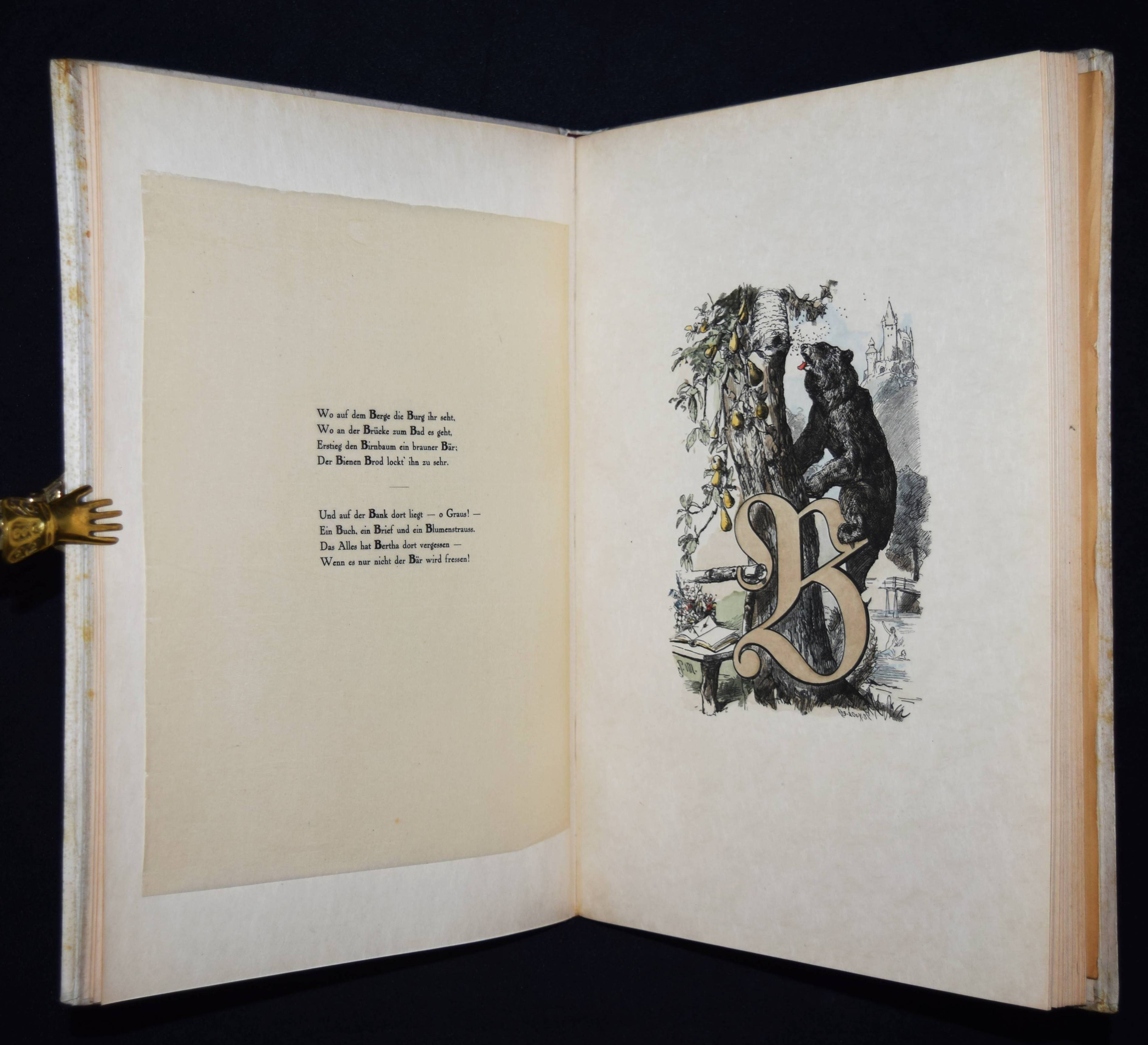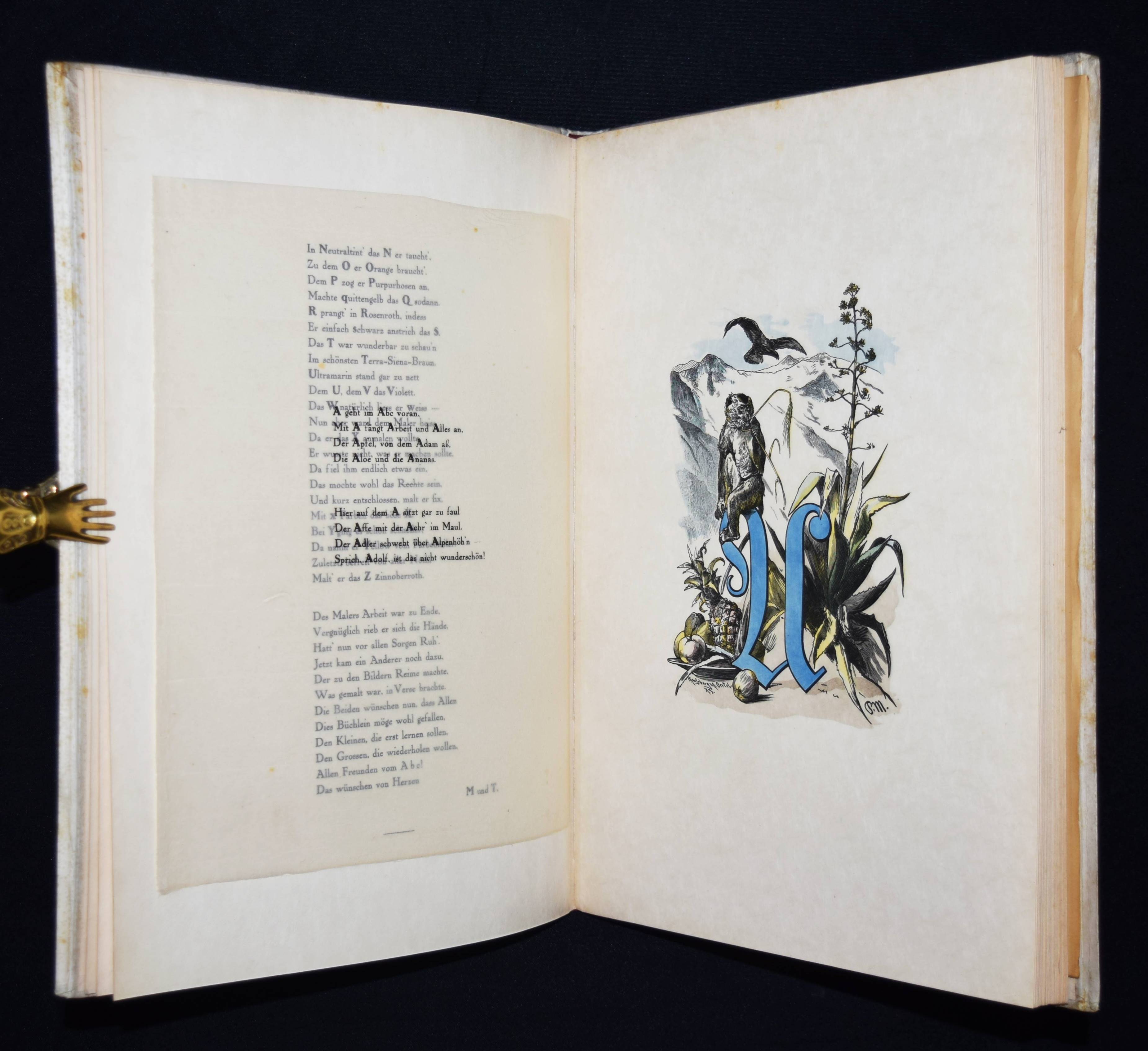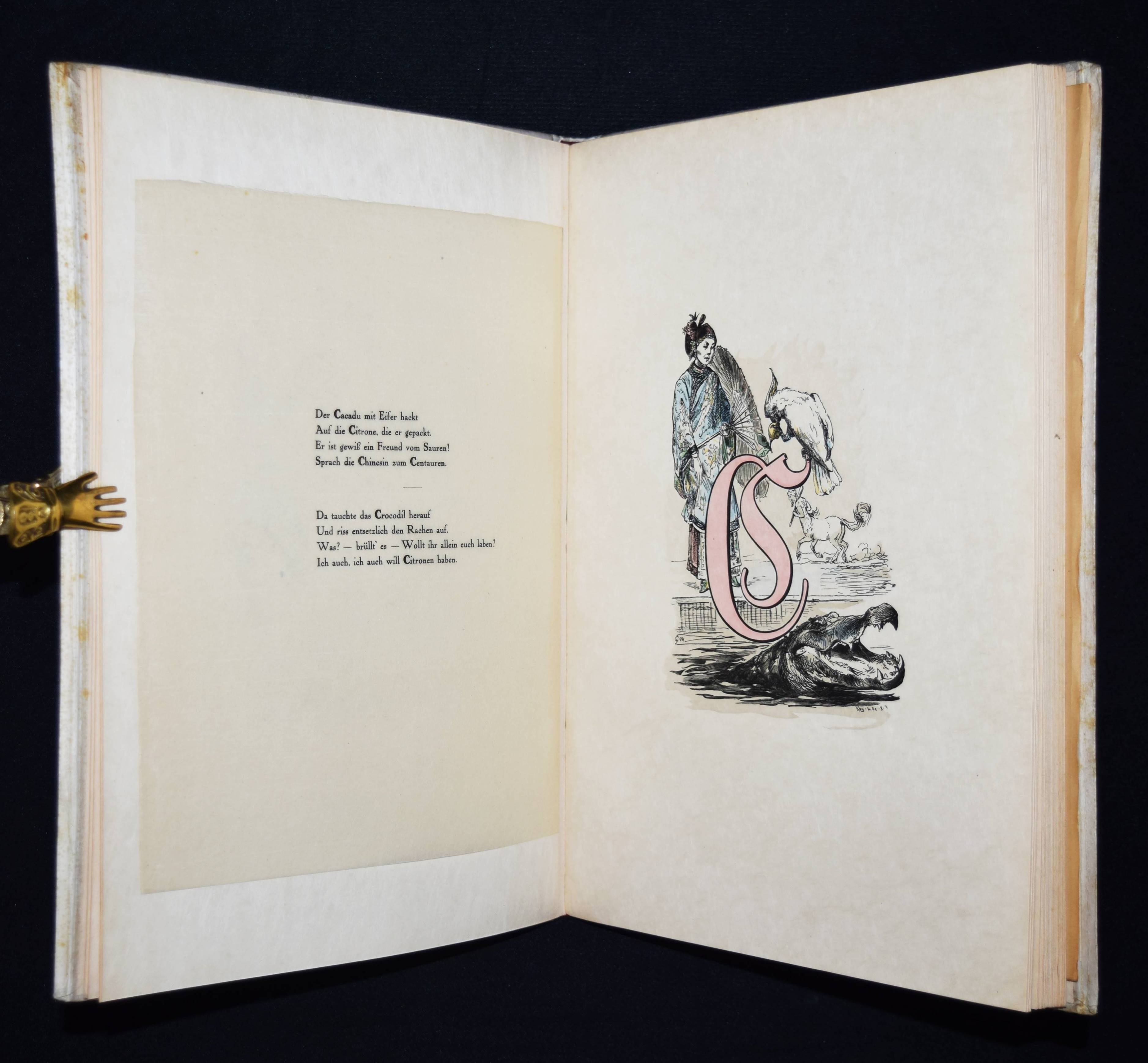 ABC – Meyerheim, Paul. ABC. Siebenundzwanzig aquarellierte Original-Zeichnungen. Verse von Johannes Trojan. Berlin, Brandus’sche Verlagsbuchhandlung 1916. 4°. [28] Bl. mit handkol. Titelvignette u. 25 handkol. lithogr. Tafeln (Kolorit: H. Froehlich). OPrgt. mit goldgepr. Rückentitel u. handkol. Deckelvignette sowie Kopfgoldschnitt. Seebaß I, 1264. Vgl. Slg. Brüggemann I, 538. Göbels 132 f. Hauswedell 840. Oldenburg, Künstler 114 (mit Abb.). Oldenburg, 19. Jahrhundert F 23. Ries 723, 2. Wegehaupt III, 2402 (mit Farbabb.). Alle erste Ausgabe von 1880. – Eines von 430 num. Exemplaren auf Kais. Japan. – Bibliophile Neuausgabe in Ganzpergament. Die Verse von Trojan sind auf die Seidenhemdchen gedruckt. – „Wundervolles Buch“ (A. Seebaß). – „In amüsanter Weise sind die mit demselben Buchstaben beginnenden Dinge zusammengebracht. Dabei sind zum Teil ganz reizende Bilder entstanden“ (H. Köster S. 37). – Vorderdeckel braunfleckig, sonst gutes Exemplar.