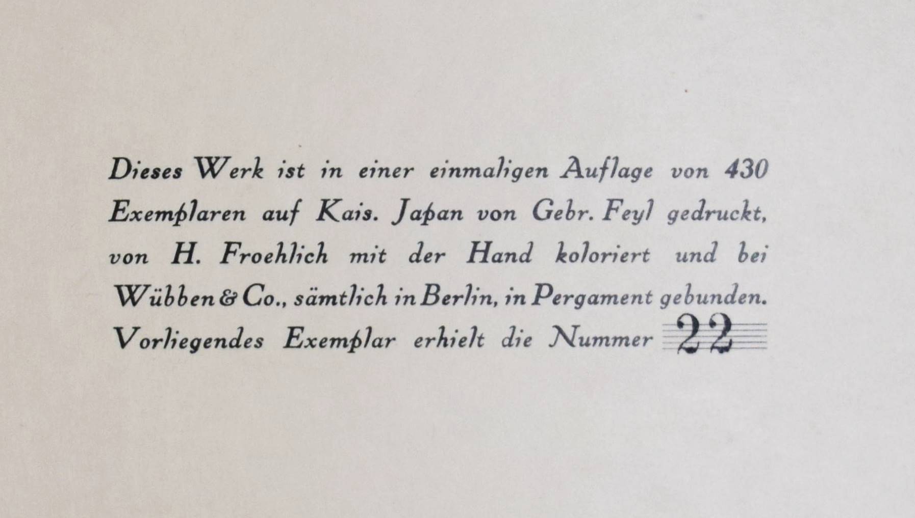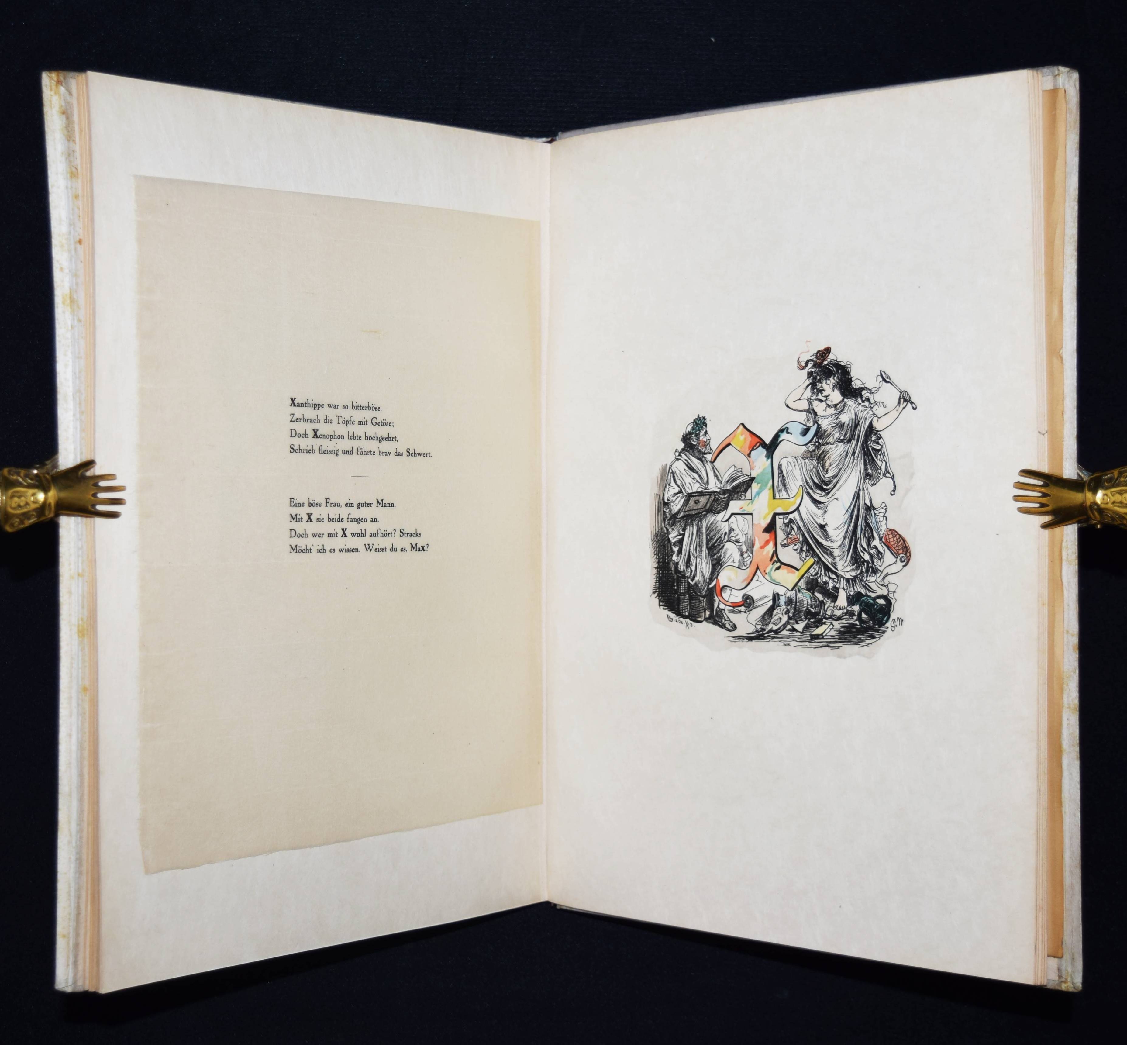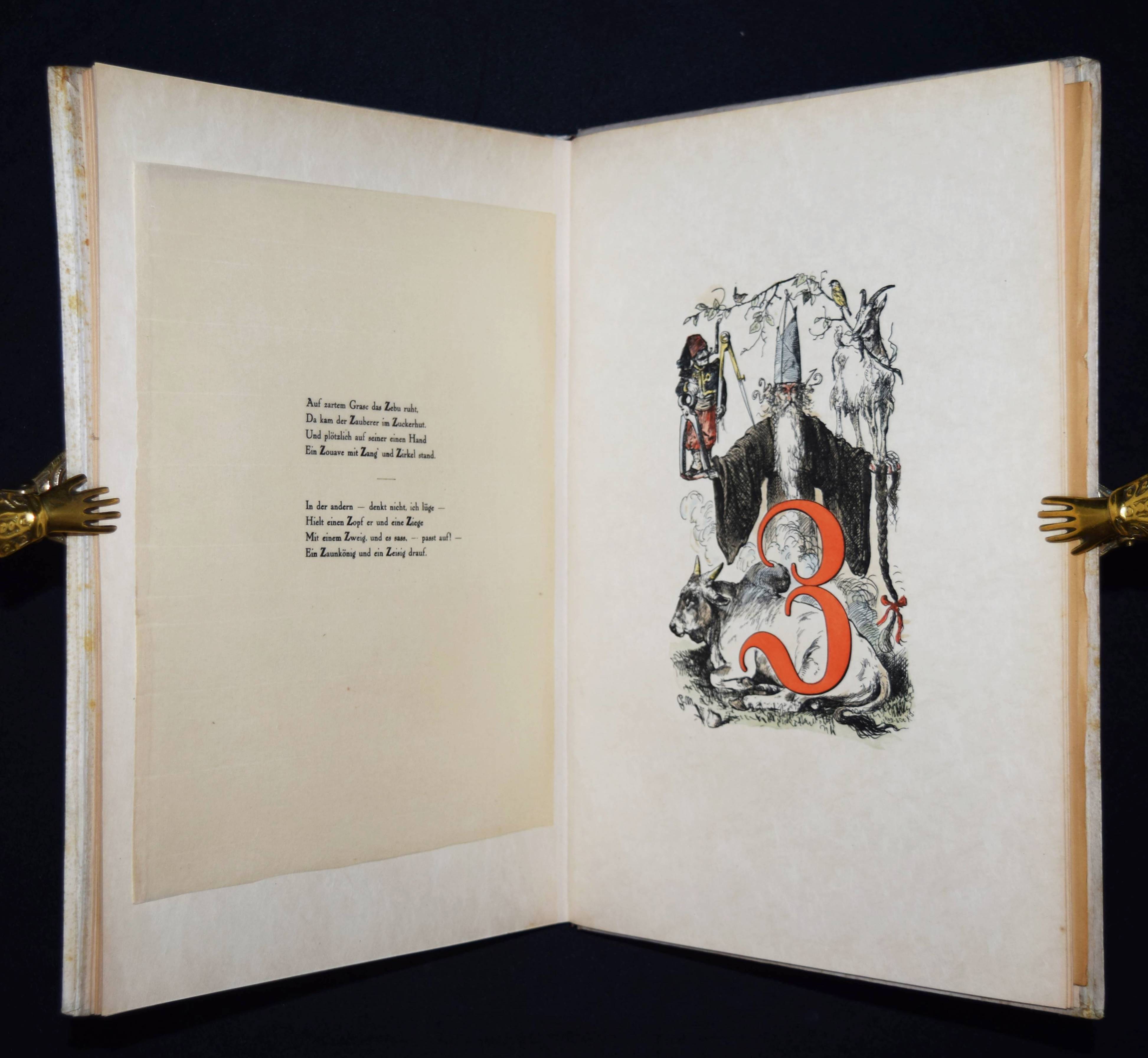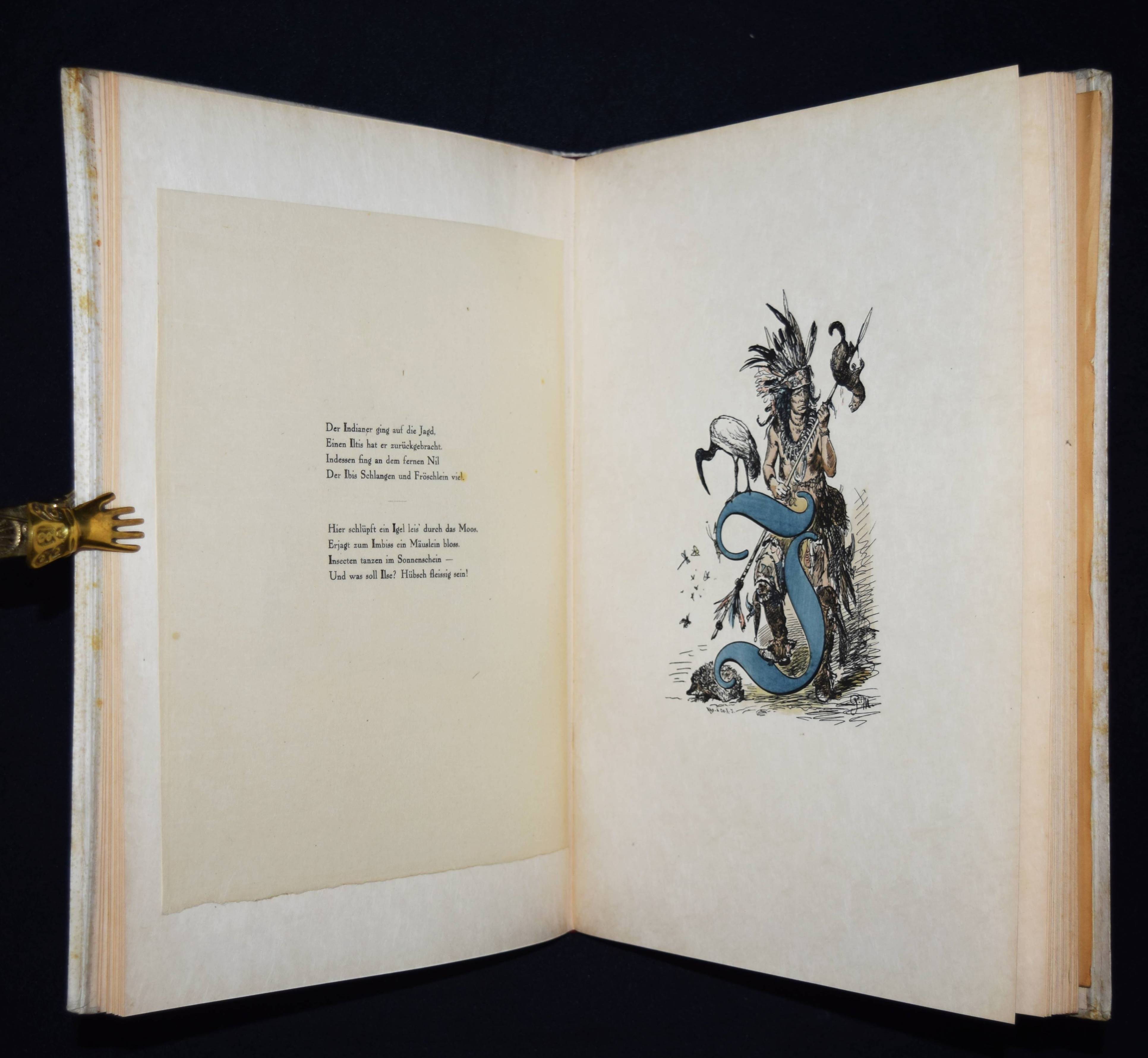 ABC – Meyerheim, Paul. ABC. Siebenundzwanzig aquarellierte Original-Zeichnungen. Verse von Johannes Trojan. Berlin, Brandus’sche Verlagsbuchhandlung 1916. 4°. [28] Bl. mit handkol. Titelvignette u. 25 handkol. lithogr. Tafeln (Kolorit: H. Froehlich). OPrgt. mit goldgepr. Rückentitel u. handkol. Deckelvignette sowie Kopfgoldschnitt. Seebaß I, 1264. Vgl. Slg. Brüggemann I, 538. Göbels 132 f. Hauswedell 840. Oldenburg, Künstler 114 (mit Abb.). Oldenburg, 19. Jahrhundert F 23. Ries 723, 2. Wegehaupt III, 2402 (mit Farbabb.). Alle erste Ausgabe von 1880. – Eines von 430 num. Exemplaren auf Kais. Japan. – Bibliophile Neuausgabe in Ganzpergament. Die Verse von Trojan sind auf die Seidenhemdchen gedruckt. – „Wundervolles Buch“ (A. Seebaß). – „In amüsanter Weise sind die mit demselben Buchstaben beginnenden Dinge zusammengebracht. Dabei sind zum Teil ganz reizende Bilder entstanden“ (H. Köster S. 37). – Vorderdeckel braunfleckig, sonst gutes Exemplar.