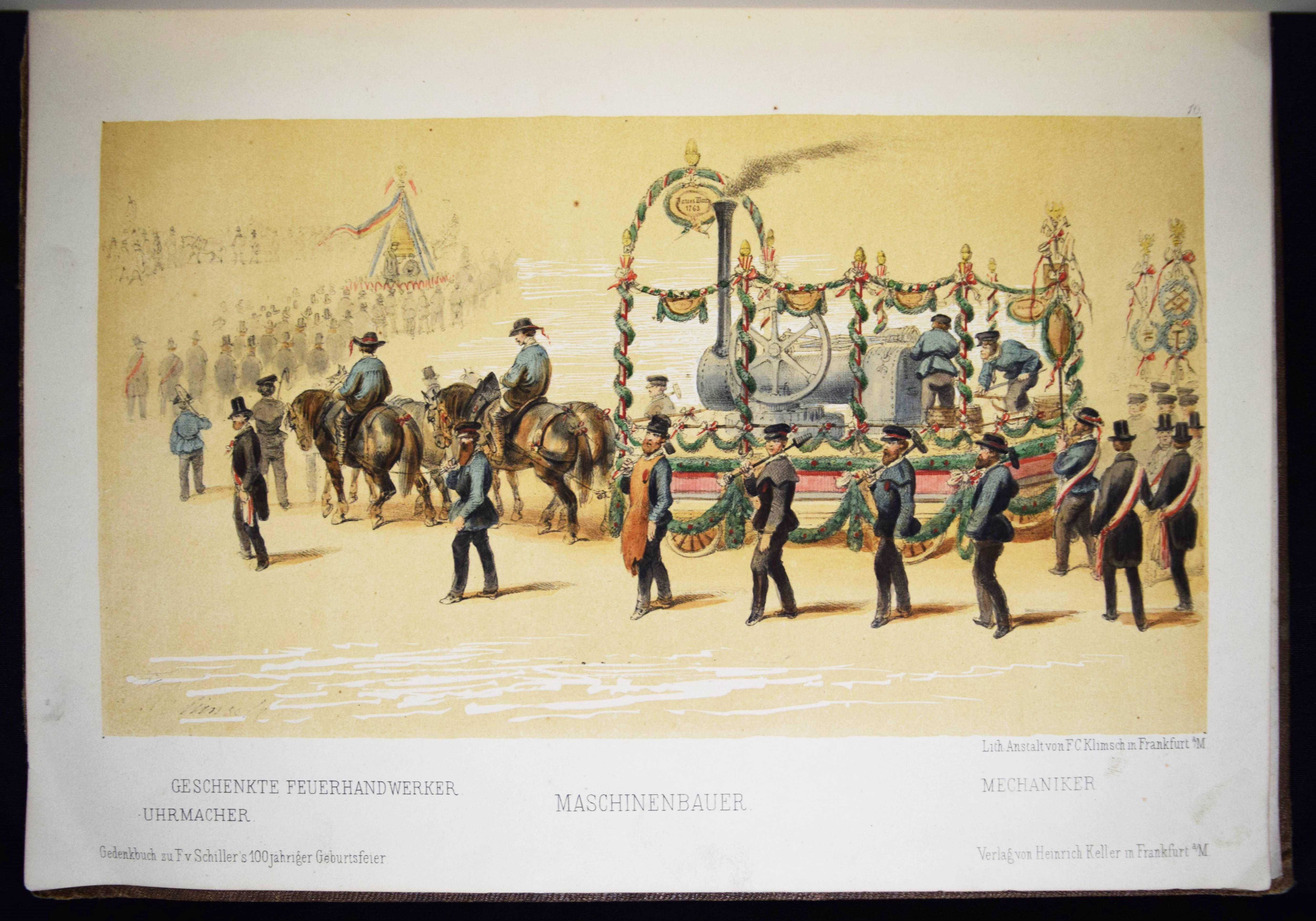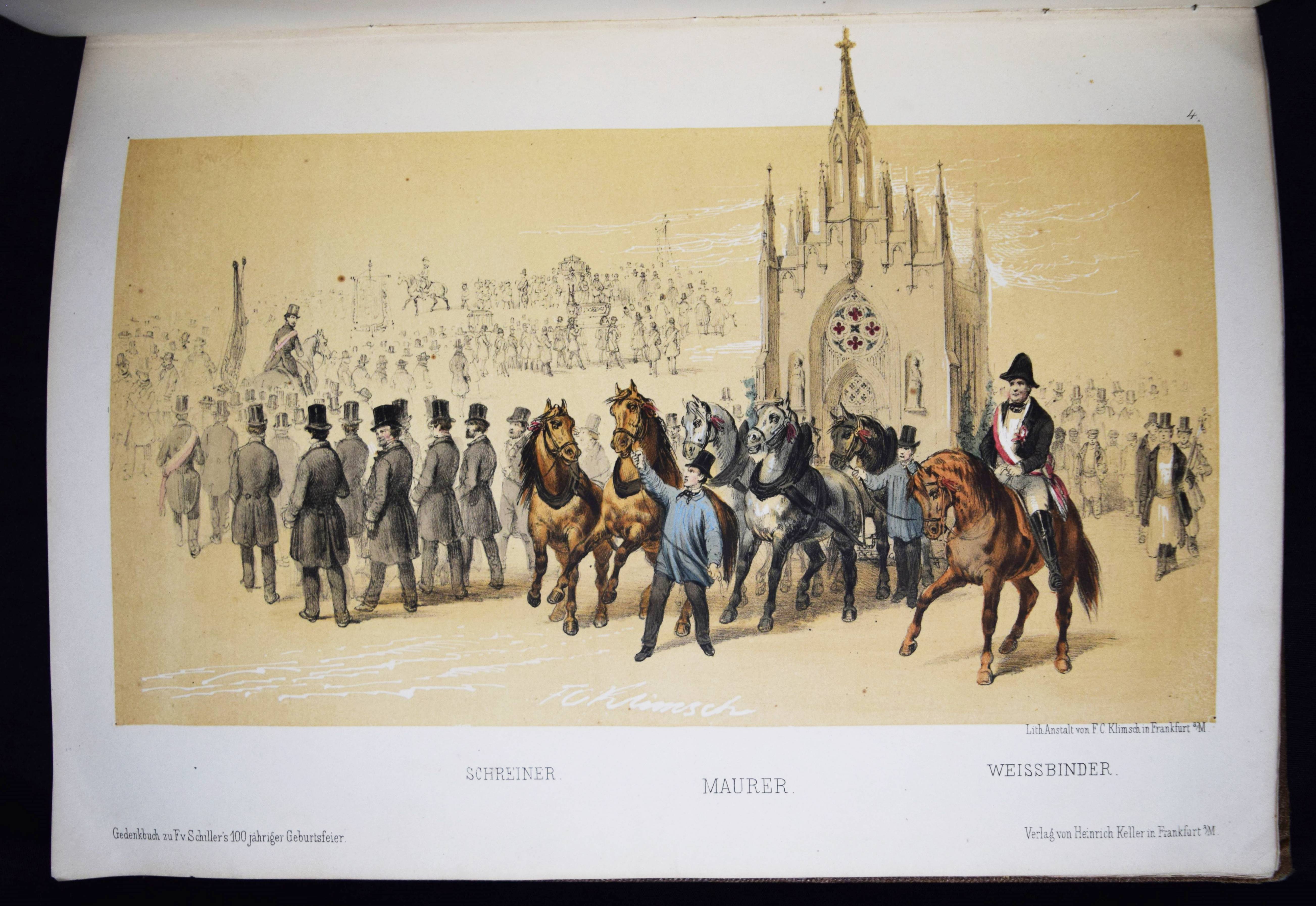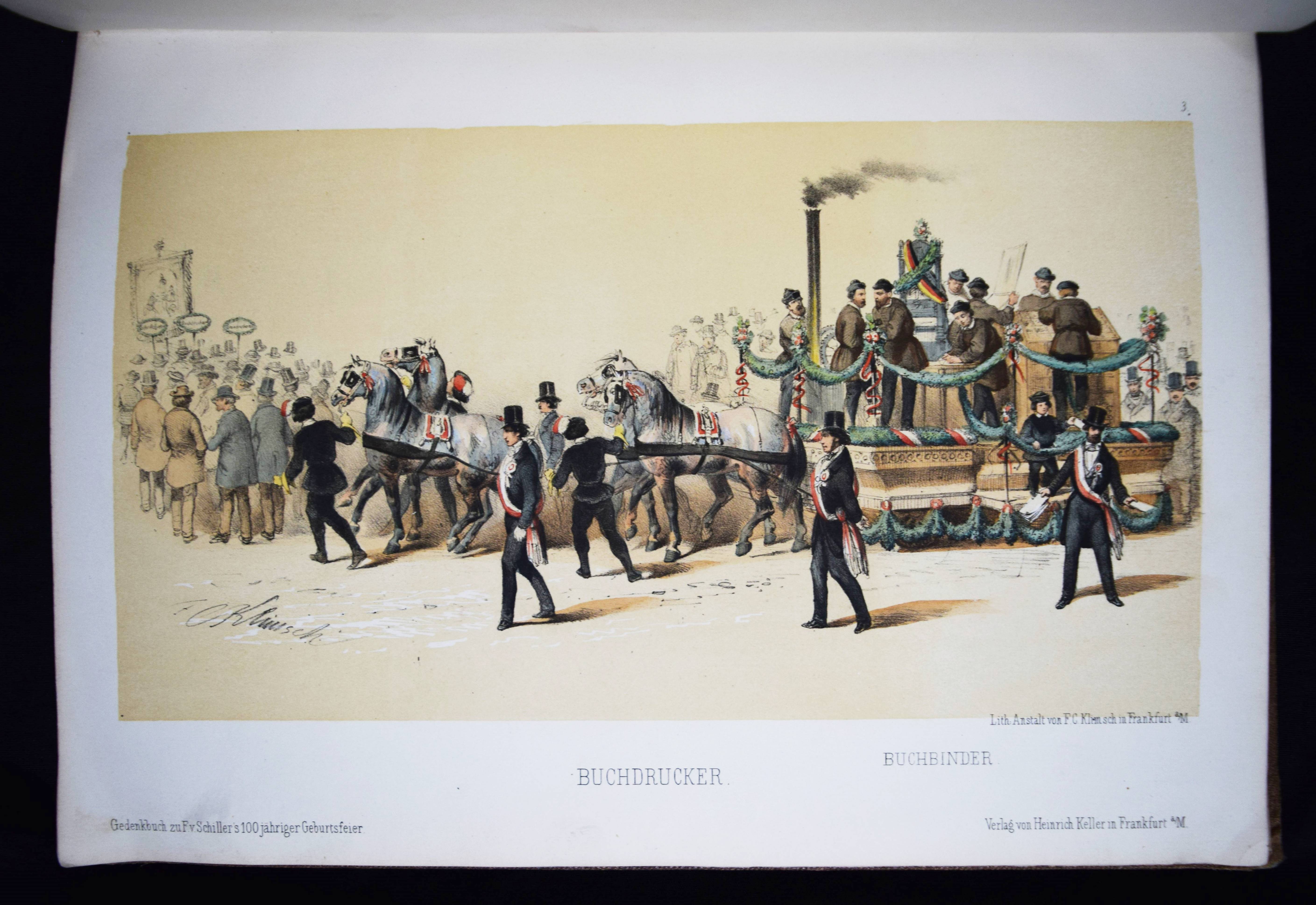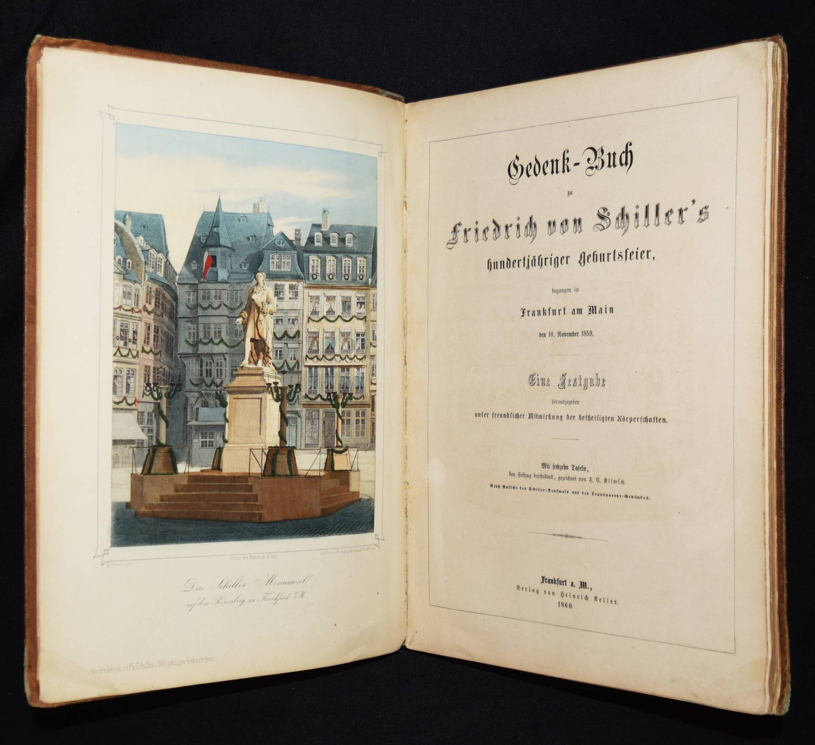 Schiller – Gedenk-Buch zu Friedrich von Schiller’s hundertjähriger Geburtsfeier, begangen in Frankfurt am Main den 10. November 1859. Eine Festgabe herausgegeben unter mitwirkung der beteiligten Körperschaften. Frankfurt a.M., Heinrich Keller 1860. 4°. XXIV, 76 S. mit handkol. gestoch. Frontispiz u. 16 handkol. lthographierten Tafeln mit Tonplatte von F. G. Klimsch. OLn. mit Deckelverg. u. Goldschnitt. Goed. V, 126, 58. Sauer 863. – Die schönen Tafeln zeigen das Schiller-Monument auf dem Römerberg, den Festzug und den Transparentbau am Adlerbrunnen. – Einband berieben und bestoßen, Rücken restauriert, Innengelenke mit Papierstreifen verstärkt, sonst gut erhalten.