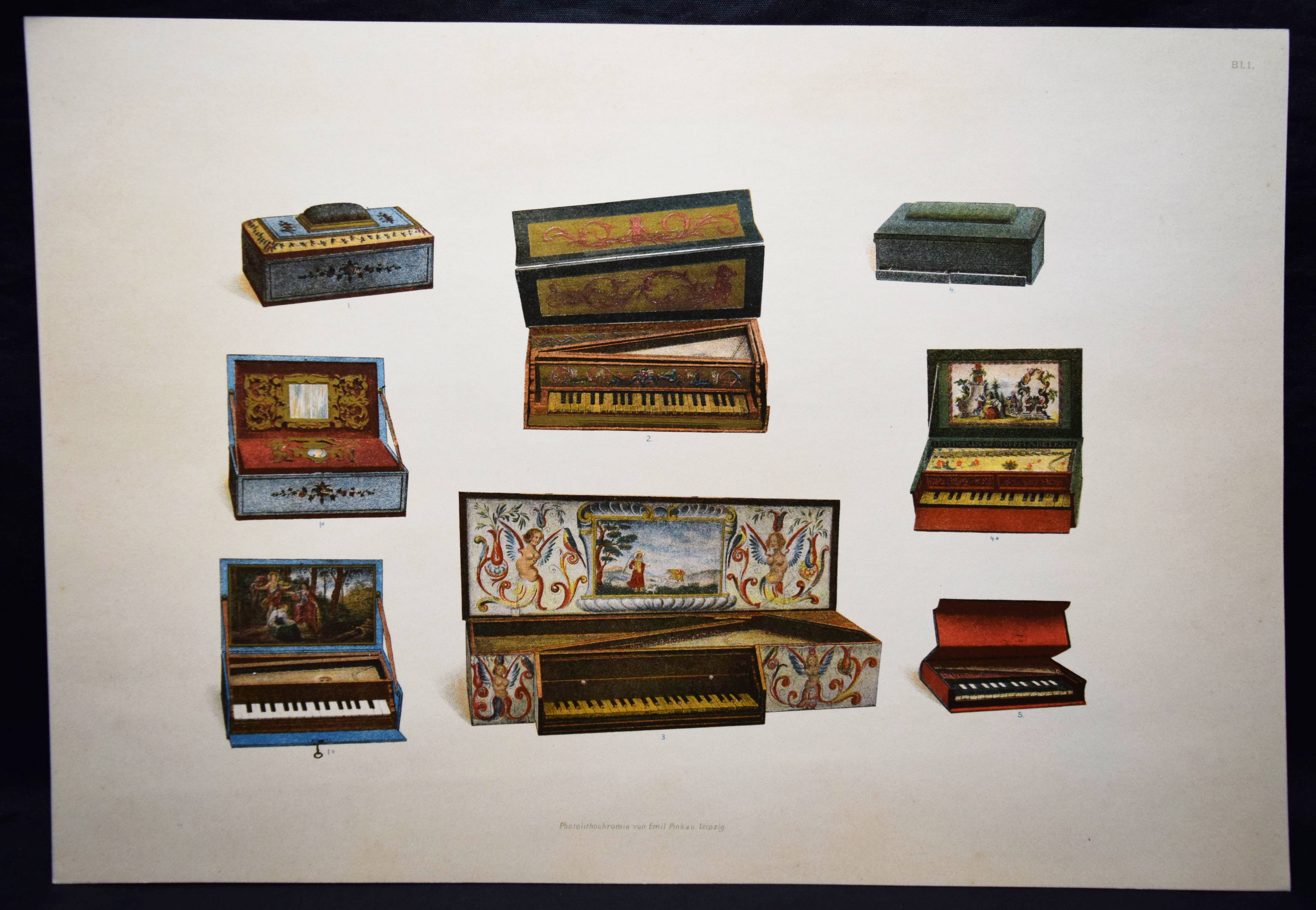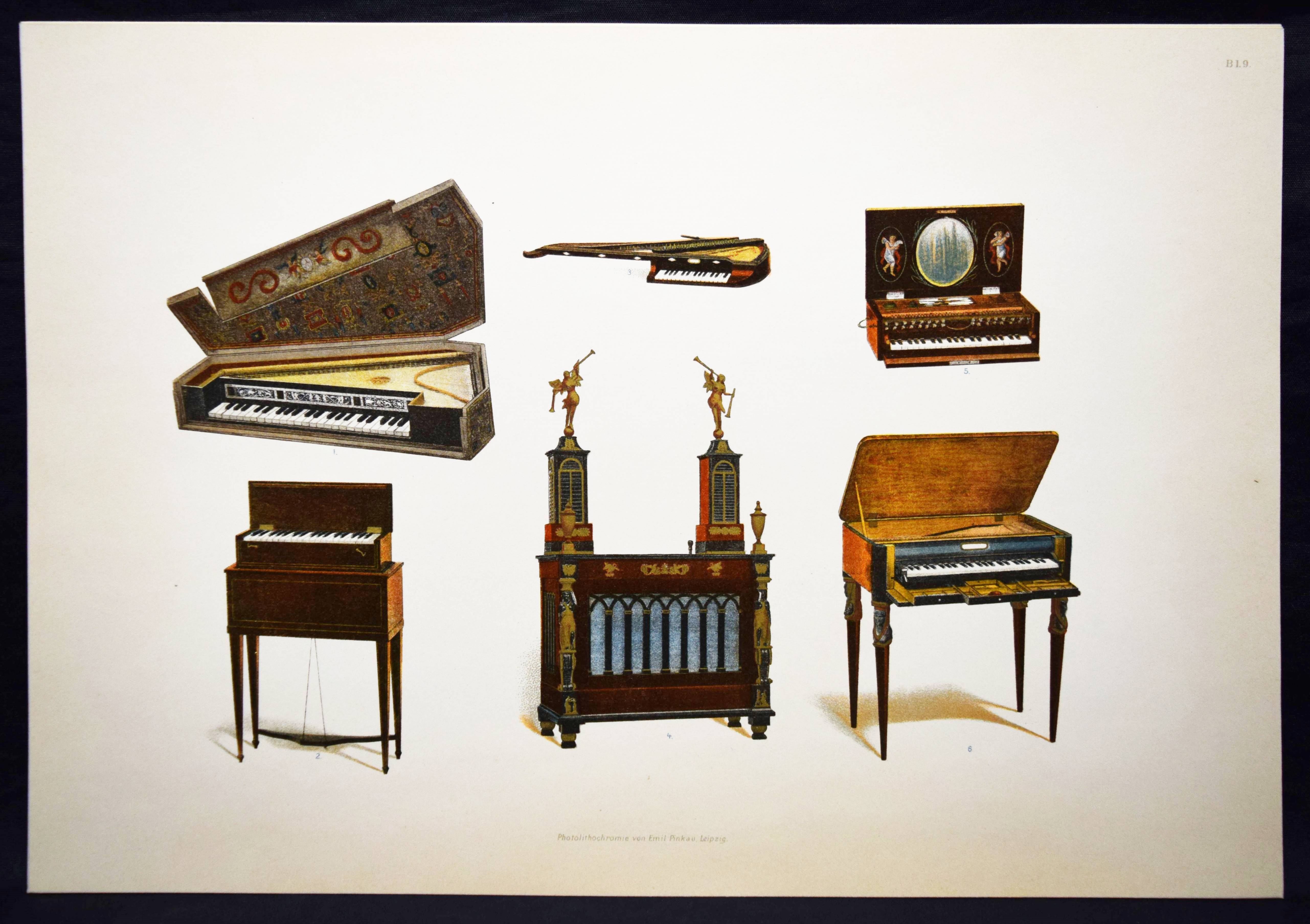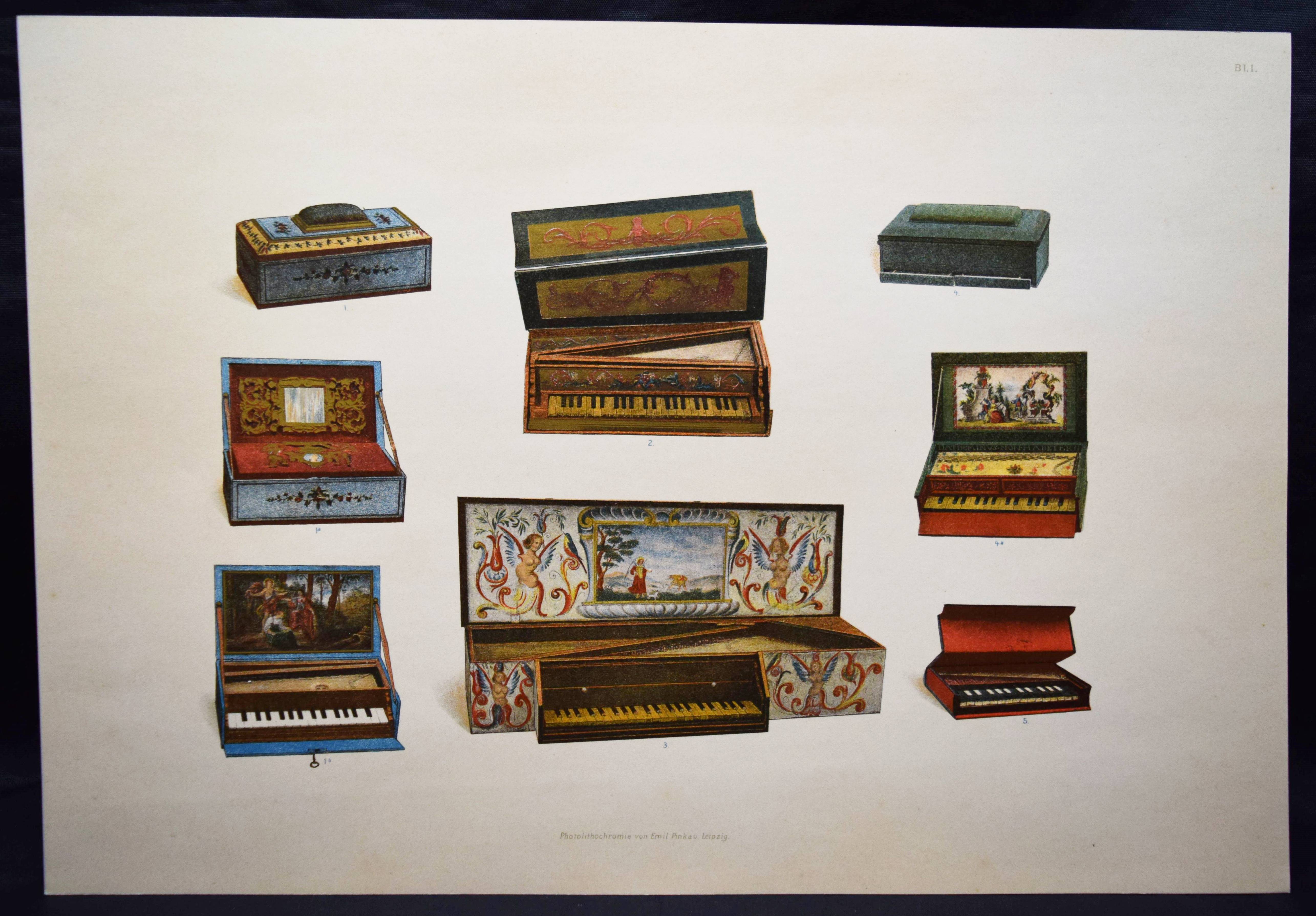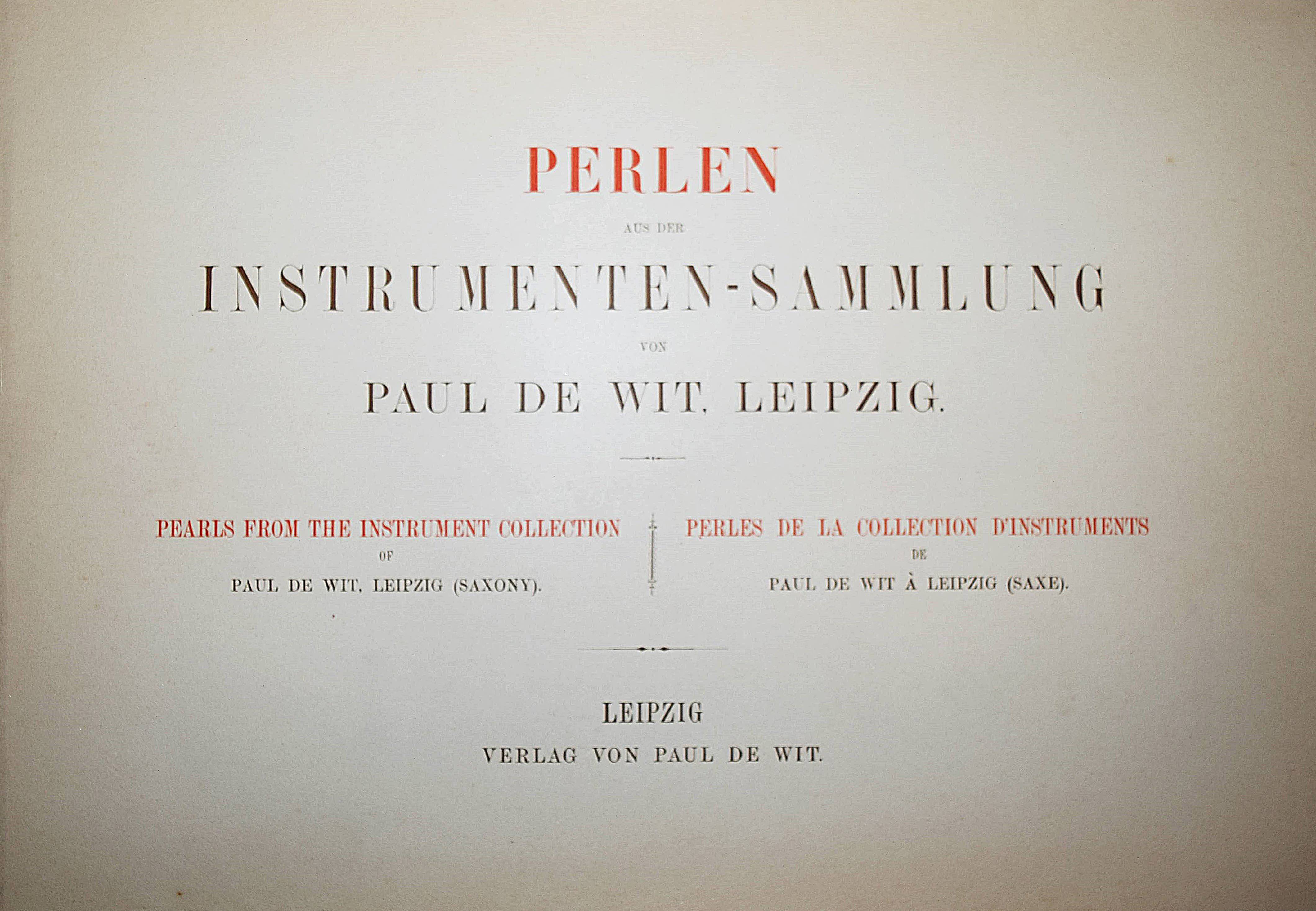 Wit, Paul de. Perlen aus der Instrumenten-Sammlung von Paul de Wit, Leipzig. Pearls from the Instrument Collection of Paul de Wit, Leipzig (Saxony). Leipzig, Selbstverlag (1892). Quer-4°. Titel u. 16 Farbtafeln in Photolithographie. Winrote Orig.-Samt-Flügelmappe mit farb. Deckelbild und Messing-Eckbeschlägen in Orig.-Pappschuber. MGG XIV, 736. Riemann 1319. – Seltene schön ausgestattete Vorzugsausgabe des wichtigen Sammlungskatalogs. Die Tafeln zeigen die schönsten Stücke des Leipziger Instrumentenmuseums, das von dem aus Holland stammenden Violincellisten Paul de Wit (1852-1925) gegründet worden ist. – Ohne die 14-seitige Textbeilage (liegt in Farbkopie bei und kann im Staatlichen Institut für Musikforschung, Berlin online abgerufen werden), Schuber angestaubt und fleckig, Titelblatt mit geringf. Randläsur, schönes Exemplar.