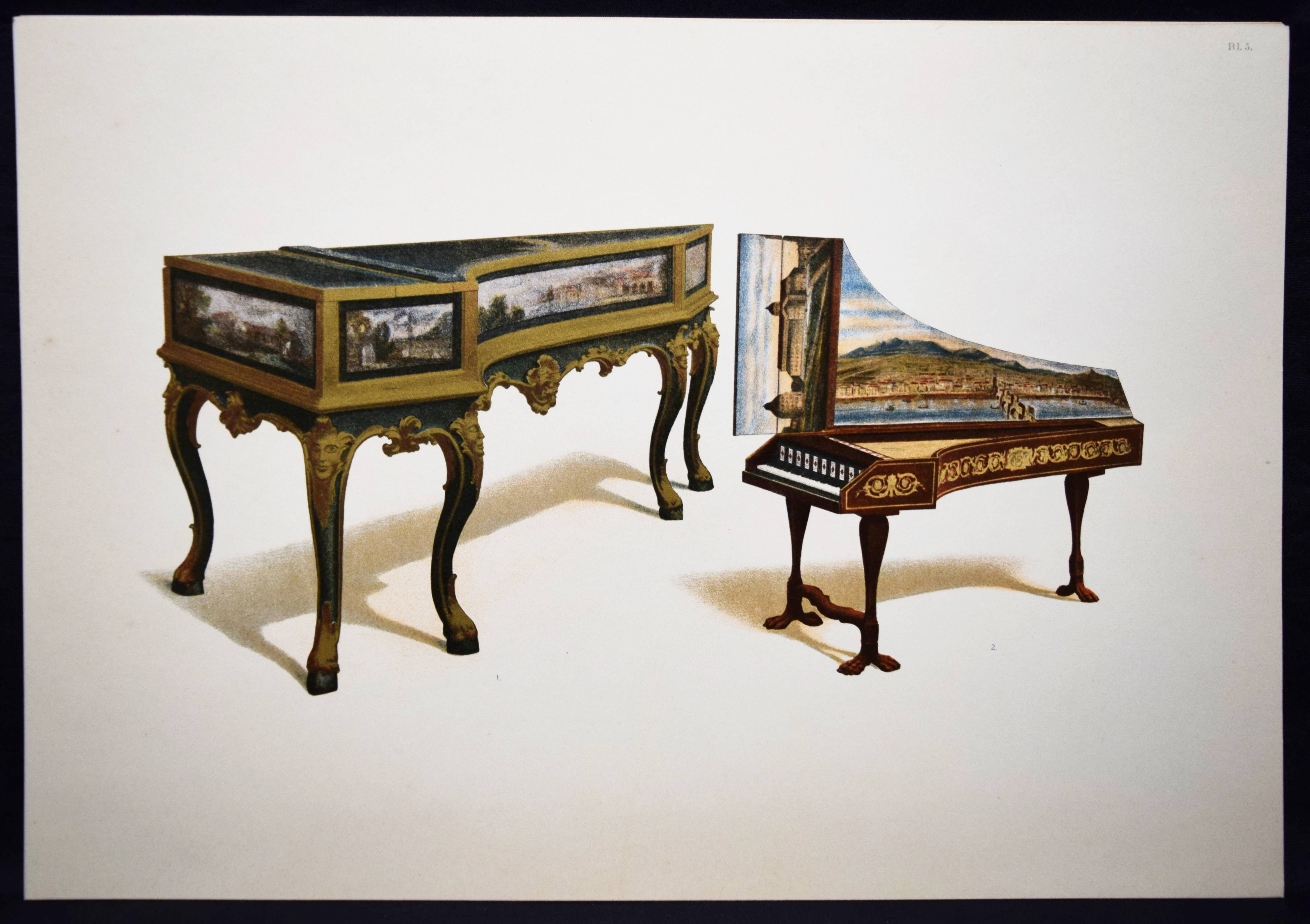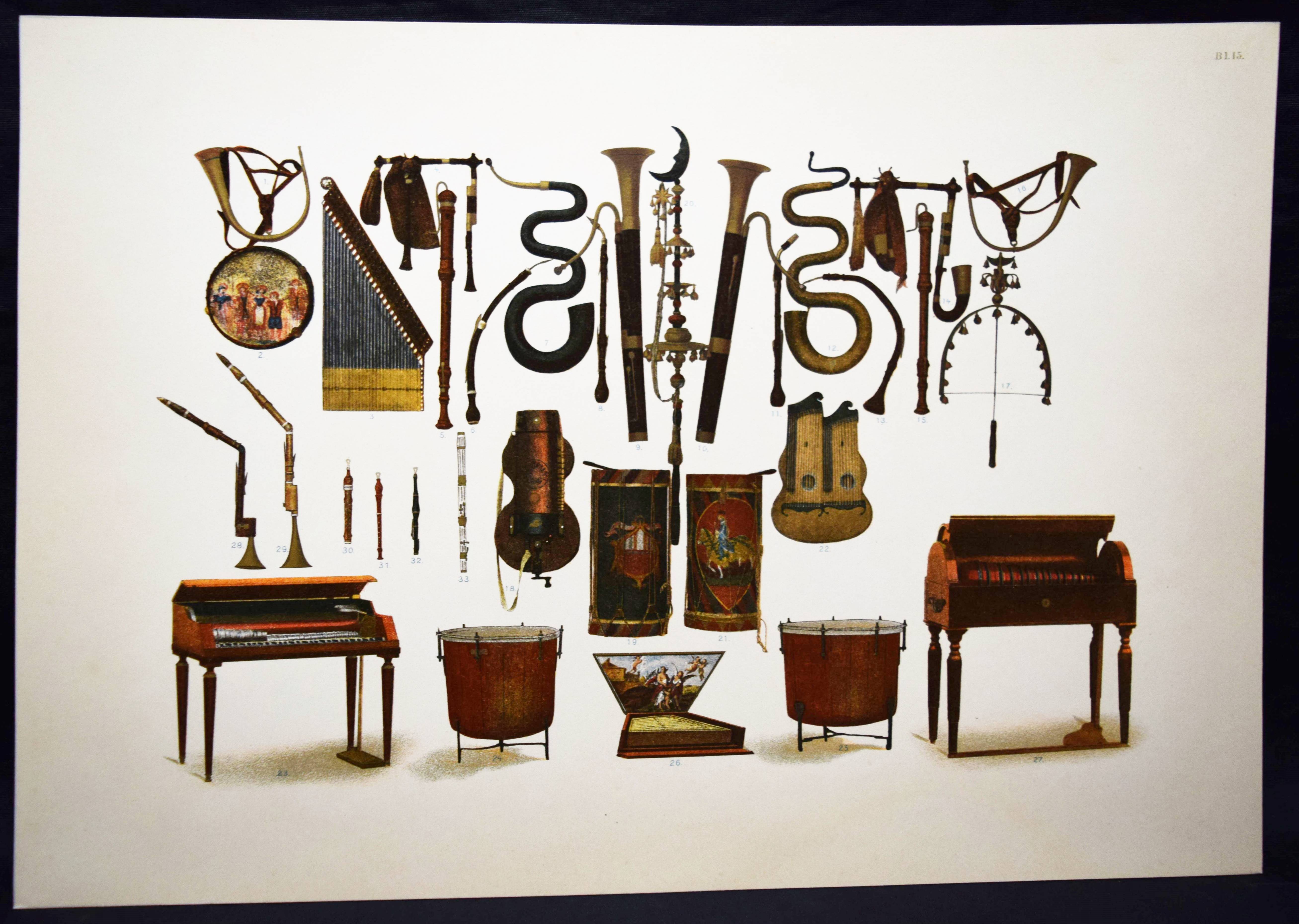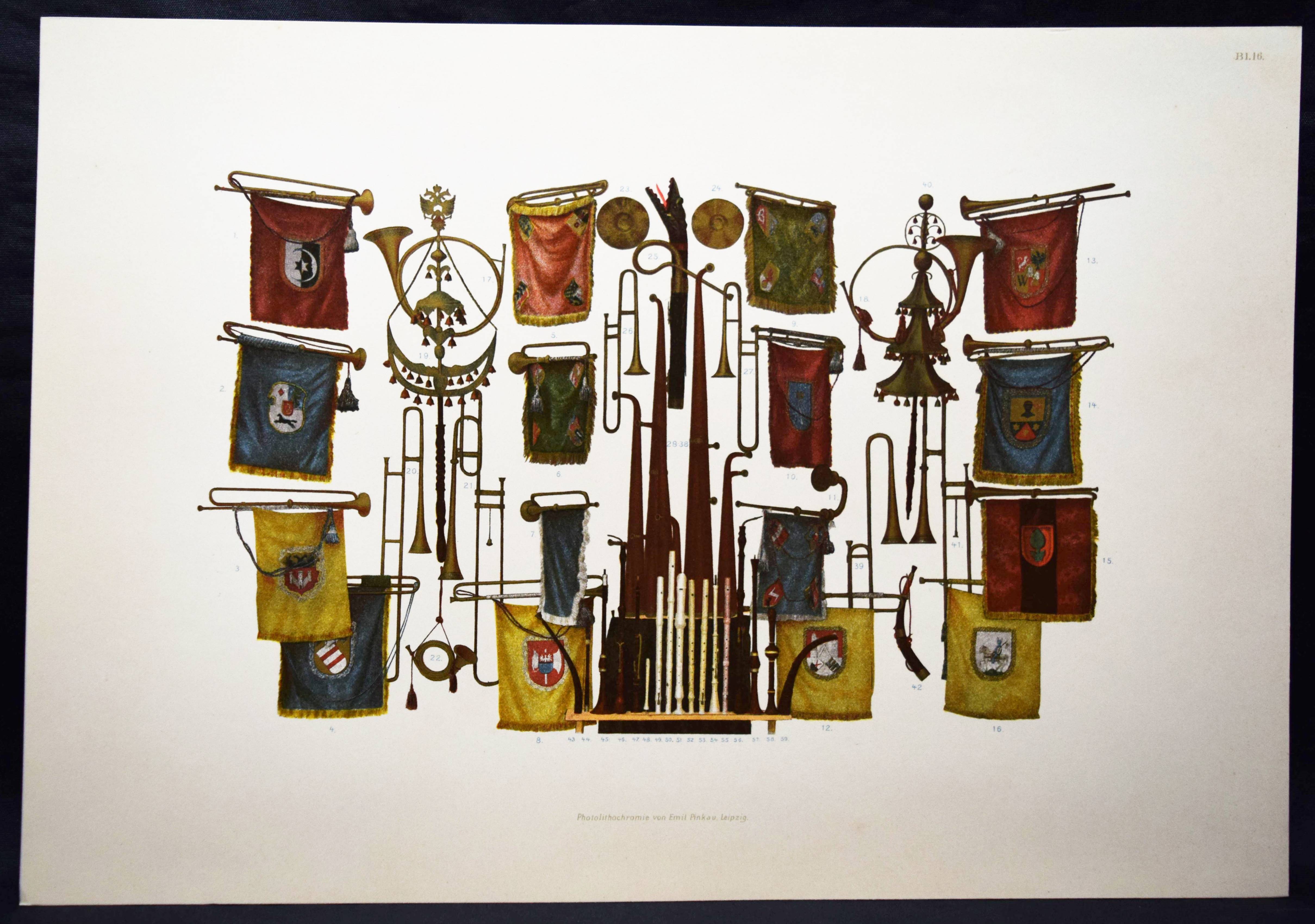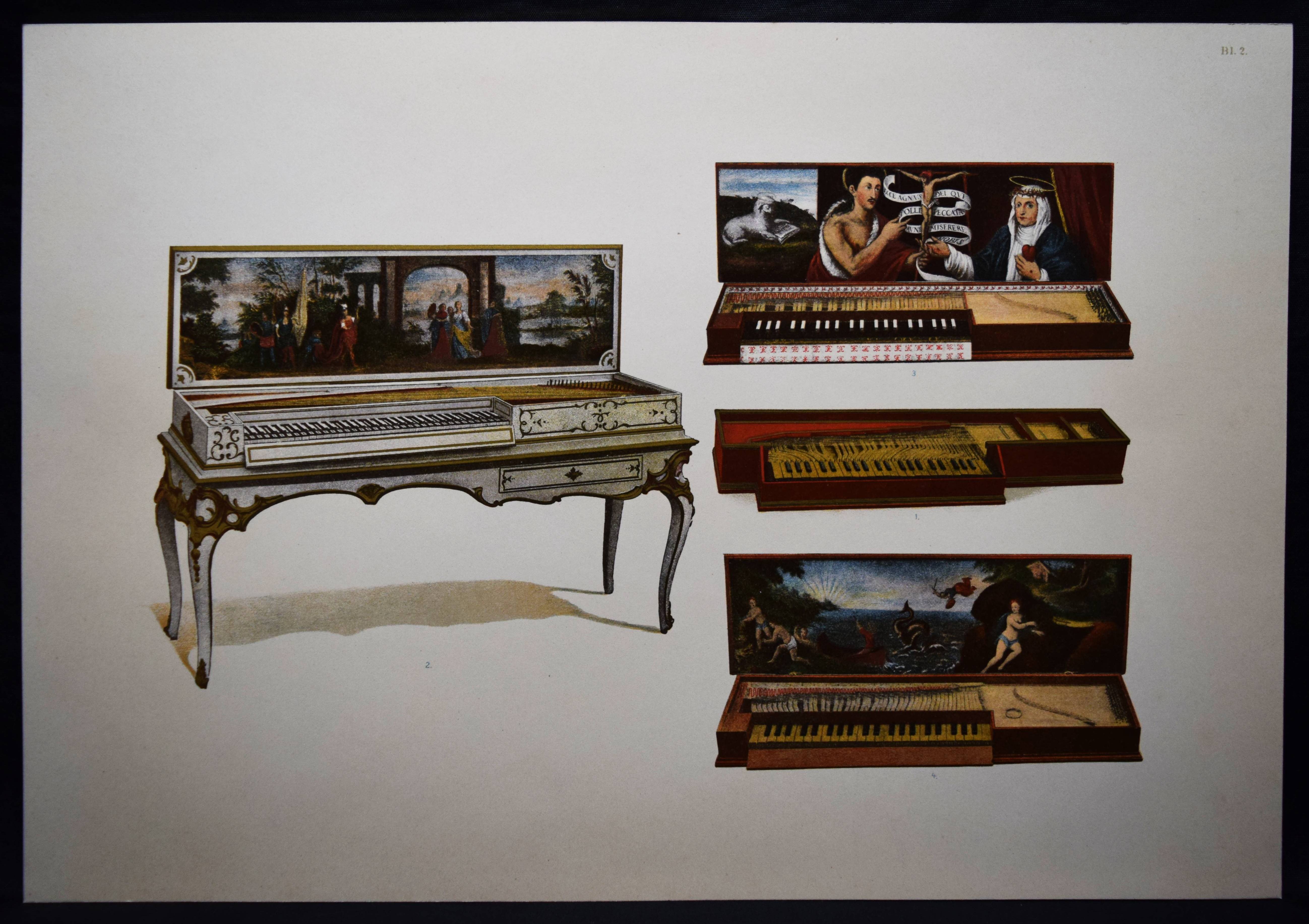 Wit, Paul de. Perlen aus der Instrumenten-Sammlung von Paul de Wit, Leipzig. Pearls from the Instrument Collection of Paul de Wit, Leipzig (Saxony). Leipzig, Selbstverlag (1892). Quer-4°. Titel u. 16 Farbtafeln in Photolithographie. Winrote Orig.-Samt-Flügelmappe mit farb. Deckelbild und Messing-Eckbeschlägen in Orig.-Pappschuber. MGG XIV, 736. Riemann 1319. – Seltene schön ausgestattete Vorzugsausgabe des wichtigen Sammlungskatalogs. Die Tafeln zeigen die schönsten Stücke des Leipziger Instrumentenmuseums, das von dem aus Holland stammenden Violincellisten Paul de Wit (1852-1925) gegründet worden ist. – Ohne die 14-seitige Textbeilage (liegt in Farbkopie bei und kann im Staatlichen Institut für Musikforschung, Berlin online abgerufen werden), Schuber angestaubt und fleckig, Titelblatt mit geringf. Randläsur, schönes Exemplar.