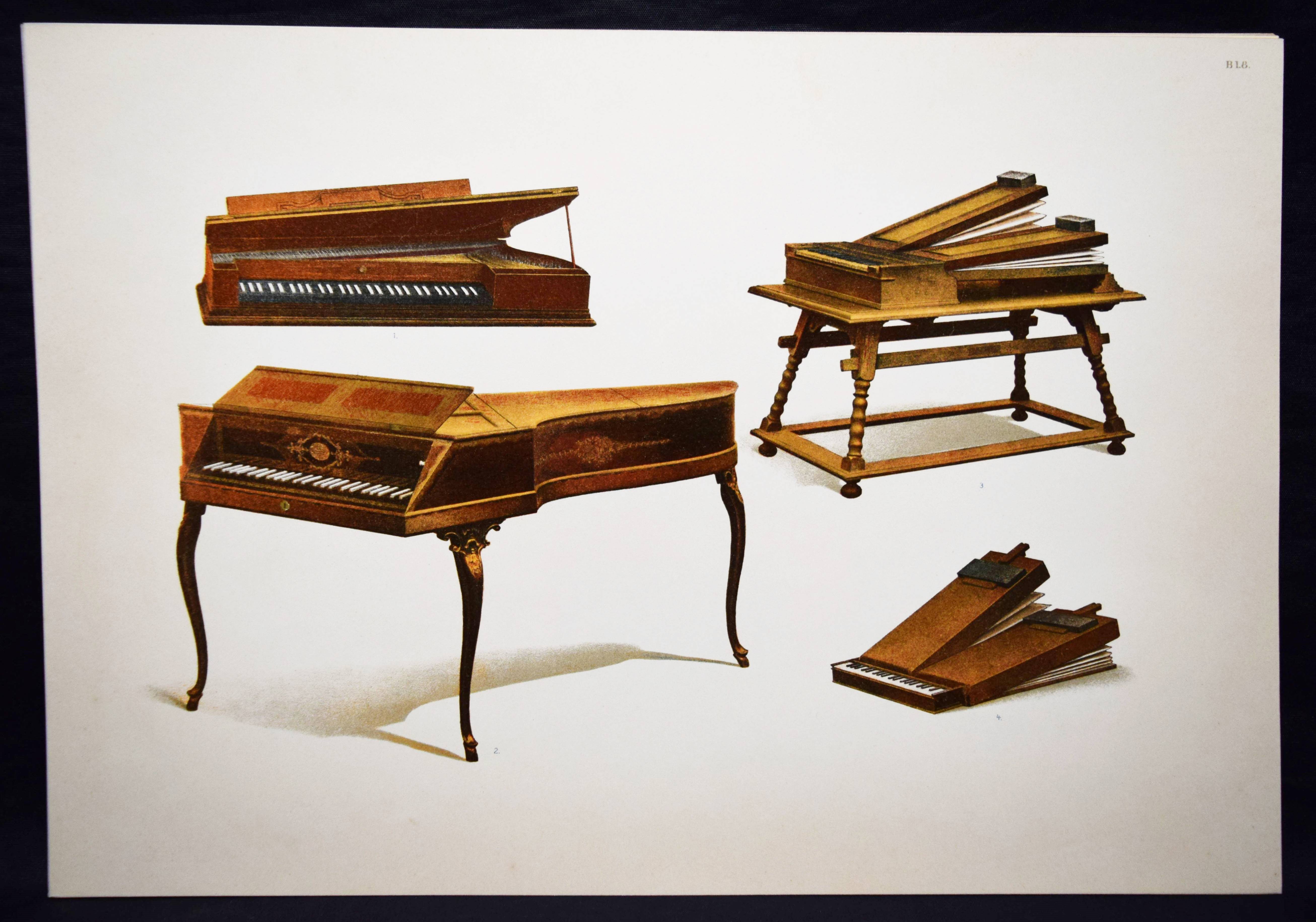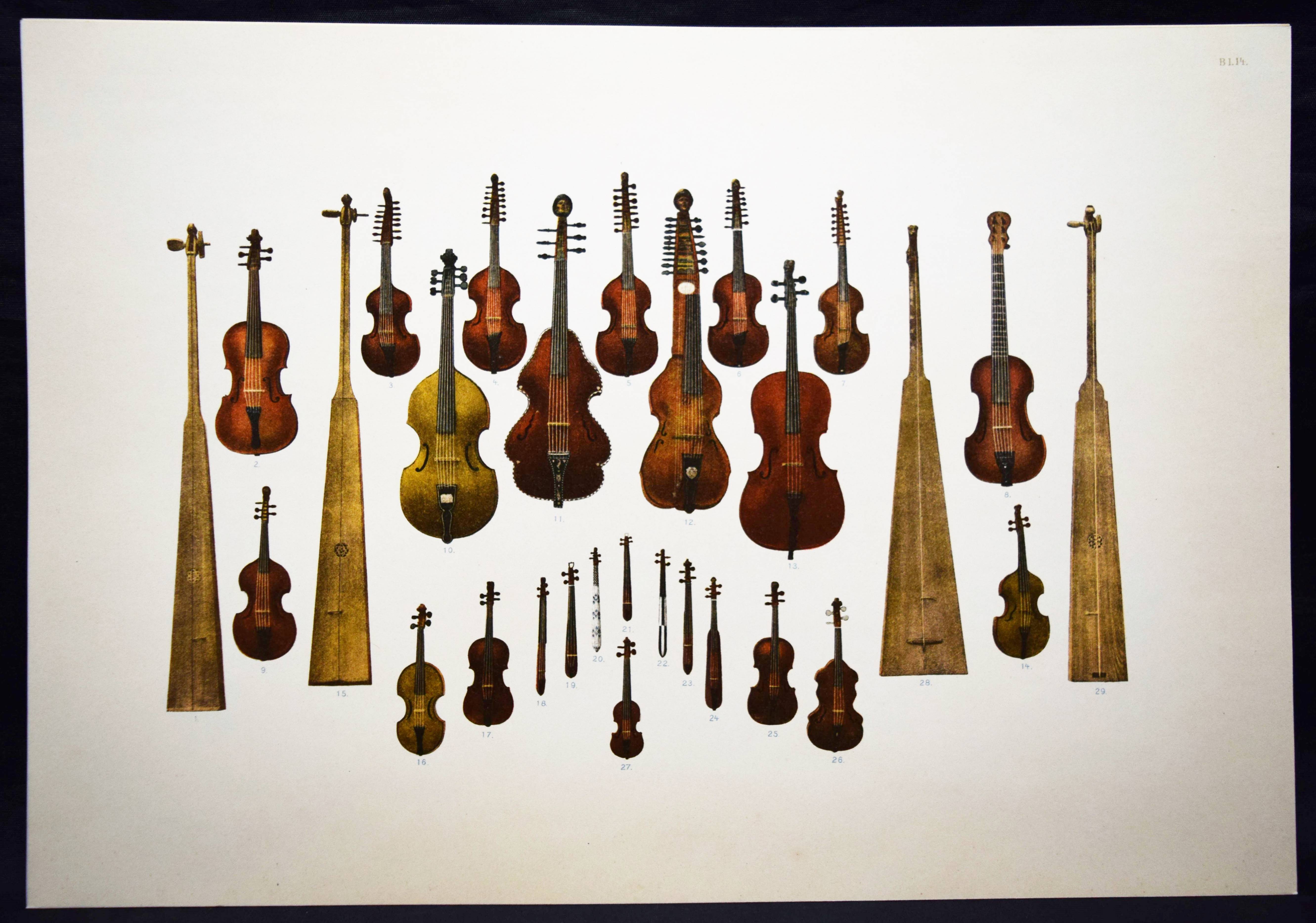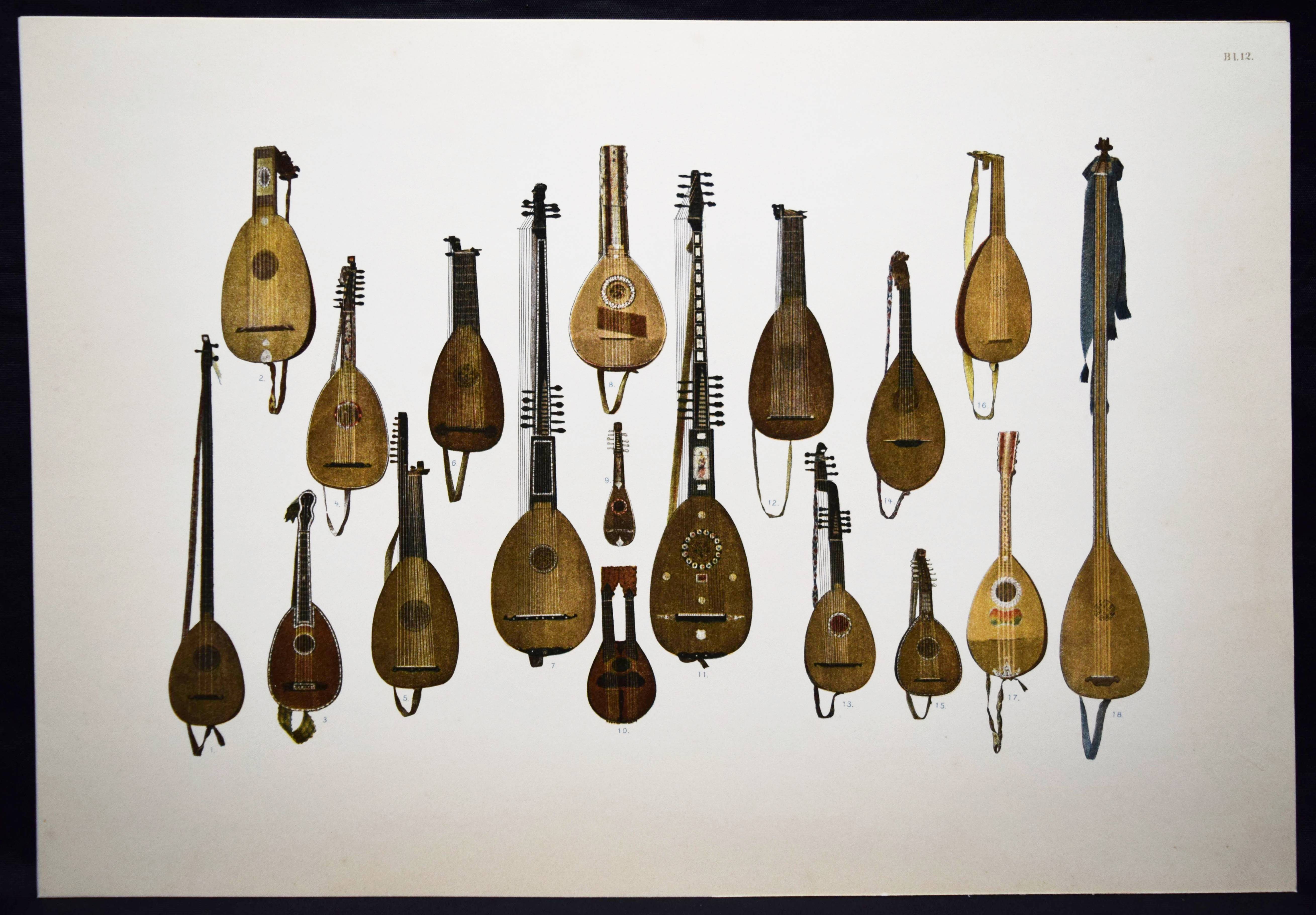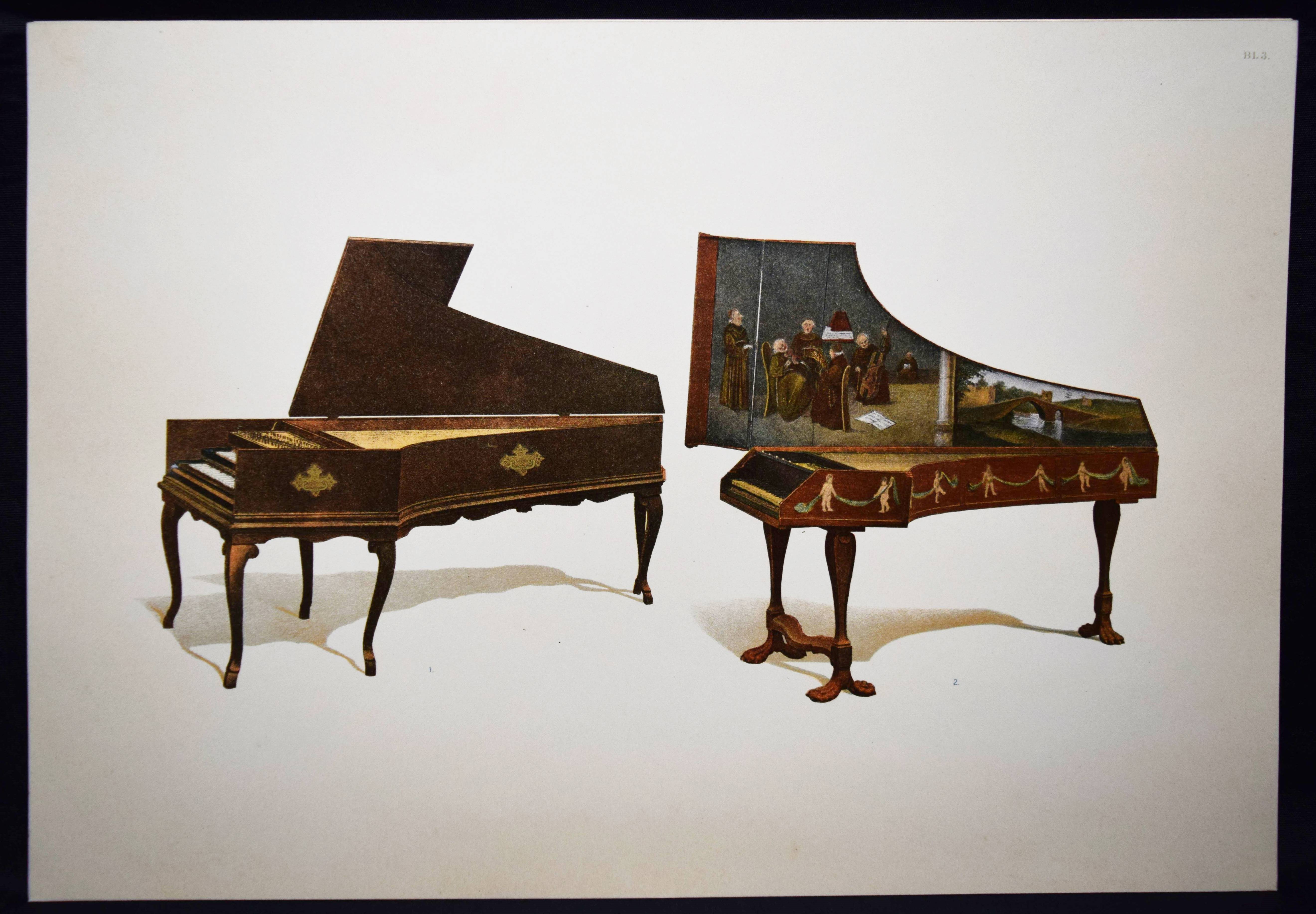 Wit, Paul de. Perlen aus der Instrumenten-Sammlung von Paul de Wit, Leipzig. Pearls from the Instrument Collection of Paul de Wit, Leipzig (Saxony). Leipzig, Selbstverlag (1892). Quer-4°. Titel u. 16 Farbtafeln in Photolithographie. Winrote Orig.-Samt-Flügelmappe mit farb. Deckelbild und Messing-Eckbeschlägen in Orig.-Pappschuber. MGG XIV, 736. Riemann 1319. – Seltene schön ausgestattete Vorzugsausgabe des wichtigen Sammlungskatalogs. Die Tafeln zeigen die schönsten Stücke des Leipziger Instrumentenmuseums, das von dem aus Holland stammenden Violincellisten Paul de Wit (1852-1925) gegründet worden ist. – Ohne die 14-seitige Textbeilage (liegt in Farbkopie bei und kann im Staatlichen Institut für Musikforschung, Berlin online abgerufen werden), Schuber angestaubt und fleckig, Titelblatt mit geringf. Randläsur, schönes Exemplar.