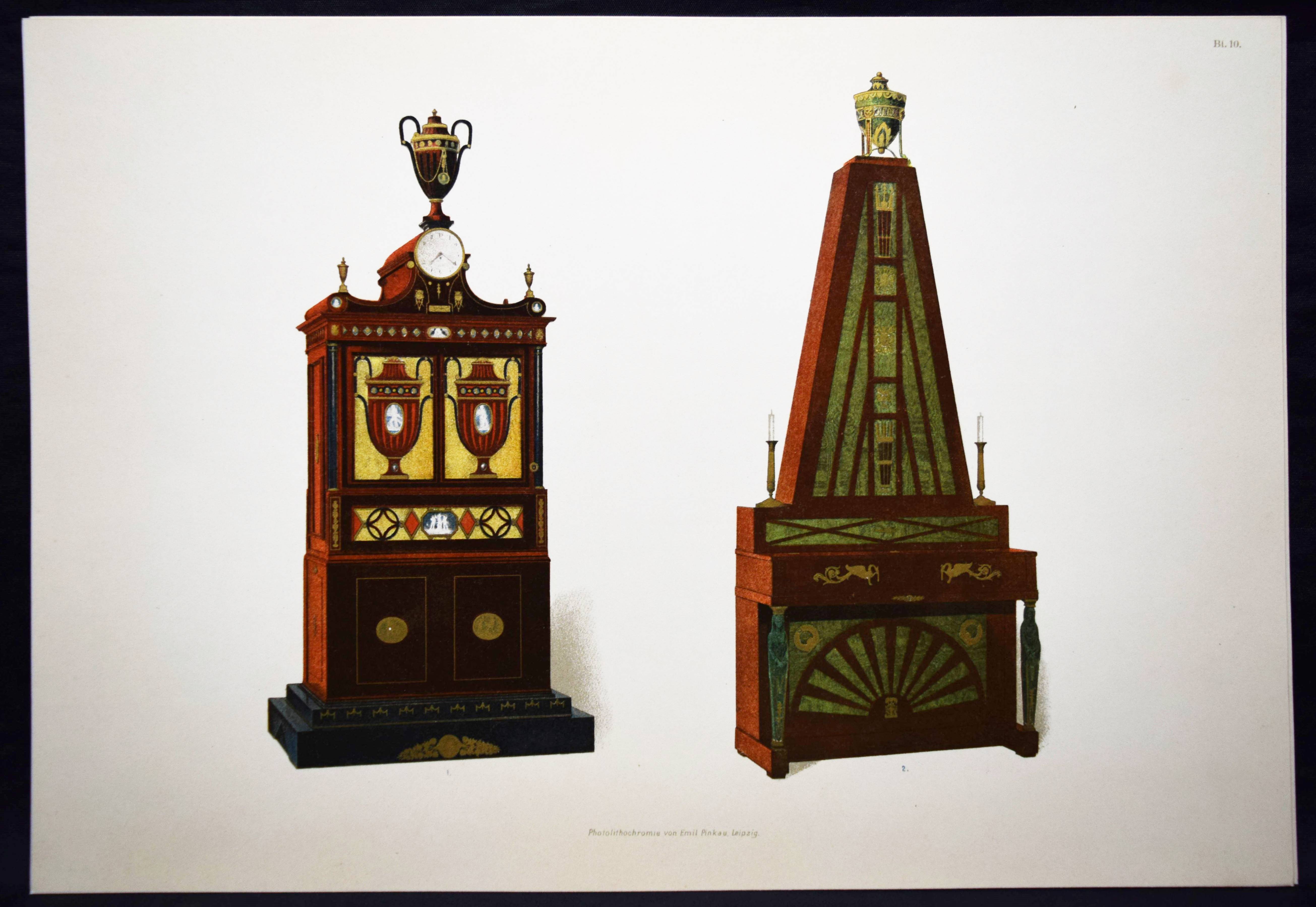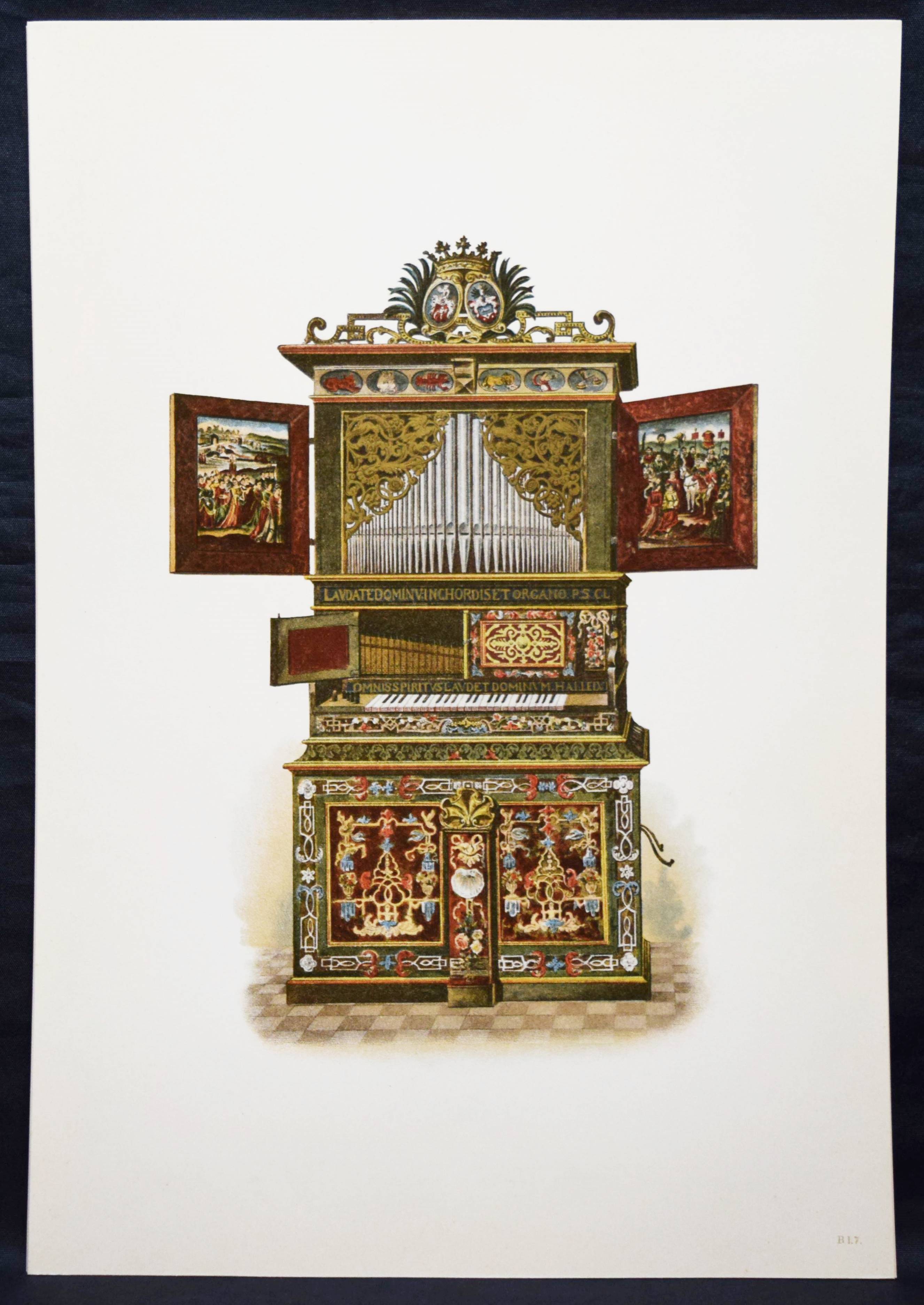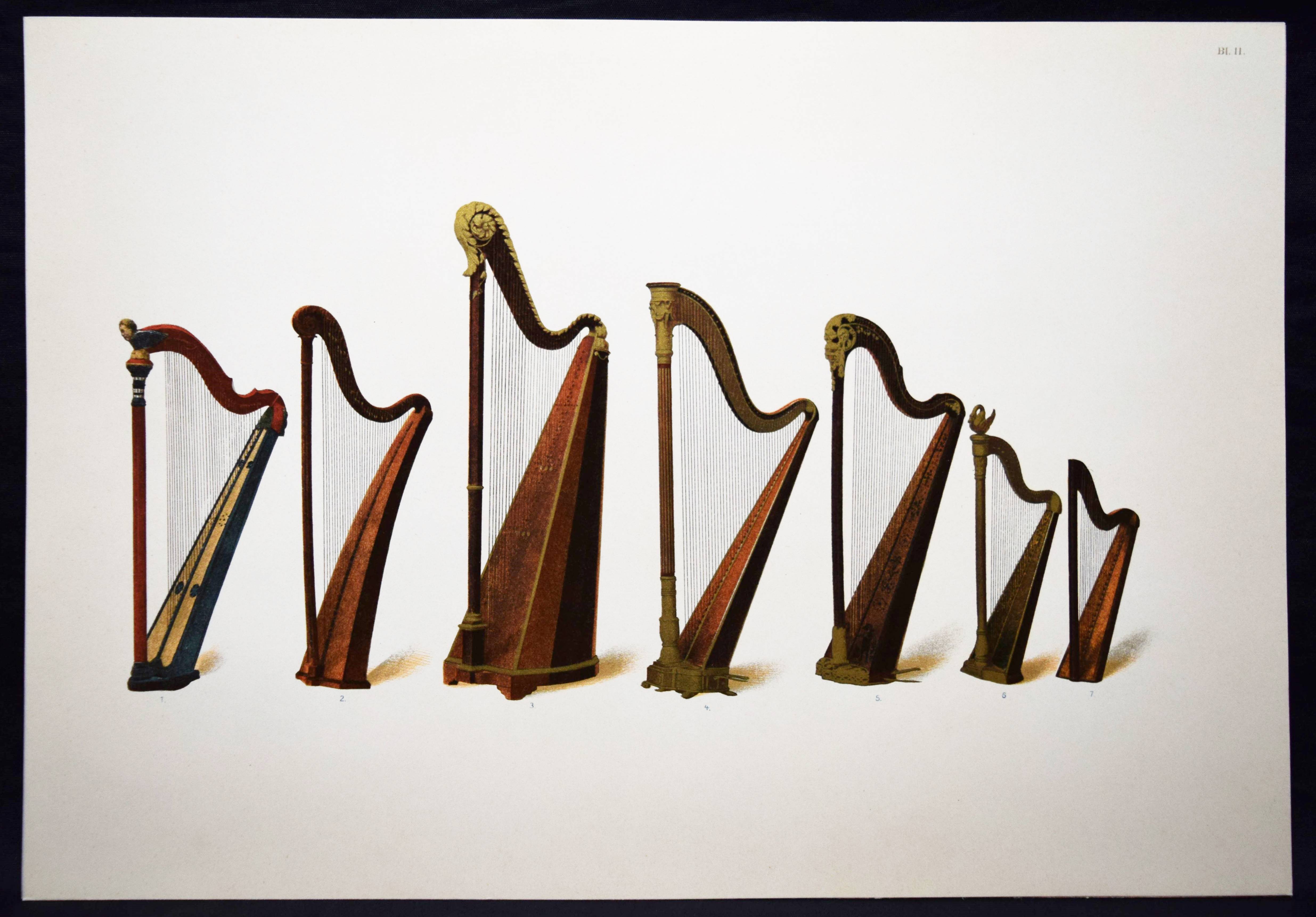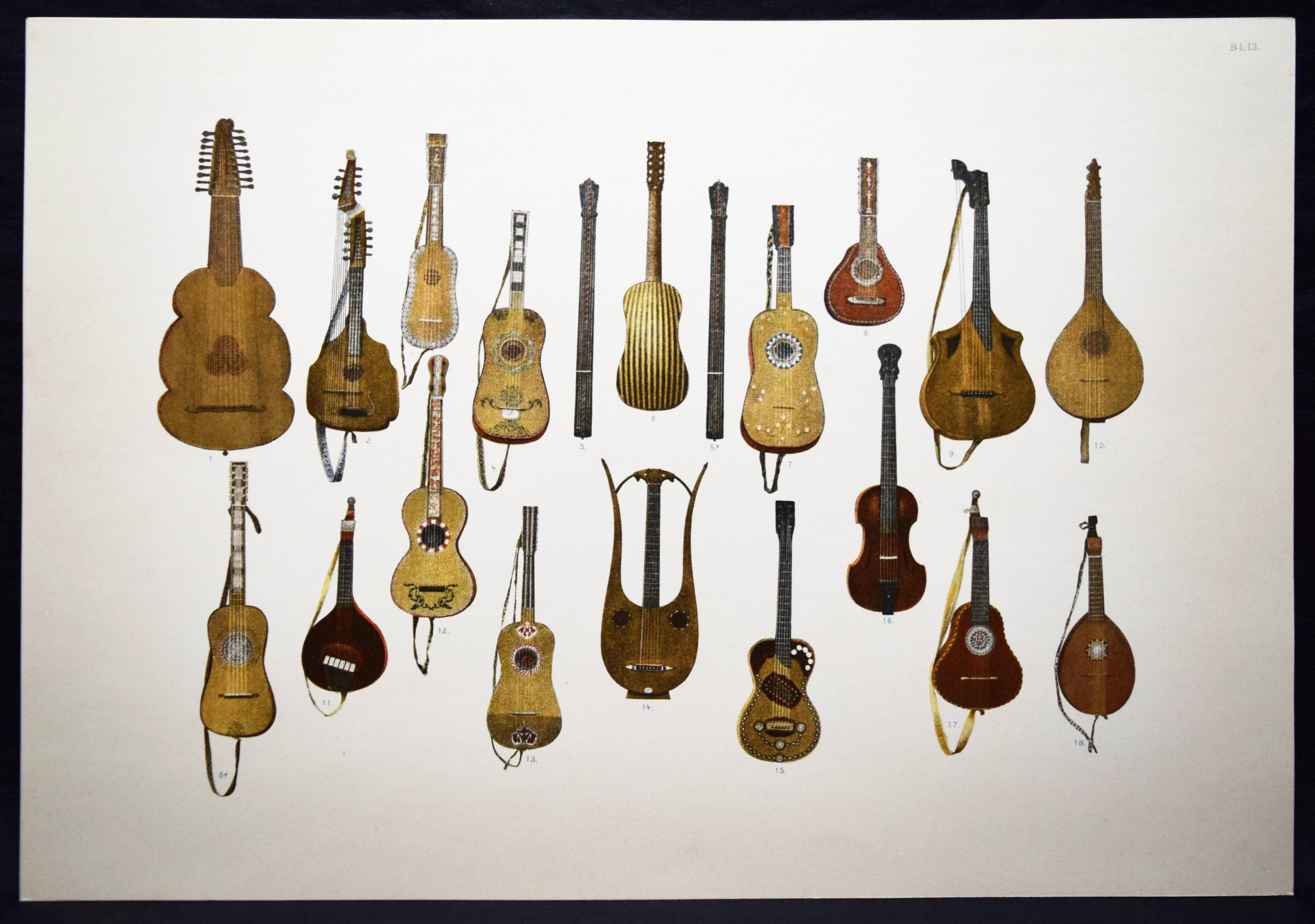 Wit, Paul de. Perlen aus der Instrumenten-Sammlung von Paul de Wit, Leipzig. Pearls from the Instrument Collection of Paul de Wit, Leipzig (Saxony). Leipzig, Selbstverlag (1892). Quer-4°. Titel u. 16 Farbtafeln in Photolithographie. Winrote Orig.-Samt-Flügelmappe mit farb. Deckelbild und Messing-Eckbeschlägen in Orig.-Pappschuber. MGG XIV, 736. Riemann 1319. – Seltene schön ausgestattete Vorzugsausgabe des wichtigen Sammlungskatalogs. Die Tafeln zeigen die schönsten Stücke des Leipziger Instrumentenmuseums, das von dem aus Holland stammenden Violincellisten Paul de Wit (1852-1925) gegründet worden ist. – Ohne die 14-seitige Textbeilage (liegt in Farbkopie bei und kann im Staatlichen Institut für Musikforschung, Berlin online abgerufen werden), Schuber angestaubt und fleckig, Titelblatt mit geringf. Randläsur, schönes Exemplar.