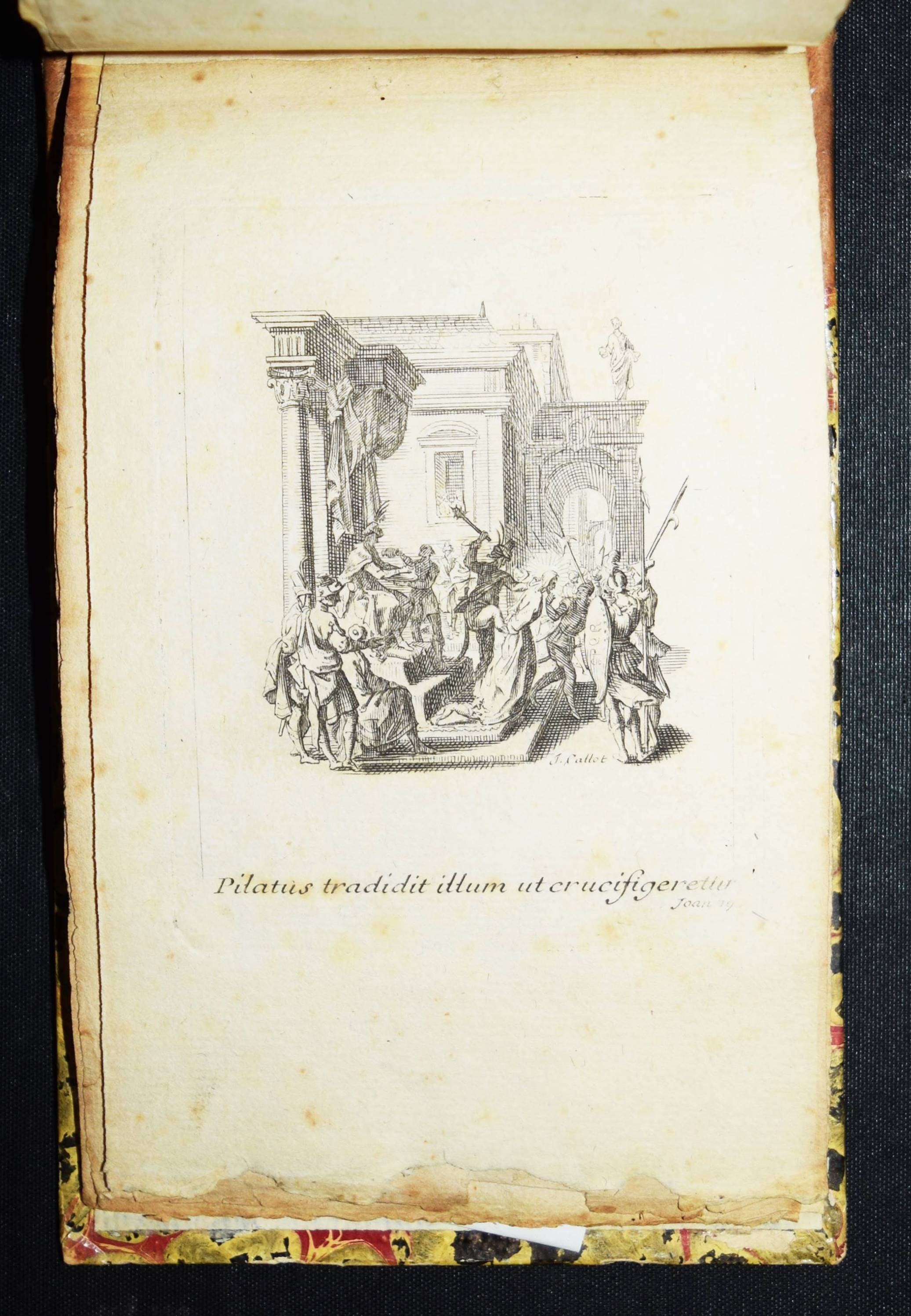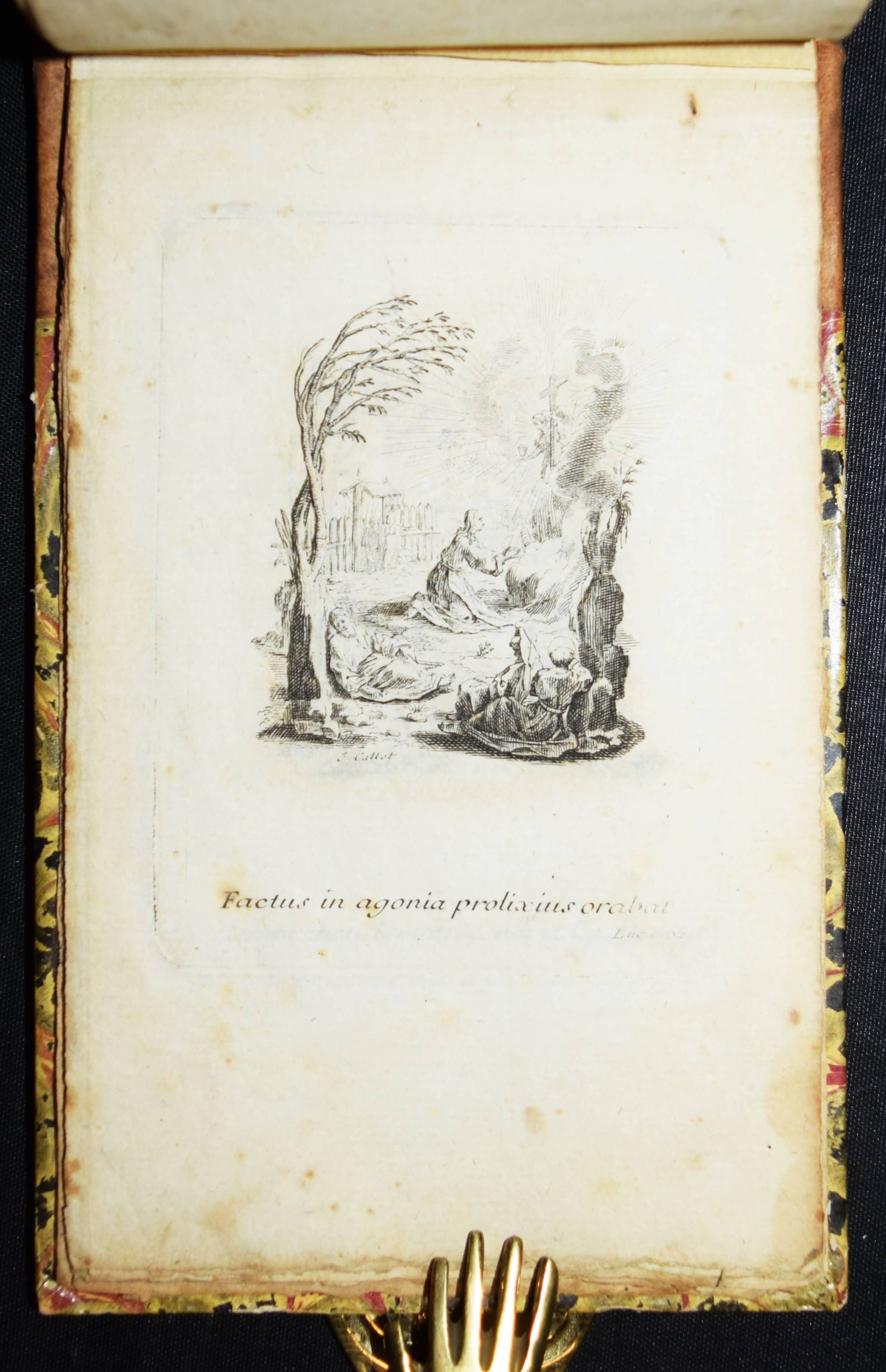 Callot, Jacques. La Passion de notre Seigneur Jesus Christ. (La Petite Passion, 1624). Paris, Pasquier o. J. (um 1750). Quer-12° (10,5 x 16 cm.). Gestoch. Titel u. 12 Radierungen (Plattengr. ca. 9 x 7 cm.). Hldr. des 19. Jahrhunderts mit goldgepr. Rückenschild u. Linienvergoldung. Lieure 537-548. Meaume 19-30. – Spätere Ausgabe der „Kleinen Passion“, wohl Nachstiche. – Alle Radierungen in der Platte signiert (″J. Callot“) und mit gestoch. Bibelstelle. – Le Lavement des pieds. – La Chène. – Jésus au jardin des oliviers. – Jésus est livré aux Juifs. – La Condamnation à mort. – Jésus est battu de verges. – Jésus comaraît devant Caïphe. – La couronnement d’épines. – La présentation au peuple. – Le portement de croix. – Le crucifiement. – Jésus est percé d’une lance. – Einband etwas berieben, durchgehend braunfleckig, meist außerhalb der Darstellung.