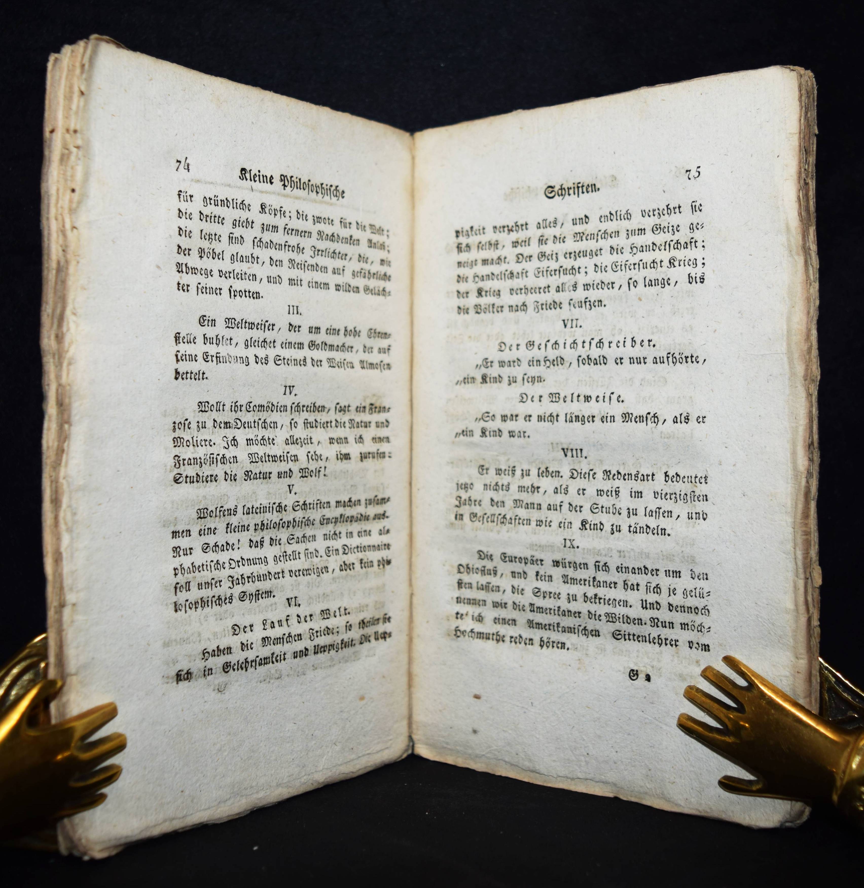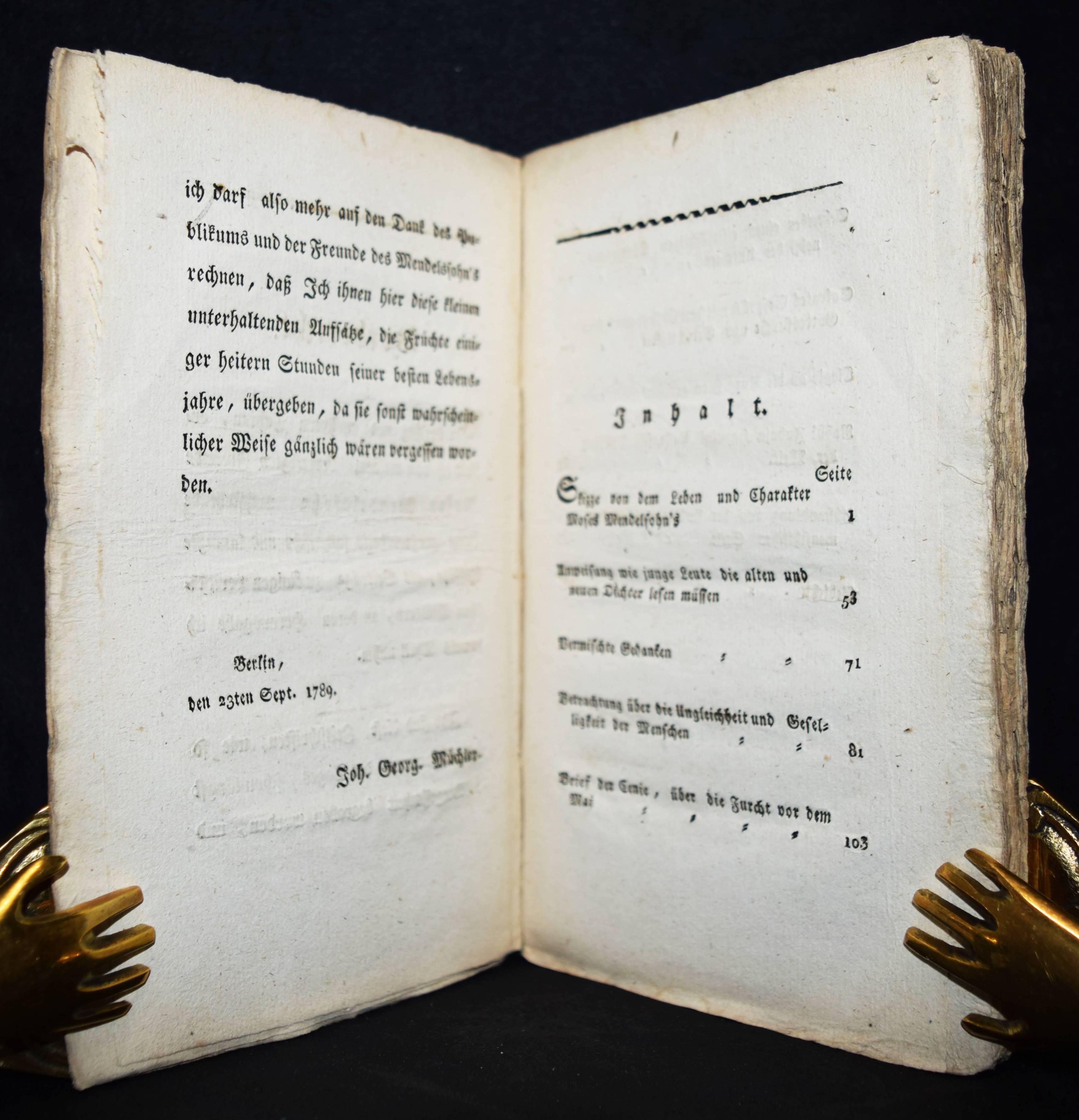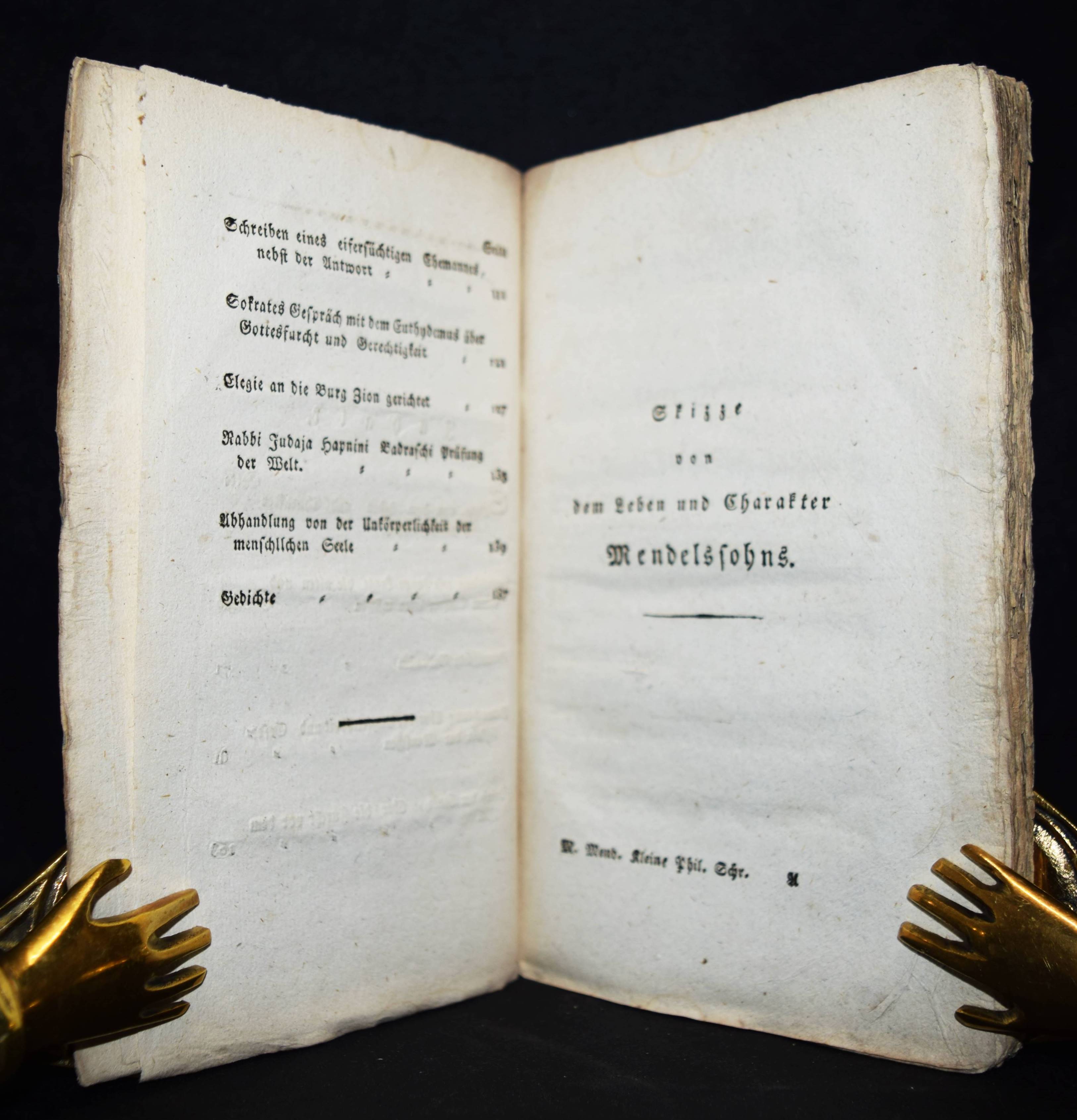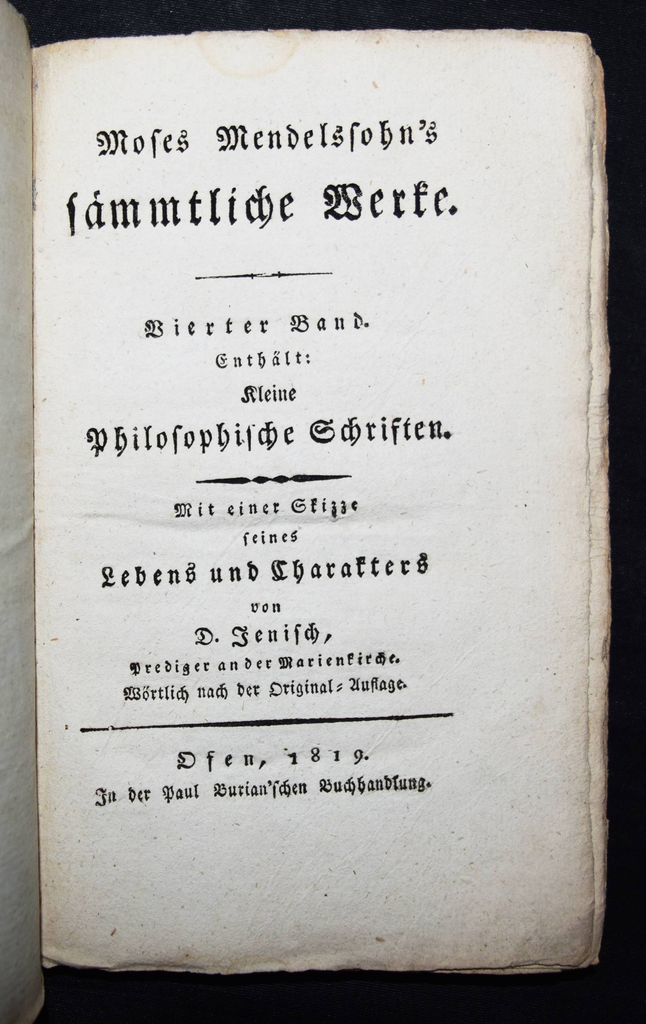| Mendelssohn, Moses. Kleine philosophische Schriften. Mit einer Skizze seines Lebens und Charakters von D(aniel) Jenisch. Ofen, Paul Burian 1819. Kl.-8°. [4] Bl., 201 S. Typogr. OKart. (Sämmtliche Werke, 4. Band). Vgl. Goed. IV/1, 490, 20. Meyer, Mendelssohn 56. Ziegenfuss II, 149 f. (erwähnt vorliegendes Werk nicht). – Die erste Ausgabe dieser Sammlung, von J. G. Müchler herausgegeben, erschien 1789 in Berlin. – Enthält ‚Betrachtung über die Ungleichheit und Geselligkeit der Menschen’, ‚Anweisung wie junge Leute die alten und neuen Dichter lesen müssen’, ‚Abhandlung von der Unkörperlichkeit der menschlichen Seele’ und andere Aufsätze, die zuvor in schwer zugänglichen Zeitschriften veröffentlicht waren, sowie die informative und warmherzige Lebensbeschreibung Mendelssohns (1729-1786) durch D. Jenisch im Erstdruck. – „Die beiden hauptsächlichen Probleme M.s waren die Existenz Gottes und die Unsterblichkeit der Seele; er glaubte beide positiv zu lösen und die Richtigkeit der Lösung streng beweisen zu können, die Existenz Gottes mit dem ontologischen Argument. Die bloße Möglichkeit würde mit dem Begriff des vollkommensten Wesens in Widerspruch stehen. Auch die Unsterblichkeit der Seele scheint M. gesichert. Hält er doch die plötzliche oder allmähliche Vernichtung der Seele für unmöglich, weil sie als das denkende Wesen nicht nichtseiend sein kann, ohne daß unvorstellbare und undenkbare Konsquenzen, ein undenkbarer Sprung ins Nichts sich ergeben“ (W. Ziegenfuss). – Rücken berieben u. restauriert, nur vereinzelt leicht braunfleckig, gutes unbeschnittenes Exemplar.
