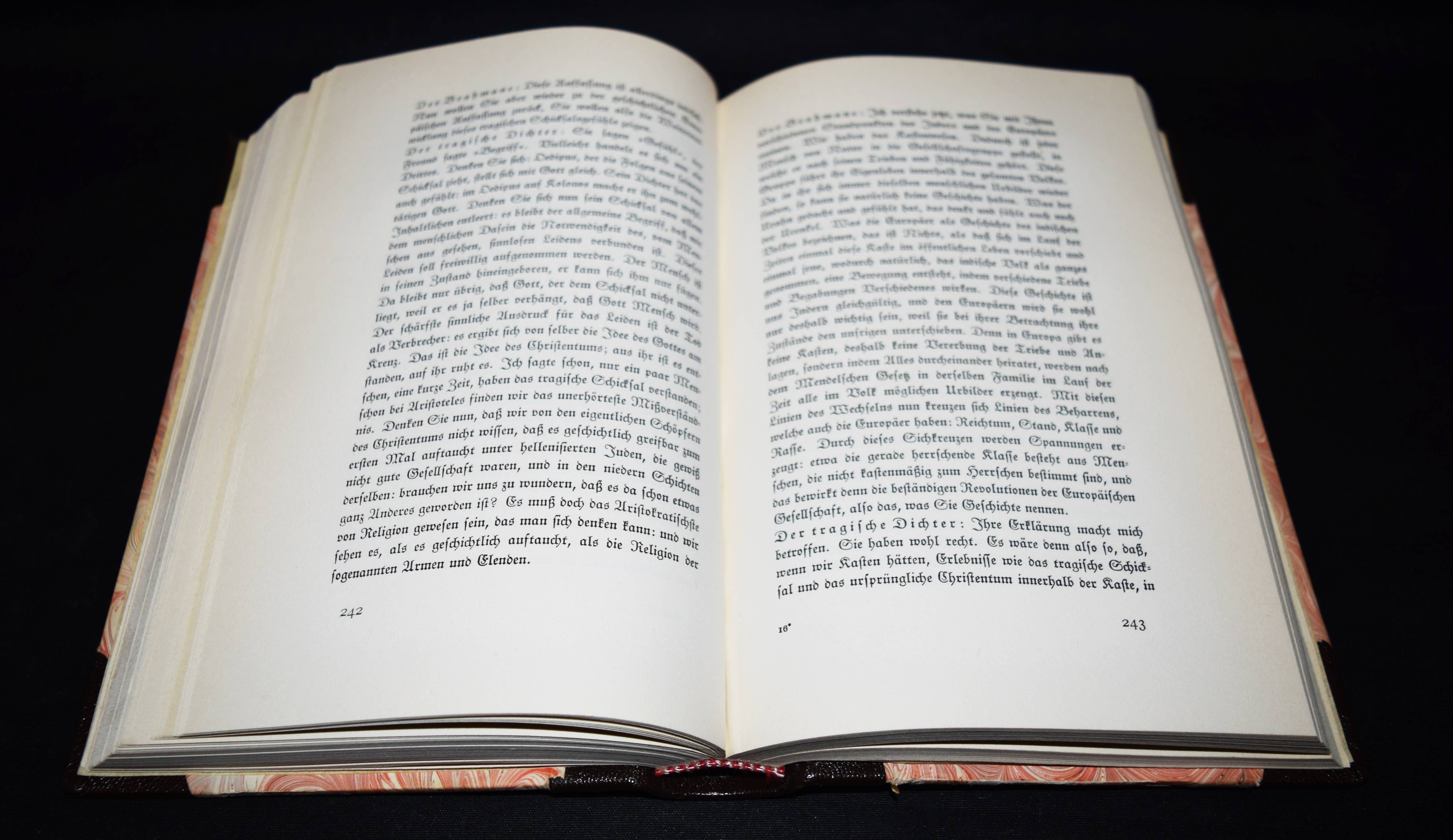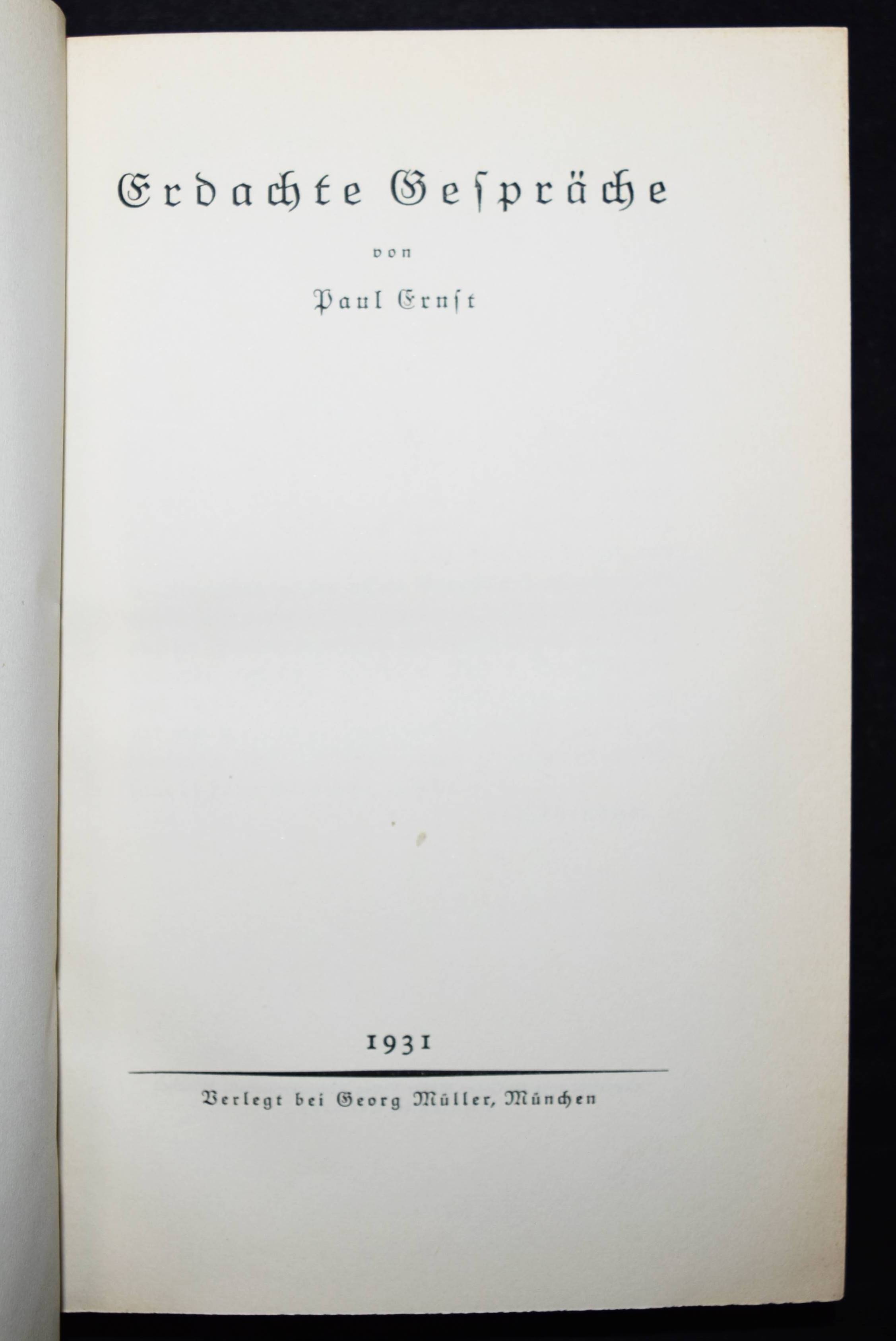 Ernst, Paul. Erdachte Gespräche. München, Müller 1931. 8°. 429 S. Moderner Hldr. mit goldgepr. Rückenschild u. Rückenverg. (Gesammelte Werke, Abt. 3, Theoretische Schriften, Band 6). W.-G.² 114. – Erste Ausgabe. – Schönes dekorativ gebundenes Exemplar.
