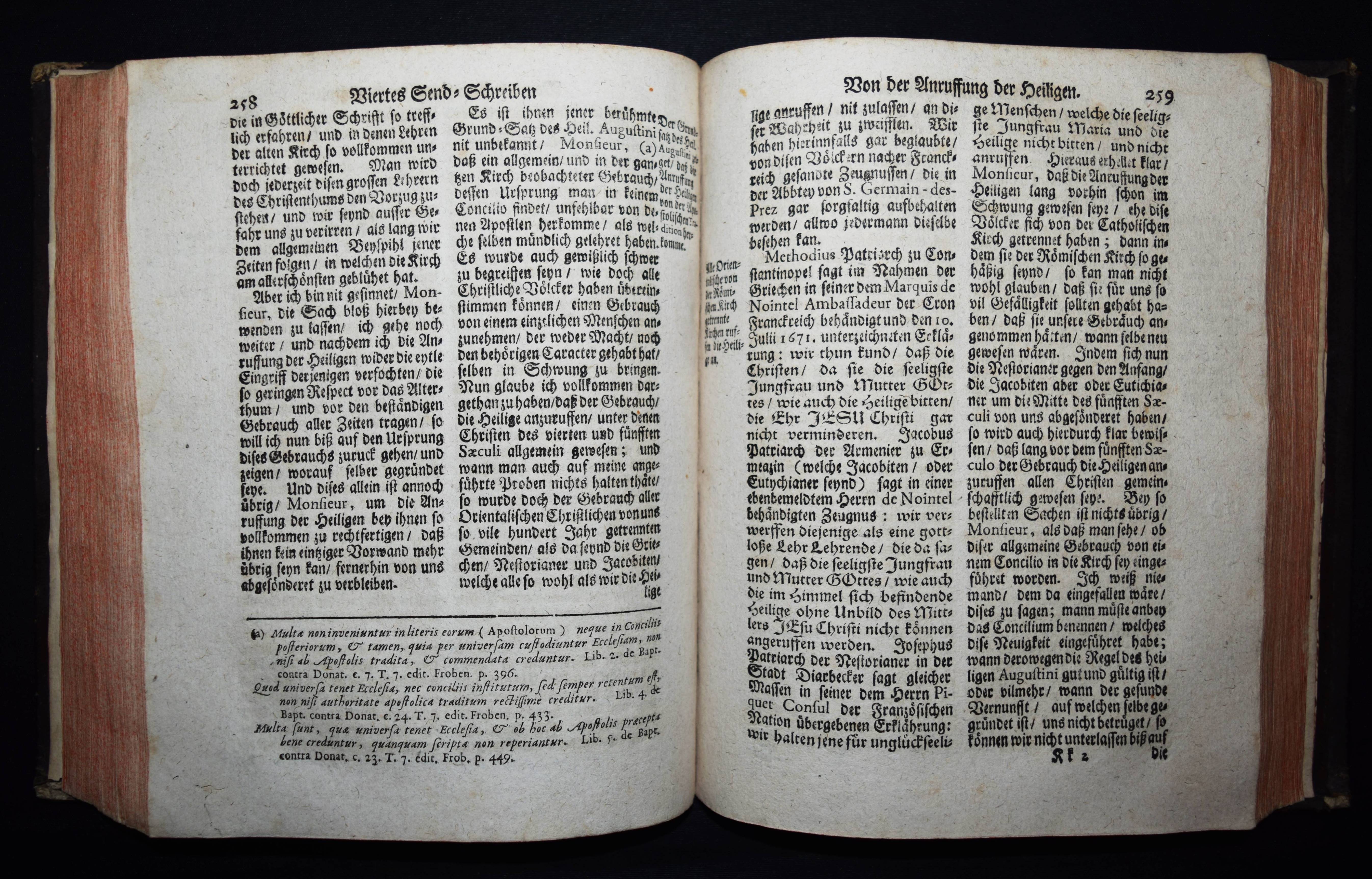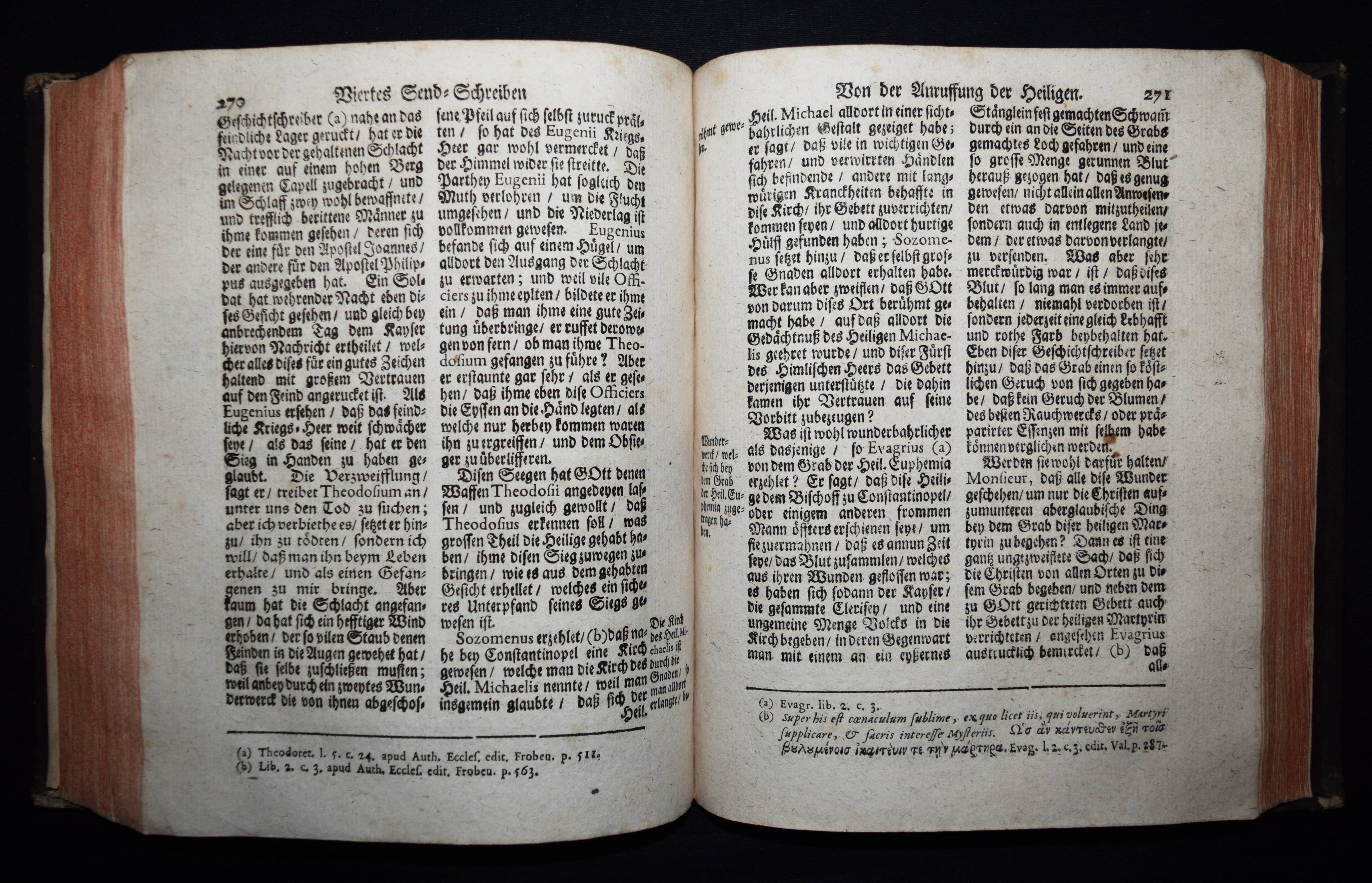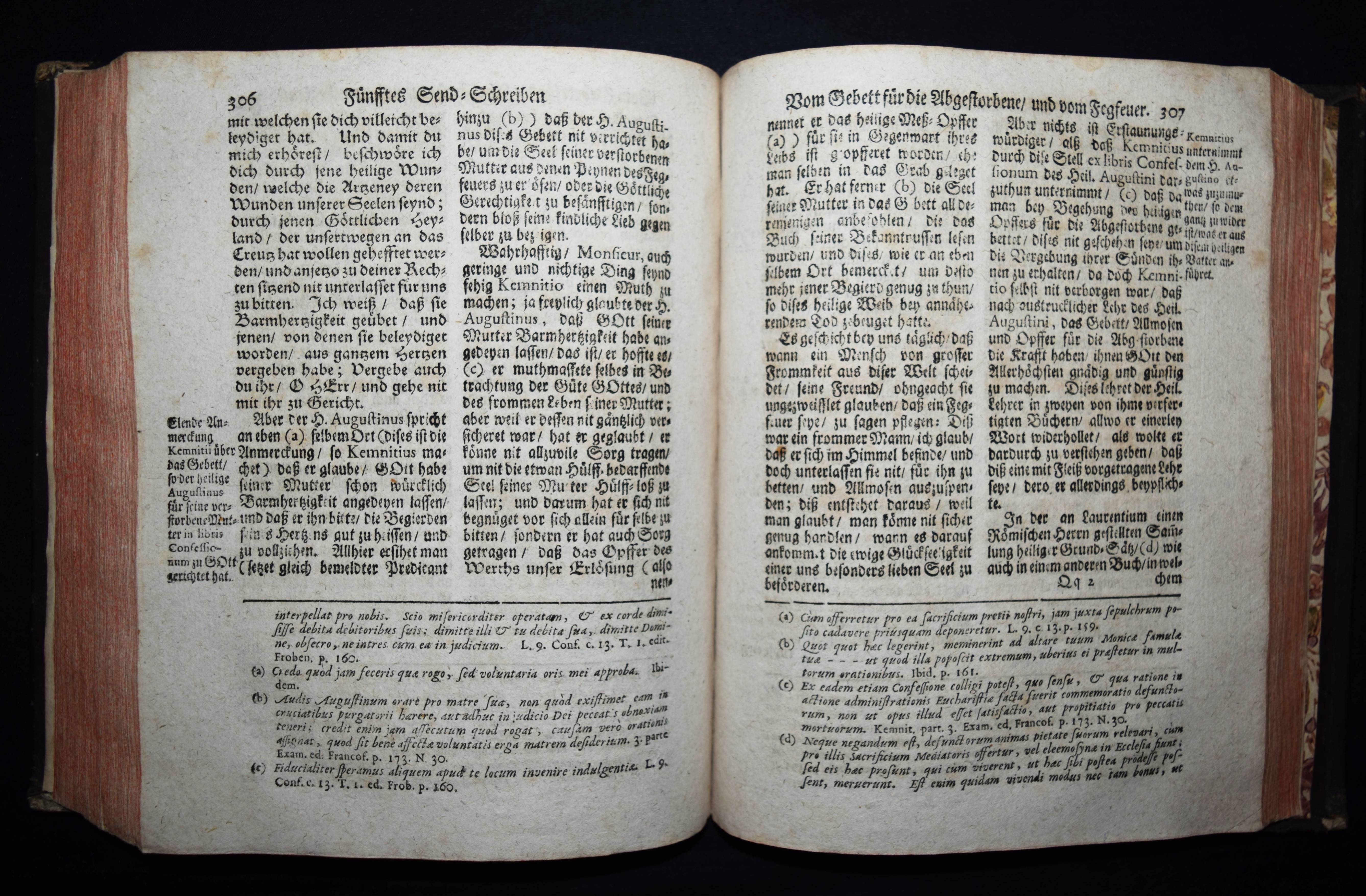 | Scheffmacher, Johann Jacob. Send-Schreiben eines teutschen Theologi der Catholischen Universität zu Straßburg an eine Der fürnehmsten Obrigkeitlichen Personen besagter Stadt, welche sich zur Augspurgischen Confession bekennet. Worinnen dargethan wird, Daß die Fürnehmste, ihre Spaltung zu beschönigen, von denen Lutheranern angeführte Ursachen keinesweegs wichtig genug seyen, sie von der Ruckkehr zur Catholischen Kirchen abzuhalten. Augspurg, J. H. Müller 1739. Gr.-8°. [2] Bl., 425 S., [5] Bl. Ldr. d. Zt. mit goldgepr. Rückenschild u. reicher Rückenvergoldung. ADB XXX, 684 f. VD18 14694700. – Erste Ausgabe. – Johann Jacob Scheffmacher (1668-1733) war seit „1715 Professor der Polemik an der katholischen Universität zu Straßburg, später auch Rector derselben; zugleich versah er die Kanzel für Controverspredigten im Dome, welche Ludwig XIV. zur Bekehrung der elsässischen Protestanten gegründet hatte. Er war einer der angesehensten Controversisten seiner Zeit“ (O. Schmid in ADB). – „Unter Scheffmachers Werken ragen hervor eine Anzahl in Briefform verfaßter Abhandlungen über strittige Lehrpunkte: Lettres d’un docteur allemand… Sie erlebten zahlr. Auflagen, wurden auch in mehrere Sprachen übersetzt u. riefen protestantischerseits viele Gegenschriften hervor (Wetzer-Welte). – Kapital und Fuß etwas beschädigt, Deckel etwas berieben, stellenweise etwas braunfleckig und gebräunt, gutes dekorativ gebundenes Exemplar.