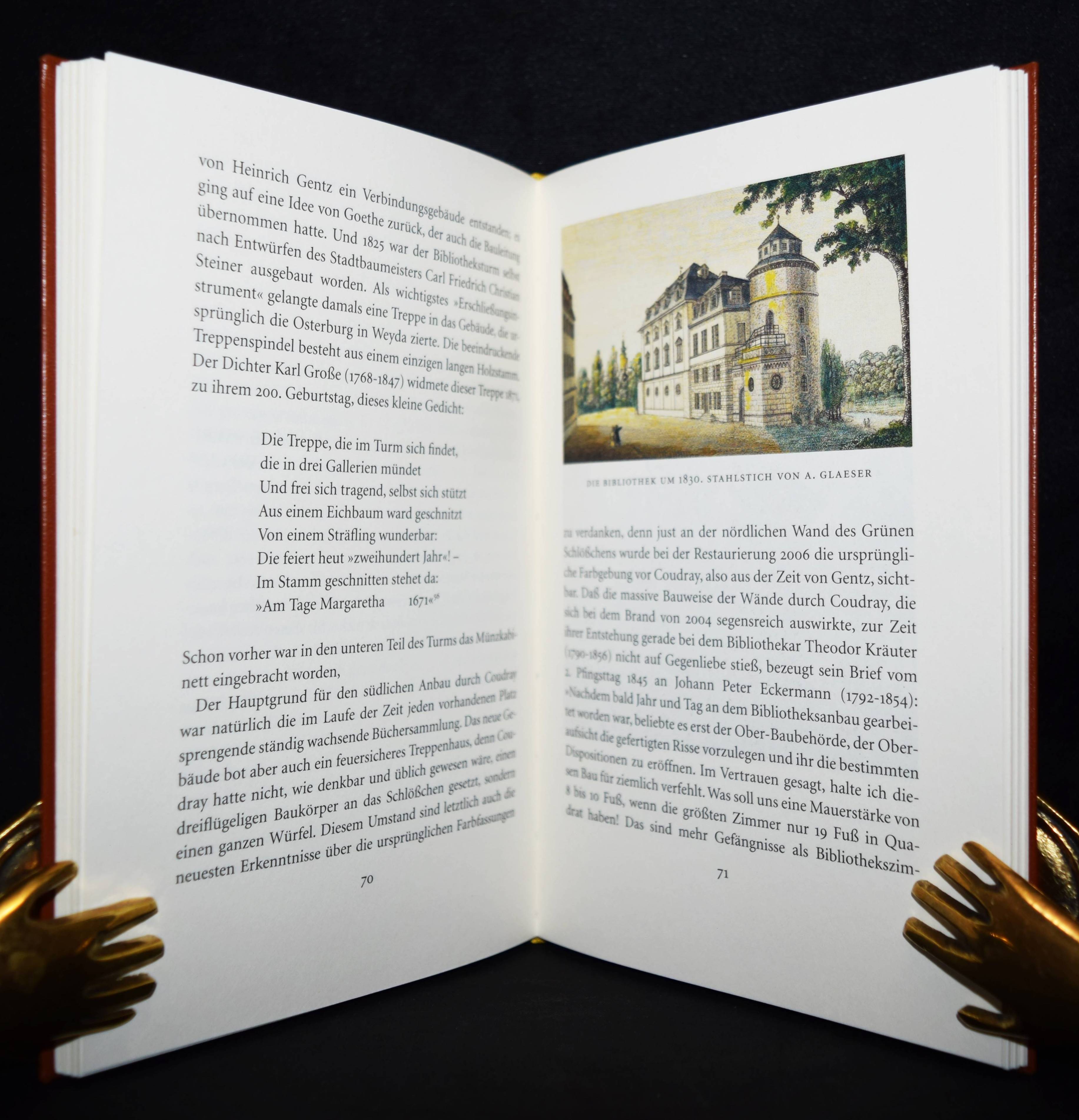 Seemann, Annette. Die Geschichte der Herzogin Anna Amalia Bibliothek. Frankfurt am Main, Leipzig, Insel-Verlag (2007). 8°. 123 S. mit zahlr. meist farb. Abb. OLdr. mit goldgepr. Rückentitel, Deckelvignette u. Deckelfiletten in Orig.-Pappschuber. (Insel-Bücherei, Nr. 1293). Sehr gutes Exemplar der schönen Ganzlederausgabe.