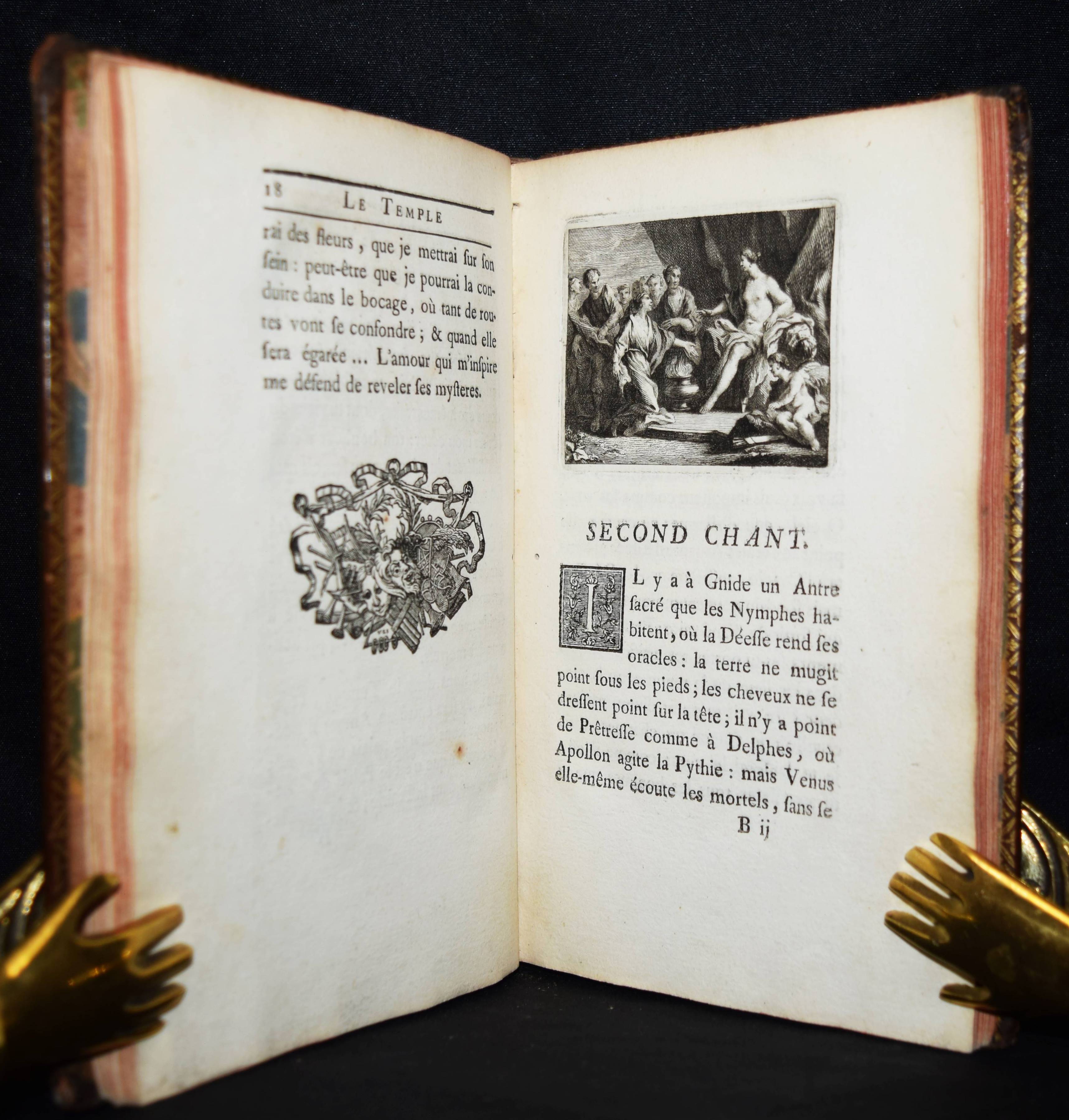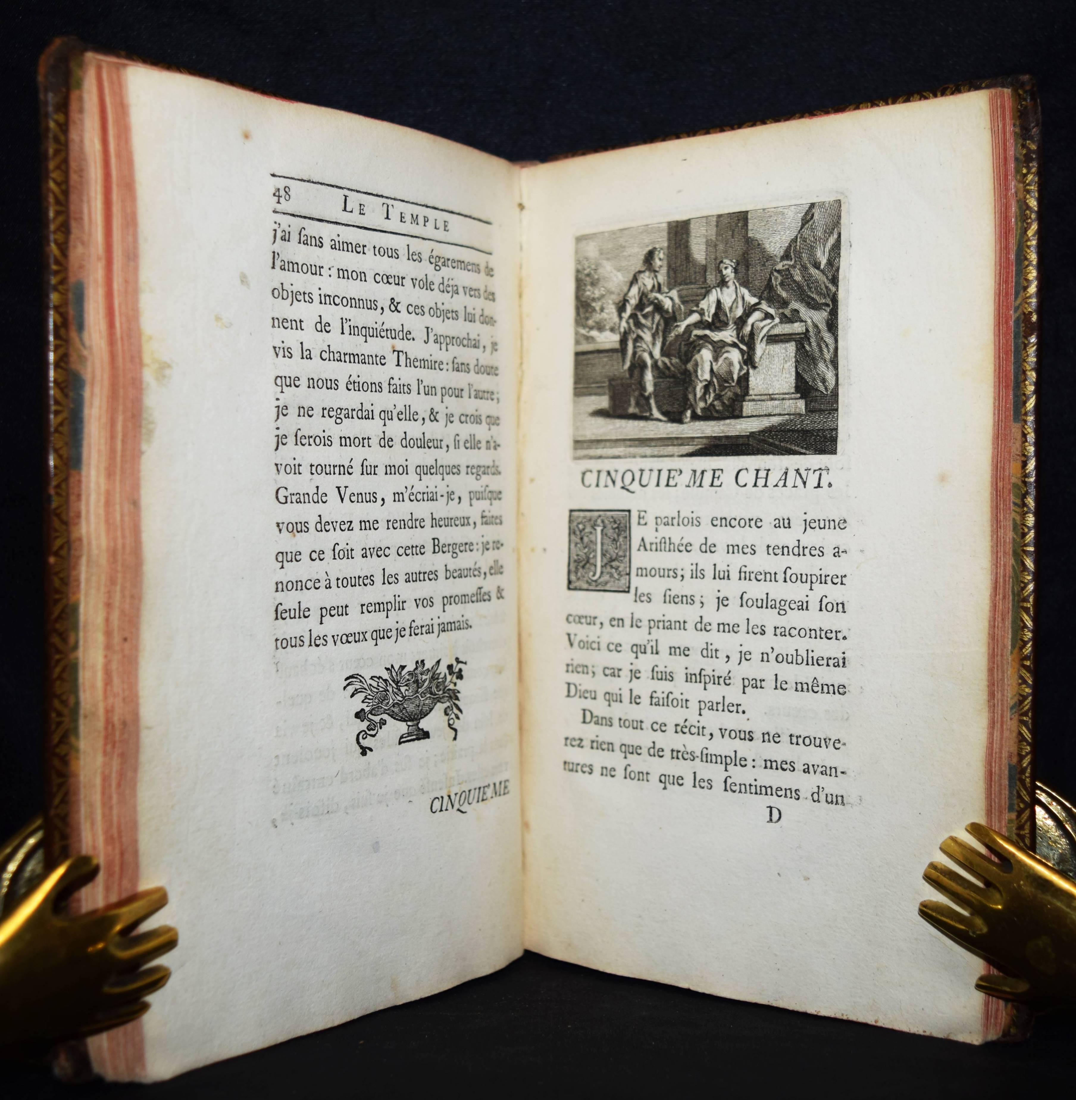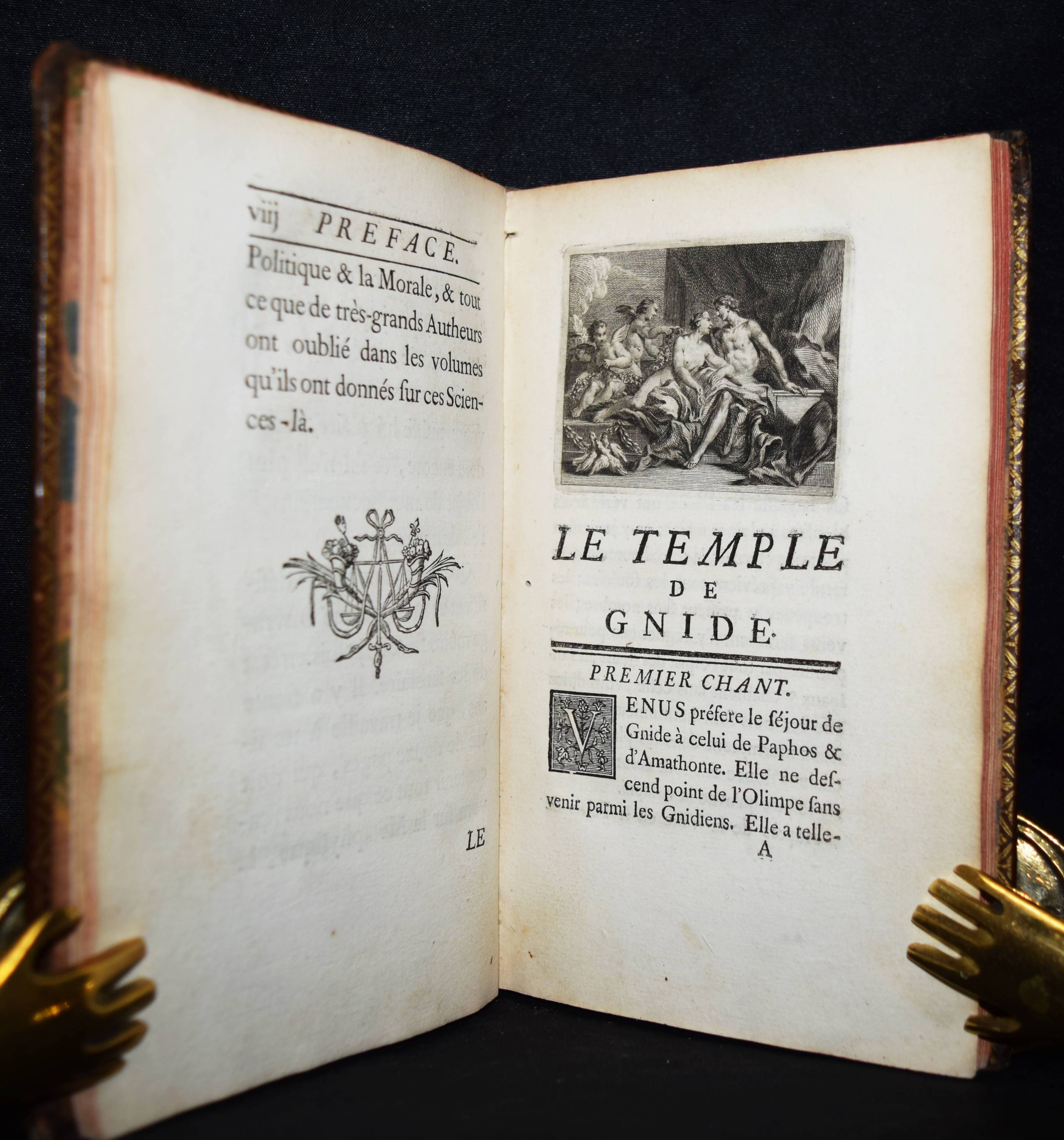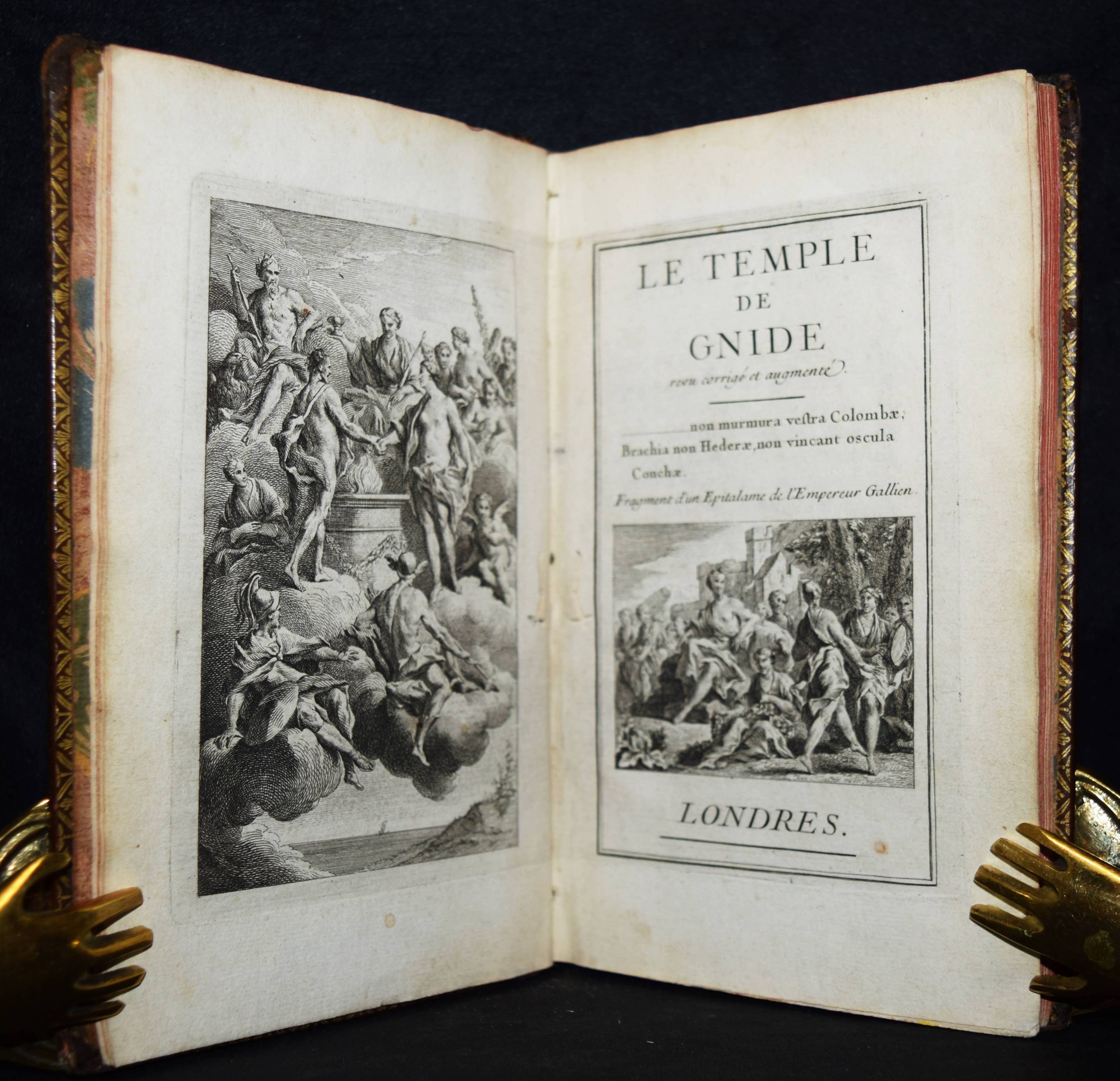 (Montesquieu, Charles de Secondat). Le temple de Gnide. (Nouvelle edition), revu corrigé et augmente. Londres (d. i. Paris), o. Dr. u. J. (1742). 8°. VIII, 85 S. mit gestoch. Frontispiz, gestoch. illustr. Titel und 8 gestoch. Vignetten. Kalblederband d. Zt. mit goldgepr. Rückenschild, Rücken- u. Innenkantenvergoldung Cohen-de Ricci 725. Sander 1383. Vgl. Brunet III, 1860. Tchémerzine IV, 924. Erste illustrierte Ausgabe. Die schönen Vignetten werden De Sève zugeschrieben. (EA Paris 1725). – Vorderes Gelenk in der unteren Hälfte angeplatzt, nur vereinzelt schwach fleckig, gutes dekorativ gebundenes Exemplar.