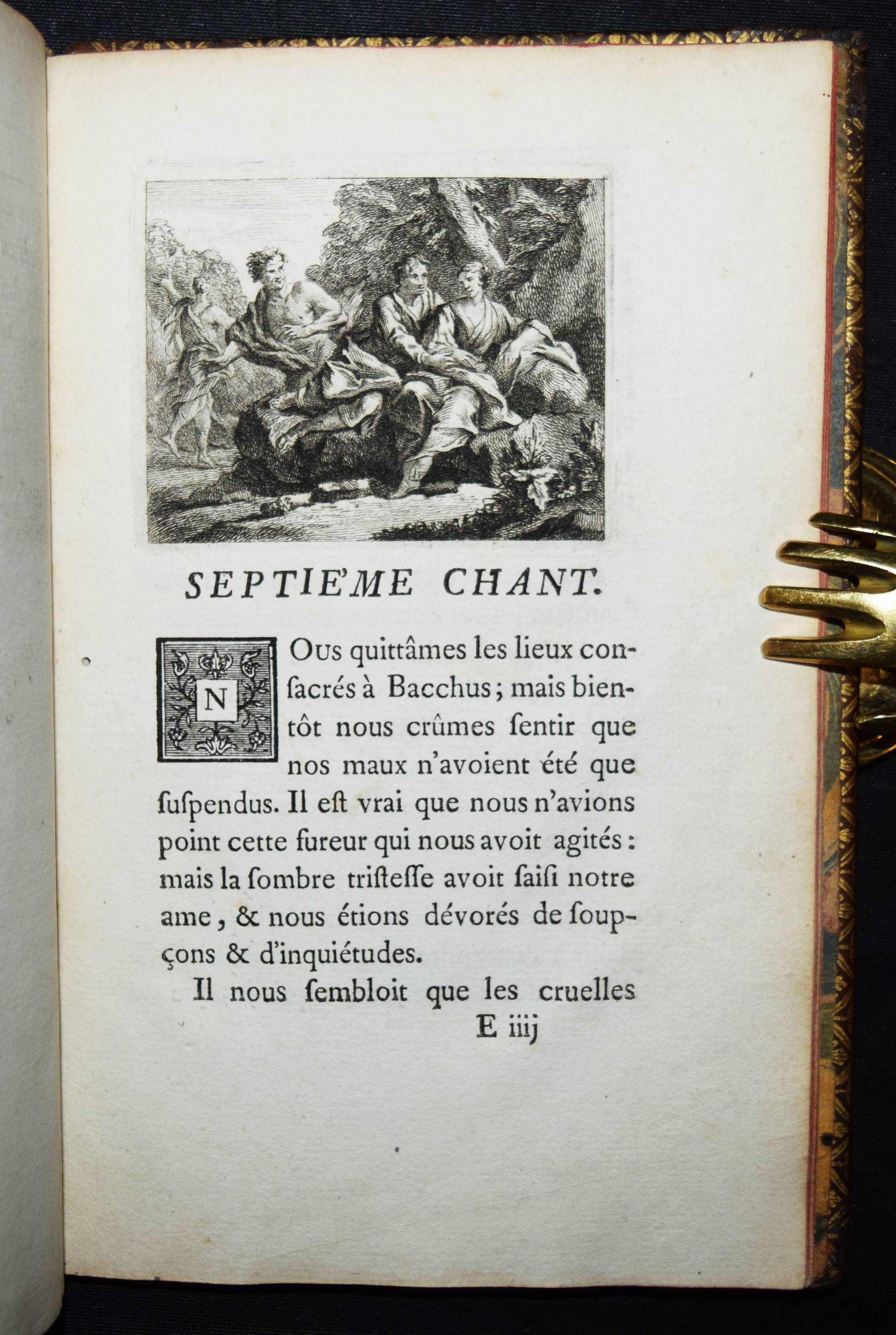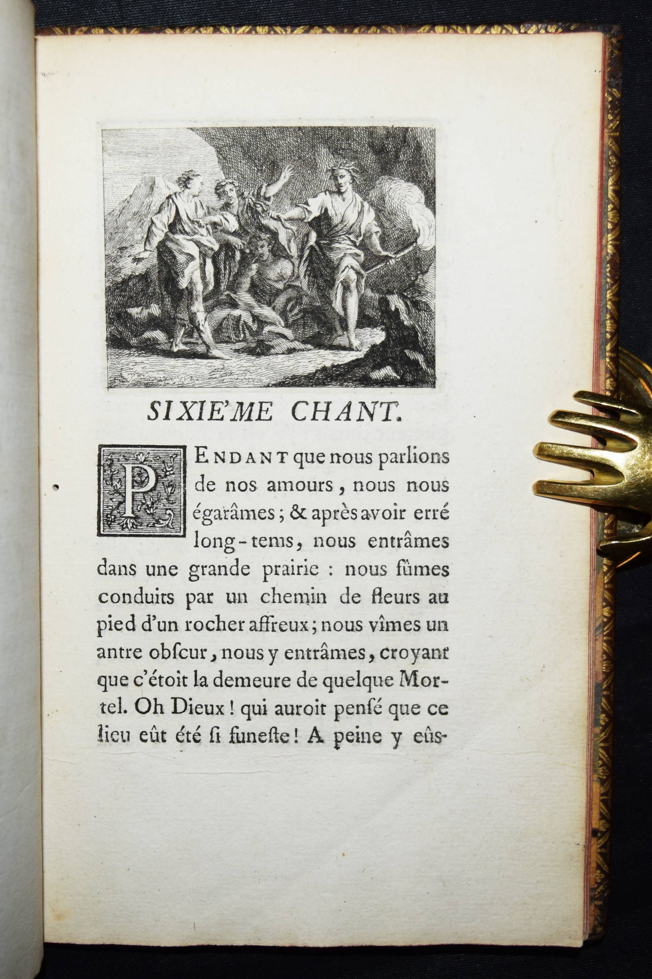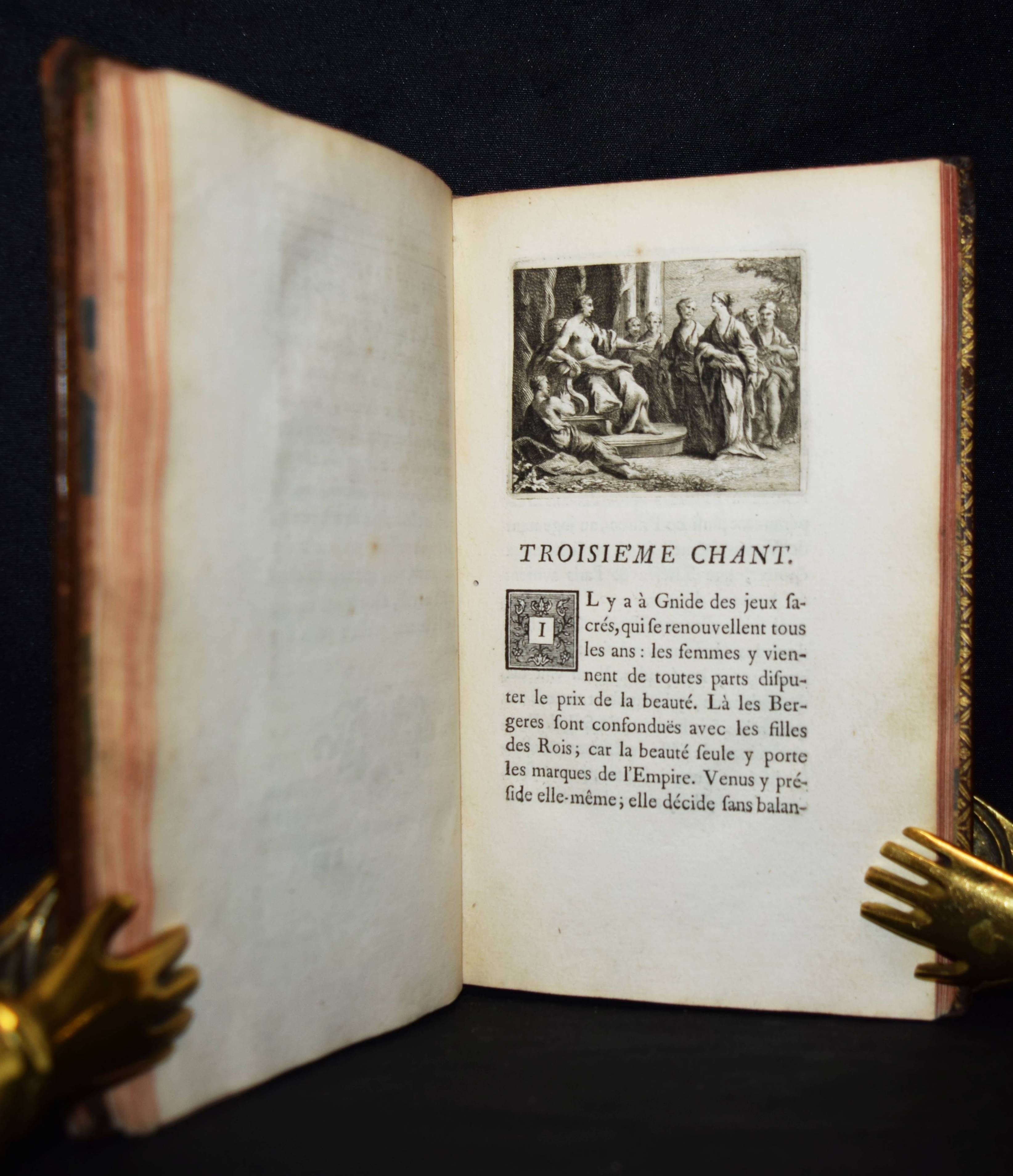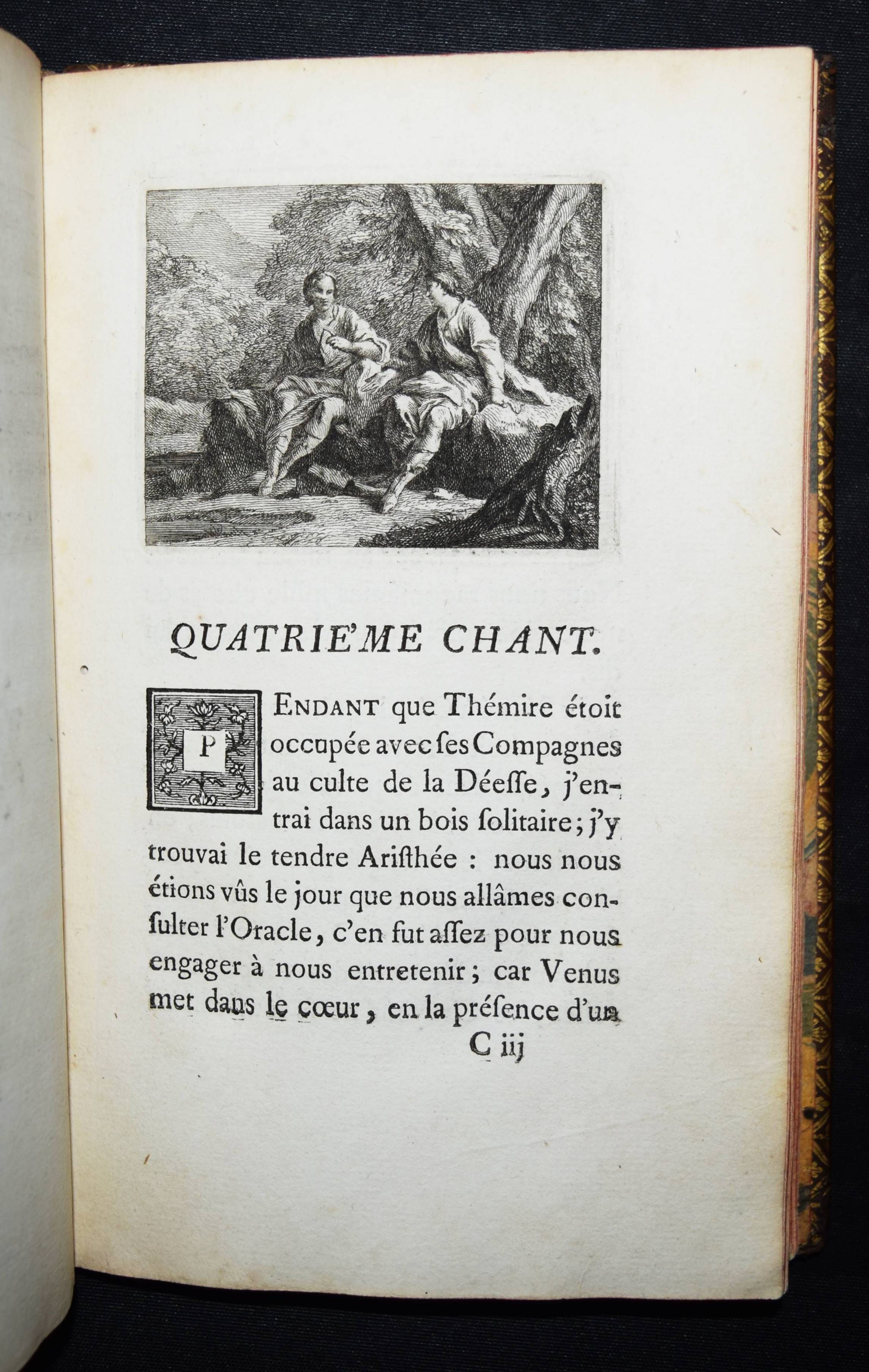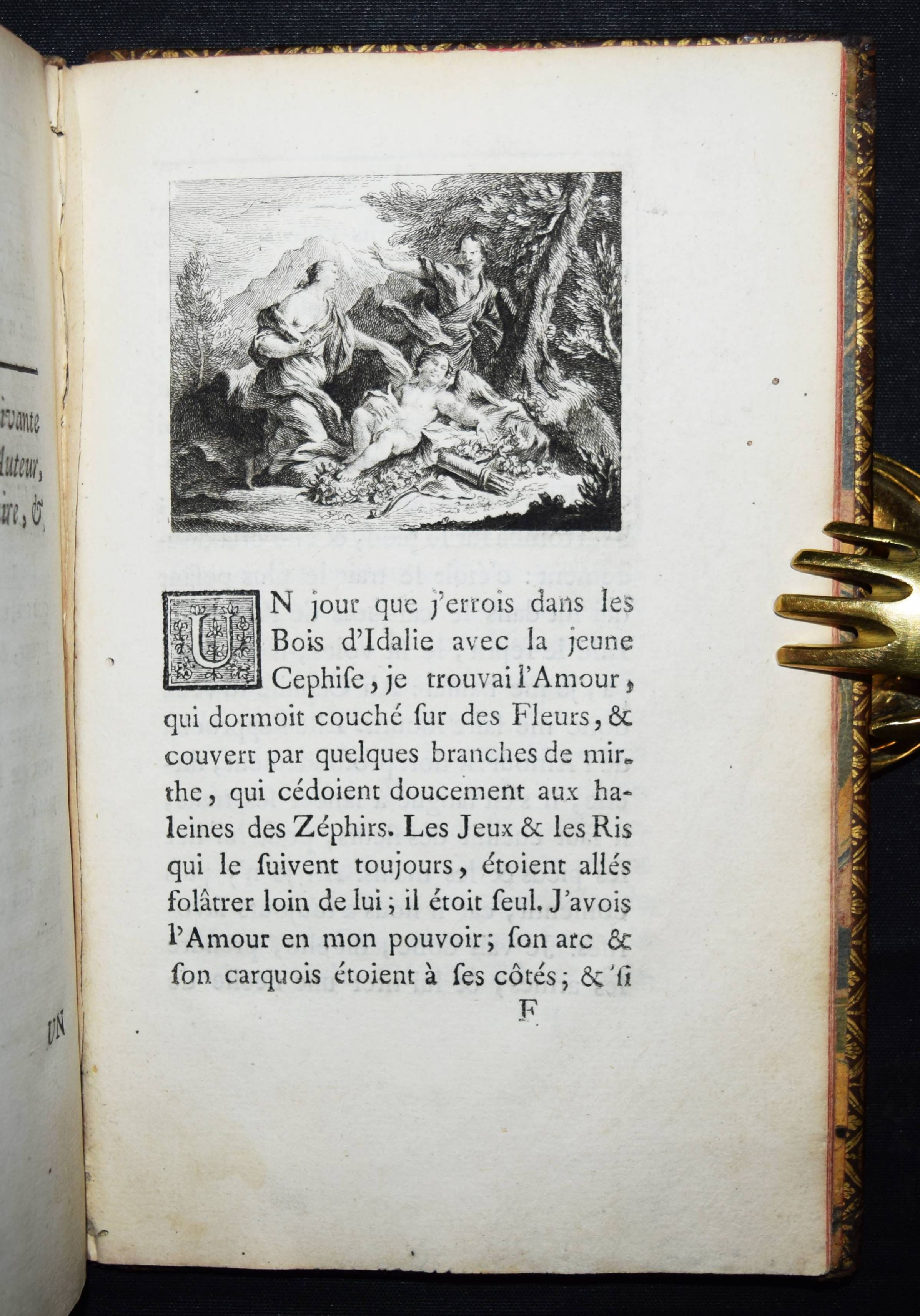 (Montesquieu, Charles de Secondat). Le temple de Gnide. (Nouvelle edition), revu corrigé et augmente. Londres (d. i. Paris), o. Dr. u. J. (1742). 8°. VIII, 85 S. mit gestoch. Frontispiz, gestoch. illustr. Titel und 8 gestoch. Vignetten. Kalblederband d. Zt. mit goldgepr. Rückenschild, Rücken- u. Innenkantenvergoldung Cohen-de Ricci 725. Sander 1383. Vgl. Brunet III, 1860. Tchémerzine IV, 924. Erste illustrierte Ausgabe. Die schönen Vignetten werden De Sève zugeschrieben. (EA Paris 1725). – Vorderes Gelenk in der unteren Hälfte angeplatzt, nur vereinzelt schwach fleckig, gutes dekorativ gebundenes Exemplar.
