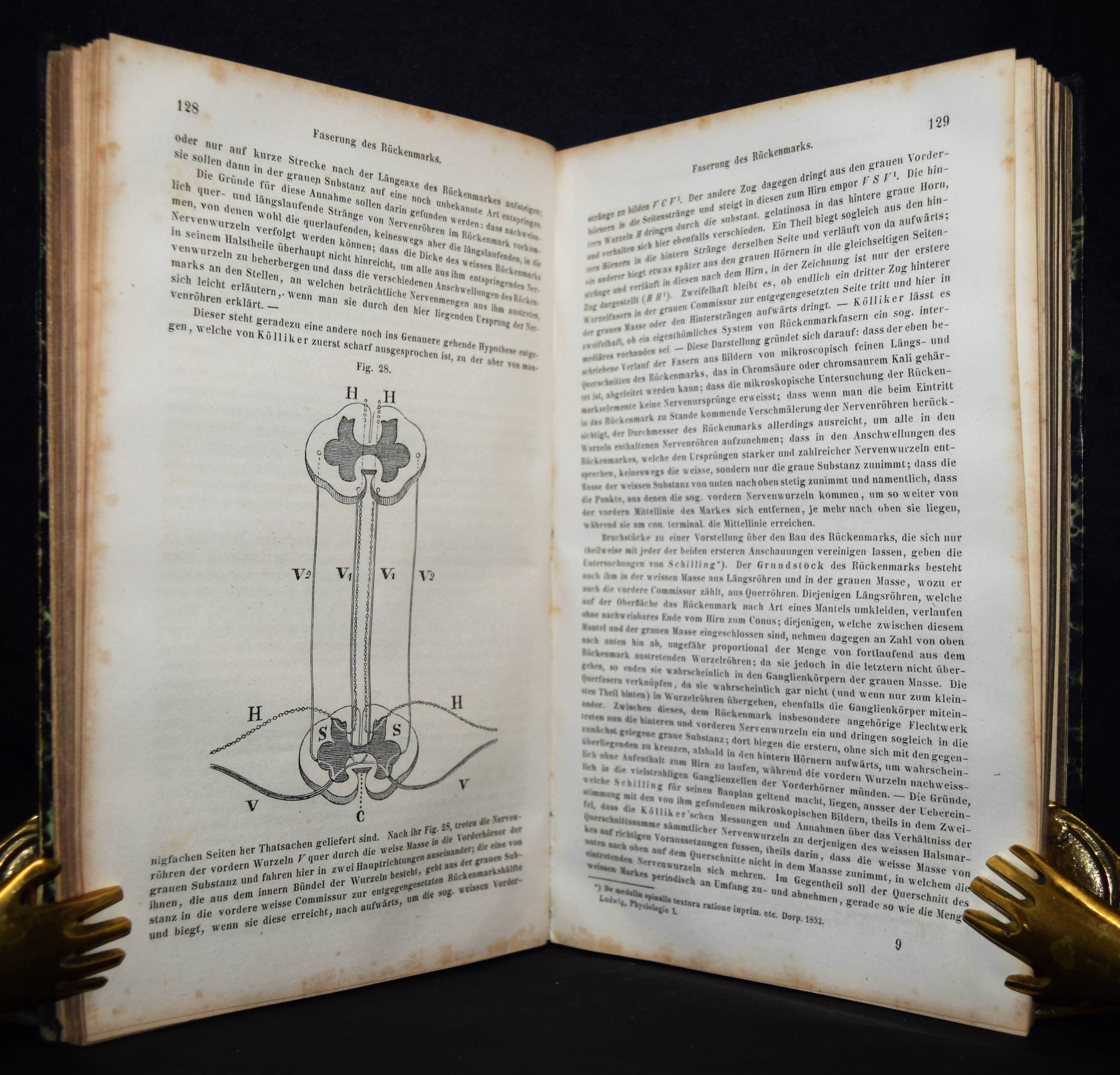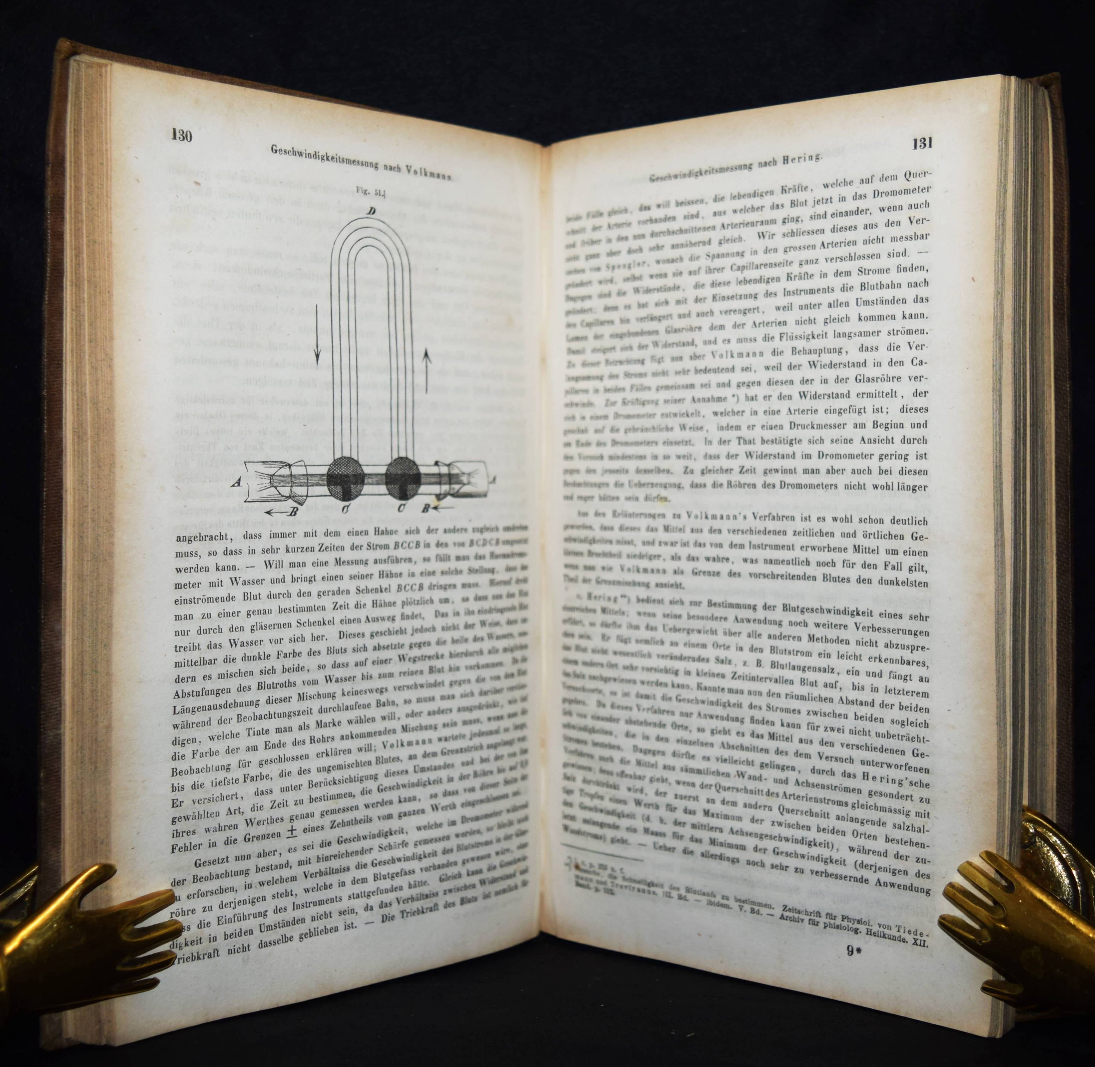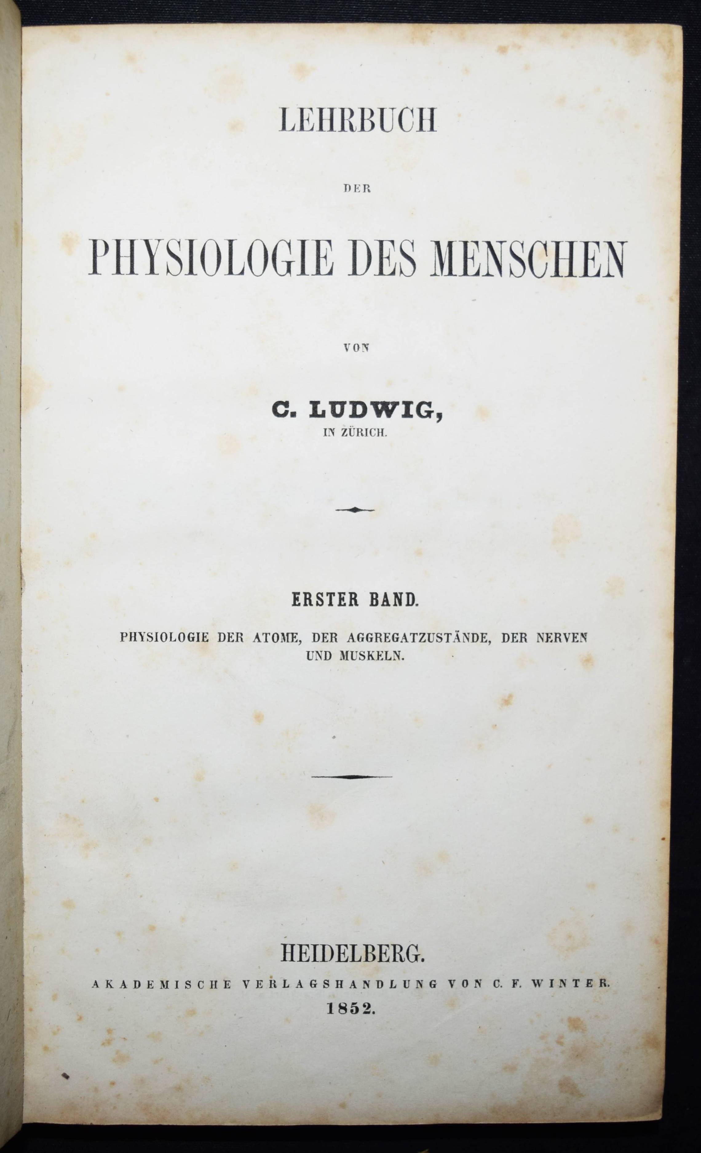 Ludwig, C(arl Friedrich). Lehrbuch der Physiologie des Menschen. 2 Bände. Heidelberg, C. F. Winter 1852-1856. 8°. [2] Bl., 458 S., [1] Bl.; X, 501 S. mit einigen Holzschnitten im Text. Hln. u. Ln. d. Zt. mit goldgepr. Rückentitel. Engelmann Suppl. 157. – Erste Ausgabe, selten. – Bis weit ins 20. Jahrhundert aufgelegtes wichtiges Lehrbuch des sächsischen Mediziners C. F. Wilhelm (1816-1895). – Abweichend gebunden, stellenweise braunfleckig und etwas gebräunt, gutes Exemplar aus der Bibliothek des Wissenschaftshistorikers Hannes Büttner mit dessen Exlibris.