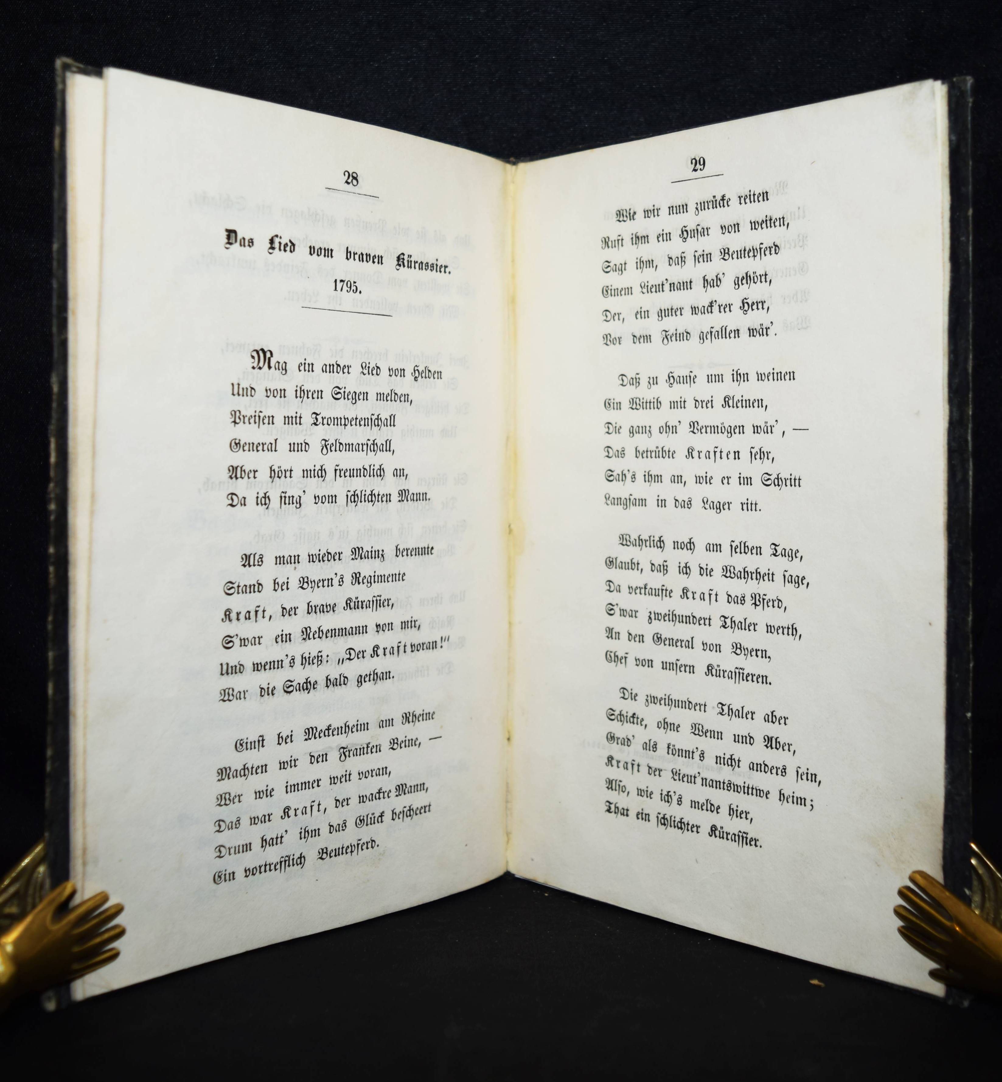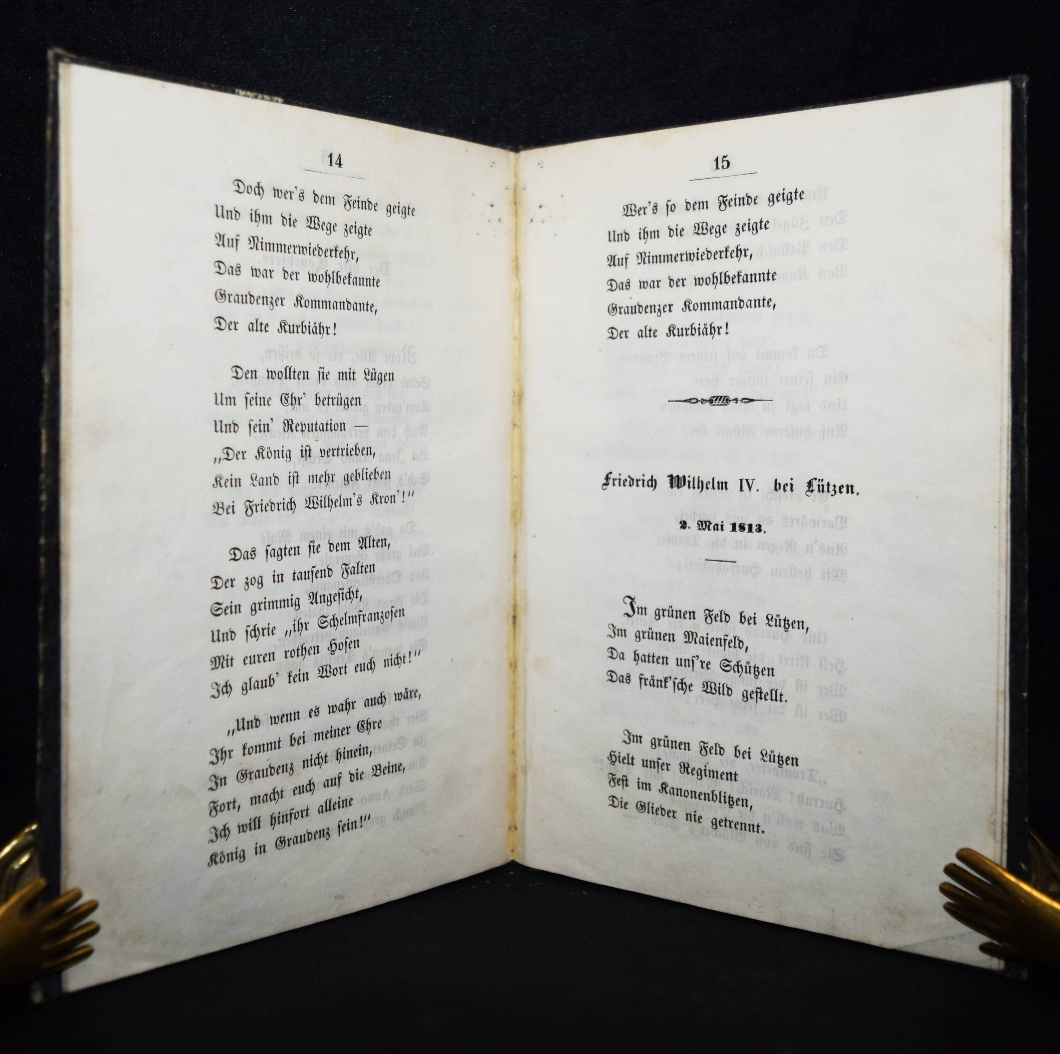 Hesekiel, (Johann) George (Ludwig). Preußenlieder. Magdeburg, Heinrichshofen’sche Buchhandlung 1846. 8°. 30 S. Marm. Pbd. d. Zt. Kosch VII, 1059. NDB VIII, 745. – Erste Ausgabe. – Bis 1849 erschienen zwei weitere Bände. – G. Hesekiel (1819-1874) „war ein fruchtbarer Schriftsteller, dessen Werk – künstlerisch nicht bedeutend – durch seine Verhaftung mit den Zeitströmungen interessiert. Er trat zuerst im Gefolge Fouqués mit nordischer Sagadichtung hervor und stellte sich dann mit konservativer politischer Dichtung den Dichtern des jungen Deutschlands, besonders Herwegh, entgegen. In seinen „Preußenliedern“ fand er den Übergang zur vaterländischen Ballade, für die später seine Mitgliedschaft im „Tunnel über der Spree“ und die Bekanntschaft mit Theodor Fontane neue Anregungen gaben, ohne daß er es zu selbständigen Leistungen brachte“ (O. Neuendorff in NDB). – Einband berieben, etwas finger- u. braunfleckig, sonst gut erhalten.