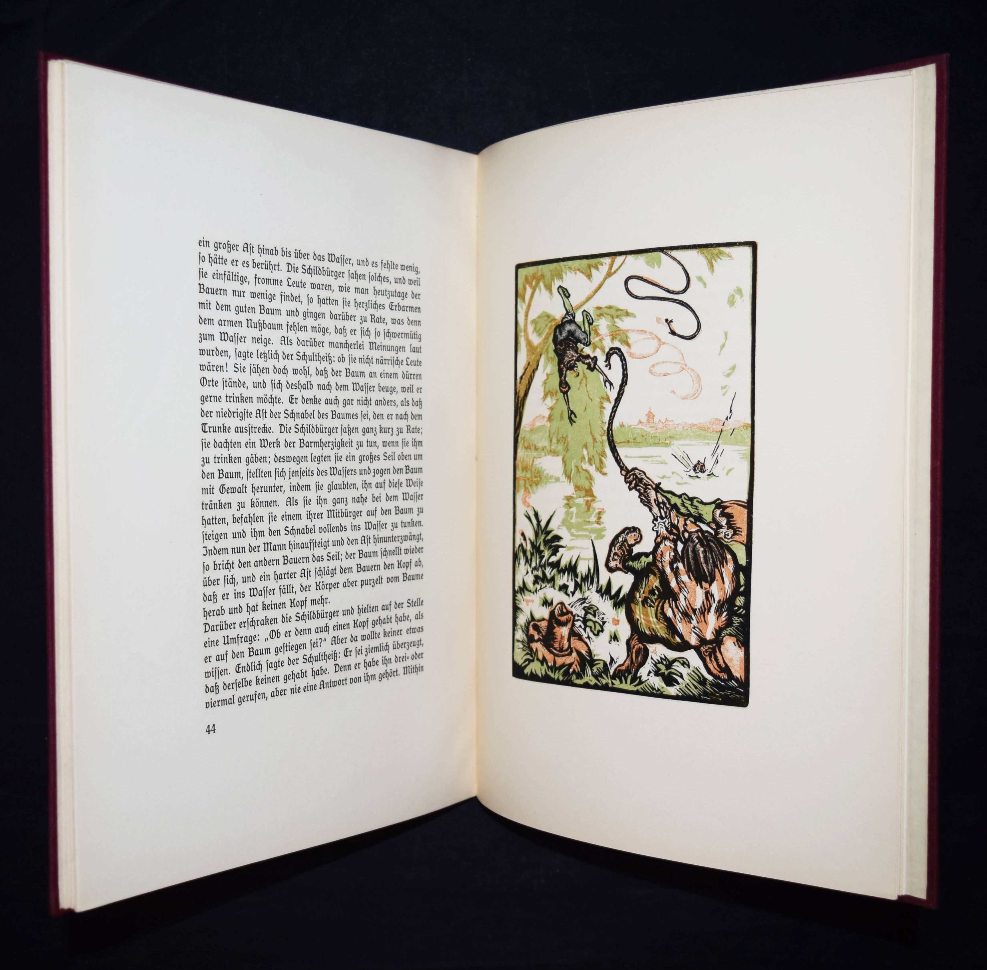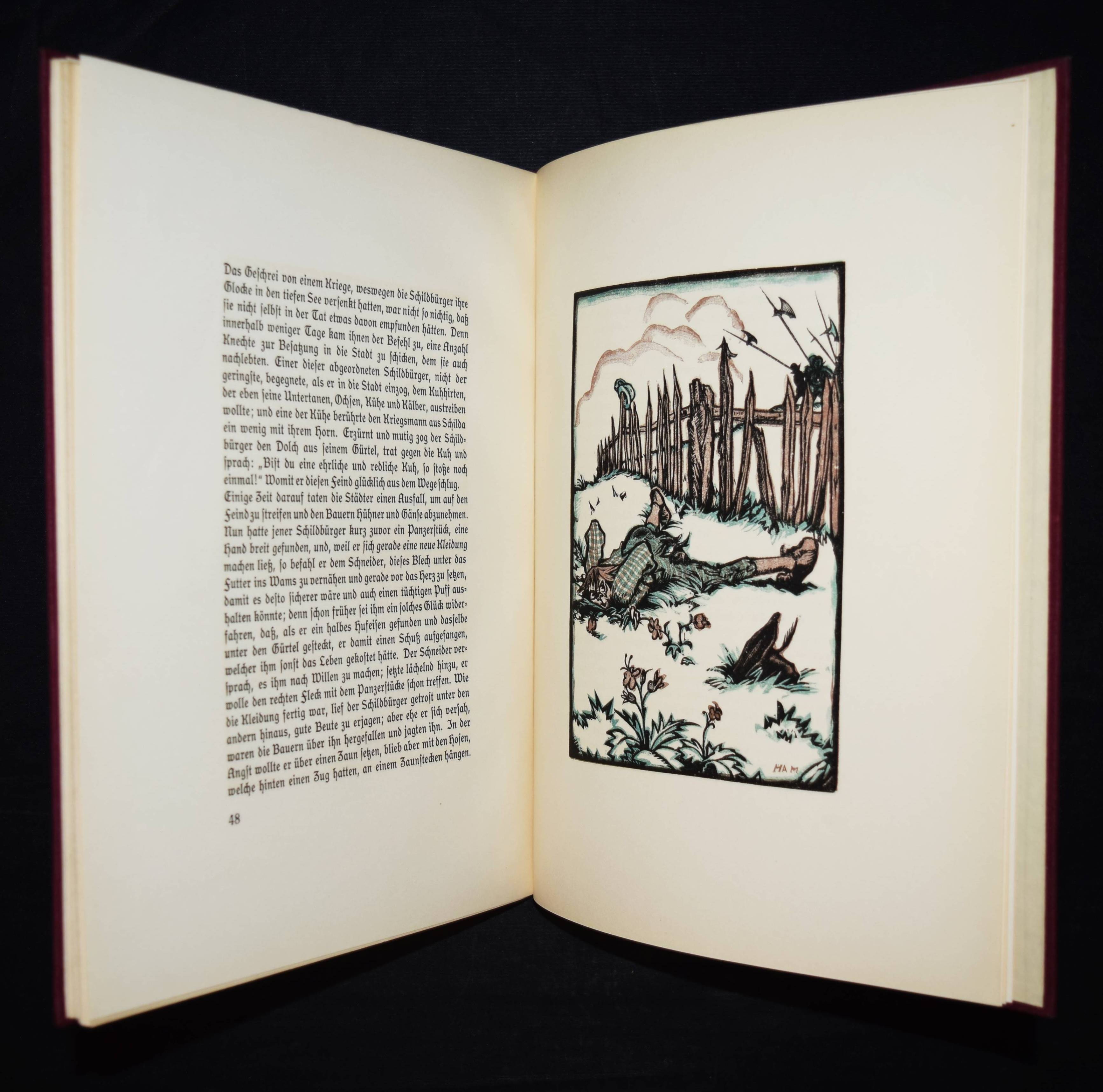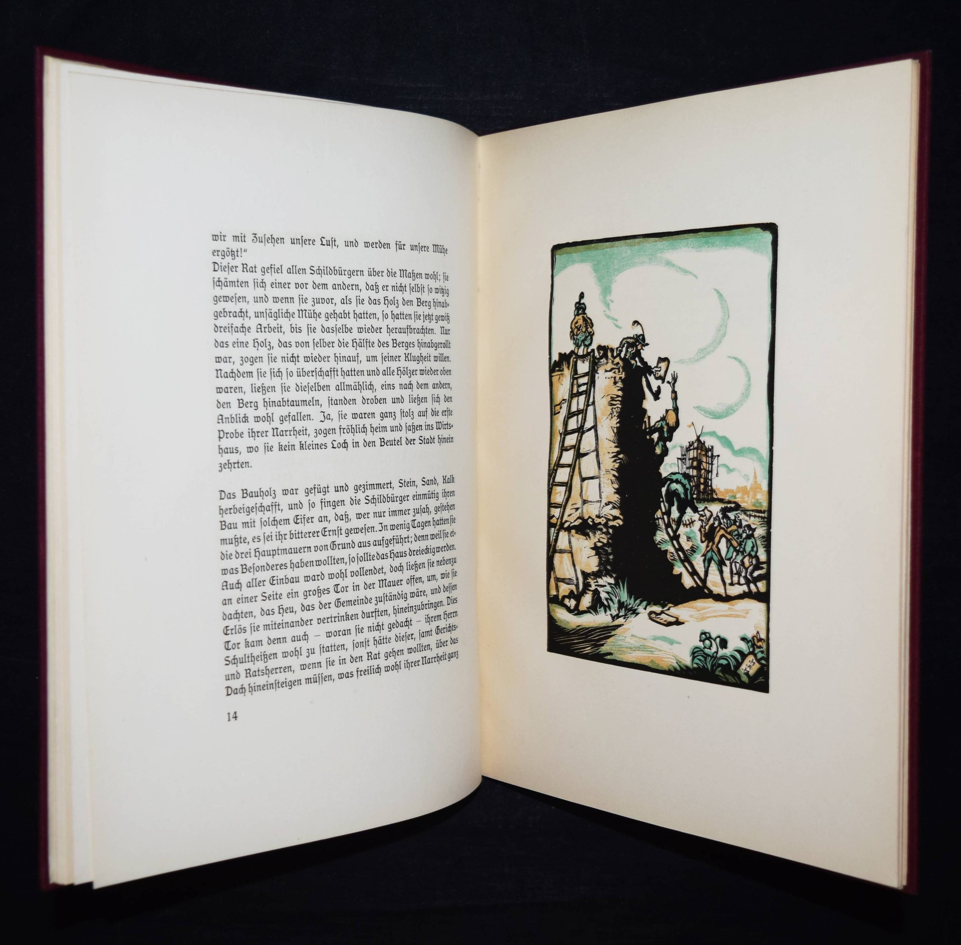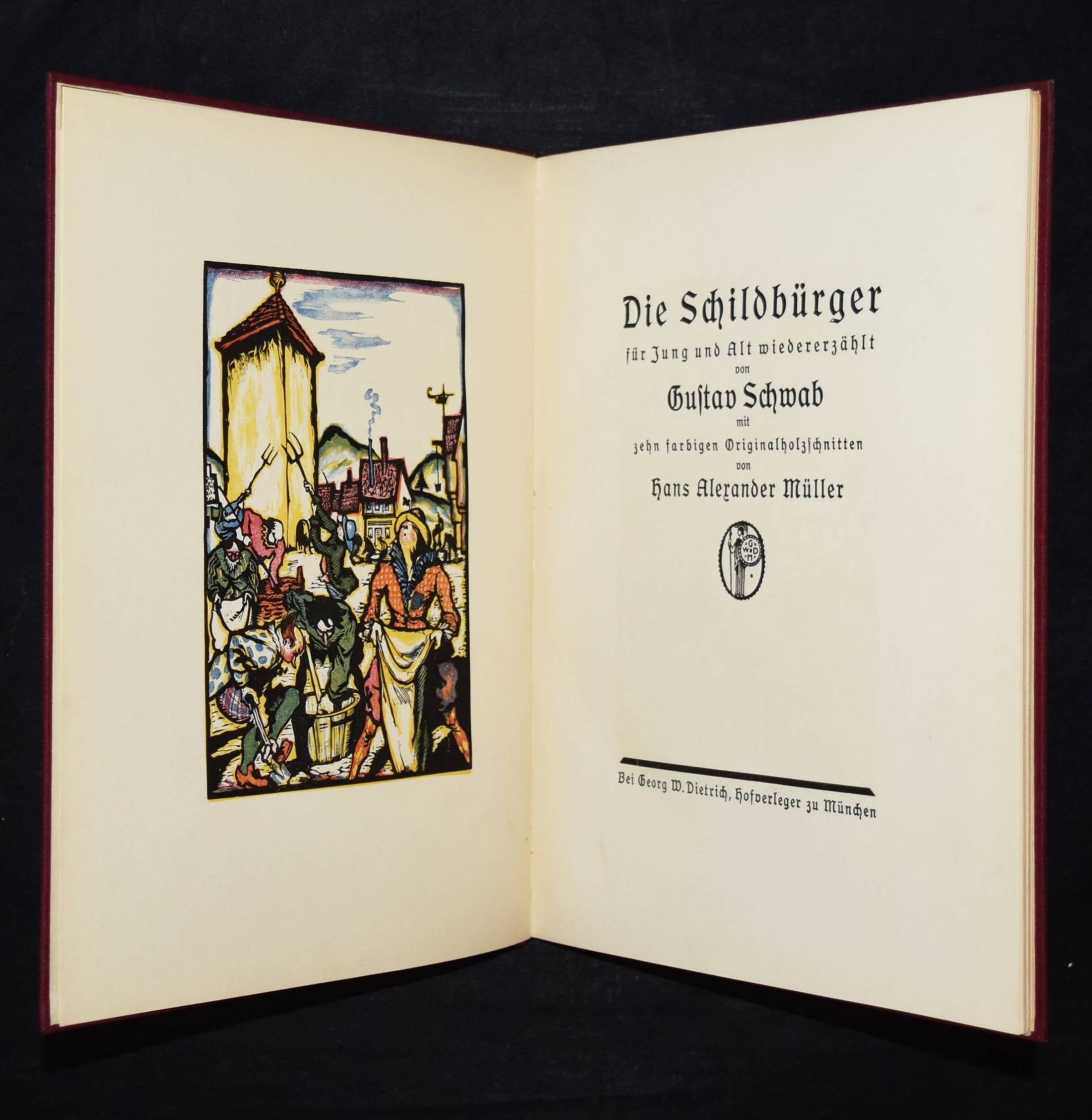 Schwab, Gustav. Die Schildbürger. Für Jung und Alt wiedererzählt. Mit zehn farbigen Originalholzschnitten von Hans Alexander Müller. München, Geog W. Dietrich (1922). 4°. 50, (2) S. mit 10 Orig.-Farbholzschnitten. OLn. mit goldgepr. Rücken- u. Deckeltitel. (Kleinodien der Weltliteratur, Band 22). Eichhorn/Salter 1.21. Sennewald 22, 4. – Erste Ausgabe mit diesen Illustrationen. – In kleiner Auflage in „Moderner Schwabacher“ von der Roßberg’schen Druckerei zu Leipzig gesetzt. Die farbigen Holzschnitte druckten die Graphischen Kunstanstalten F. Bruckmann AG in München. – Sehr gutes sauberes Exemplar.