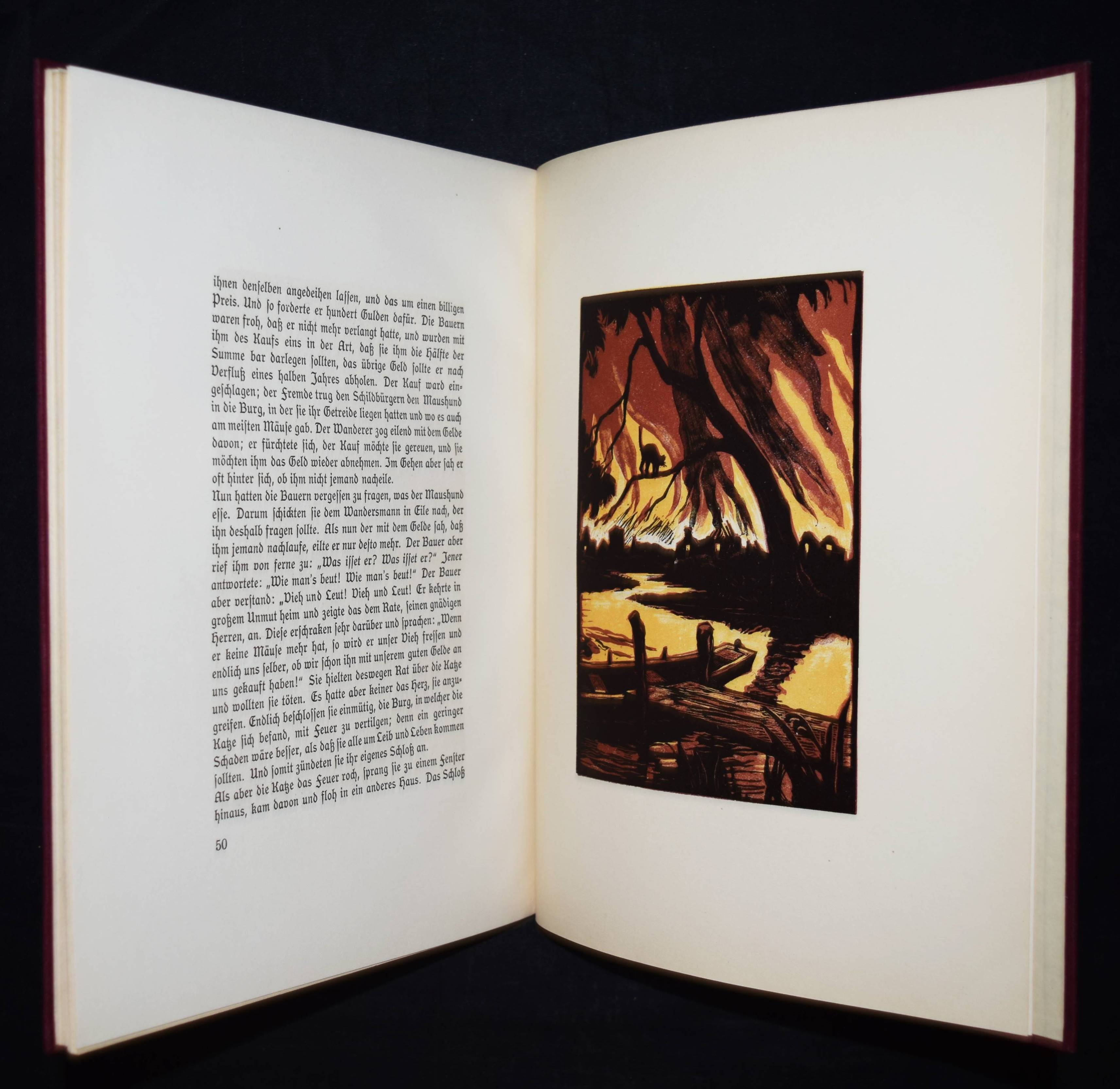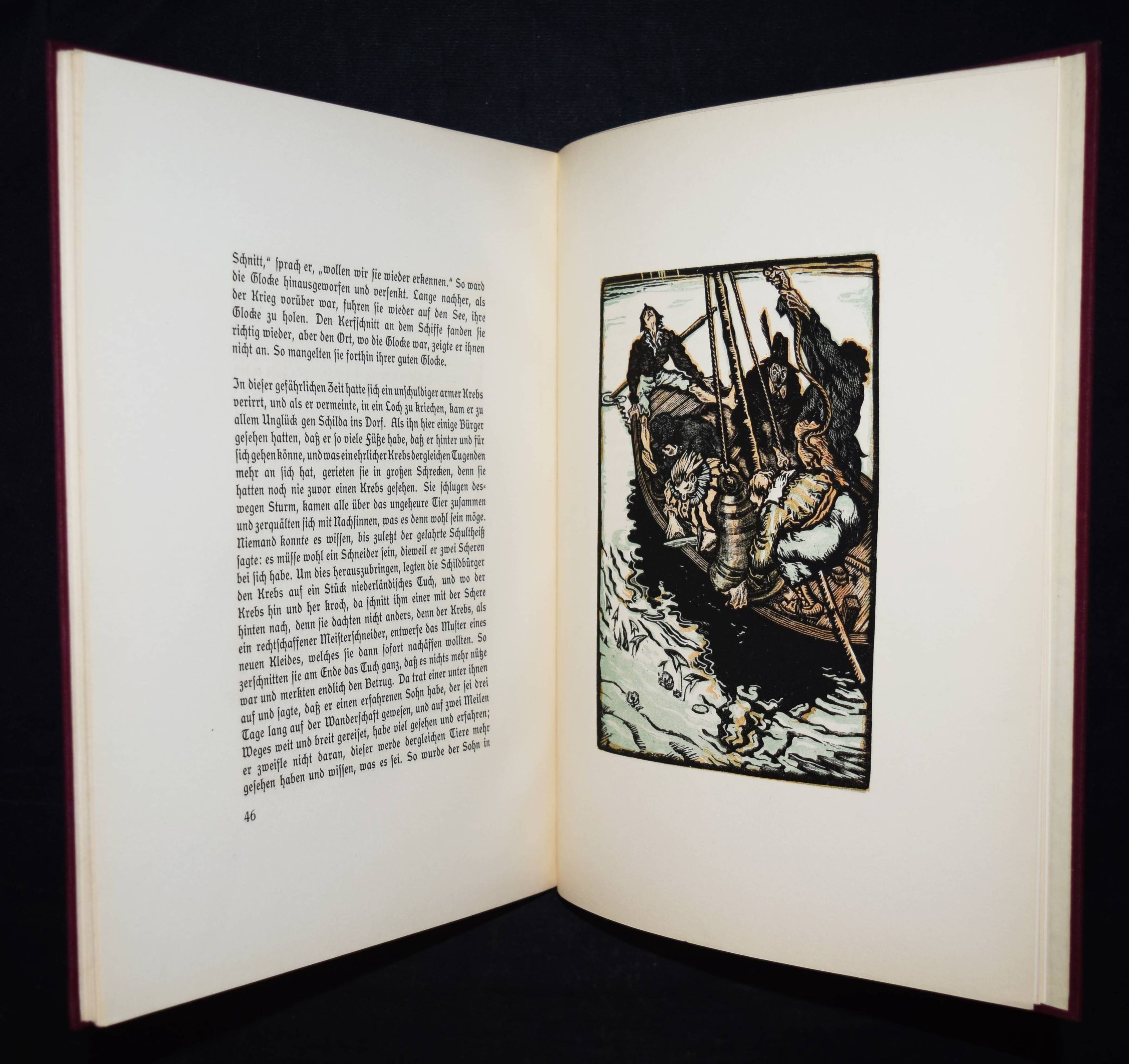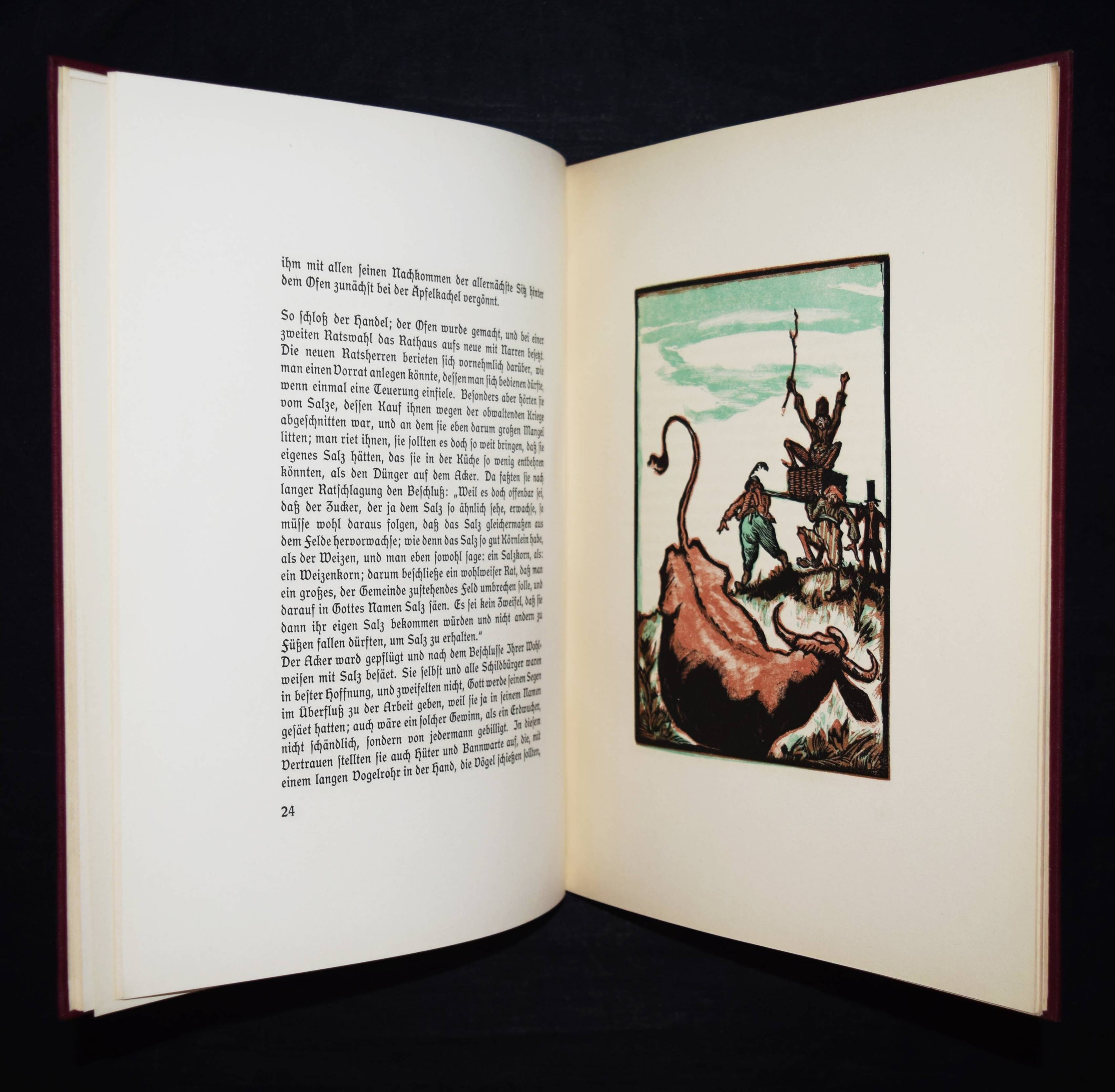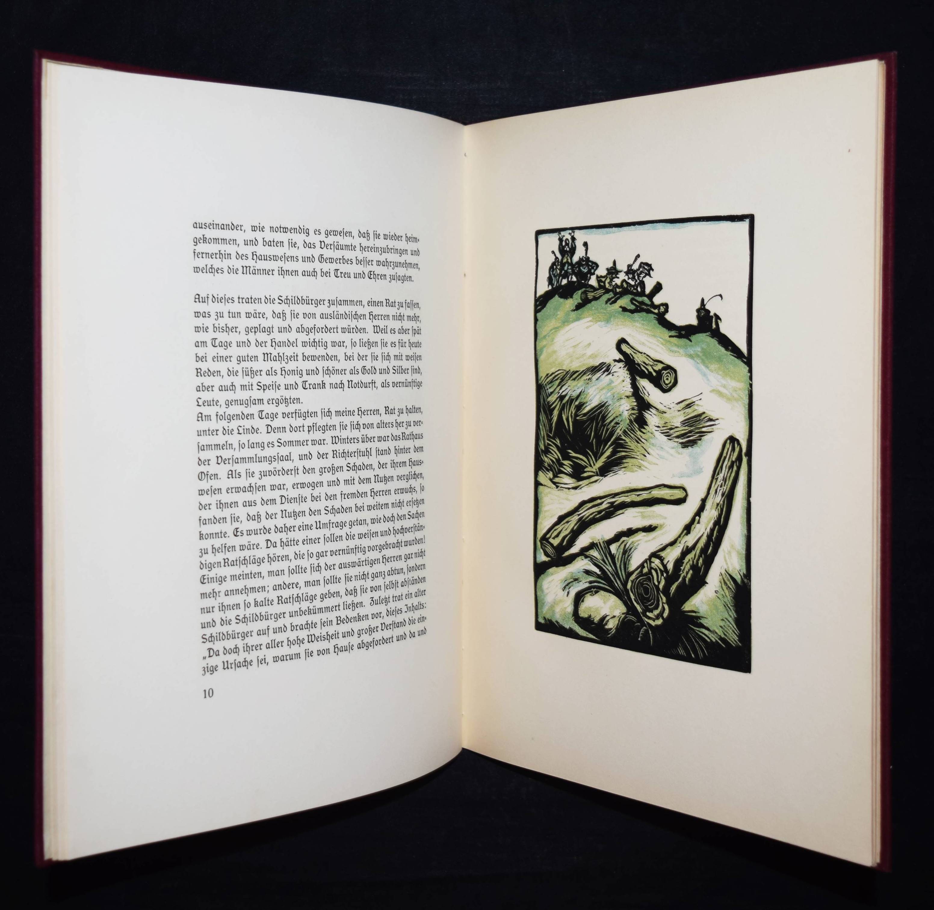 Schwab, Gustav. Die Schildbürger. Für Jung und Alt wiedererzählt. Mit zehn farbigen Originalholzschnitten von Hans Alexander Müller. München, Geog W. Dietrich (1922). 4°. 50, (2) S. mit 10 Orig.-Farbholzschnitten. OLn. mit goldgepr. Rücken- u. Deckeltitel. (Kleinodien der Weltliteratur, Band 22). Eichhorn/Salter 1.21. Sennewald 22, 4. – Erste Ausgabe mit diesen Illustrationen. – In kleiner Auflage in „Moderner Schwabacher“ von der Roßberg’schen Druckerei zu Leipzig gesetzt. Die farbigen Holzschnitte druckten die Graphischen Kunstanstalten F. Bruckmann AG in München. – Sehr gutes sauberes Exemplar.