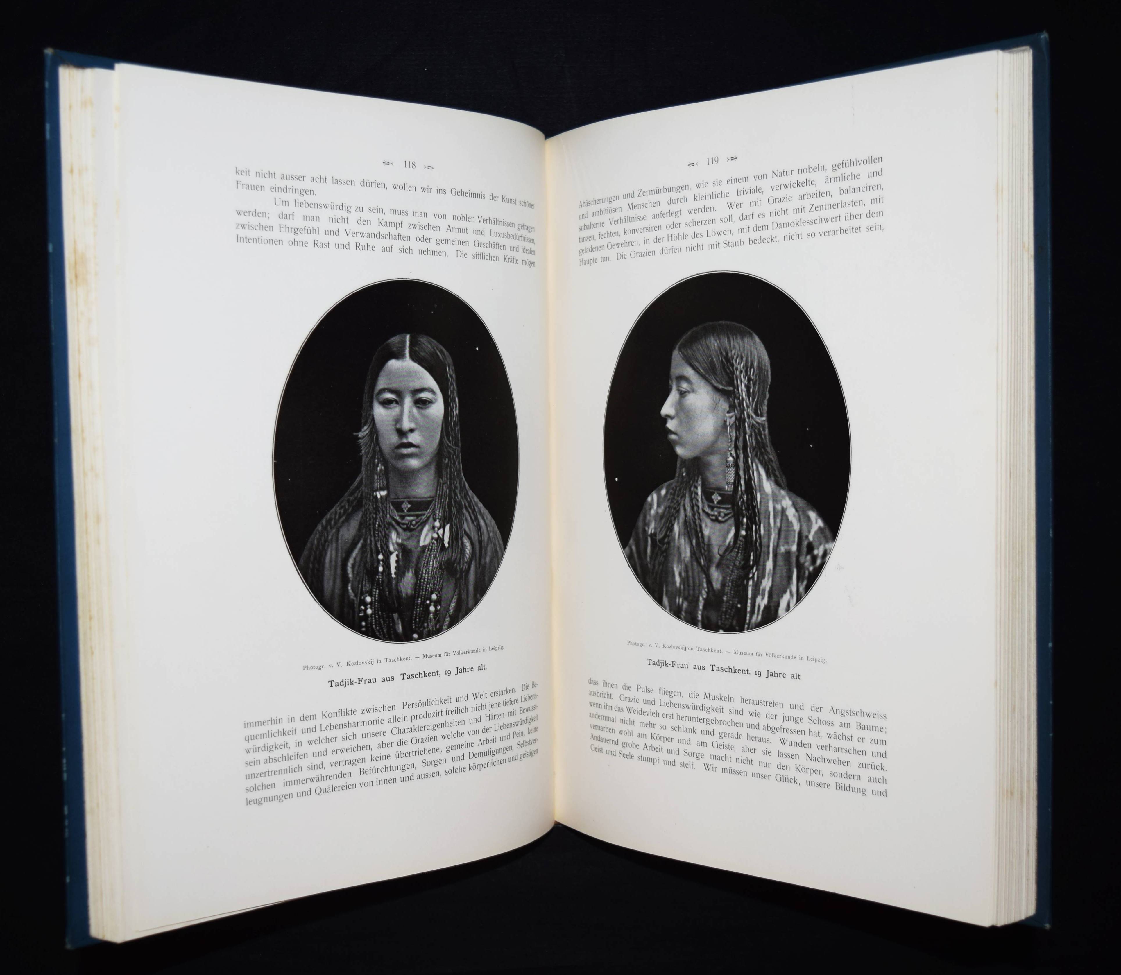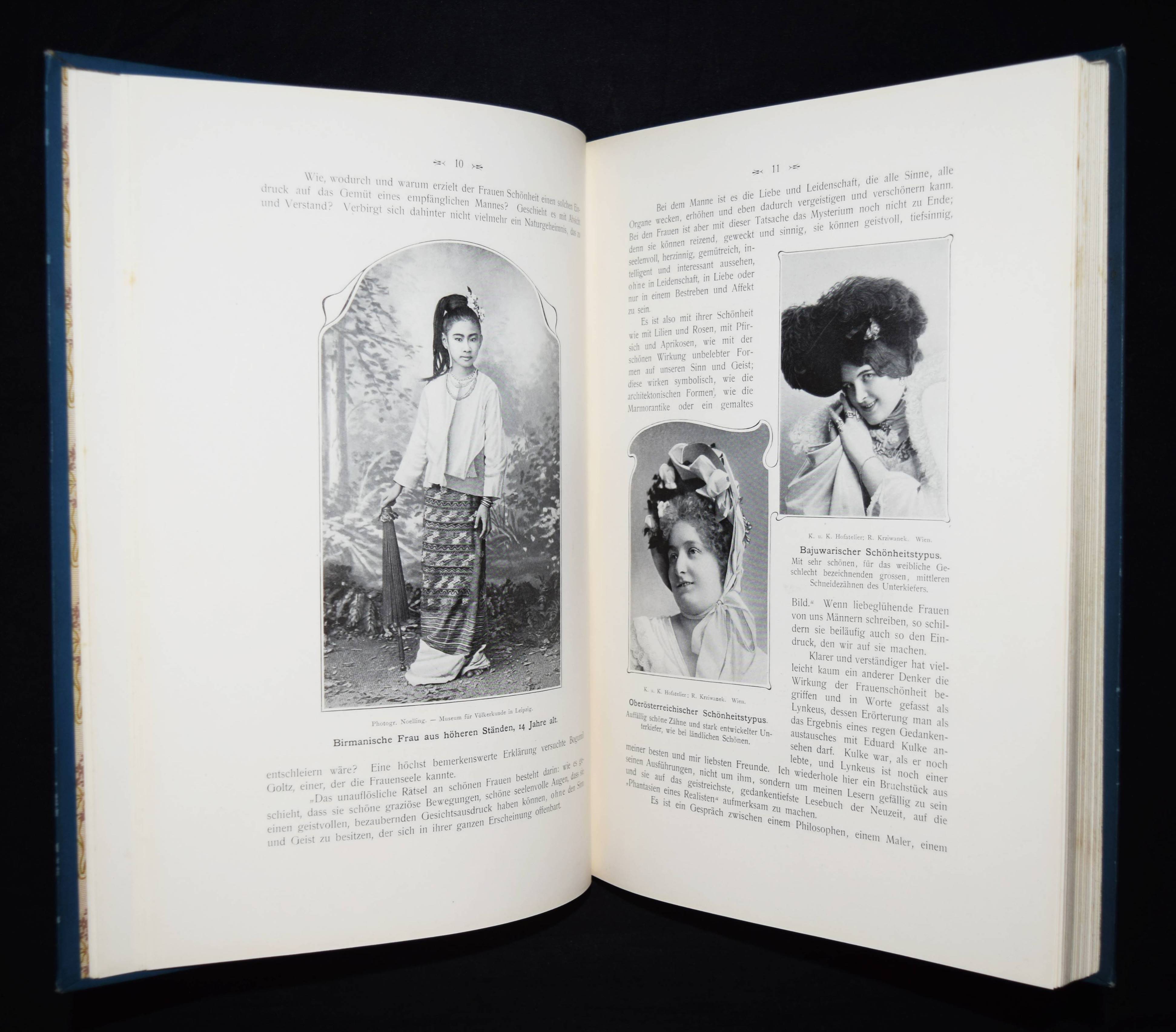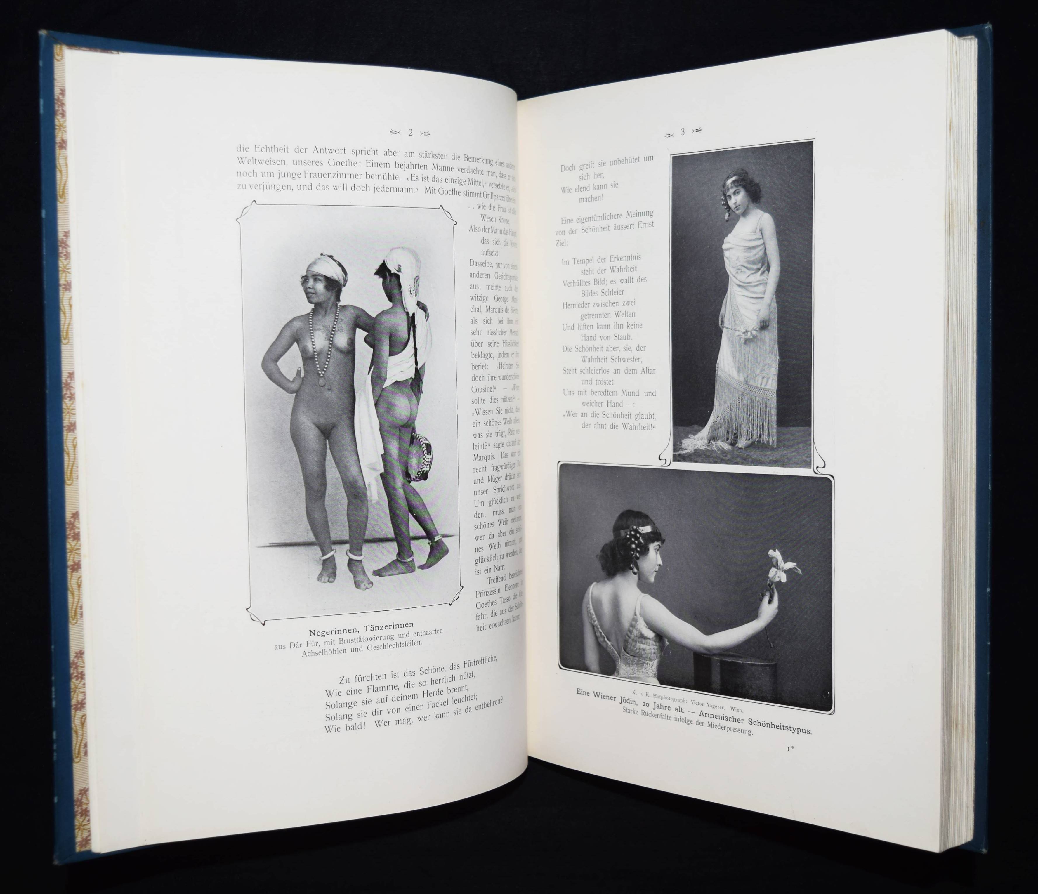 Krauss, Friedrich S(alomo). Streifzüge im Reiche der Frauenschönheit. Mit gegen dreihundert Abbildungen nach Originalphotographien. 4. Tsd. Leipzig, A. Schumann 1903. 4°. XVI, [1] Bl., 304 S. mit ca. 300 Abb. Farbig illustr. OLn. Heidtmann 11104. – Erschien zuerst 1902 in Lieferungen. – „Das Weib ist dem Manne das Interessanteste und sollte ihn vielleicht ganz allein interessieren.“ (S. XI). – Die meisten Aufnahmen stammen aus dem Museum für Völkerkunde in Leipzig. – Sehr gutes Exemplar im dekorativen Jugendstileinband.