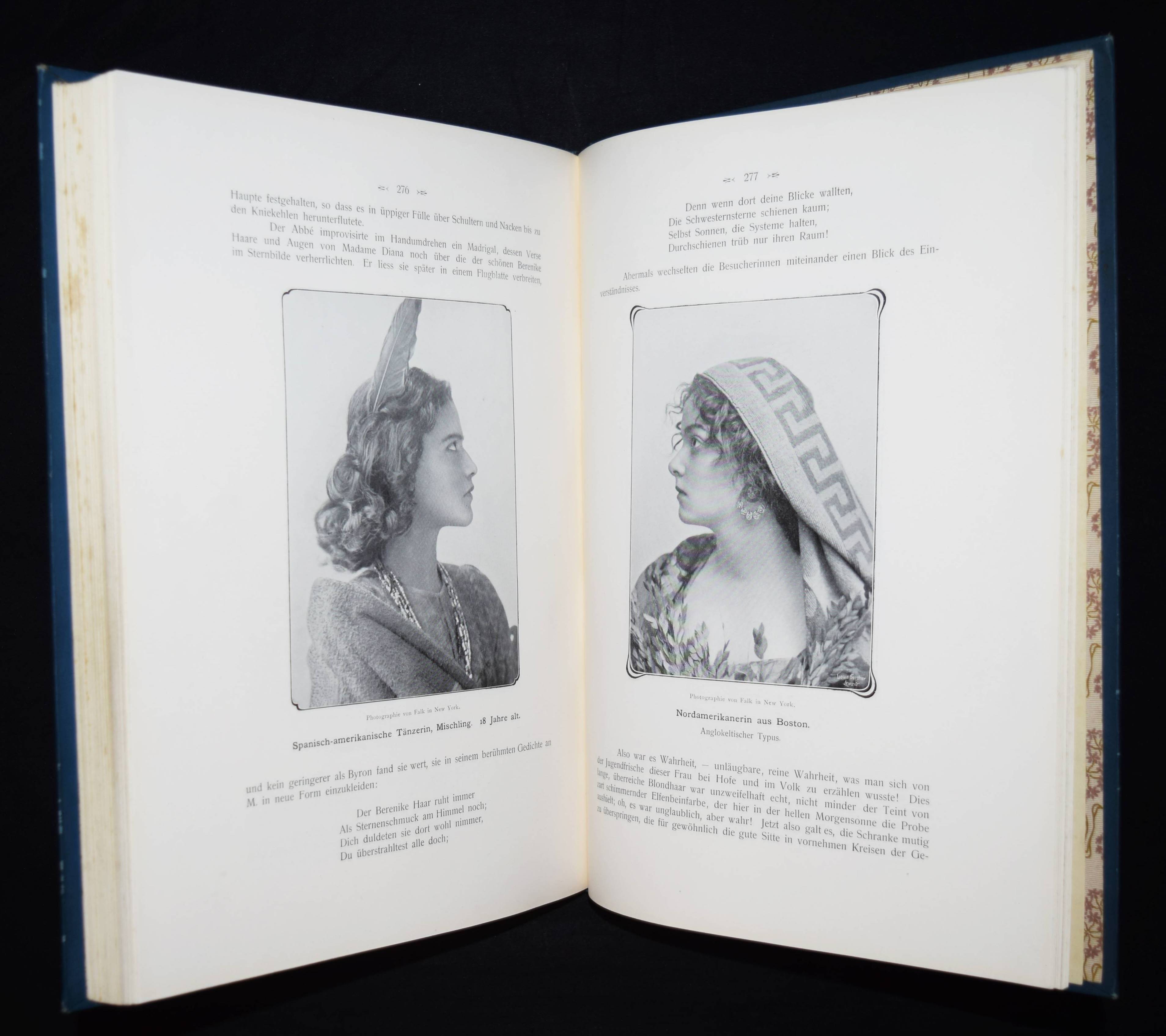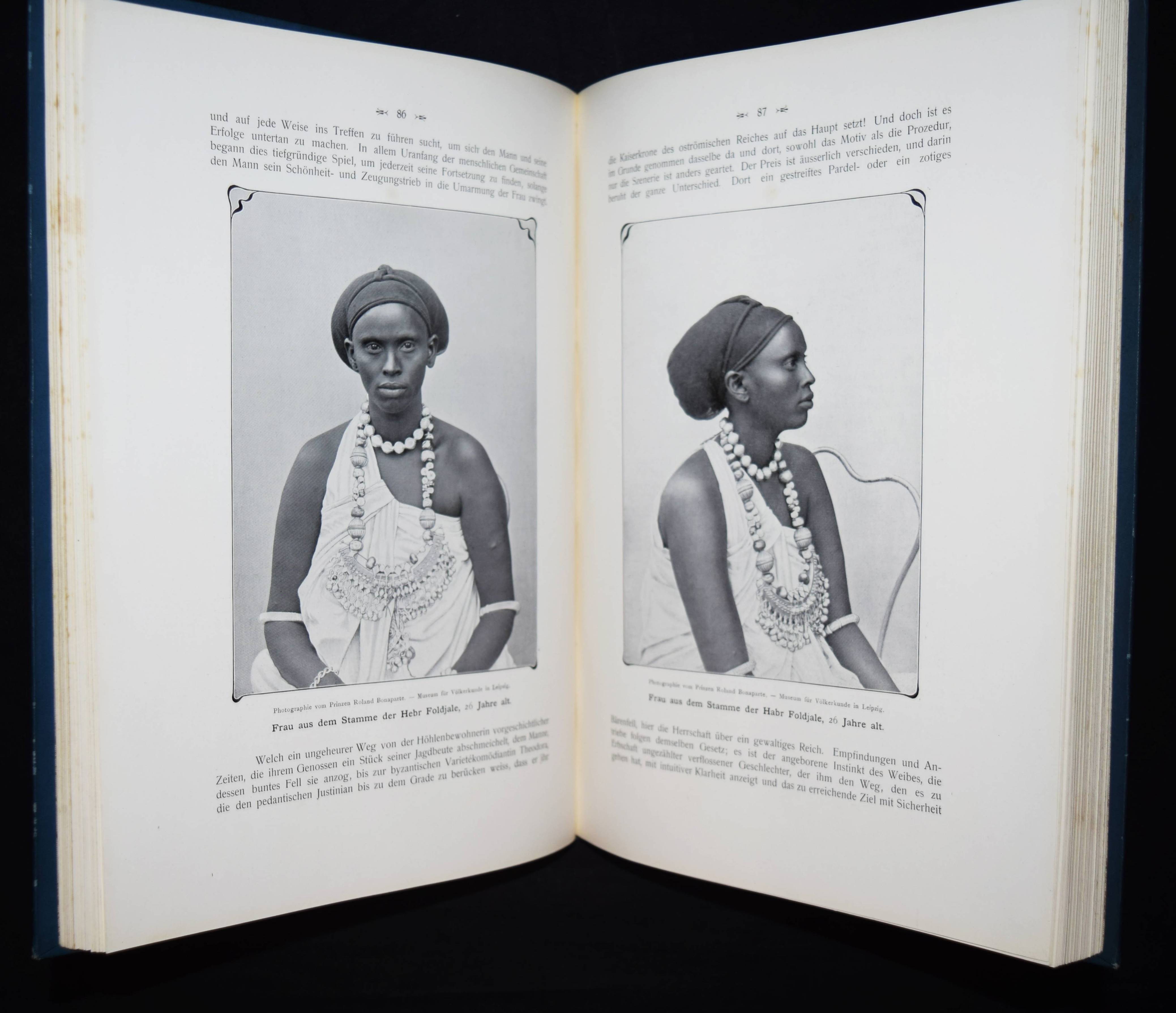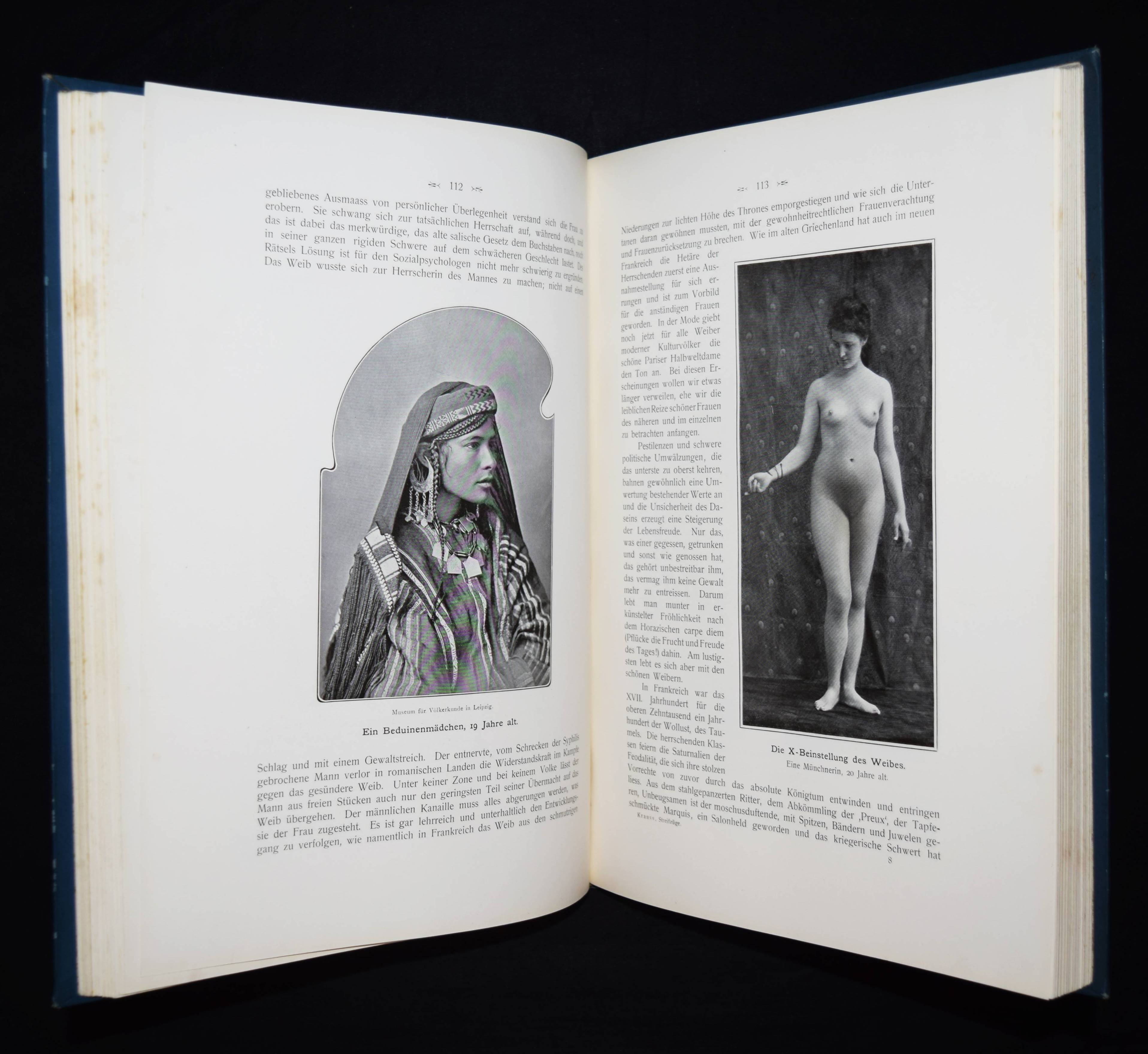 Krauss, Friedrich S(alomo). Streifzüge im Reiche der Frauenschönheit. Mit gegen dreihundert Abbildungen nach Originalphotographien. 4. Tsd. Leipzig, A. Schumann 1903. 4°. XVI, [1] Bl., 304 S. mit ca. 300 Abb. Farbig illustr. OLn. Heidtmann 11104. – Erschien zuerst 1902 in Lieferungen. – „Das Weib ist dem Manne das Interessanteste und sollte ihn vielleicht ganz allein interessieren.“ (S. XI). – Die meisten Aufnahmen stammen aus dem Museum für Völkerkunde in Leipzig. – Sehr gutes Exemplar im dekorativen Jugendstileinband.