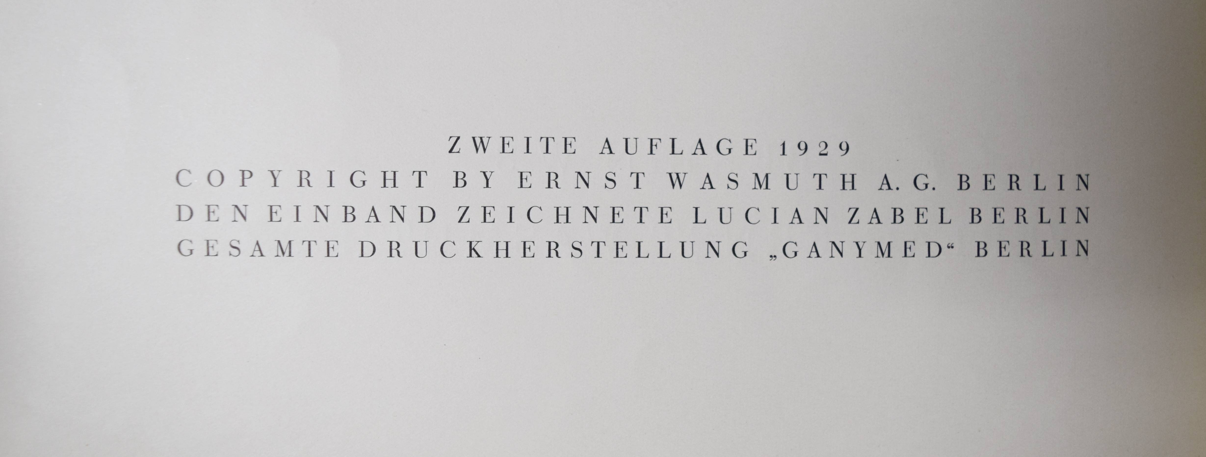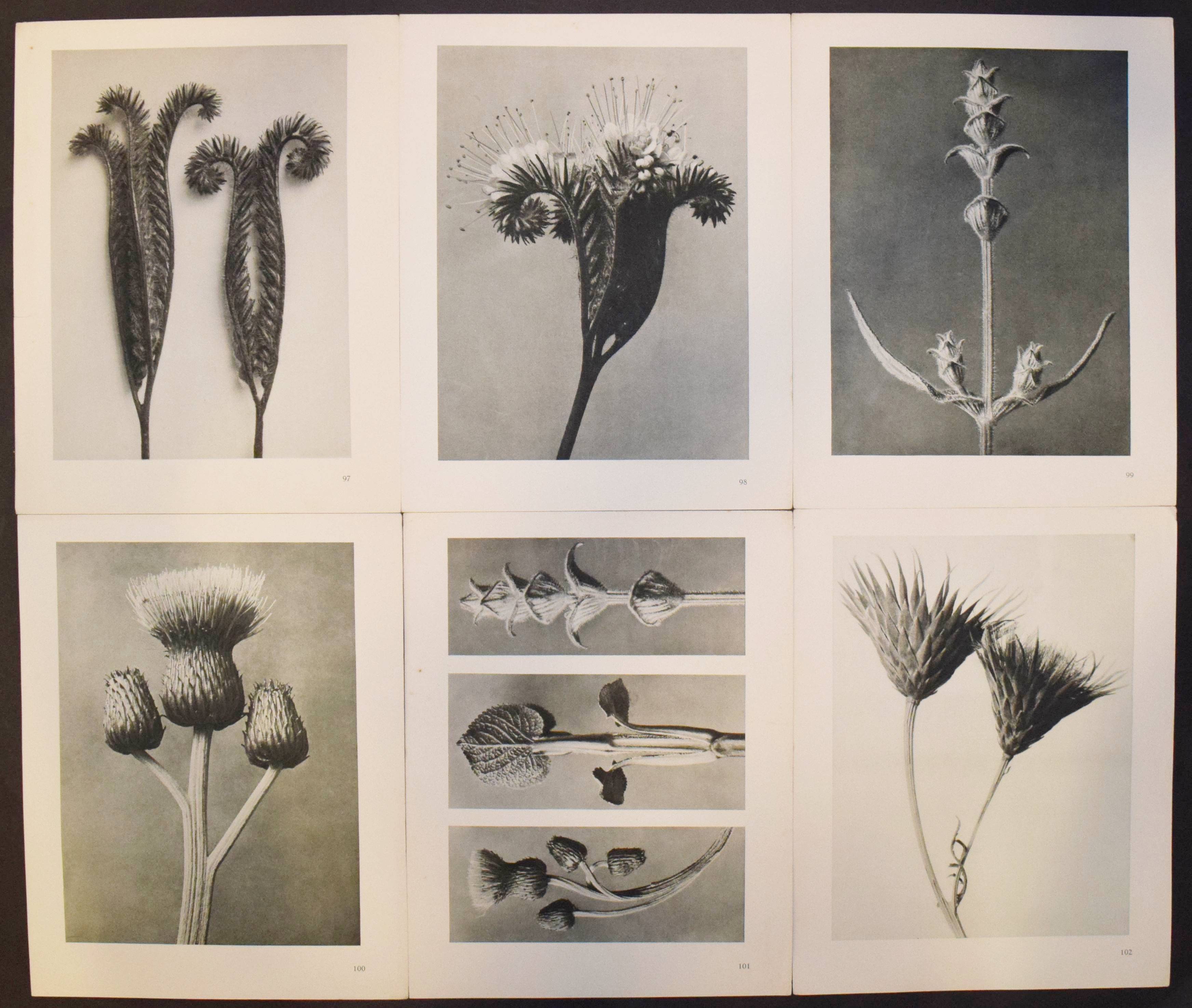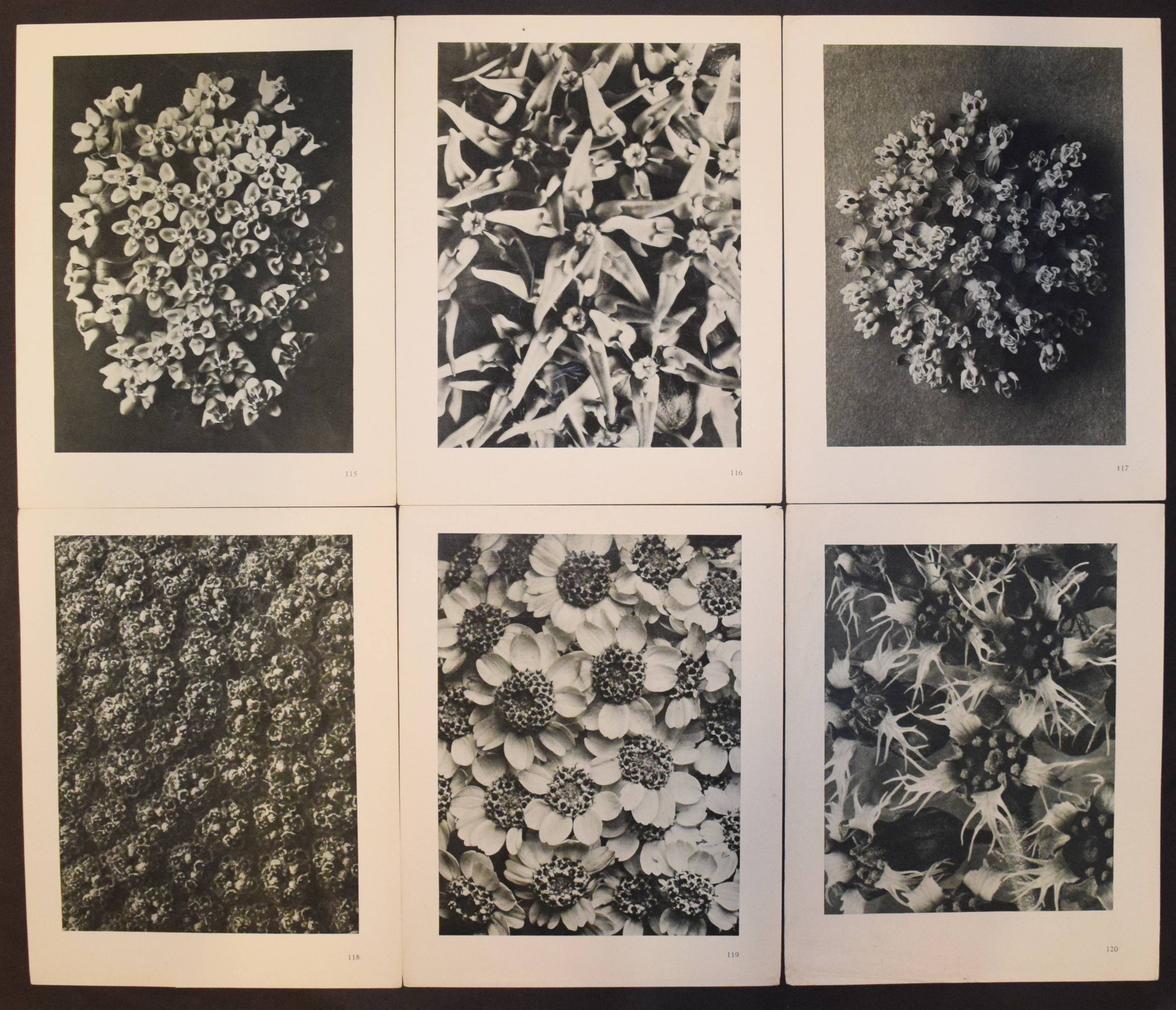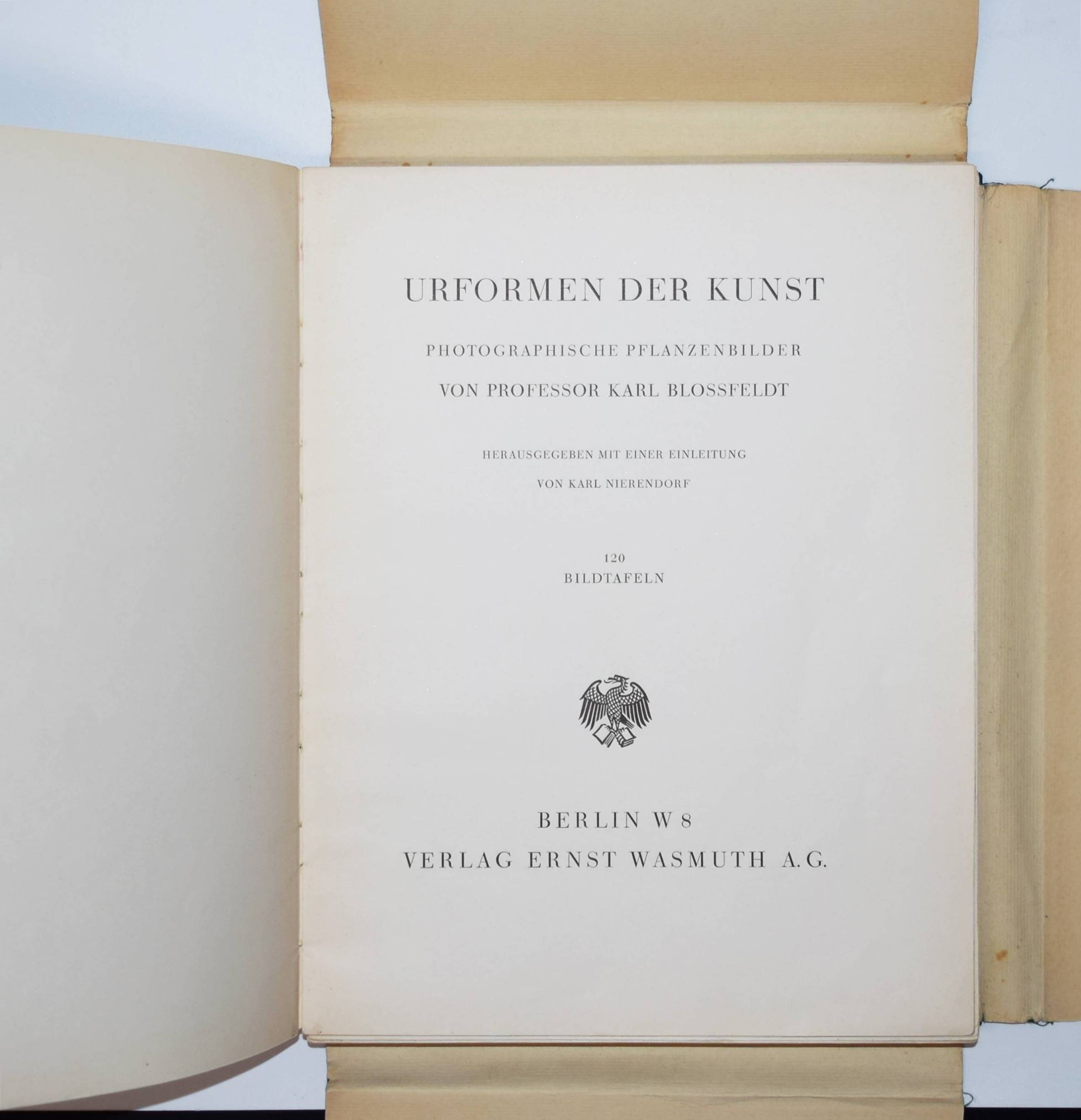 Blossfeldt, Karl. Urformen der Kunst. Photographische Pflanzenbilder. Hrsg. mit einer Einleitung von Karl Nierendorf. 2. Aufl. Berlin, Wasmuth (1929). 4°. Portfolio, XVII, (3) S. u. 120 num. Bildtafeln in Kupfertiefdruck. Orig.-Leinen-Flügelmappe mit goldgepr. Rücken- und Deckeltitel und Deckelvignette (Entwurf: Lucian Zabel). Auer 133. Heidtmann 14471 u. 7293. Heiting/Jaeger I, 188 ff. (mit mehreren Abb.). Parr/Badger I, 96. The Open Book S. 66 f. Roth, The Book of 101 Books 48 f. – Seltene Portfolio-Ausgabe. – „Die deutsche Erstausgabe von ‚Urformen der Kunst‘ erschien sowohl gebunden wie auch als Mappe, in welche die Drucke als Einzelblätter eingelegt sind… In seiner äußerst pathetisch formulierten Einleitung unterstellt Nierendorf zunächst eine enge Verbindung von Kunst und Natur über die Jahrhunderte hinweg, um dann schließlich Blossfeldt zu attestieren, dass noch niemand zuvor diese Beziehung „mit gleich packender Unmittelbarkeit“ dargestellt habe und dies ganz „ohne Effekte, lediglich durch vielfache Vergrößerung“ sichtbar gemacht durch „sachliche Mittel der photographischen Technik“… Die Einleitung spricht daher möglichst viele Zielgruppen an: „Kunstexperten und Naturfreunde, Esoteriker neuer Weltanschauungen und schließlich auch noch Fotofreunde.“ Bei der Betrachtung der nun folgenden 120 Tafeln lässt sich Nierendorfs Euphorie, was die Wirkung der Fotografie anbelangt, jedoch uneingeschränkt nachvollziehen. Dies ist nicht zuletzt der exzellenten Bildwiedergabe mittels perfekter Anwendung des Kupfertiefdruckverfahrens geschuldet. Die Pflanzen wirken so plastisch, dass man sie anfassen möchte… Walter Benjamin… lobt… in der „Literarischen Welt“ (1928) vor allem das ‚Können‘ Blossfeldts, das sich unabhängig vom ‚Wissen‘, also der dahinterstehenden Intention, in seinen Fotografien manifestiert. Dass diese Bilder „im Pflanzendasein einen ganzen unvermuteten Schatz von Analogien und Formen“ auftun, ist laut Benjamin nur der Fotografie zu verdanken, welche durch ihre technischen Möglichkeiten, wie der starken Vergrößerung, die Erschaffung dieser neuen Bilderwelten erst ermöglicht“ (B. Hammers in Heiting/Jaeger). – Rücken etwas berieben, sehr gutes vollständiges und sauberes Exemplar.
