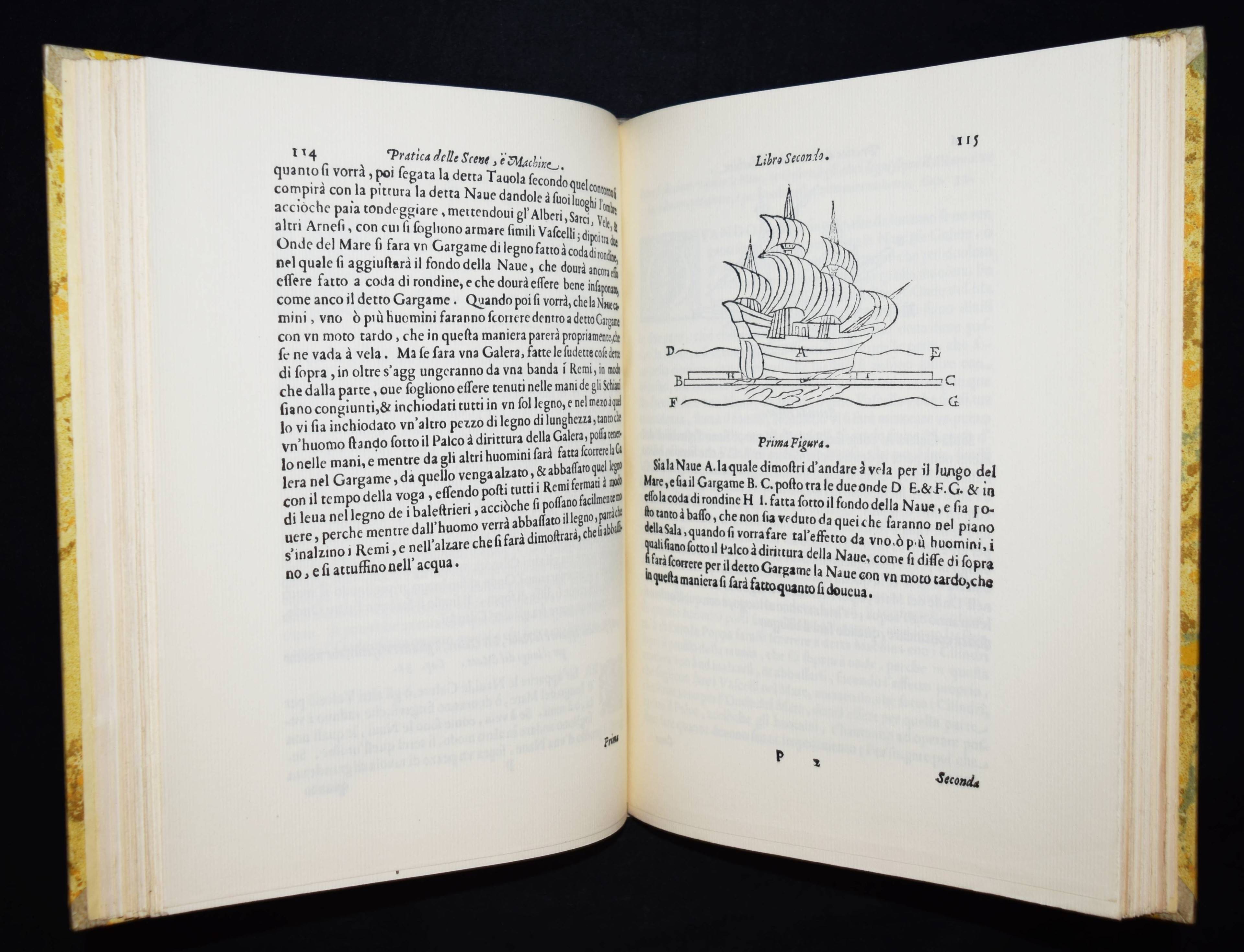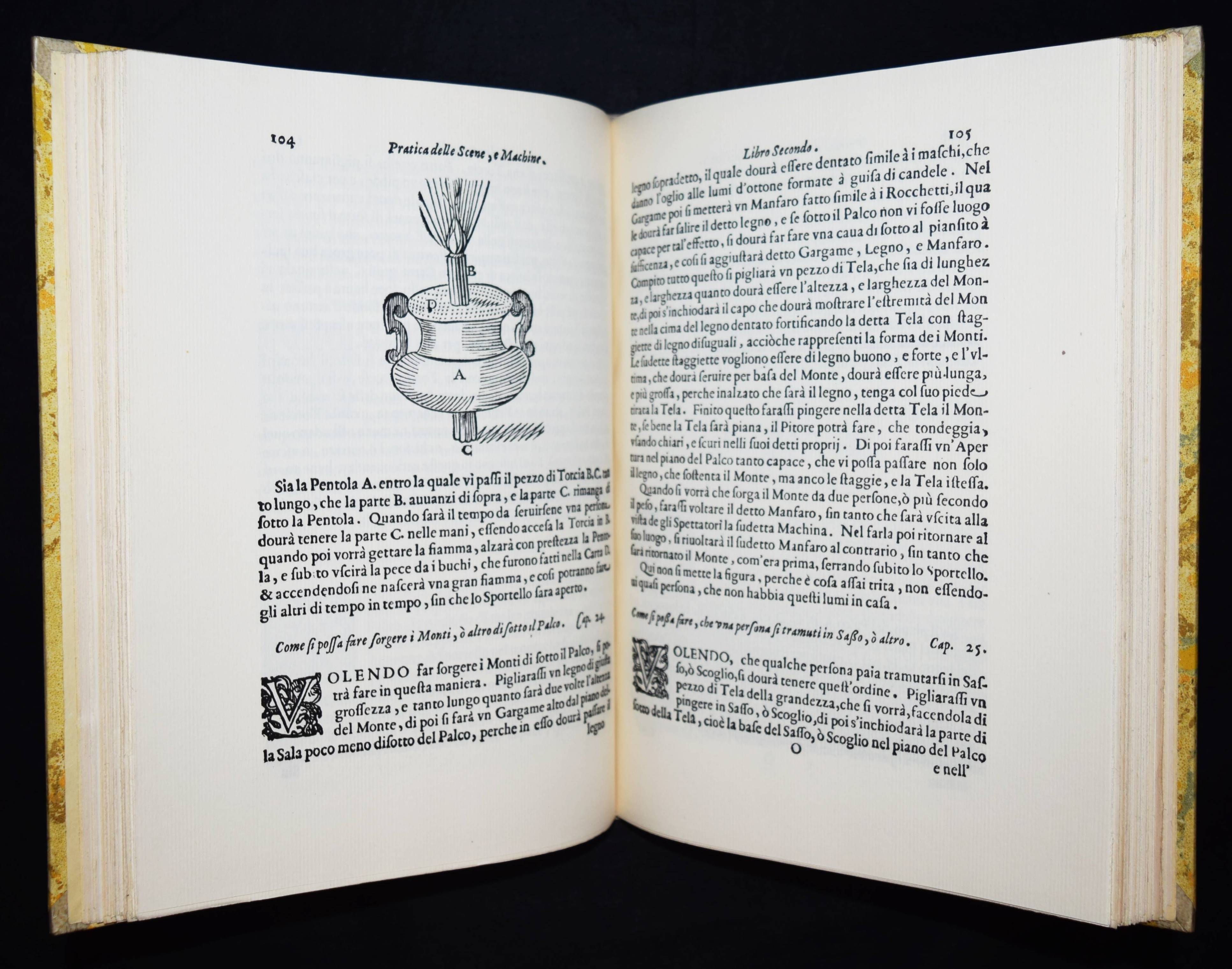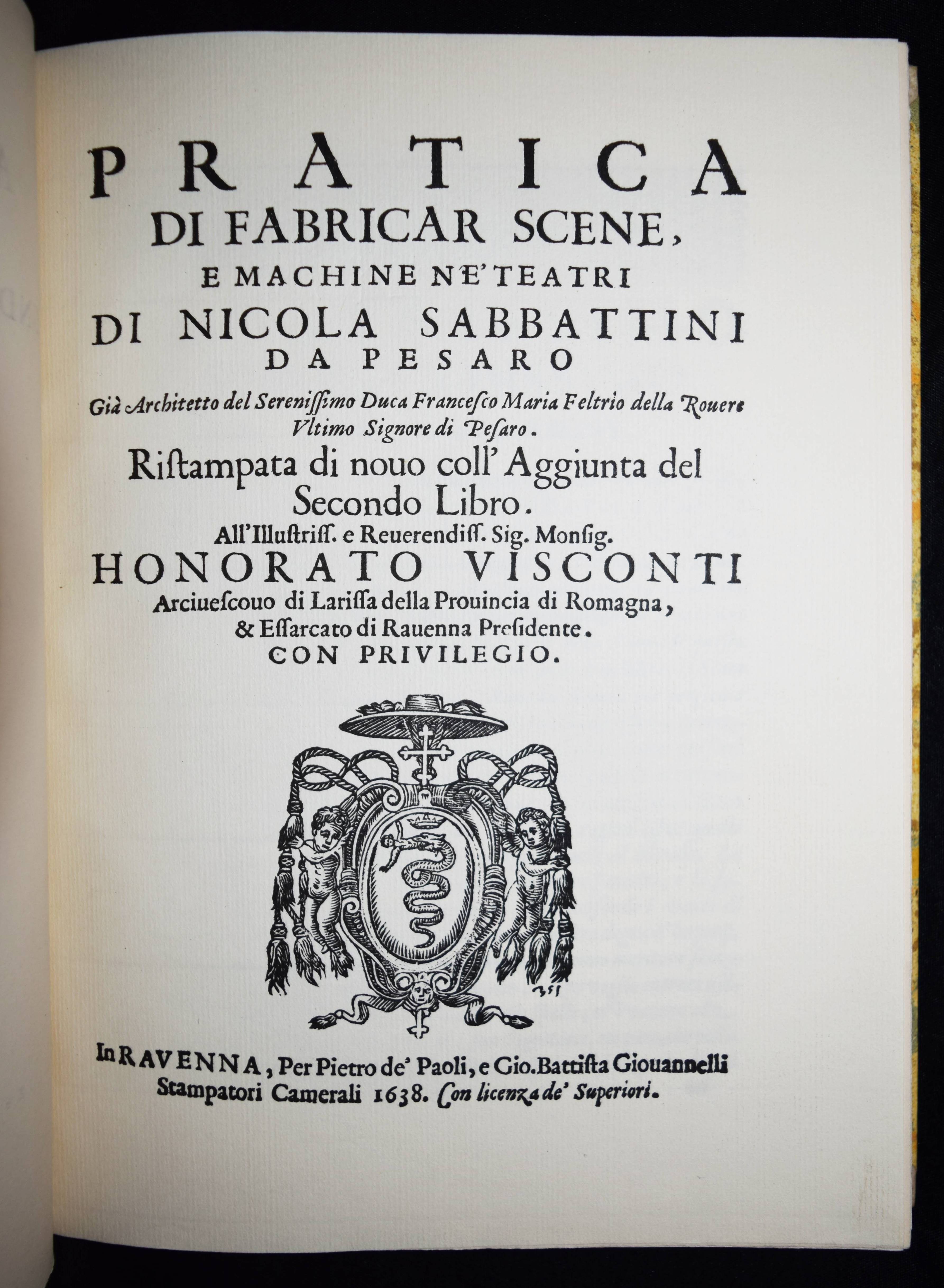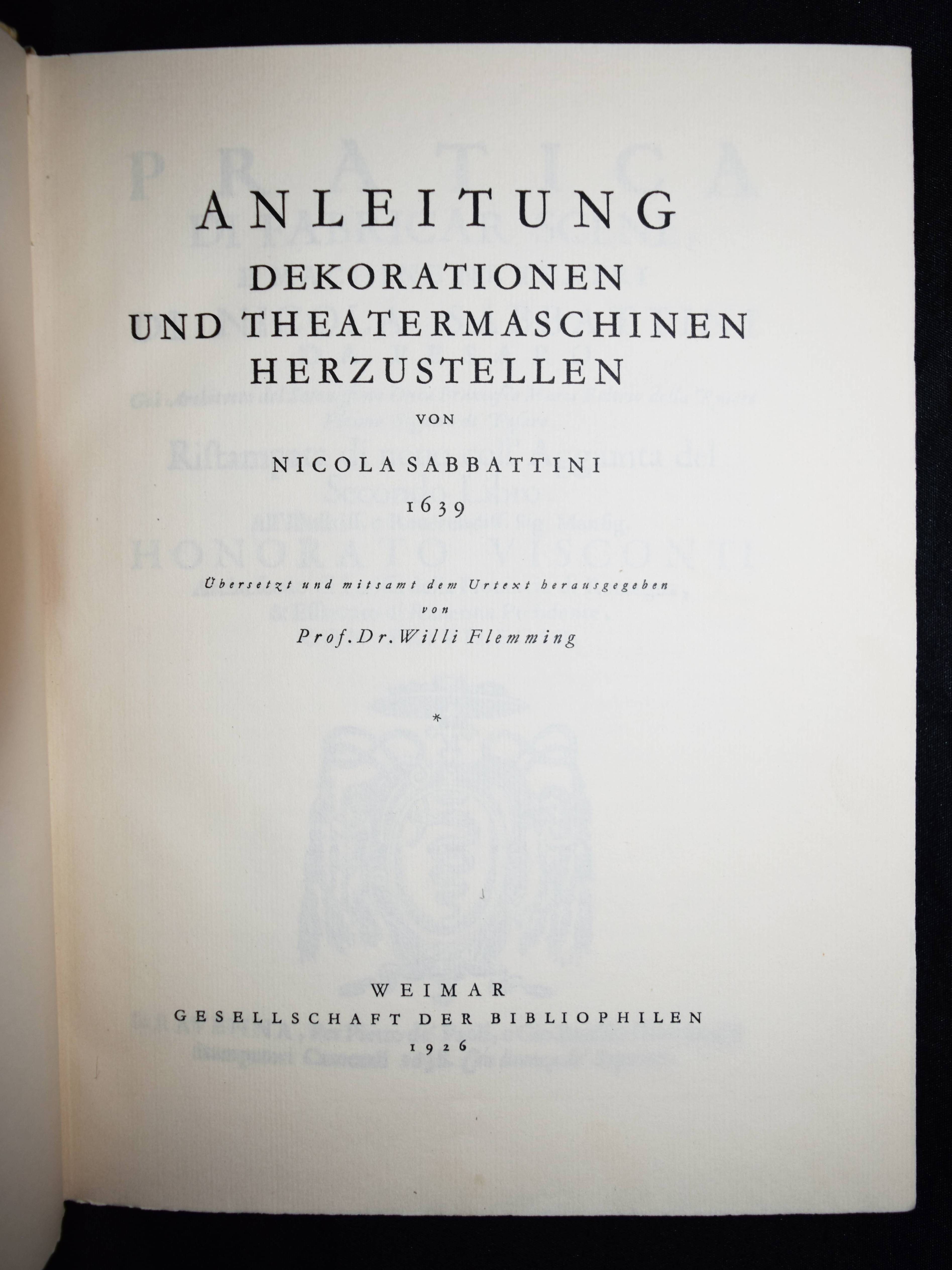 Sabbattini, Nicola. Pratica di fabricar scene, e machine ne’teatri. Anleitung: Dekorationen und Theatermaschinen herzustellen. (Faksimile-Druck der ersten Ausgabe, Ravenna 1638 u.) 1639. Übersetzt und mitsamt dem Urtext herausgegeben von Willi Flemming. Weimar, Gesellschaft der Bibliophilen 1926. 4°. [2] Bl., 291, (1) S. mit einigen Abb. im Text. OHprgt. mit goldgepr. Rückentitel. (Veröffentlichung der Gesellschaft der Bibliophilen, Band 38). Schöne Neuausgabe der wichtigen Abhandlung zur Theatergeschichte des Barock. – Sehr gutes Exemplar der schönen Halbpergamentausgabe.