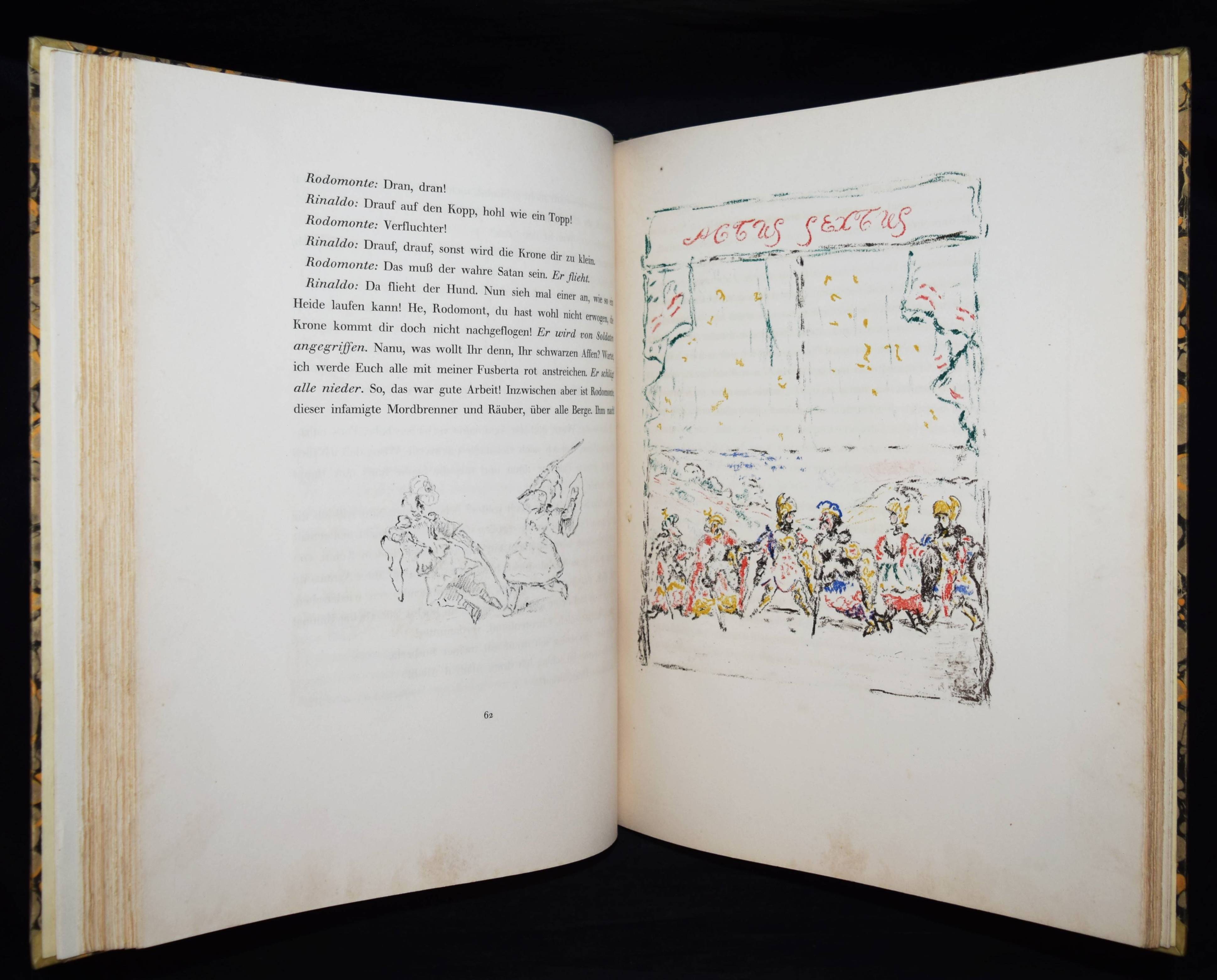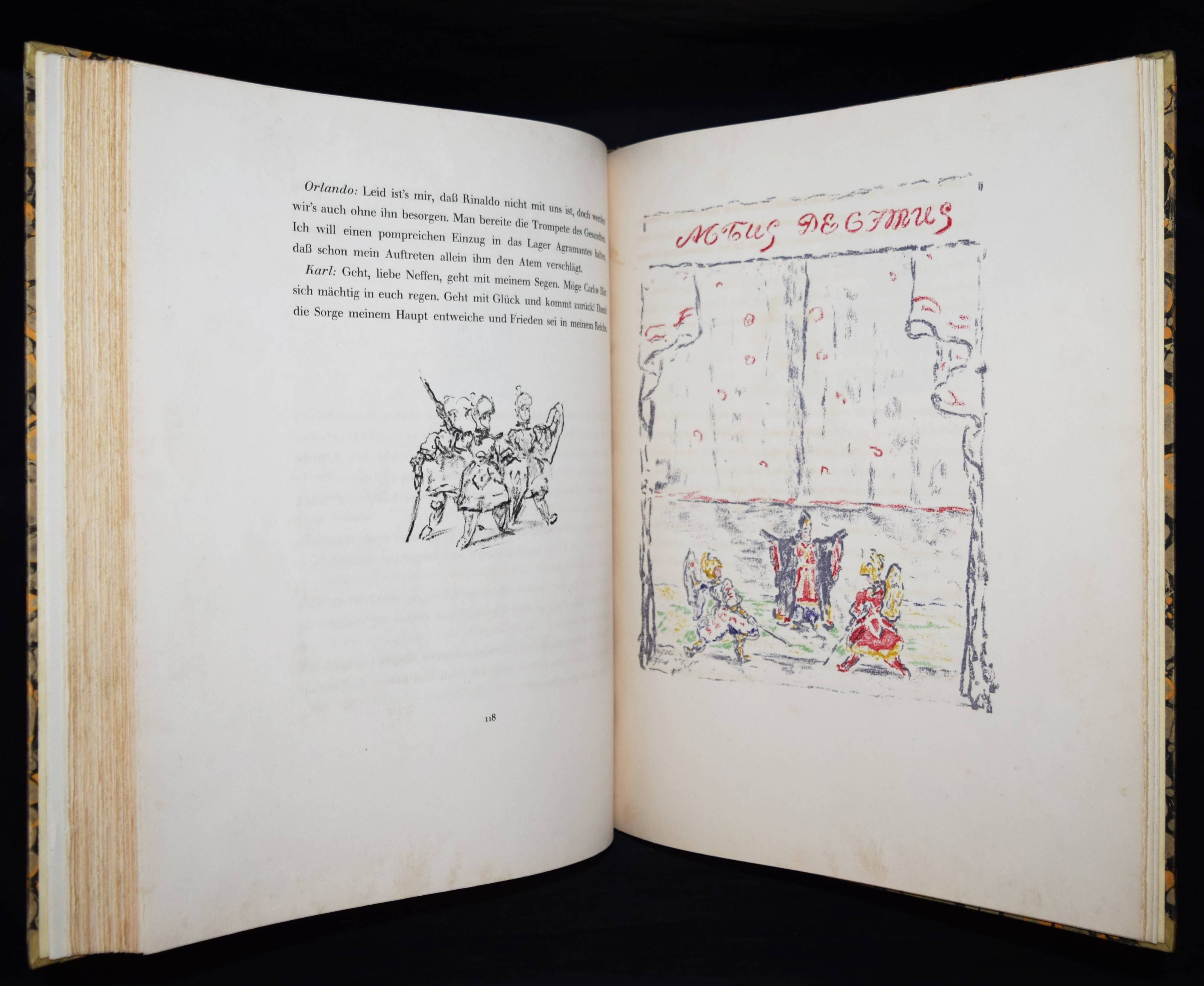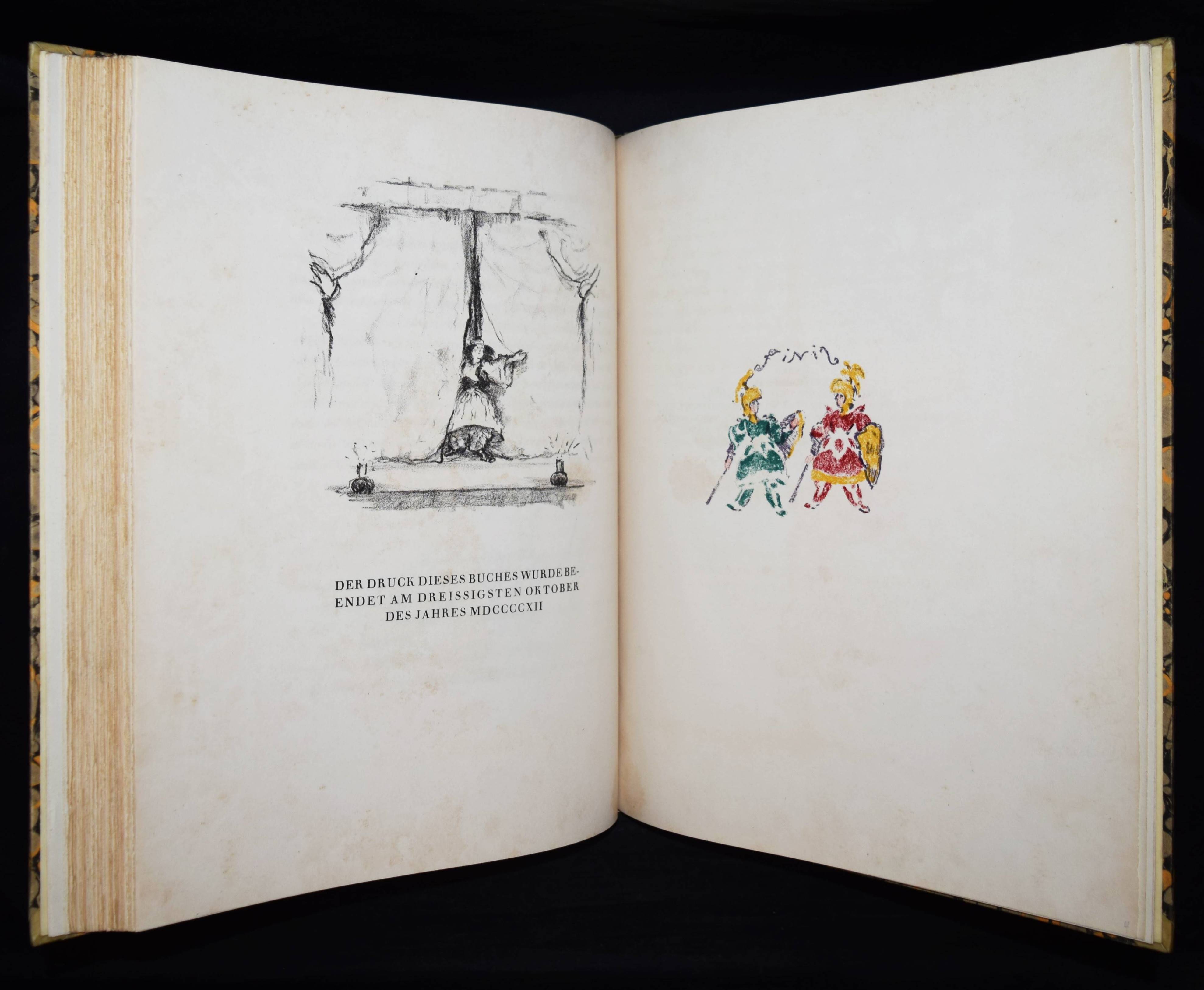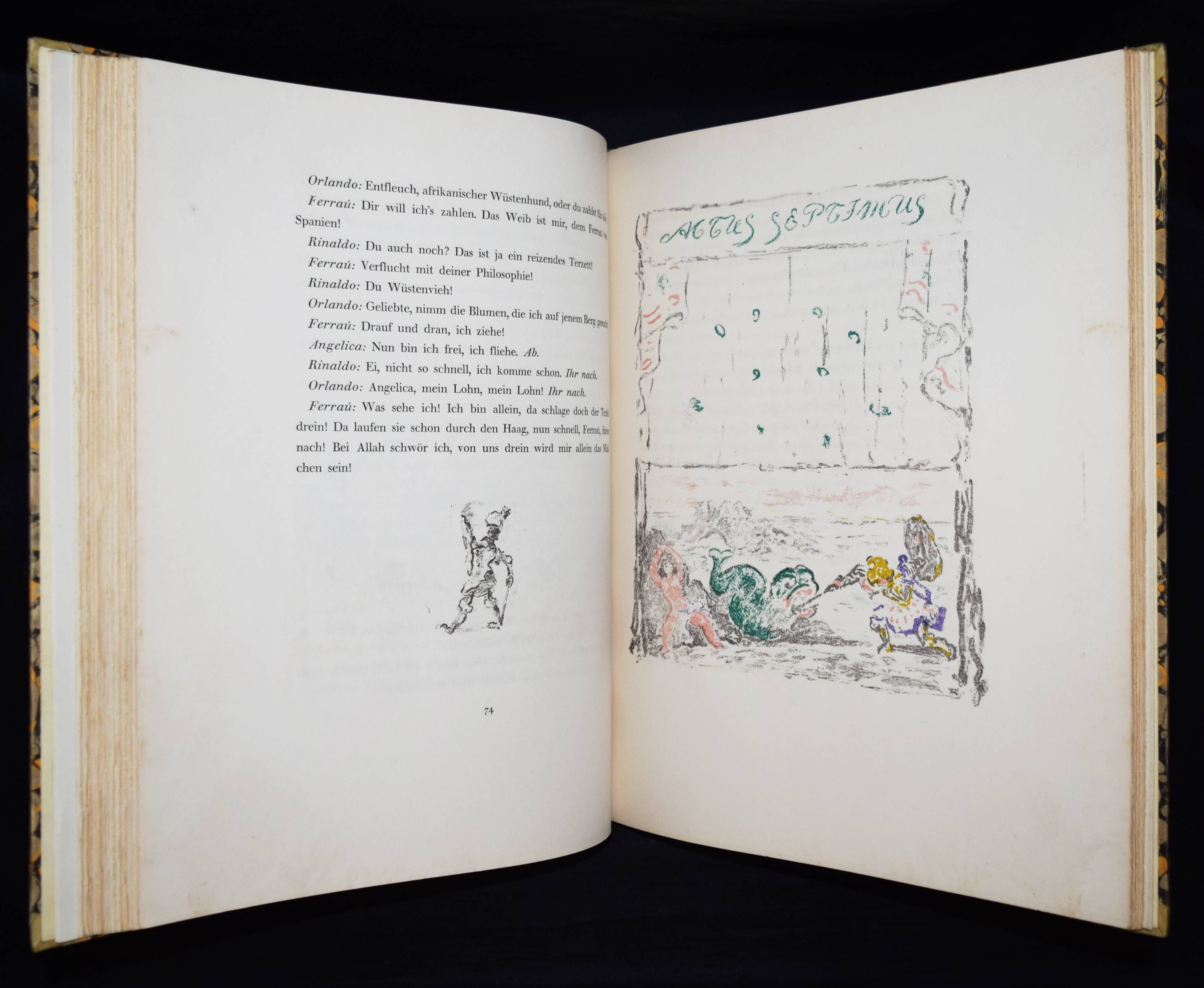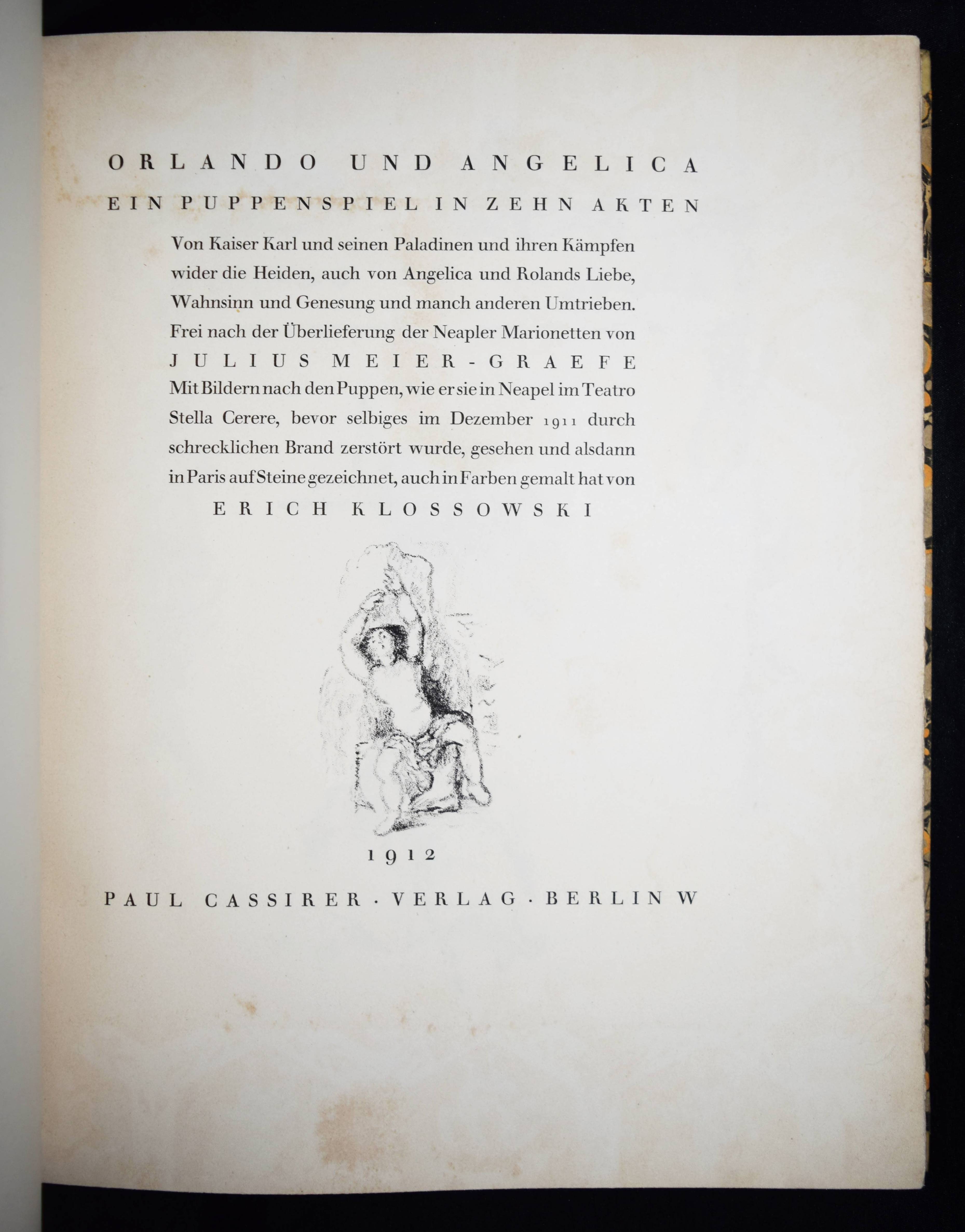 Meier-Graefe, Julius Orlando und Angelica. Ein Puppenspiel in zehn Akten. (Mit Lithographien) von Erich Klossowski. Berlin, Paul Cassirer 1912. Folio (39,8 x 32 cm.). [4] Bl., 133, (3) S. mit 72 (11 farb.) Kreidelithographien, darunter Titelvignette u. Frontispiz u. 60 Illustrationen im Text. OHprgt. mit goldgepr. Rückentitel, 5 unechten Bünden u. Kopfgoldschnitt. Feilchenfeldt/Brandis 144 B. Thieme-Becker XX, 543. – Erste Ausgabe. – Eines von 600 Exemplaren auf Old Stratford-Bütten (GA 634 Exemplare). – „Den Bühnen gegenüber als Manuskript.“ – Das Buch basiert auf einem Puppentheaterstück, das Julius Meier-Graefe und Erich Klossowski 1911 im Teatro Stella Cerere in Neapel gesehen hatten. Das Theater wurde kurze Zeit danach durch einen Brand zerstört. – Meier-Graefe schrieb 1912 an Samuel Fischer: „Die Puppen sind fabelhaft. (Den) Text habe ich sehr frei übertragen (und er) ist nun in ganz fabelhafter Weise von Klossowski illustriert worden. Ich glaube nicht, daß Sie so etwas von Klossowski gesehen haben. Er ist nach meiner Ansicht, die nicht allein steht, der bei weitem talentvollste unter den jungen Deutschen…“ – Nur im äußeren Blattrand vereinzelt leicht fleckig, schönes Exemplar in einem dekorativen Handeinband.