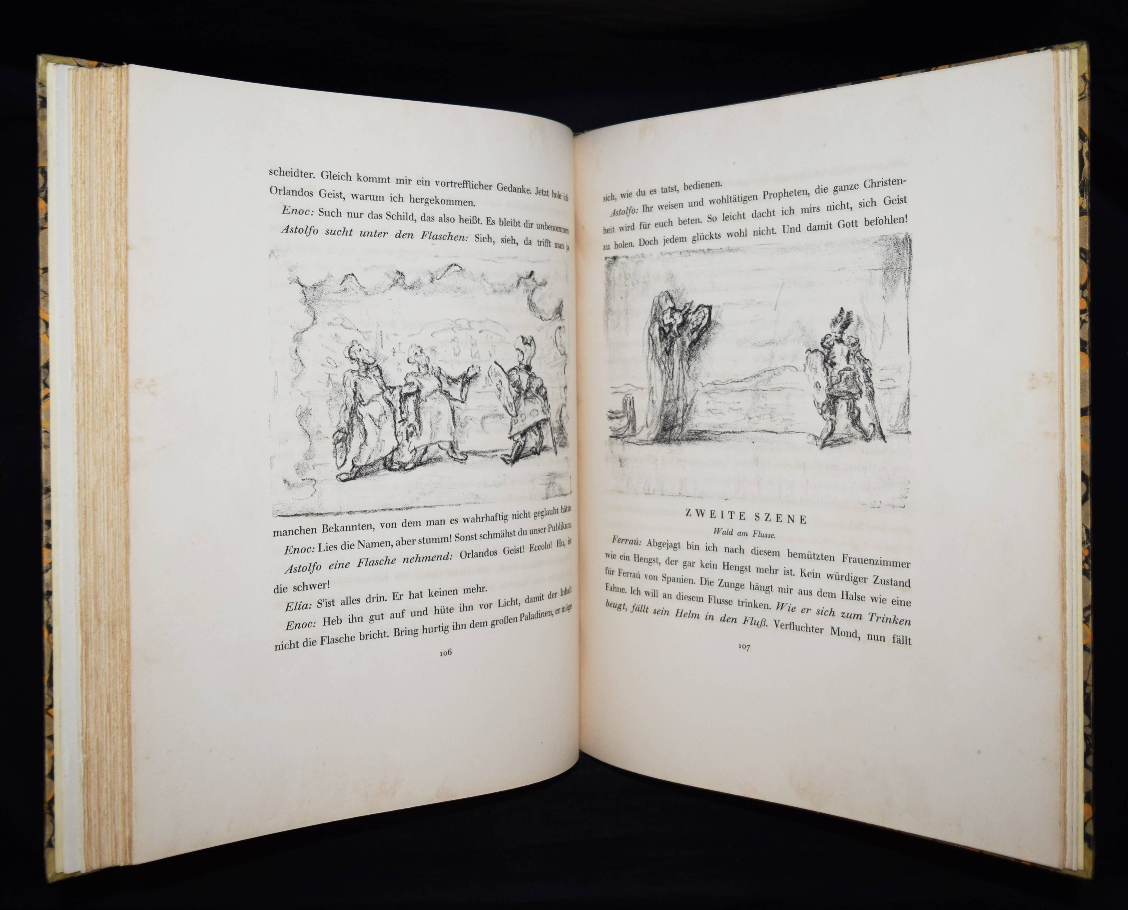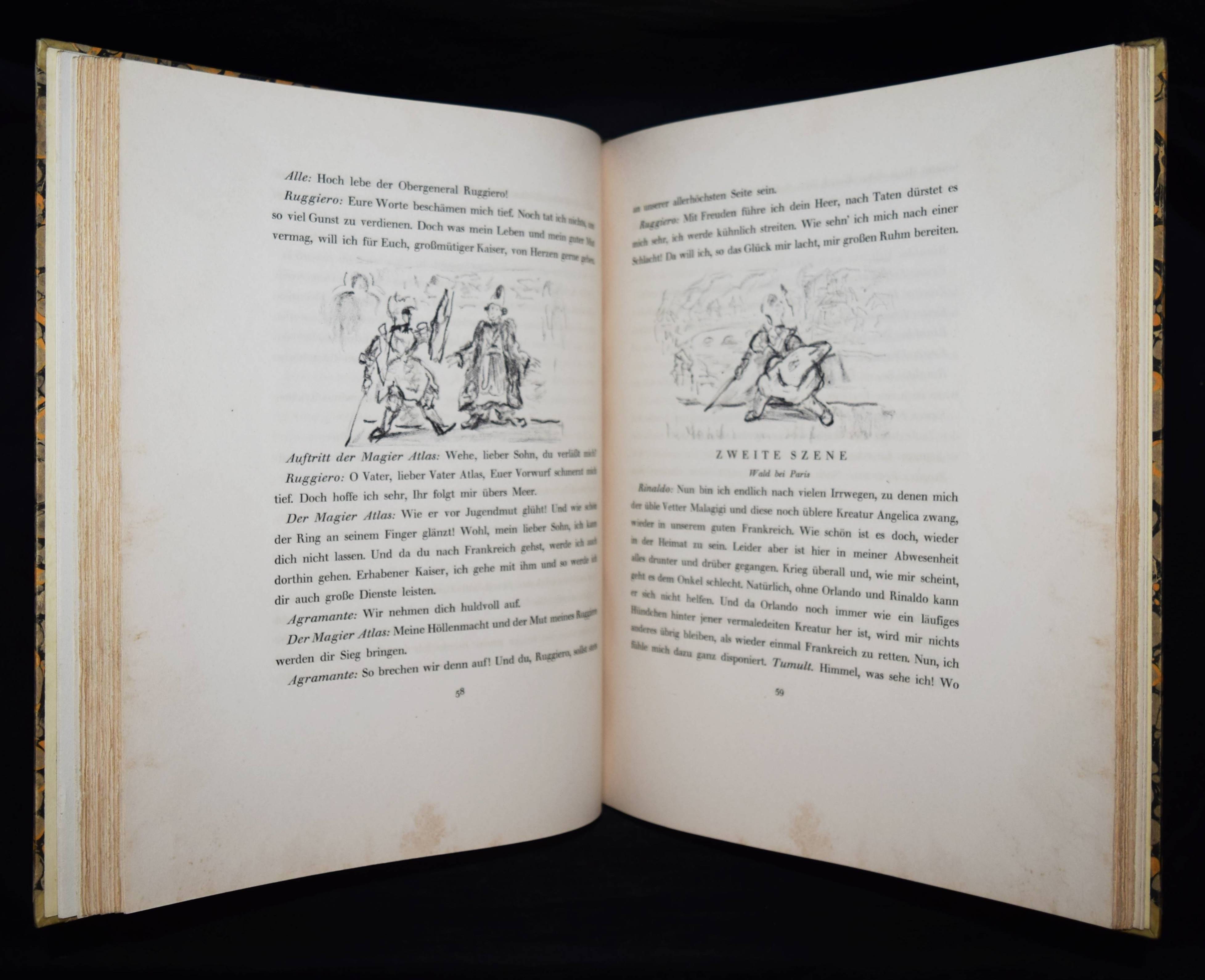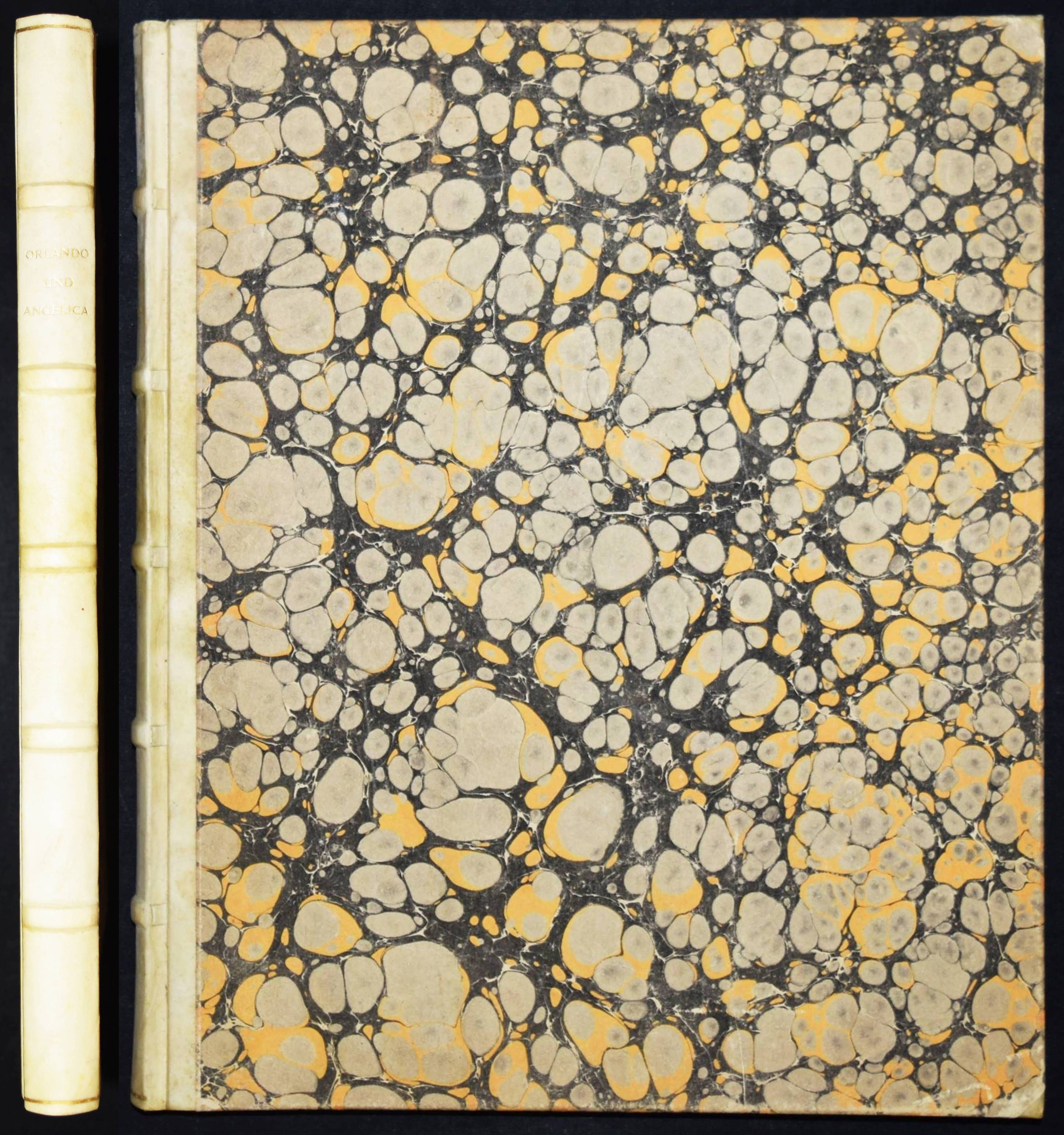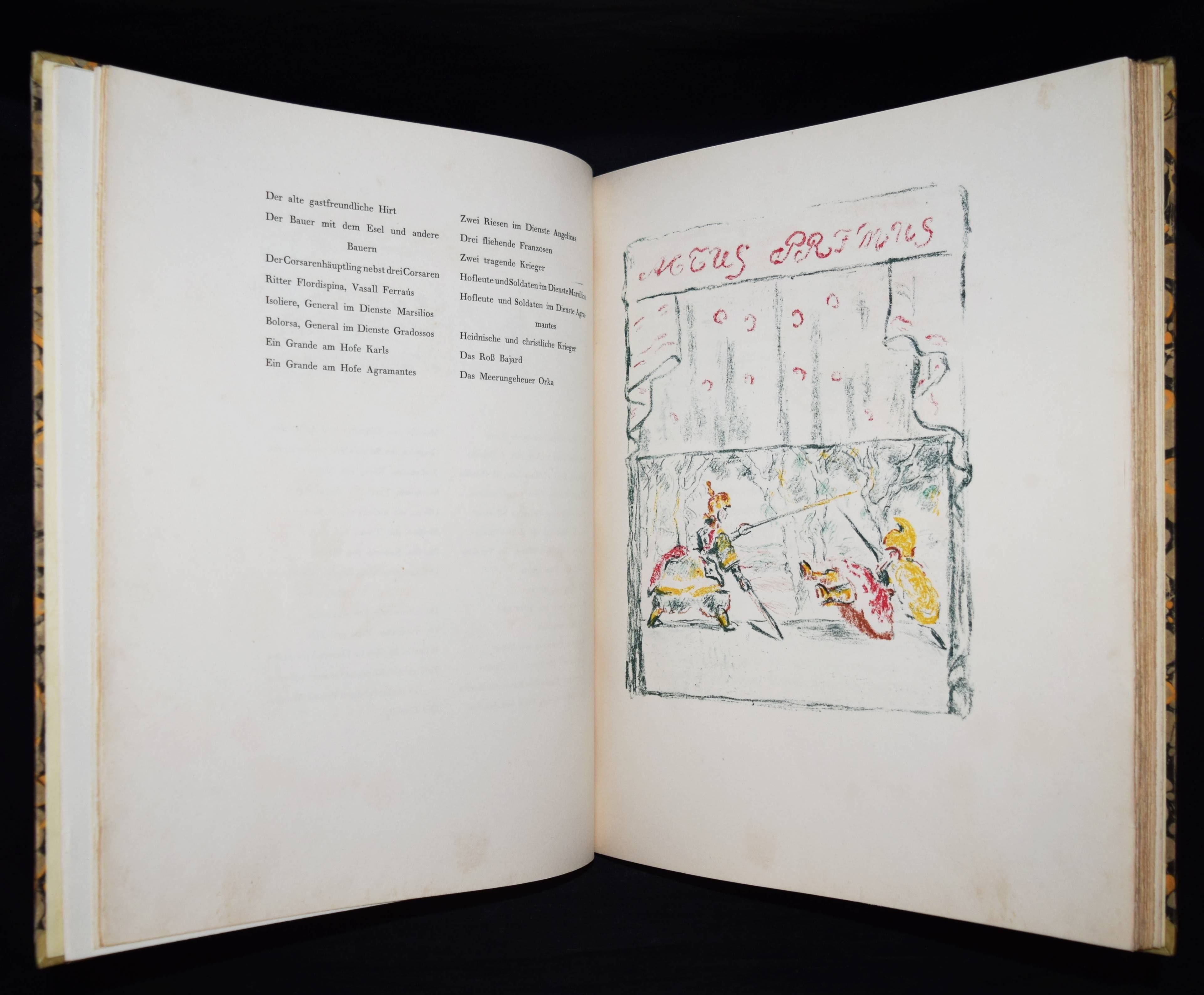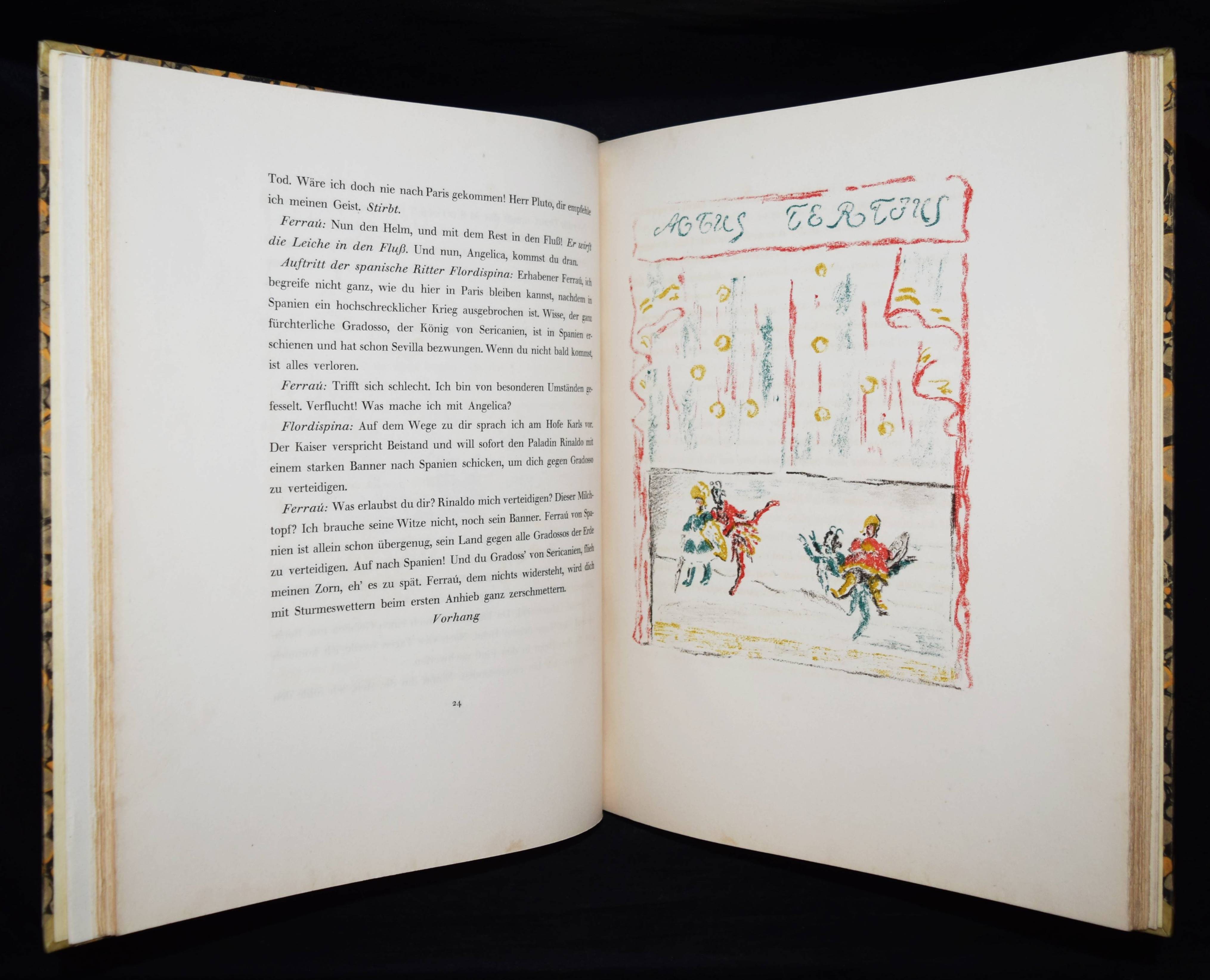 Meier-Graefe, Julius Orlando und Angelica. Ein Puppenspiel in zehn Akten. (Mit Lithographien) von Erich Klossowski. Berlin, Paul Cassirer 1912. Folio (39,8 x 32 cm.). [4] Bl., 133, (3) S. mit 72 (11 farb.) Kreidelithographien, darunter Titelvignette u. Frontispiz u. 60 Illustrationen im Text. OHprgt. mit goldgepr. Rückentitel, 5 unechten Bünden u. Kopfgoldschnitt. Feilchenfeldt/Brandis 144 B. Thieme-Becker XX, 543. – Erste Ausgabe. – Eines von 600 Exemplaren auf Old Stratford-Bütten (GA 634 Exemplare). – „Den Bühnen gegenüber als Manuskript.“ – Das Buch basiert auf einem Puppentheaterstück, das Julius Meier-Graefe und Erich Klossowski 1911 im Teatro Stella Cerere in Neapel gesehen hatten. Das Theater wurde kurze Zeit danach durch einen Brand zerstört. – Meier-Graefe schrieb 1912 an Samuel Fischer: „Die Puppen sind fabelhaft. (Den) Text habe ich sehr frei übertragen (und er) ist nun in ganz fabelhafter Weise von Klossowski illustriert worden. Ich glaube nicht, daß Sie so etwas von Klossowski gesehen haben. Er ist nach meiner Ansicht, die nicht allein steht, der bei weitem talentvollste unter den jungen Deutschen…“ – Nur im äußeren Blattrand vereinzelt leicht fleckig, schönes Exemplar in einem dekorativen Handeinband.