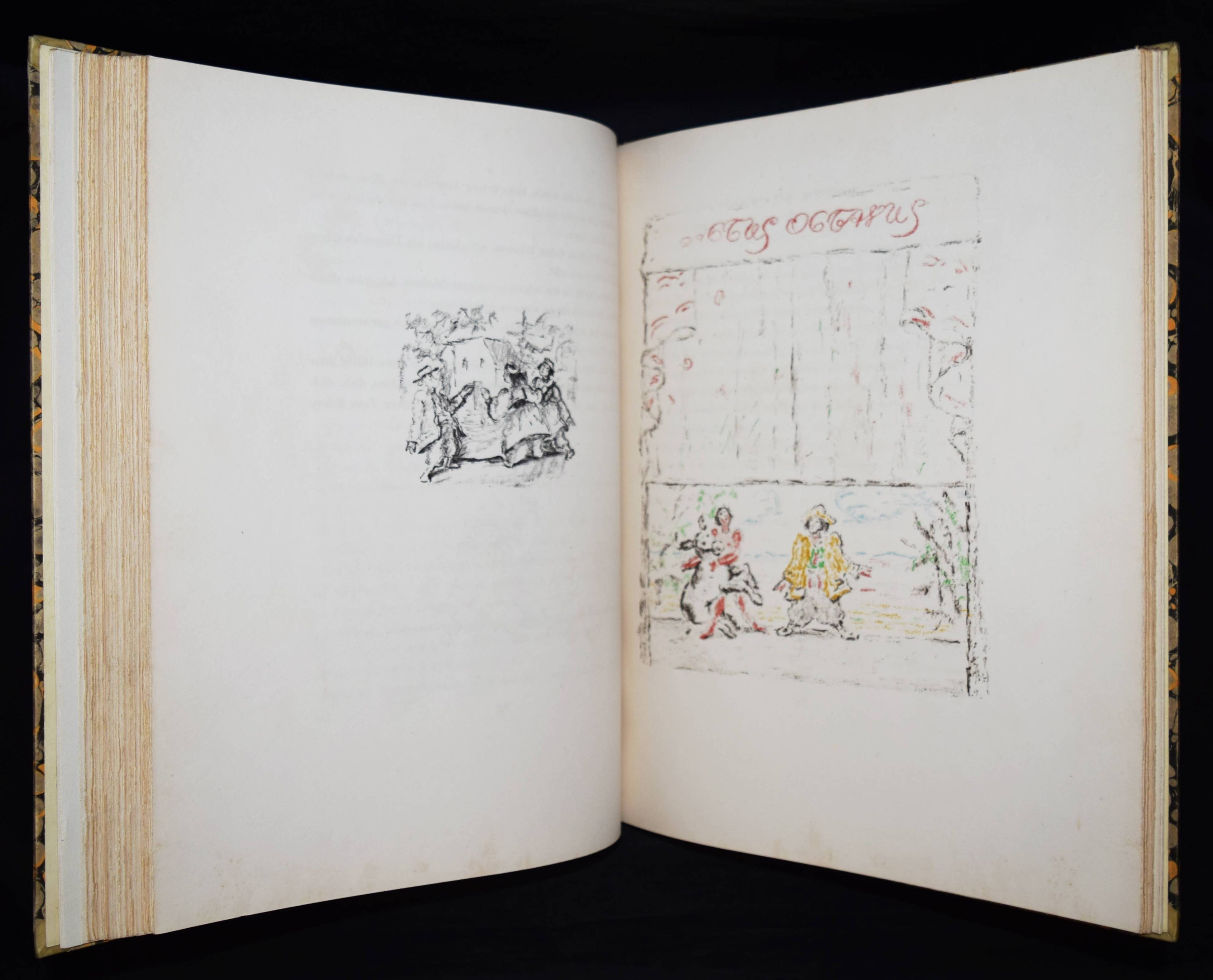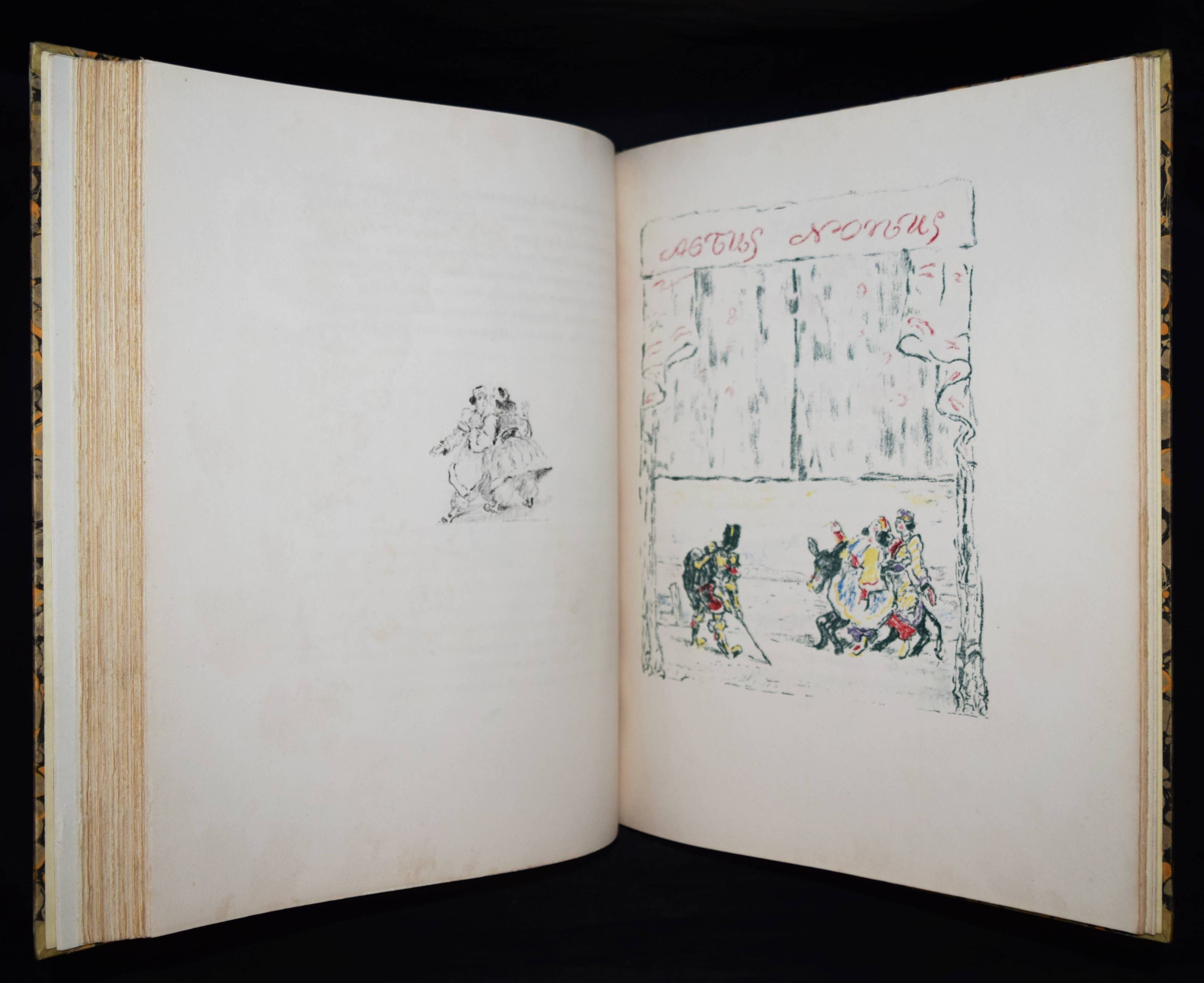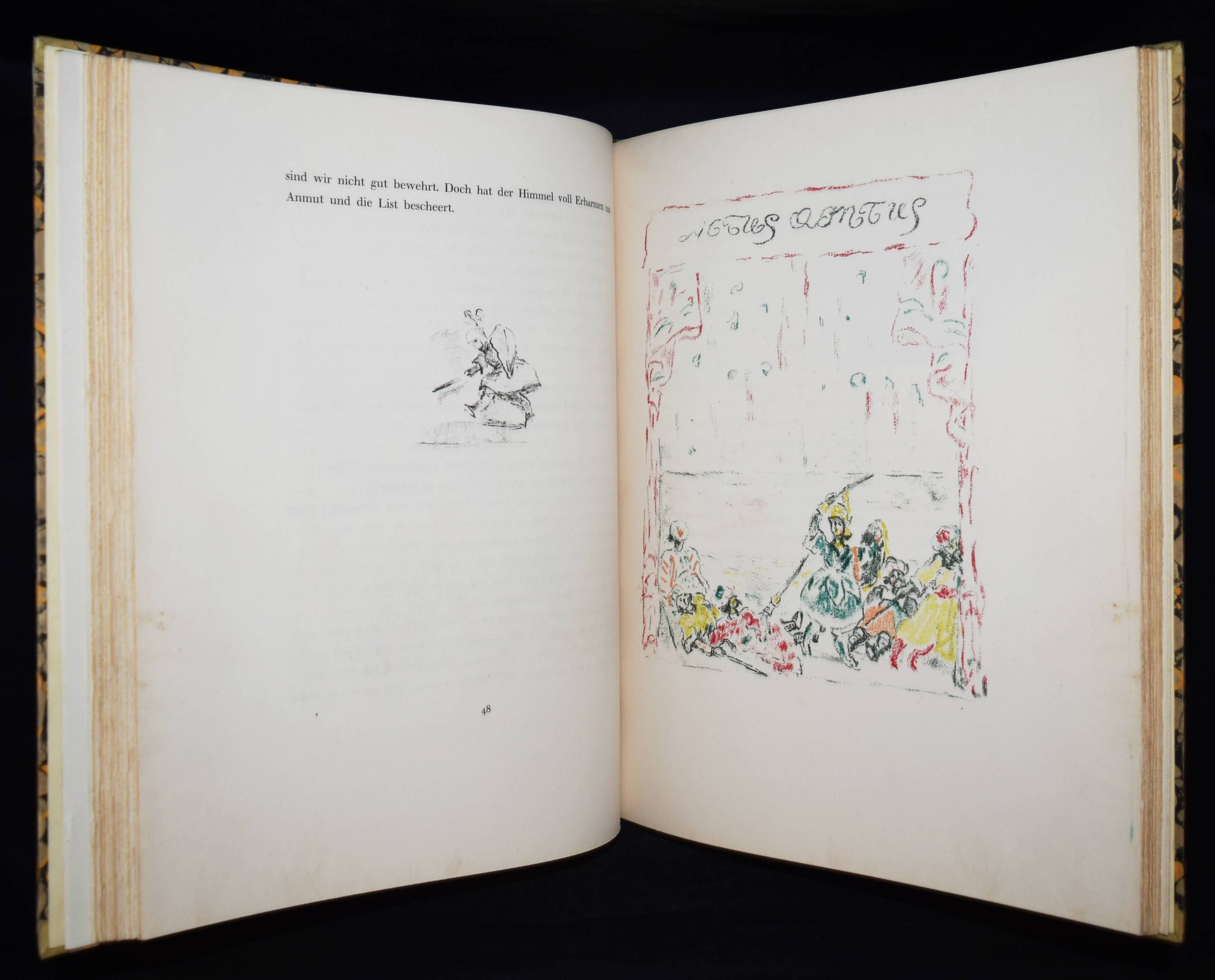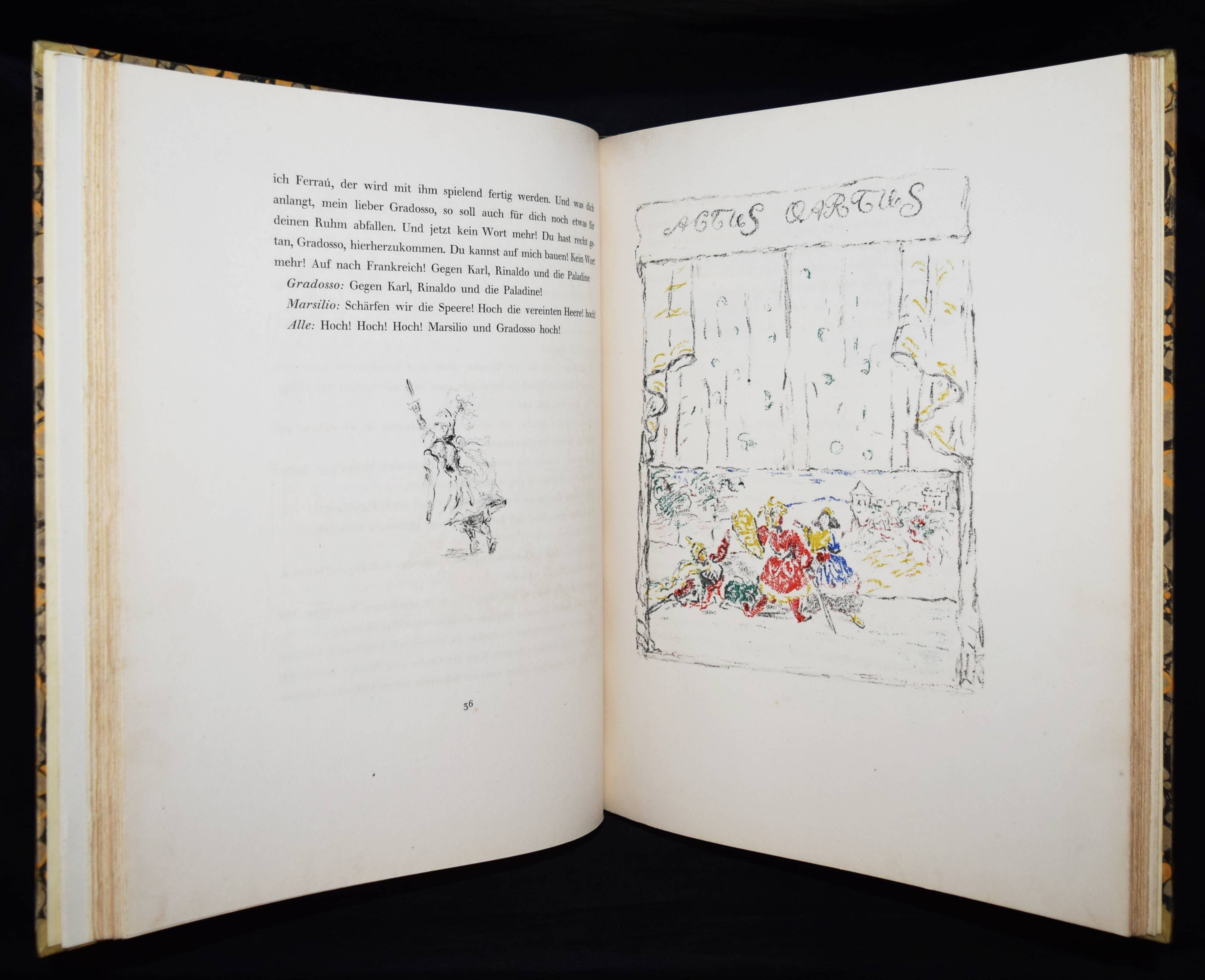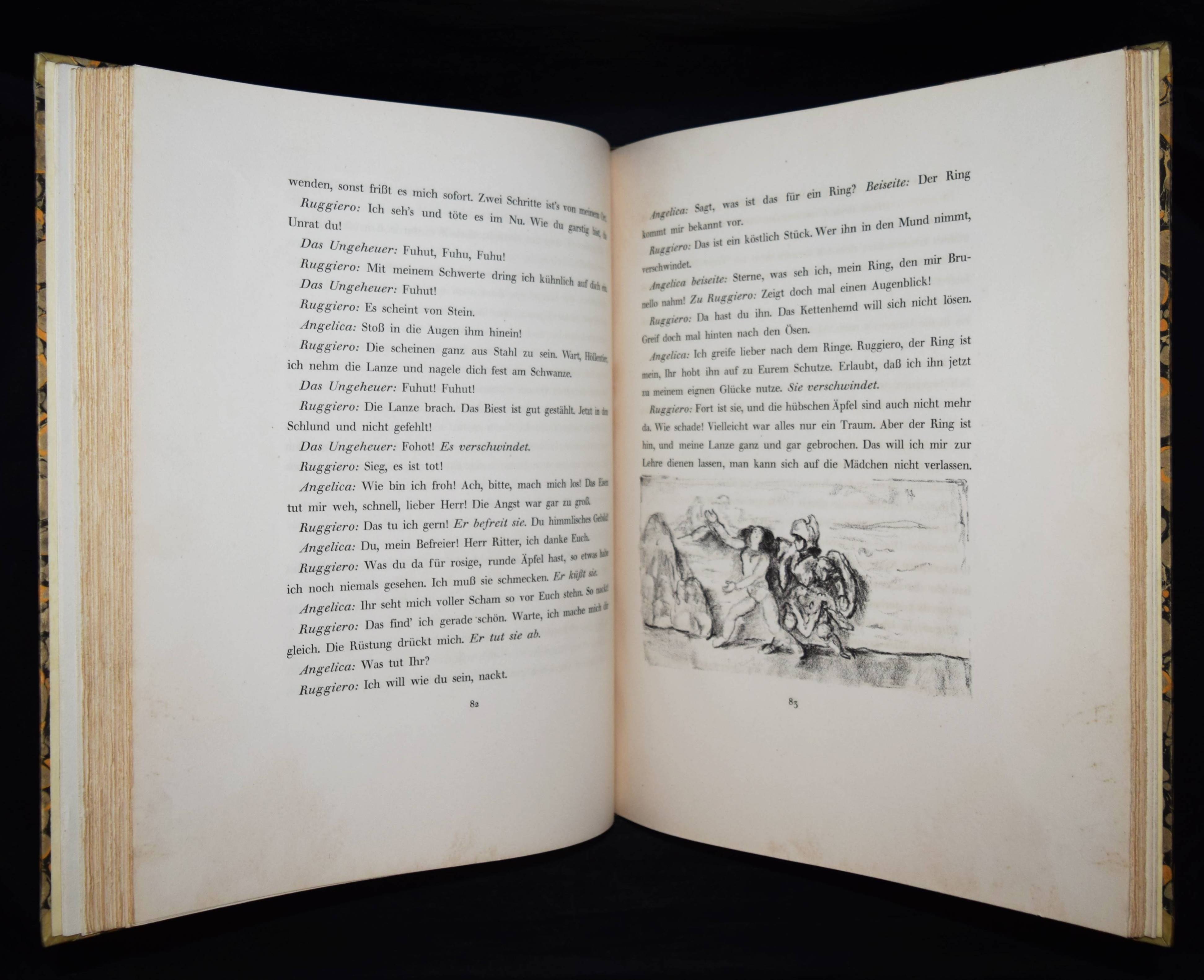 Meier-Graefe, Julius Orlando und Angelica. Ein Puppenspiel in zehn Akten. (Mit Lithographien) von Erich Klossowski. Berlin, Paul Cassirer 1912. Folio (39,8 x 32 cm.). [4] Bl., 133, (3) S. mit 72 (11 farb.) Kreidelithographien, darunter Titelvignette u. Frontispiz u. 60 Illustrationen im Text. OHprgt. mit goldgepr. Rückentitel, 5 unechten Bünden u. Kopfgoldschnitt. Feilchenfeldt/Brandis 144 B. Thieme-Becker XX, 543. – Erste Ausgabe. – Eines von 600 Exemplaren auf Old Stratford-Bütten (GA 634 Exemplare). – „Den Bühnen gegenüber als Manuskript.“ – Das Buch basiert auf einem Puppentheaterstück, das Julius Meier-Graefe und Erich Klossowski 1911 im Teatro Stella Cerere in Neapel gesehen hatten. Das Theater wurde kurze Zeit danach durch einen Brand zerstört. – Meier-Graefe schrieb 1912 an Samuel Fischer: „Die Puppen sind fabelhaft. (Den) Text habe ich sehr frei übertragen (und er) ist nun in ganz fabelhafter Weise von Klossowski illustriert worden. Ich glaube nicht, daß Sie so etwas von Klossowski gesehen haben. Er ist nach meiner Ansicht, die nicht allein steht, der bei weitem talentvollste unter den jungen Deutschen…“ – Nur im äußeren Blattrand vereinzelt leicht fleckig, schönes Exemplar in einem dekorativen Handeinband.