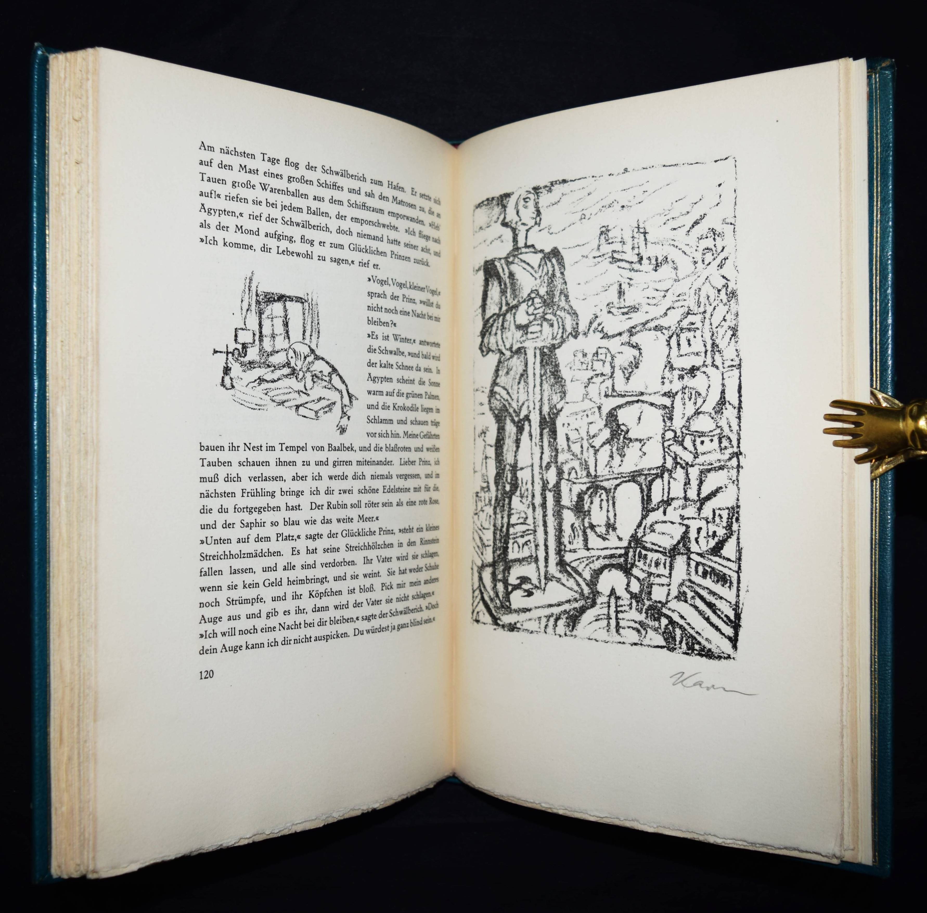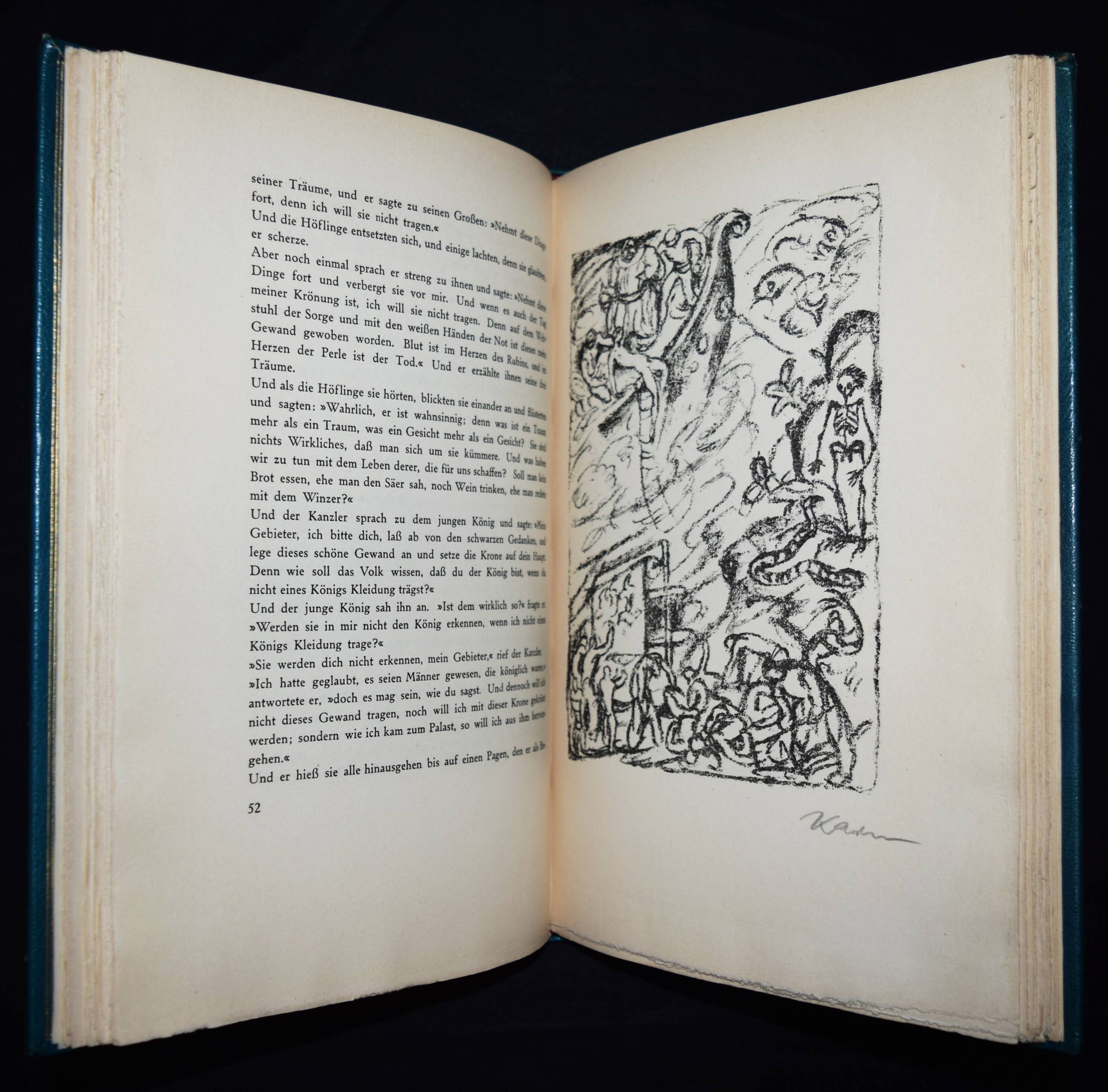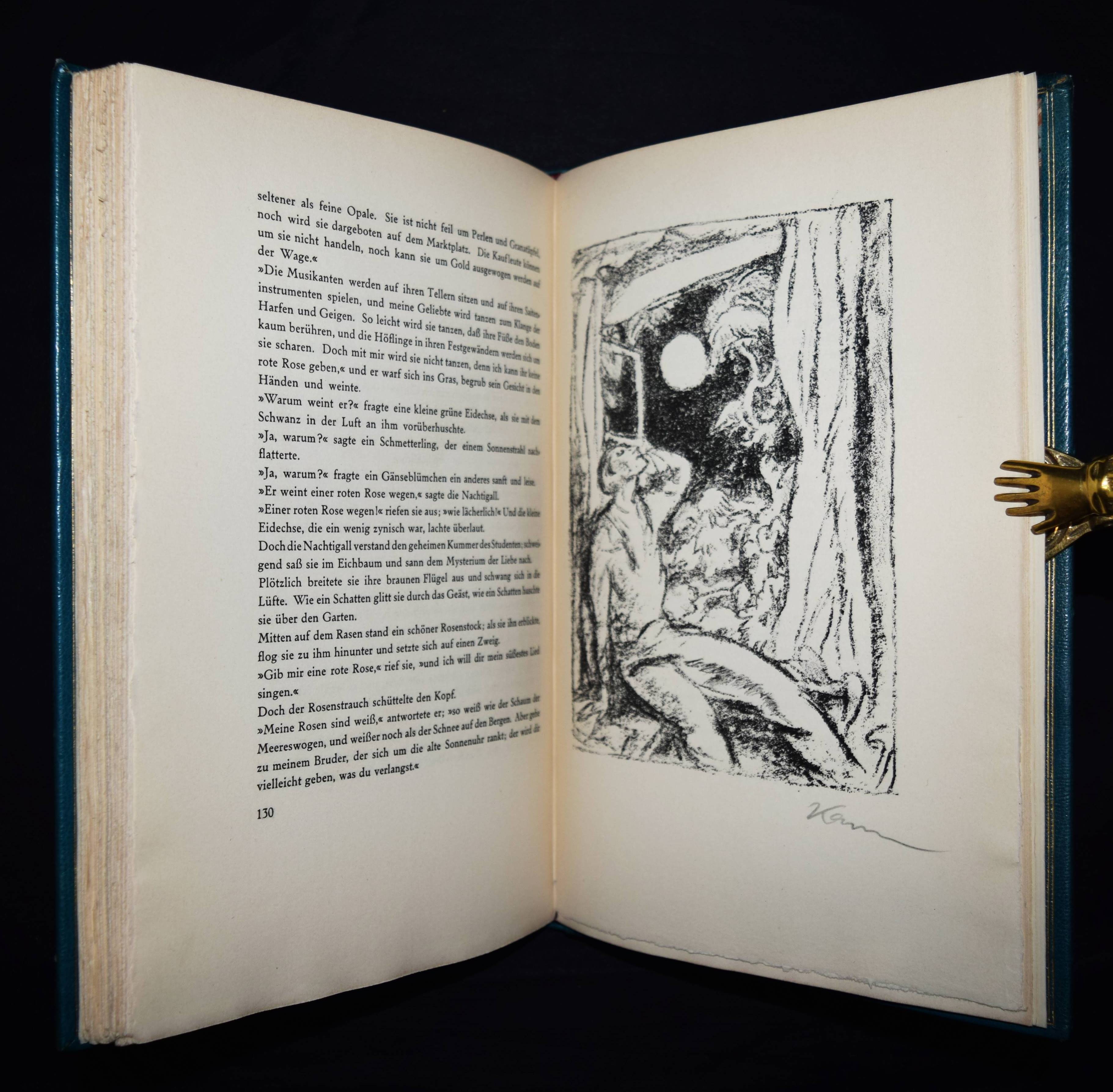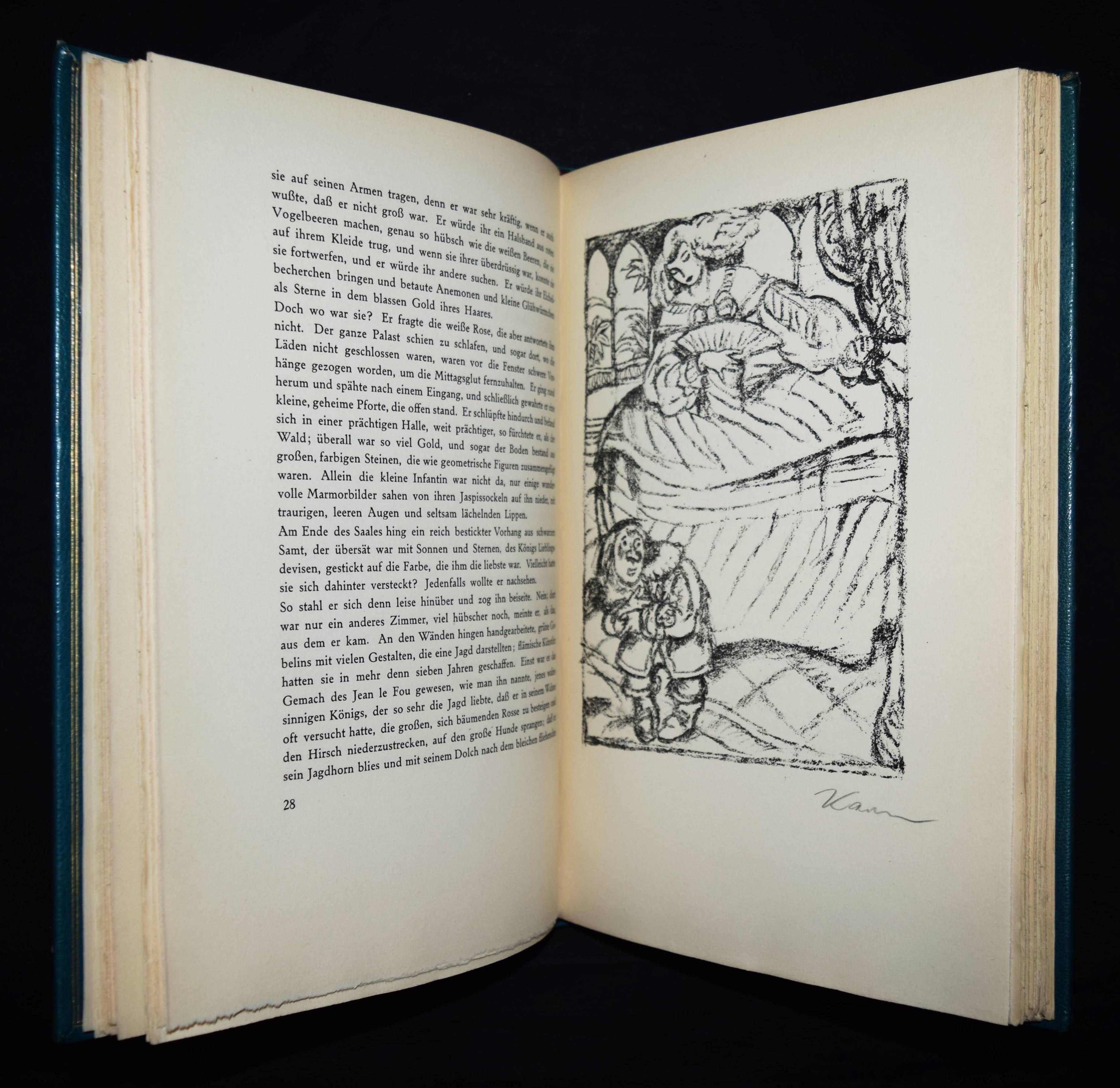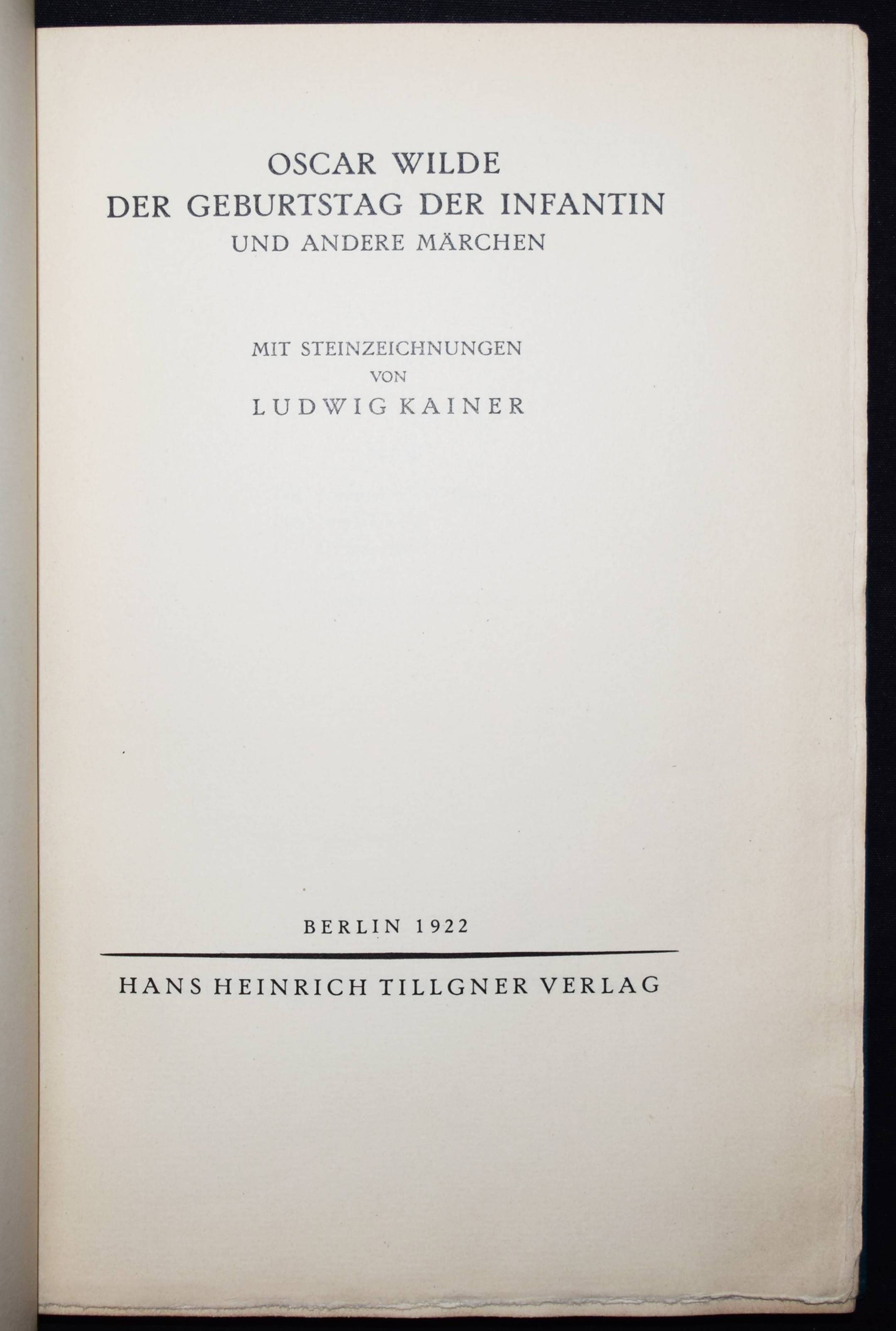 Wilde, Oscar. Der Geburtstag der Infantin und andere Märchen. Mit Steinzeichnungen von Ludwig Kainer. Berlin, Hans Heinrich Tillgner 1922. 4°. [3] Bl., 139, (7) S. mit 33 Orig.-Lithographien, davon 10 ganzseitig und signiert. Türkisgrüner Orig.-Maroquinlederband mit goldgepr. Rückentitel, dezenter Rückenvergoldung, goldgepr. Deckelfiletten, Deckelvignette u. Kopfgoldschnitt (sign. H. Sperling, Leipzig). (Das Prisma I/II). Sennewald 22, 2. – Eins von 100 Exemplaren der Vorzugsausgabe auf Bütten (GA 300 Exemplare). – Der Grafiker, Zeichner, Maler, Illustrator, Filmarchitekt und Kostümbildner L. Kainer (1885-1967) arbeitete vorwiegend für den Simplicissimus (bis 1930 insgesamt 205 Beiträge), während er in der Jugend ab 1909 nur gelegentlich vertreten war. Ab 1912 waren Kainers Illustrationen auch in Zeitschriften wie Der Sturm, Styl, Kleiderkasten und Die Dame vertreten. 1914 entwarf er den Einband von Kurt Pinthus’ Das Kinobuch, im selben Jahr stellte Kainer auf der Bugra in Leipzig aus. – Hans Heinrich Tillgner (1898–1976) gründete nach seinem Literatur- und Kunstgeschichtsstudium Anfang der 1920er Jahre seinen kleinen bibliophilen Verlag. 1922/23 edierte er die Reihe „Das Prisma“. Alle fünfzehn Ausgaben enthielten signierte blattgroße Originallithographien und Textillustrationen, bis Band 7 auch illustrierte Titelblätter. – Der schöne Einband wurde von Walter Hacker für die renomierte Leipziger Buchbinderei H. Sperling (gegr. 1846) angefertigt. – Sehr gutes Exemplar.