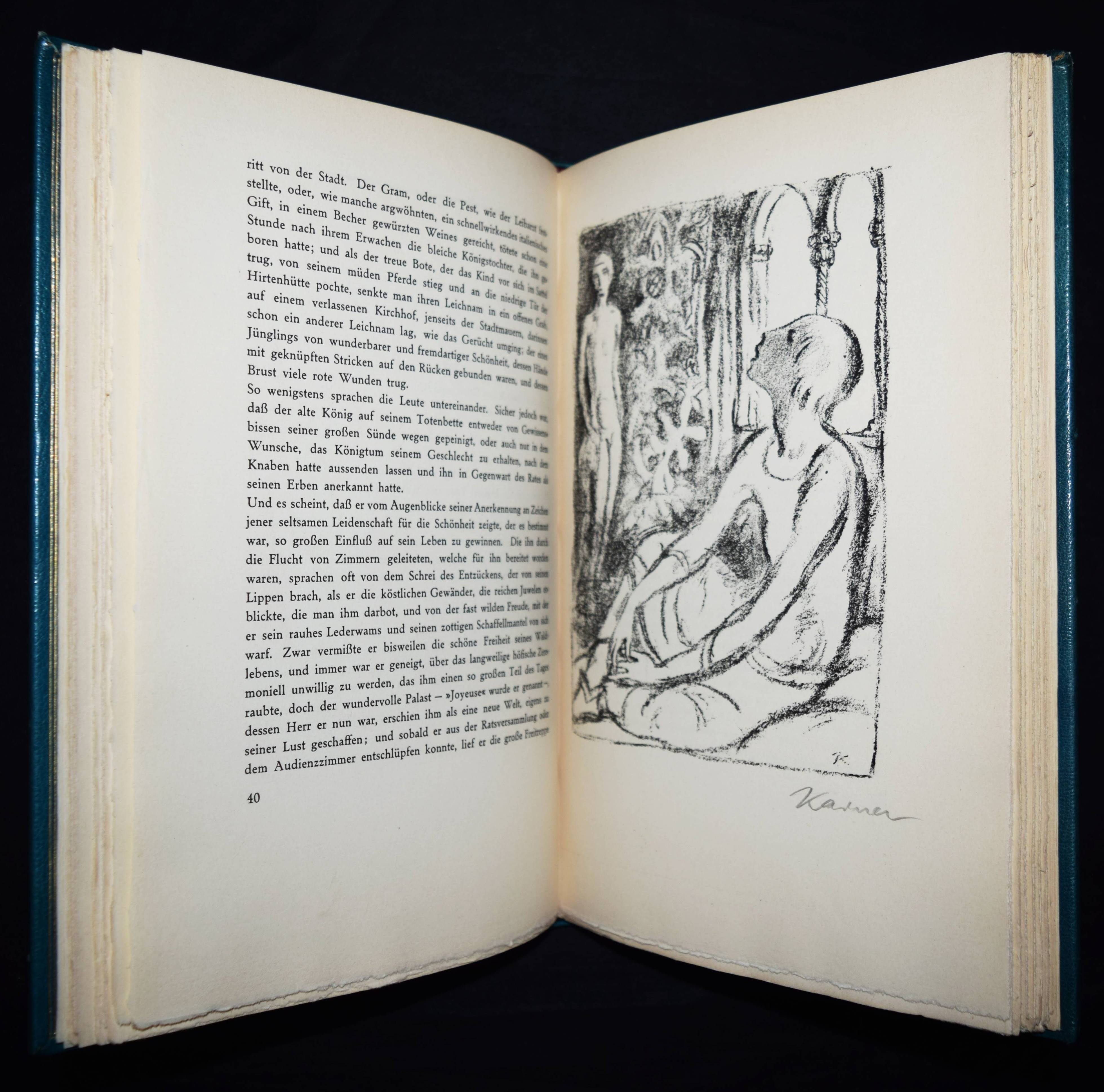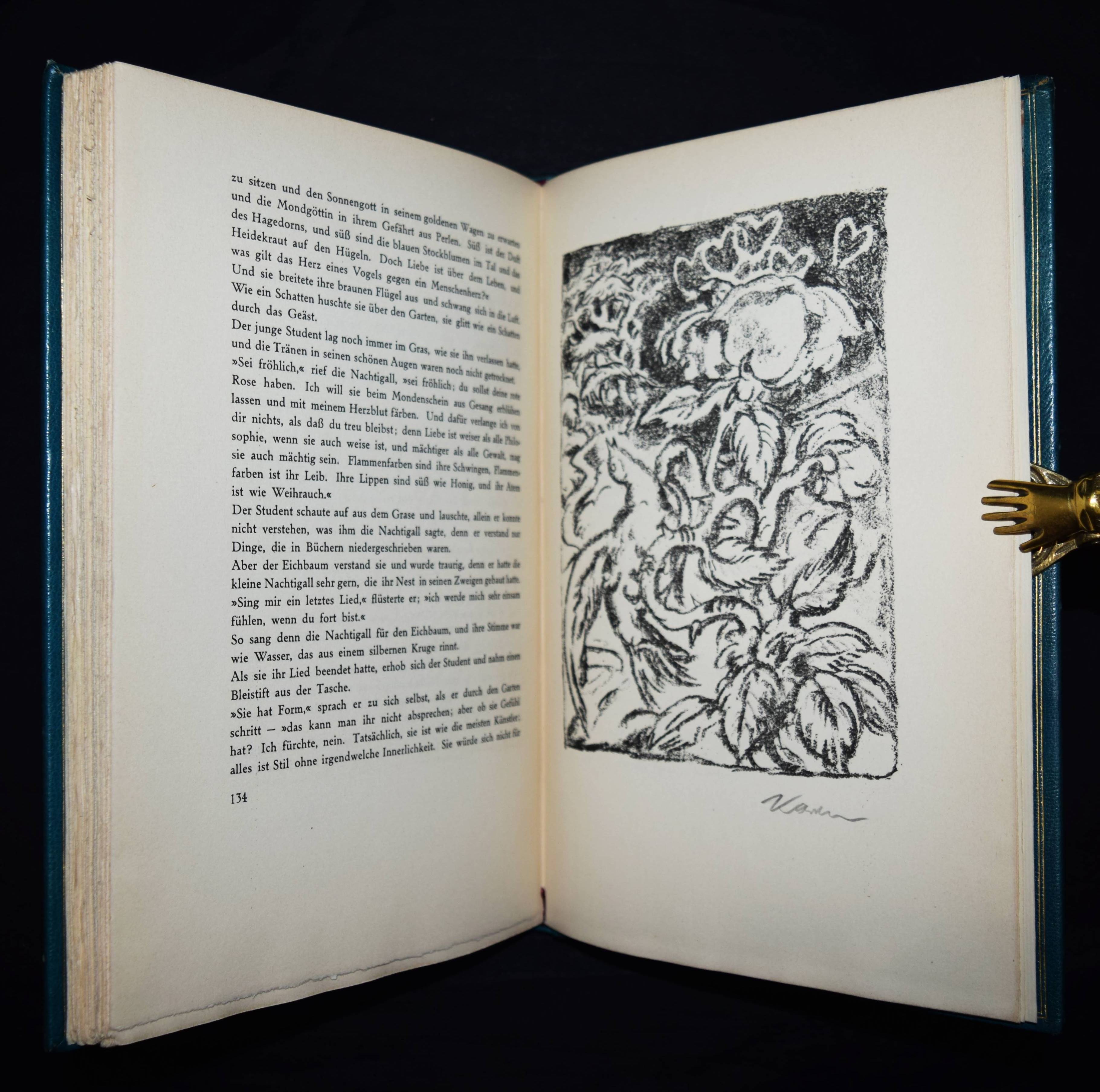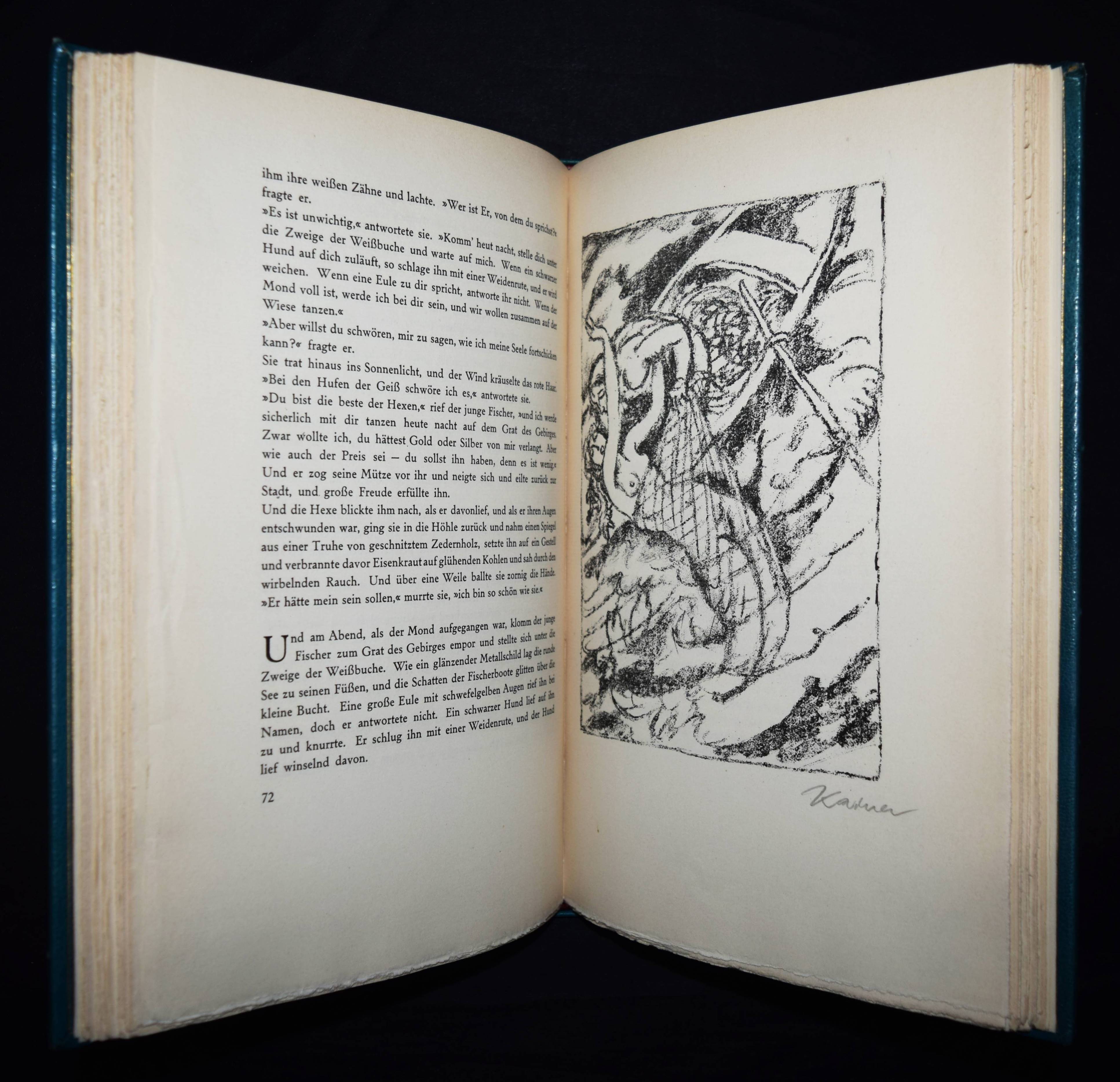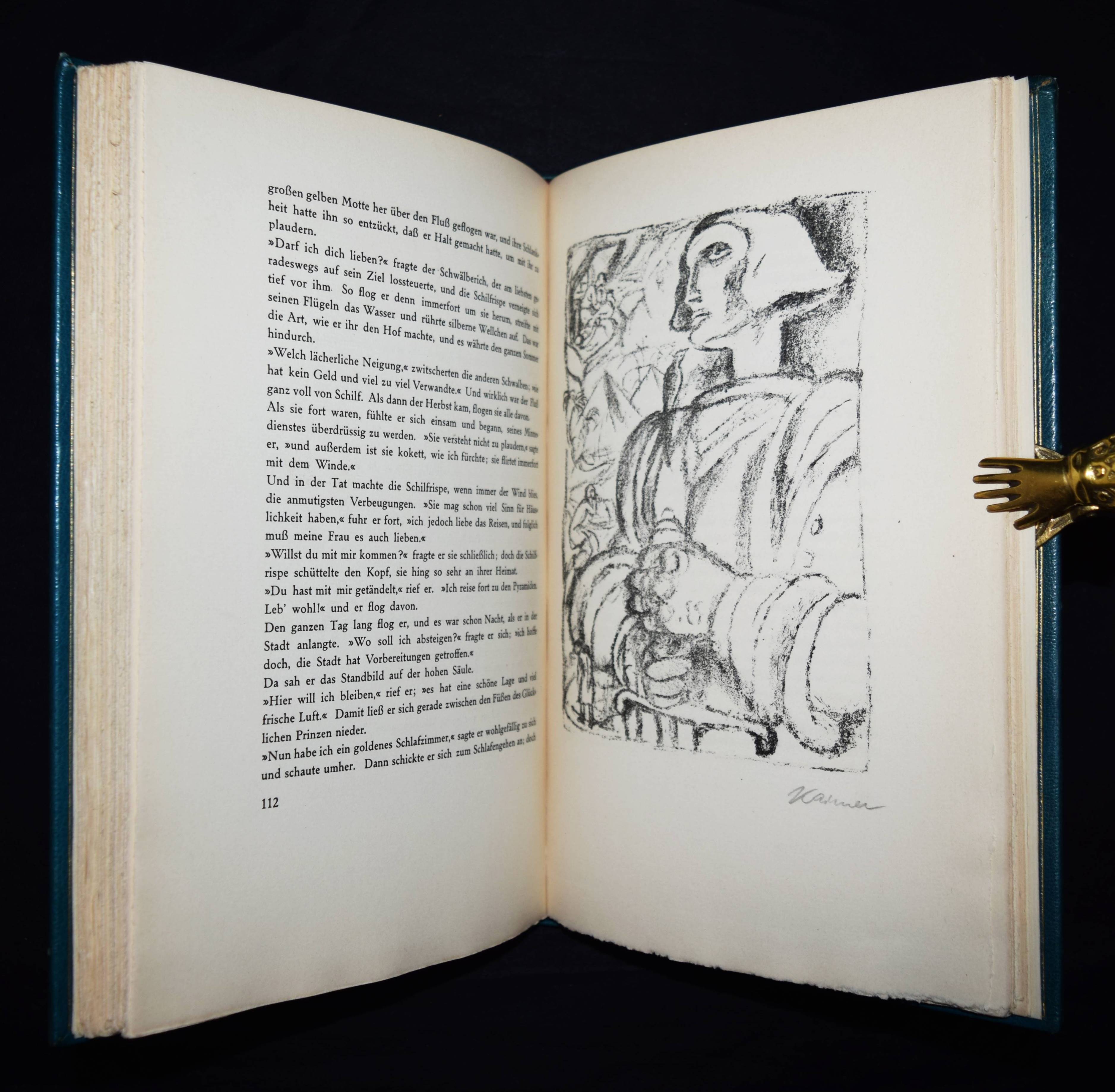 Wilde, Oscar. Der Geburtstag der Infantin und andere Märchen. Mit Steinzeichnungen von Ludwig Kainer. Berlin, Hans Heinrich Tillgner 1922. 4°. [3] Bl., 139, (7) S. mit 33 Orig.-Lithographien, davon 10 ganzseitig und signiert. Türkisgrüner Orig.-Maroquinlederband mit goldgepr. Rückentitel, dezenter Rückenvergoldung, goldgepr. Deckelfiletten, Deckelvignette u. Kopfgoldschnitt (sign. H. Sperling, Leipzig). (Das Prisma I/II). Sennewald 22, 2. – Eins von 100 Exemplaren der Vorzugsausgabe auf Bütten (GA 300 Exemplare). – Der Grafiker, Zeichner, Maler, Illustrator, Filmarchitekt und Kostümbildner L. Kainer (1885-1967) arbeitete vorwiegend für den Simplicissimus (bis 1930 insgesamt 205 Beiträge), während er in der Jugend ab 1909 nur gelegentlich vertreten war. Ab 1912 waren Kainers Illustrationen auch in Zeitschriften wie Der Sturm, Styl, Kleiderkasten und Die Dame vertreten. 1914 entwarf er den Einband von Kurt Pinthus’ Das Kinobuch, im selben Jahr stellte Kainer auf der Bugra in Leipzig aus. – Hans Heinrich Tillgner (1898–1976) gründete nach seinem Literatur- und Kunstgeschichtsstudium Anfang der 1920er Jahre seinen kleinen bibliophilen Verlag. 1922/23 edierte er die Reihe „Das Prisma“. Alle fünfzehn Ausgaben enthielten signierte blattgroße Originallithographien und Textillustrationen, bis Band 7 auch illustrierte Titelblätter. – Der schöne Einband wurde von Walter Hacker für die renomierte Leipziger Buchbinderei H. Sperling (gegr. 1846) angefertigt. – Sehr gutes Exemplar.
