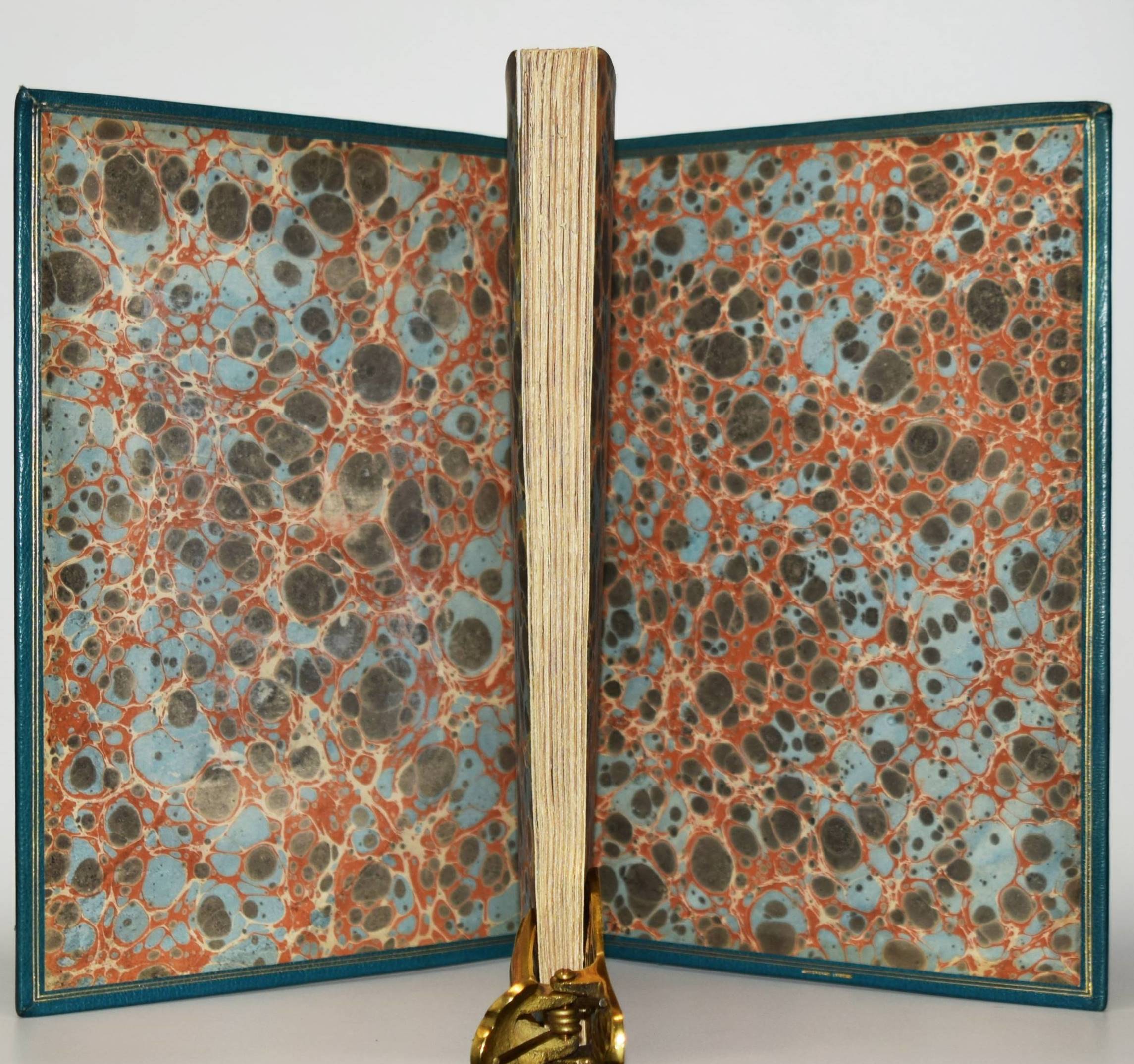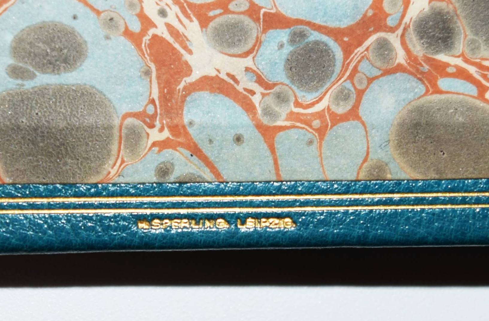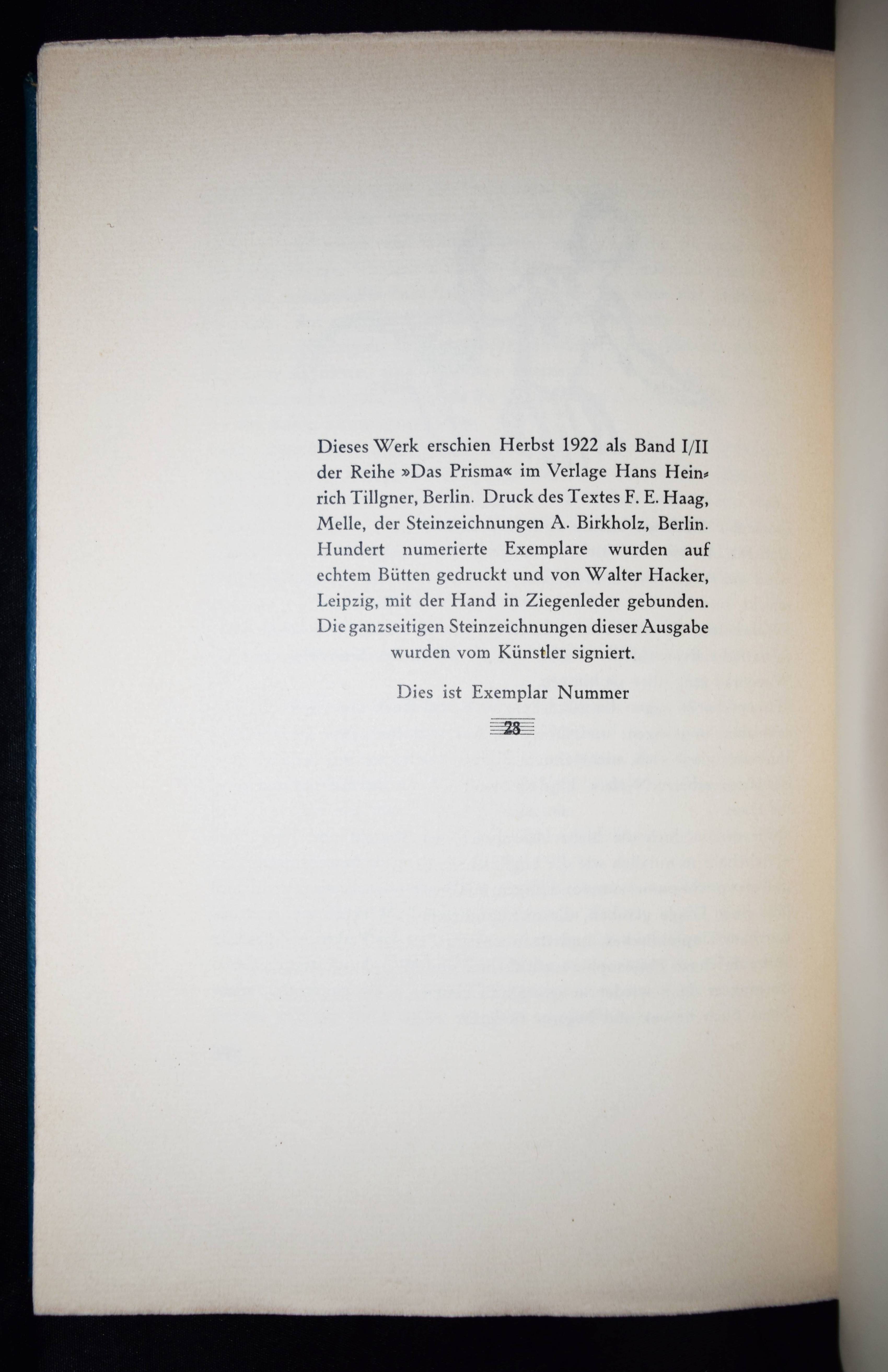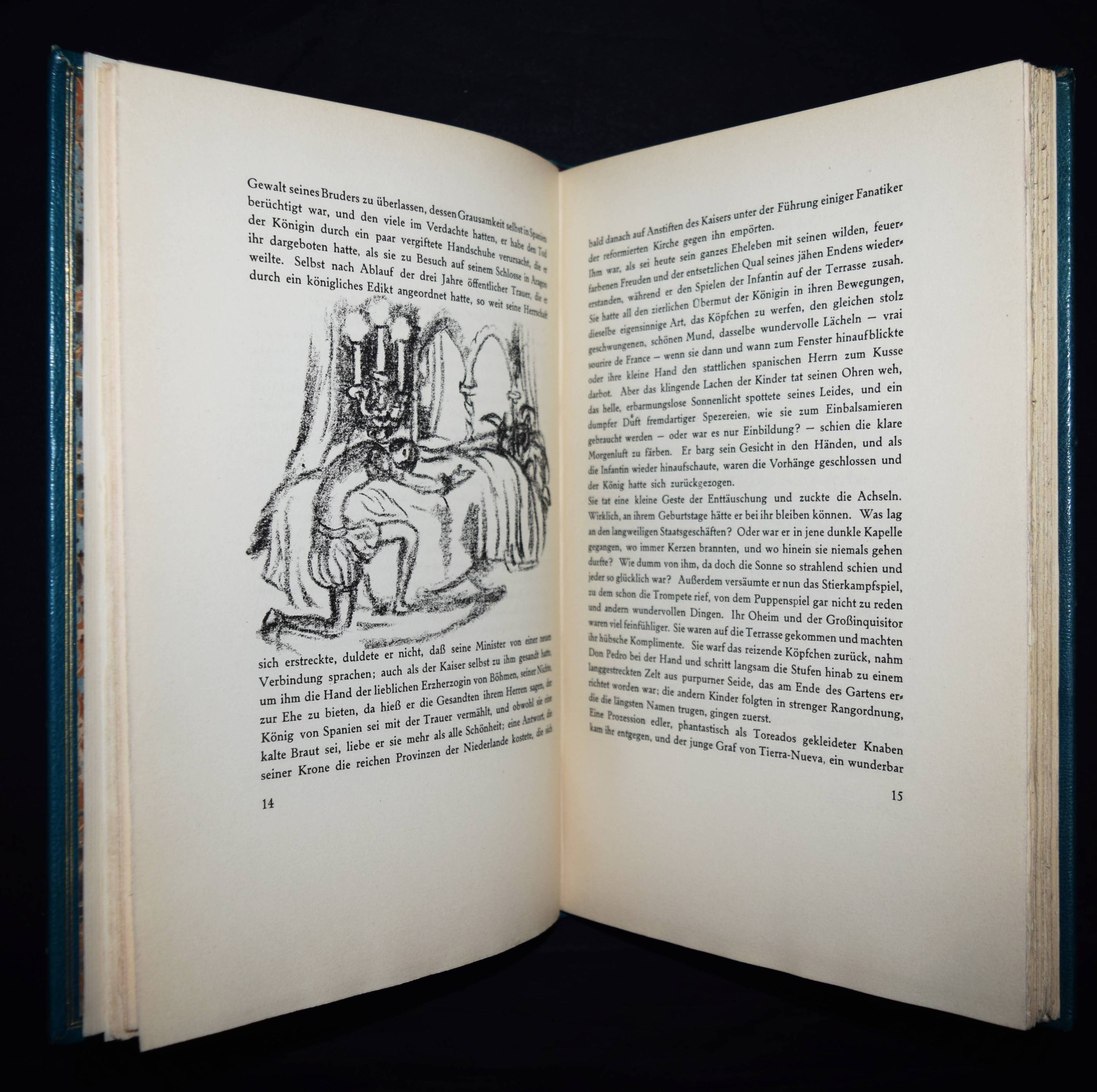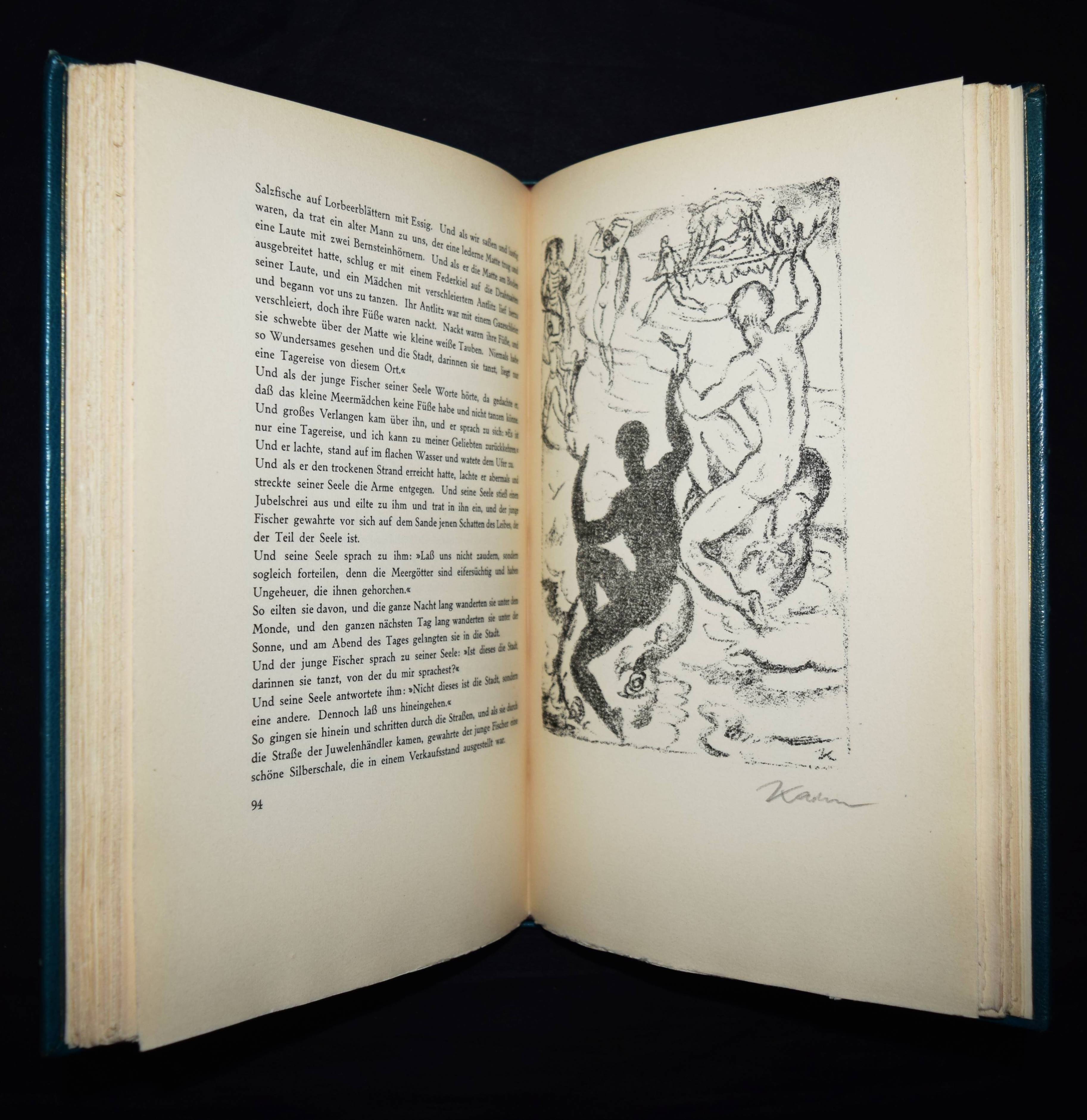 Wilde, Oscar. Der Geburtstag der Infantin und andere Märchen. Mit Steinzeichnungen von Ludwig Kainer. Berlin, Hans Heinrich Tillgner 1922. 4°. [3] Bl., 139, (7) S. mit 33 Orig.-Lithographien, davon 10 ganzseitig und signiert. Türkisgrüner Orig.-Maroquinlederband mit goldgepr. Rückentitel, dezenter Rückenvergoldung, goldgepr. Deckelfiletten, Deckelvignette u. Kopfgoldschnitt (sign. H. Sperling, Leipzig). (Das Prisma I/II). Sennewald 22, 2. – Eins von 100 Exemplaren der Vorzugsausgabe auf Bütten (GA 300 Exemplare). – Der Grafiker, Zeichner, Maler, Illustrator, Filmarchitekt und Kostümbildner L. Kainer (1885-1967) arbeitete vorwiegend für den Simplicissimus (bis 1930 insgesamt 205 Beiträge), während er in der Jugend ab 1909 nur gelegentlich vertreten war. Ab 1912 waren Kainers Illustrationen auch in Zeitschriften wie Der Sturm, Styl, Kleiderkasten und Die Dame vertreten. 1914 entwarf er den Einband von Kurt Pinthus’ Das Kinobuch, im selben Jahr stellte Kainer auf der Bugra in Leipzig aus. – Hans Heinrich Tillgner (1898–1976) gründete nach seinem Literatur- und Kunstgeschichtsstudium Anfang der 1920er Jahre seinen kleinen bibliophilen Verlag. 1922/23 edierte er die Reihe „Das Prisma“. Alle fünfzehn Ausgaben enthielten signierte blattgroße Originallithographien und Textillustrationen, bis Band 7 auch illustrierte Titelblätter. – Der schöne Einband wurde von Walter Hacker für die renomierte Leipziger Buchbinderei H. Sperling (gegr. 1846) angefertigt. – Sehr gutes Exemplar.