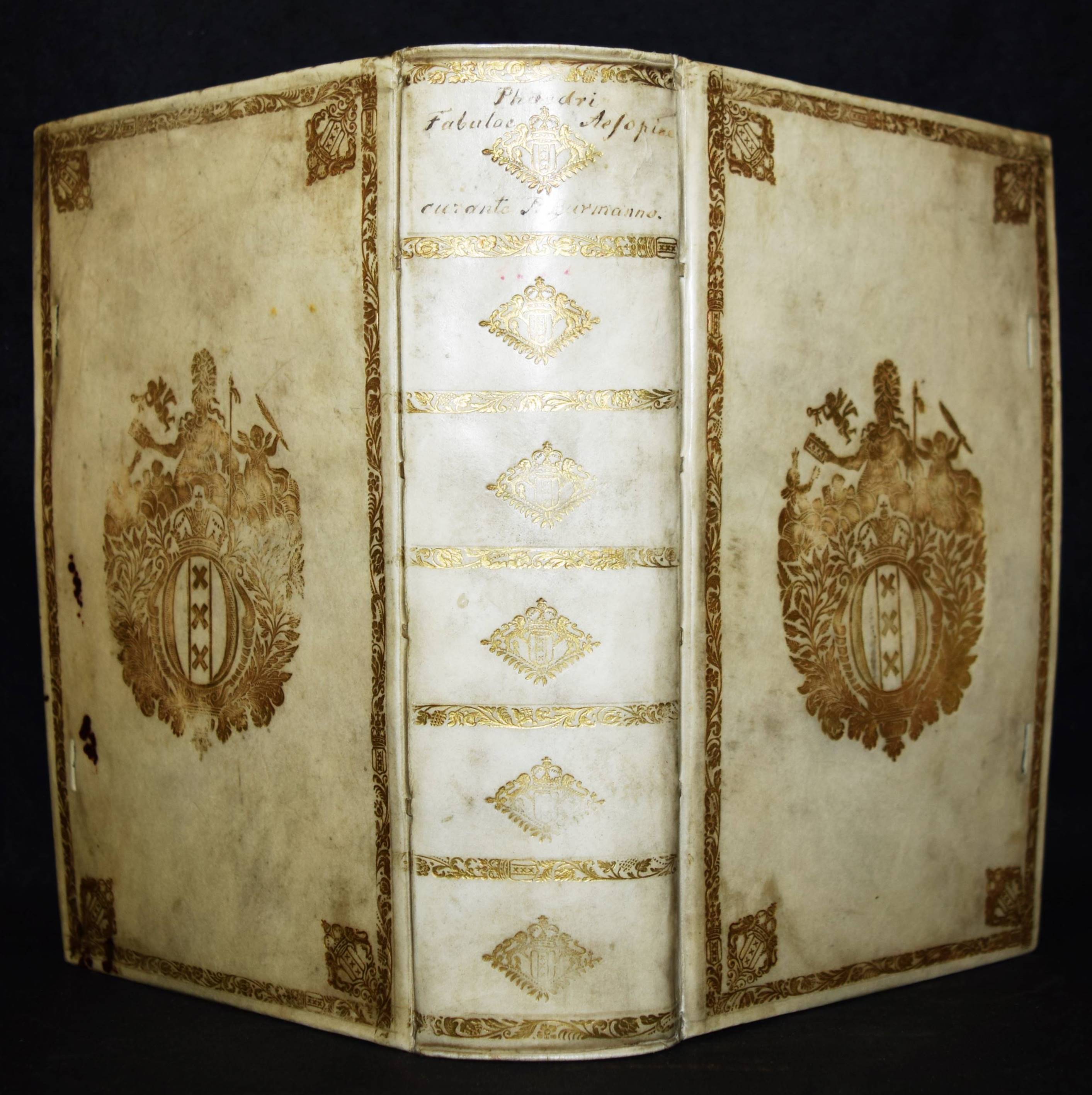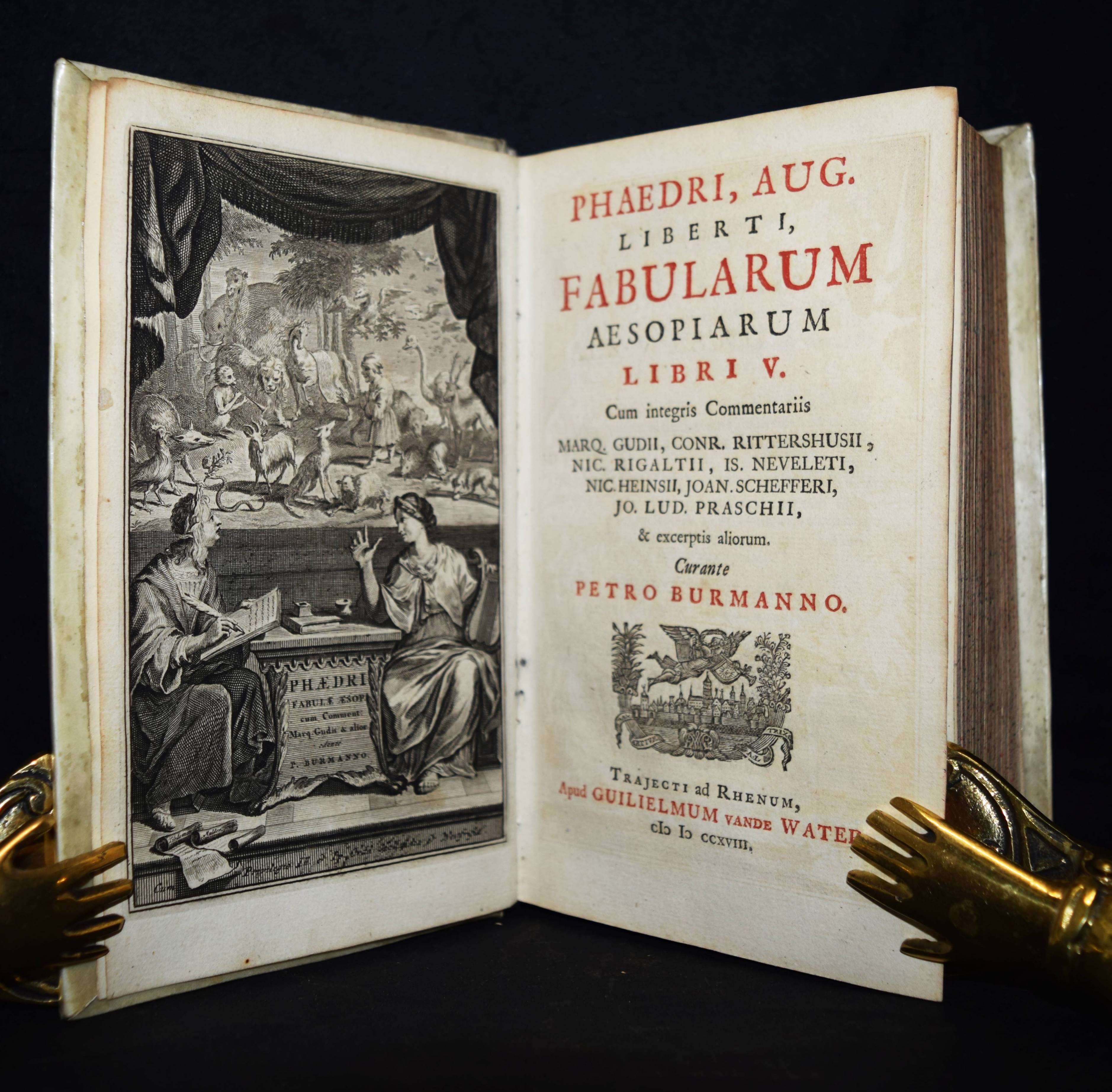 Phaedrus. Phaedri Augusti liberti fabularum Aesopiarum libri V. Cum integris commentariis. Curante Petro Burmanno. Utrecht, Wilhelm van de Water 1718. 8°. [30] Bl., 398, 258 S., [34] Bl. mit Titel in Rot u. Schwarz u. gestoch. Frontispiz. Prgt. d. Zt. mit Rücken- u. Deckelvergoldung u. goldgepr. Wappen-Supralibros. Ebert 16595. Graesse V, 253. – Frühe Ausgabe der zuerst 1698 erschienen Fabel-Sammlung mit dem Kommentar von Pieter Burmann. – Der niederl. Philologe, Bibliothekar und Politikwissenschaftler P. Burmann d. Ä. (1668-1741) war seit 1696 Professor für Geschichte an der Universität Utrecht. – „Phaedrus, erste Hälfte des 1. Jh.s n. Chr., (freigelassener Sklave) des Augustus, römischer Fabeldichter. Seine 5 Bücher „Fabulae Aesopiae“, von denen nur ein schmaler Auszug erhalten ist, waren die erste Sammlung von Fabeln in der lateinischen Literatur; den aus dem Griechischen überkommenen Themen fügte er Schwänke, Anekdoten und satirische Anspielungen auf seine eigene Zeit hinzu. Durch die dichterische Form (jambischer Senar) und die Schlichtheit der Sprache suchte er Volkstümlichkeit zu wahren; das Moralisieren treibt er schulmäßig“ (Tusculum Lexikon). – Sehr schönes sauberes Exemplar in einem prachtvollen Schulpreis-Einband.
