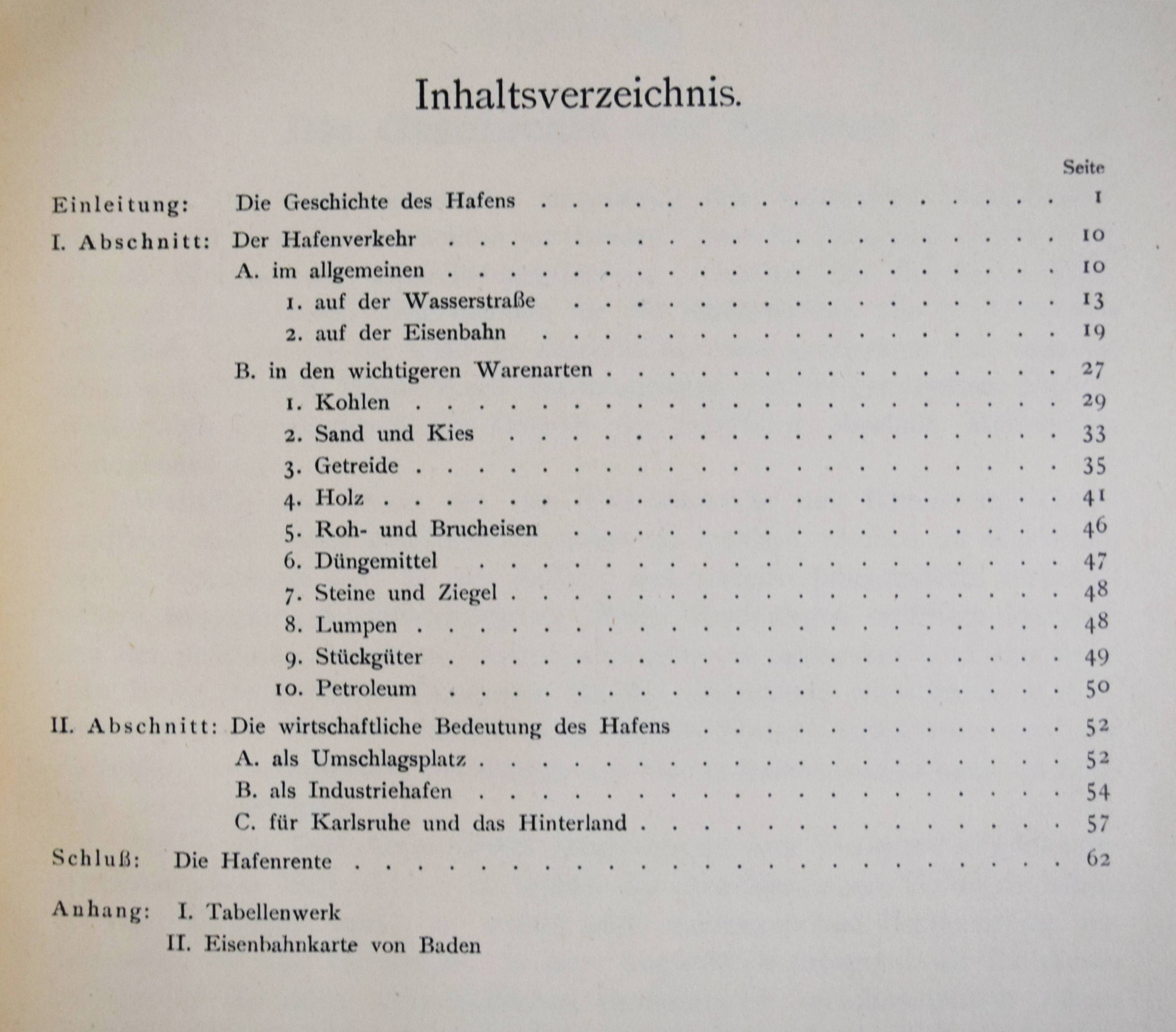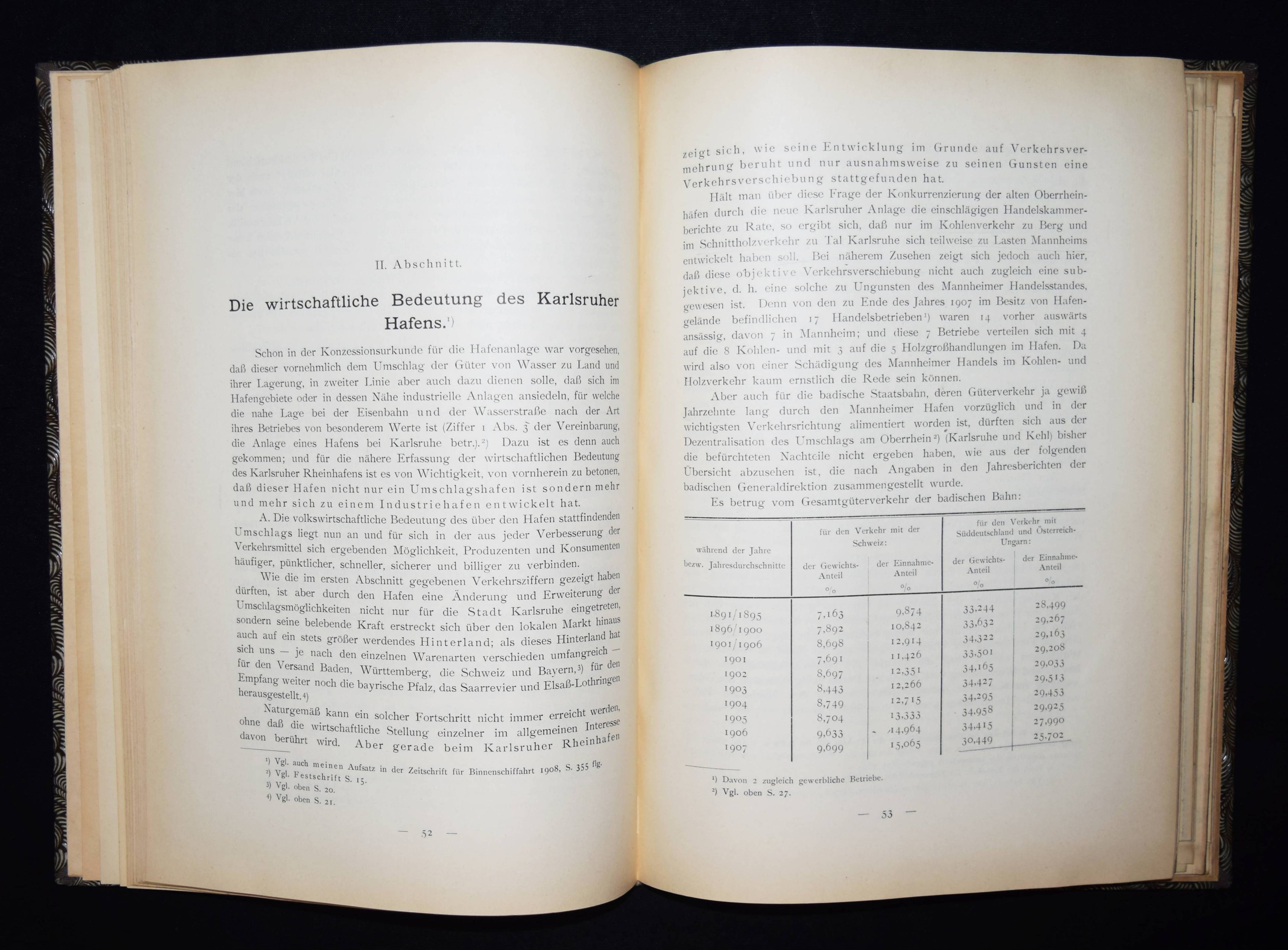 Barck, Lothar. Der Karlsruher Rheinhafen. Eine verkehrsstatistische Studie. München, Reinhardt 1909. Gr.-8°. 65, (1) S., 10 gefalt. Tabellen. OHln. mit goldgepr. Rückentitel. (Statistische und nationalökonomische Abhandlungen, Band 5). Erste Ausgabe, selten. – St.a.T., sehr gutes sauberes Exemplar.