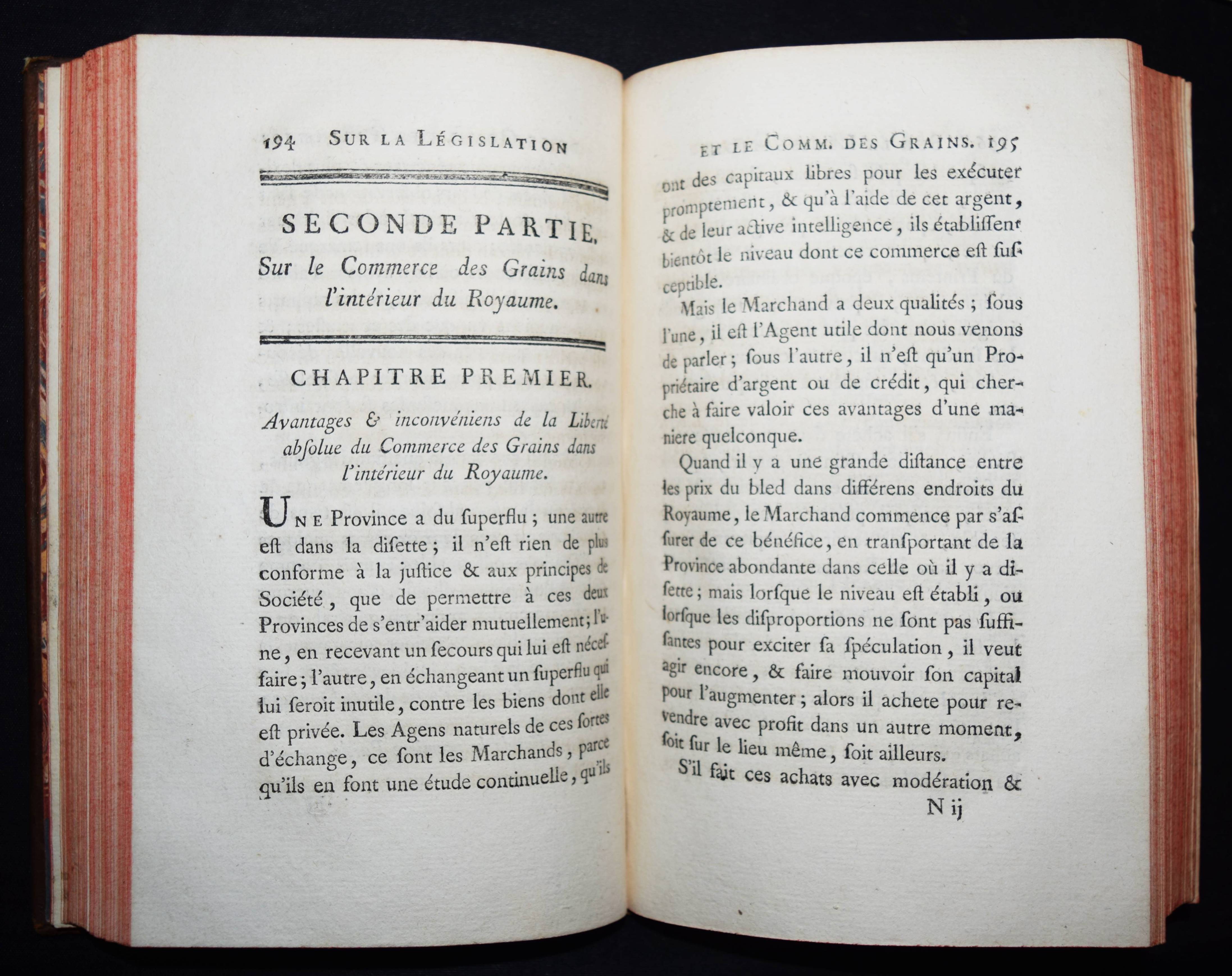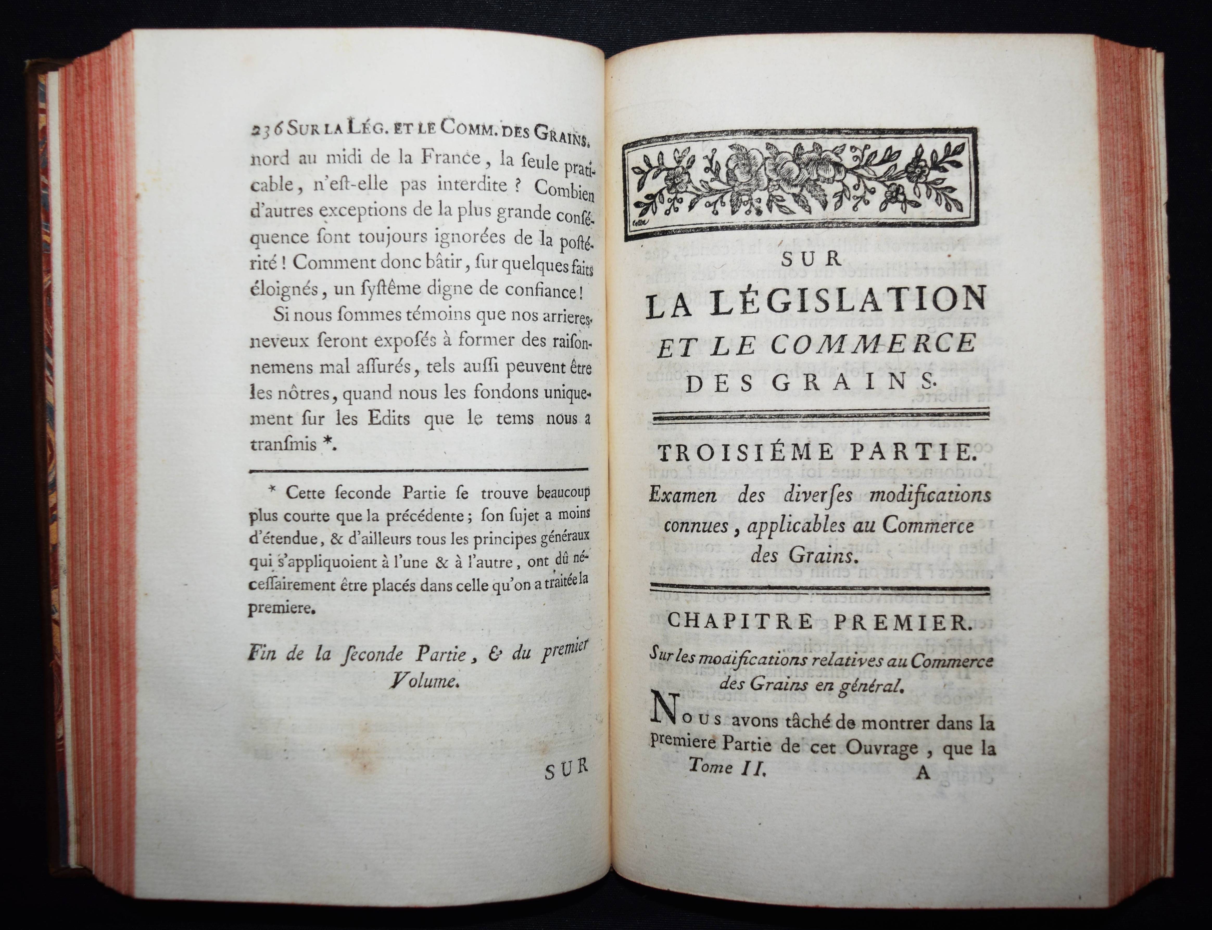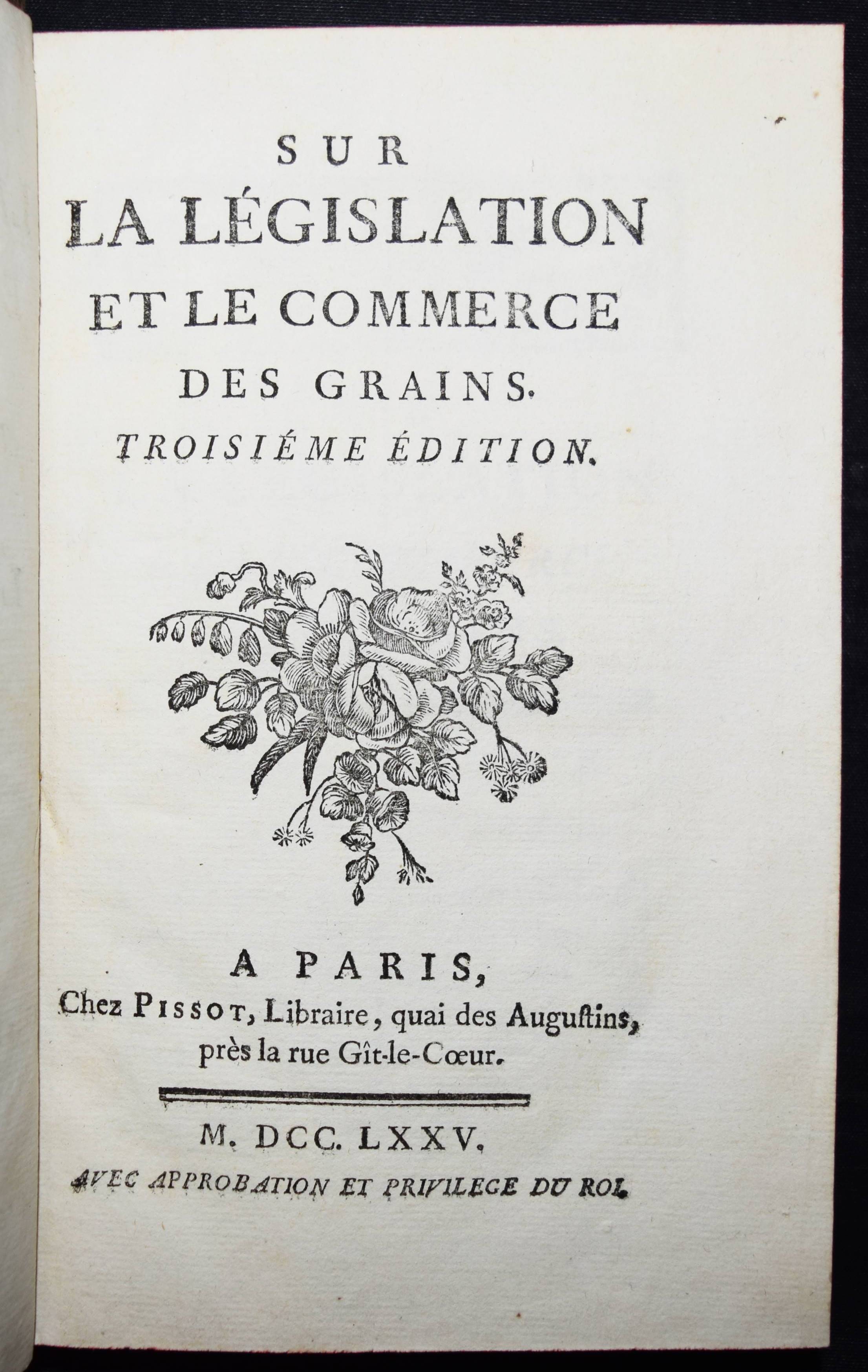 (Necker, Jacques). Sur la législation et le commerce des grains. Troisième édition. 3 Teile in 1 Band. Paris, Pissot 1775. 8°. [2] Bl., 236 S.; 184 S., [1] Bl. Kalbslederband der Zeit mit goldgepr. Rückenschild, reicher floraler Rückenvergoldung u. Kantenvergoldung. Goldsmiths 11267. Higgs 6260. Kress 7144. – Dritte Auflage im Jahr der Erstausgabe. – Eines der Hauptwerke Neckers, gegen die Physiokraten gerichtet. – J. Necker (1732-1804), Genfer Bankier und Finanzminister unter Ludwig XVI., war „vom 29. Juni 1777 bis zum 19. Mai 1781 Generaldirektor der Finanzen, directeur général des finances. Er versuchte die Finanzen wieder in geregelte Bahnen zu lenken, indem er die taille (Kopfsteuer) gleichmäßiger verteilte, den vingtième d’industrie abschaffte und monts de piété (gemeinnützige Pfandleihen) einrichtete. Seine wichtigste finanzielle Maßnahme war jedoch der Versuch, die französischen Schulden sowie die Einführung von Jahresrenten unter Bürgschaft durch den Staat zu finanzieren“ (Wikipedia). – Gestoch. Exlibris (″Beuniel Lagardie Ex-Officier d’Adm. de la Marine“), stellenweise etwas gebräunt, sehr schönes, prachvoll gebundenes Exemplar.