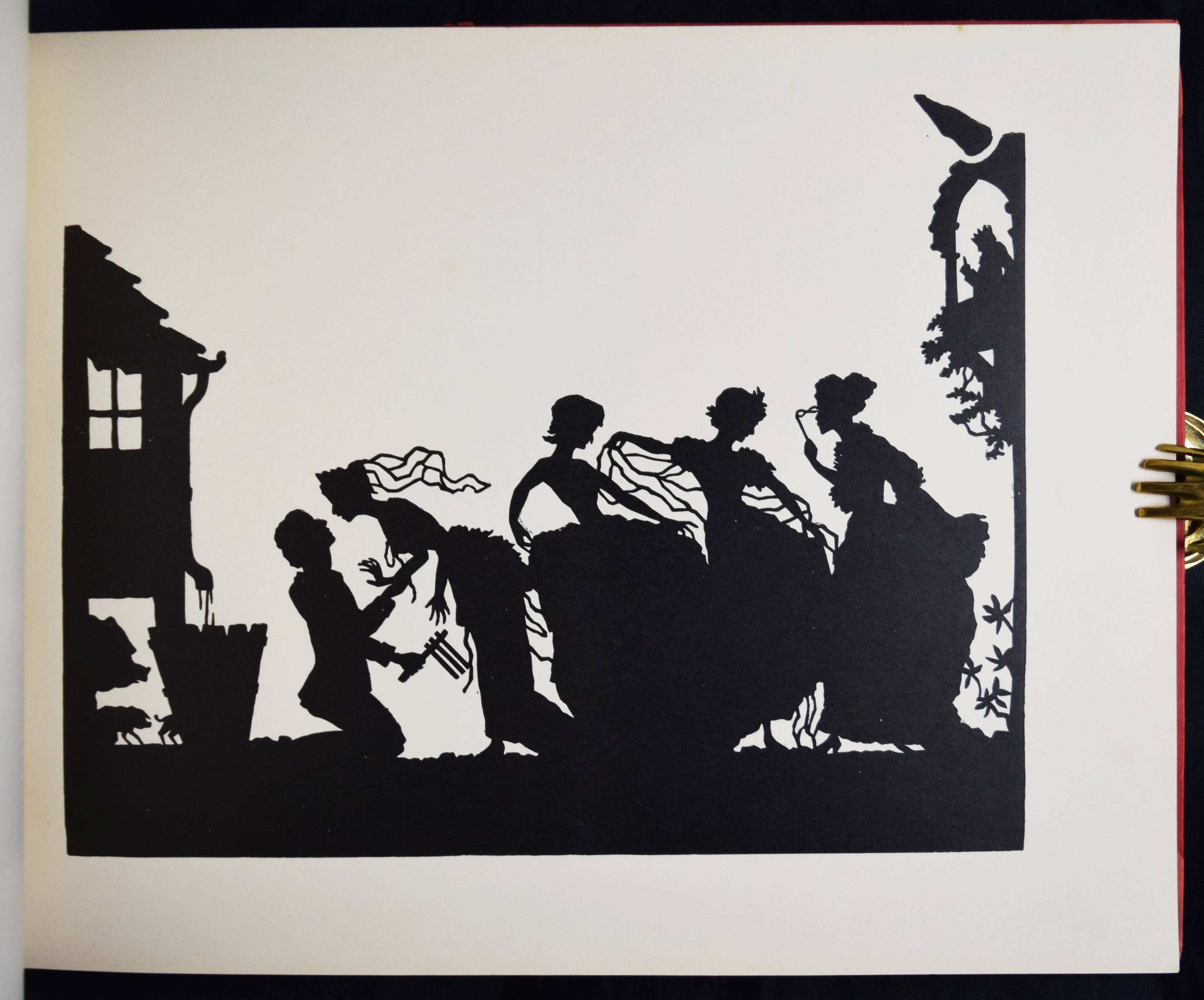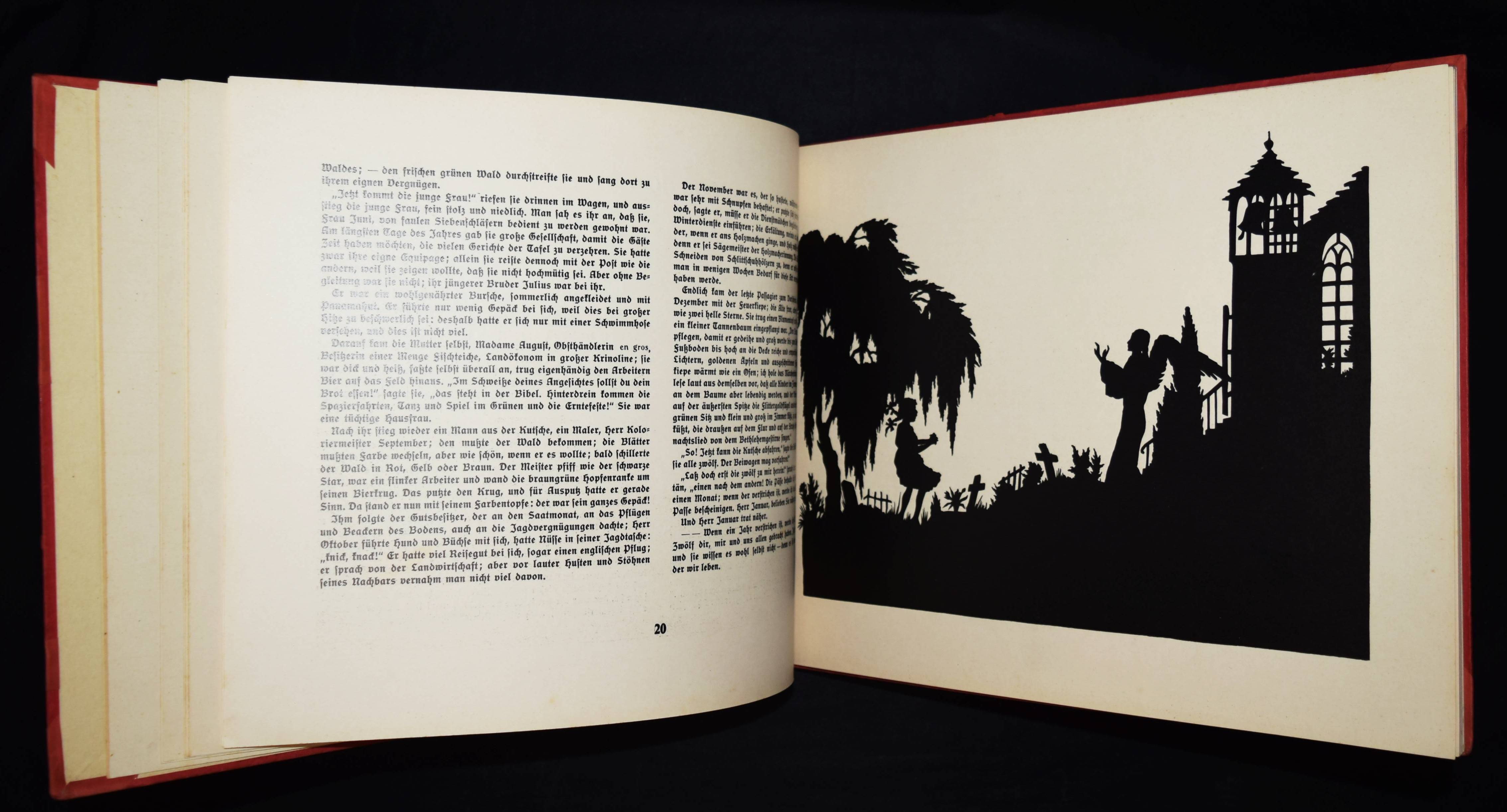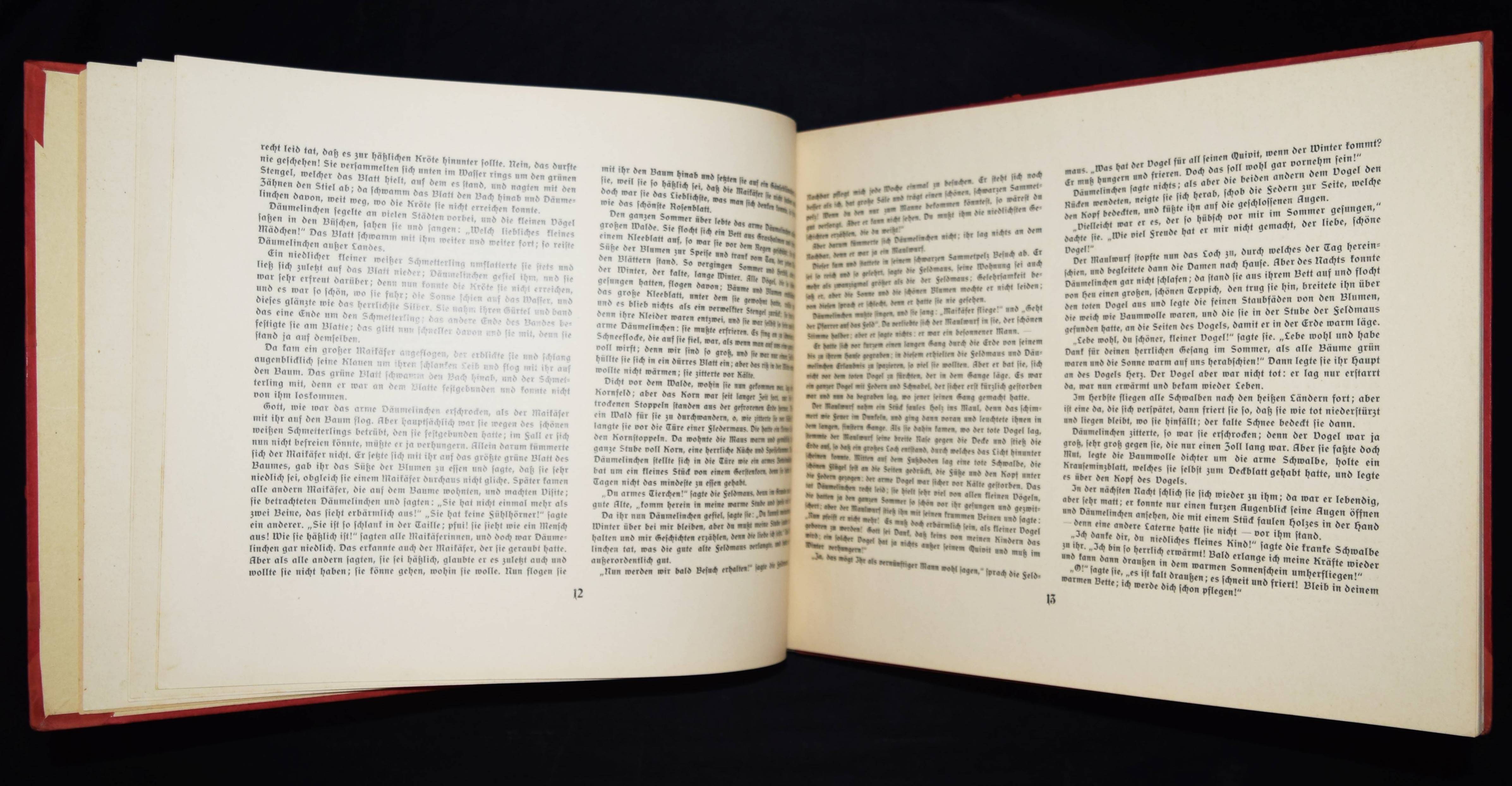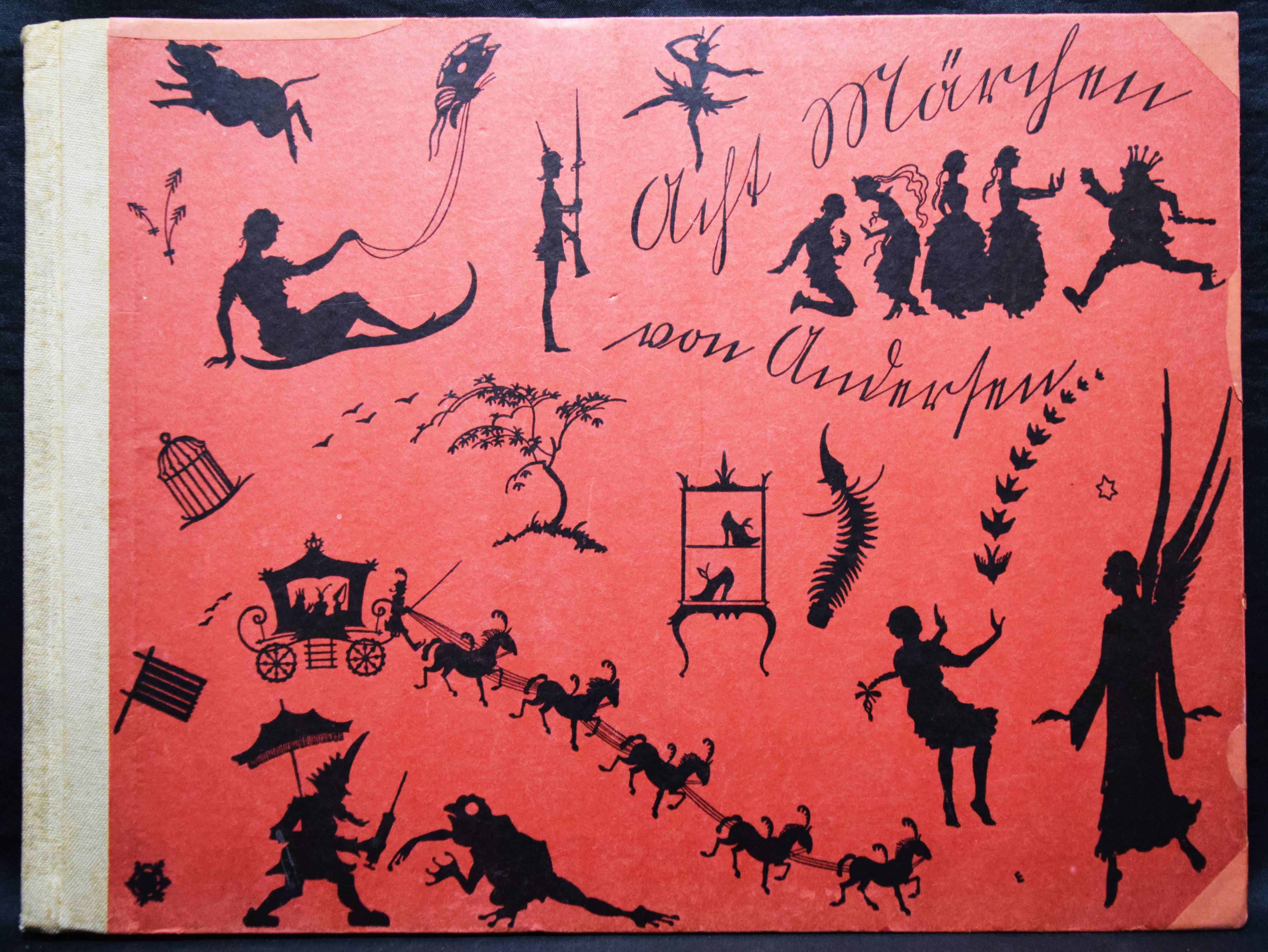 Andersen, Hans Christian. Märchen. In Scherenbildern von Käthe Reine(-Gehlsdorf). Mönchen-Gladbach, Volksverein-Verlag (1926). Quer-4°. 62 S. mit Scherenschnitt-Titel u. 8 Scherenschnitt-Tafeln. Illustr. OHLn. Weber, Schwarze Kunst im Buch S. 53. – Einzige Ausgabe dieses seltenen, eindrucksvoll illustrierten Märchenbilderbuches. Die Scherenschnitte sind im Originalformat wiedergegeben. – Rücken etwas fleckig, gutes sauberes Exemplar.