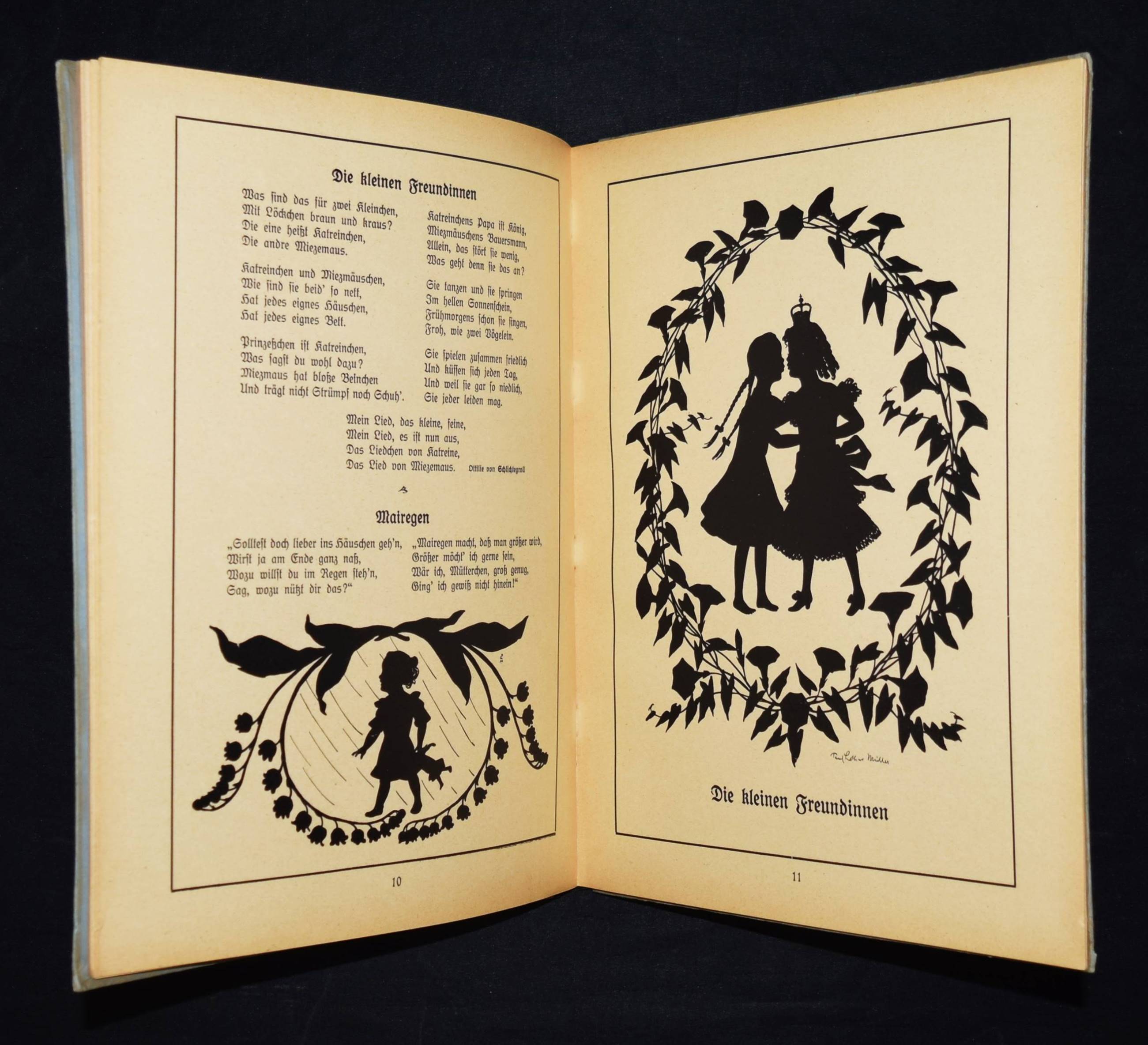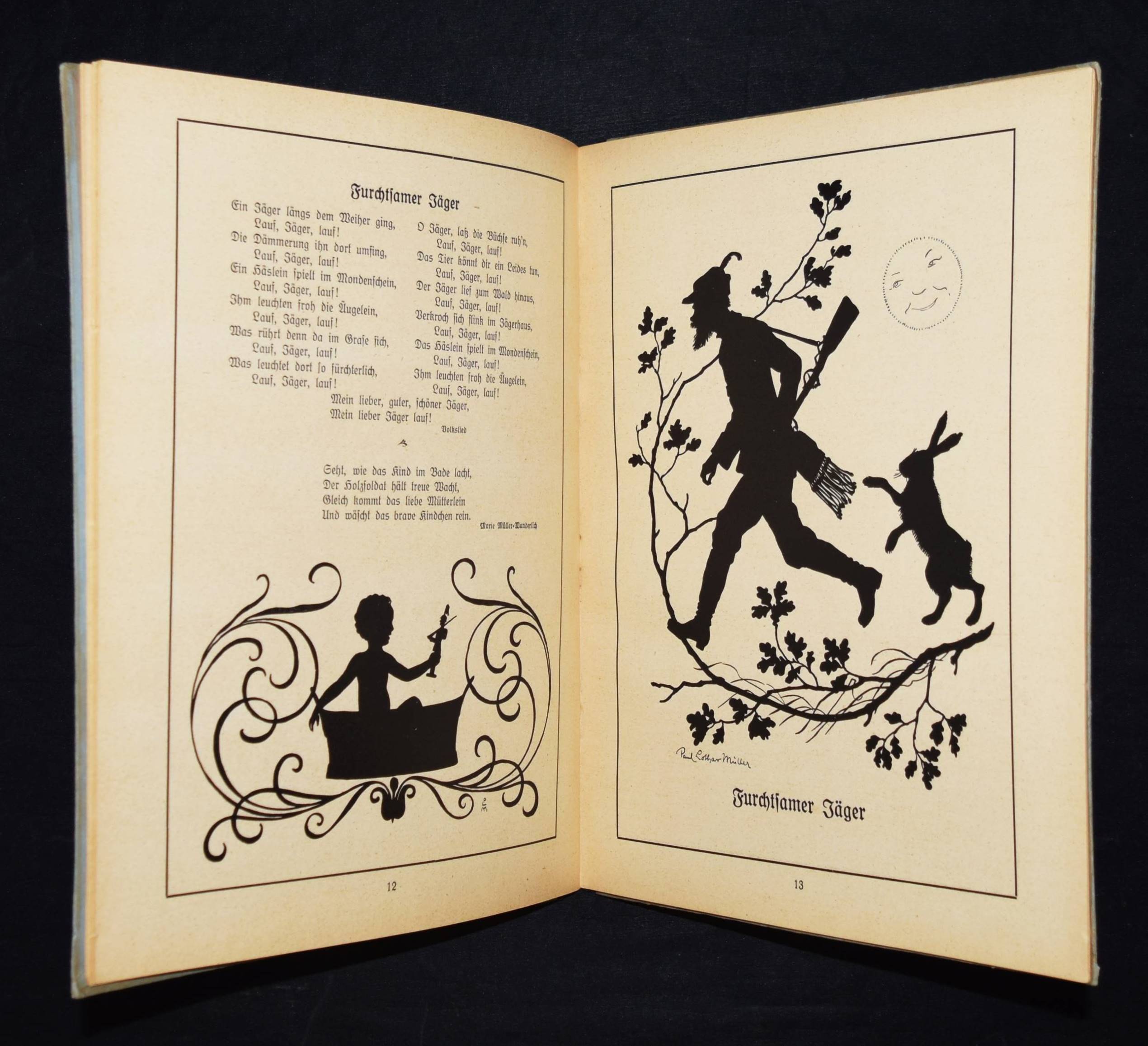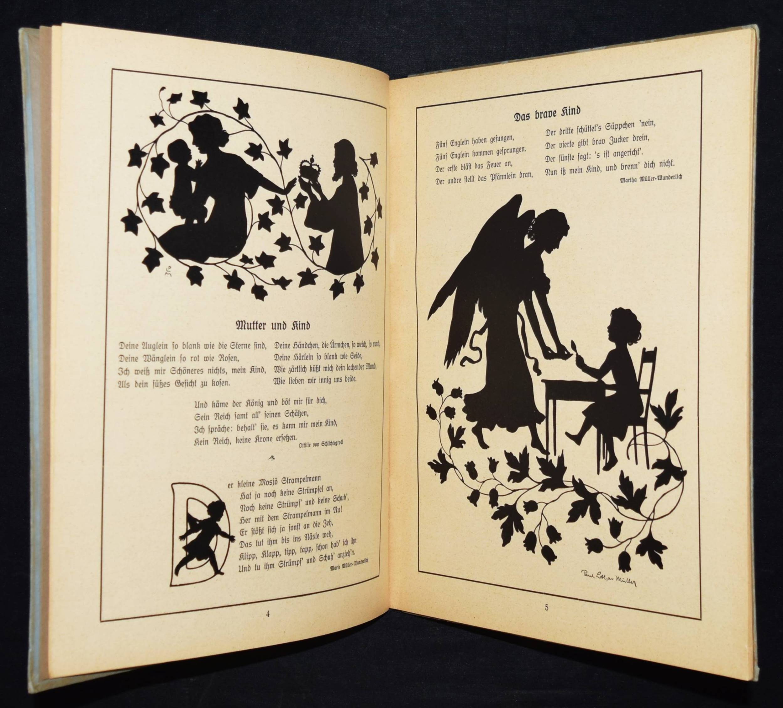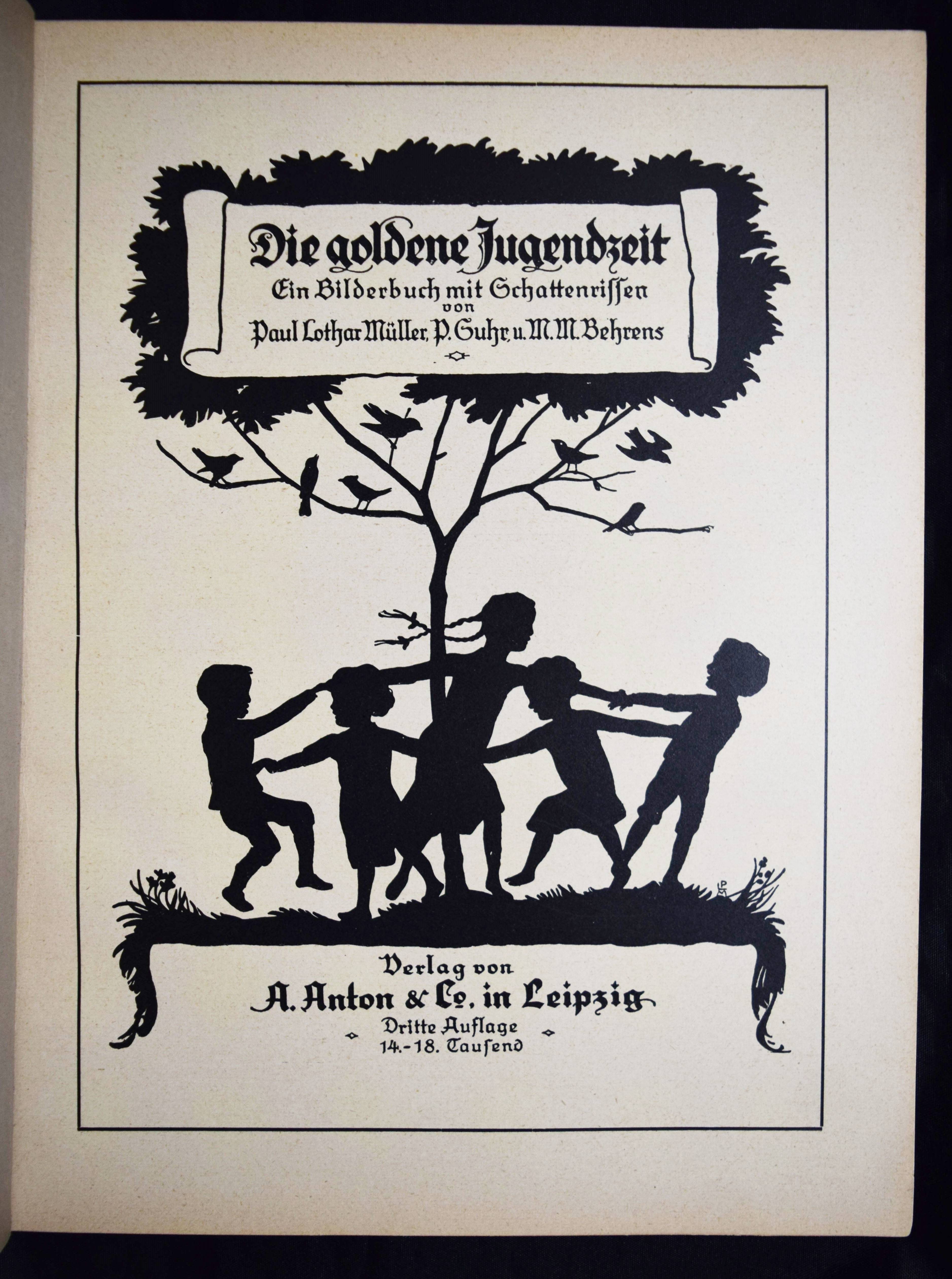 Müller, Paul Lothar, P(aul) Suhr u. M(arie) M(argarete) Behrens. Die Goldene Jugendzeit. Ein Bilderbuch mit Schattenrissen. 3. Aufl. Berlin u. Leipzig, A. Anton & Co. o.J. (1925). 4°. 32 S. mit zahlr. Illustrationen nach Scherenschnitten. Illustr. OHln. DBV 8, 1218. Vgl. Ries 733, 2. Weber, Schwarze Kunst S. 44 (mit Abb.). (Beide EA von 1911). – P. L. Müller, Maler, Illustrator und Silhouettenkünstler wurde am 9. April 1869 in Berlin geboren. Er besuchte dort von 1886 bis 1889 die Kunstschule und die Akademie. – Papierbedingt leicht gebräunt, gutes Exemplar.