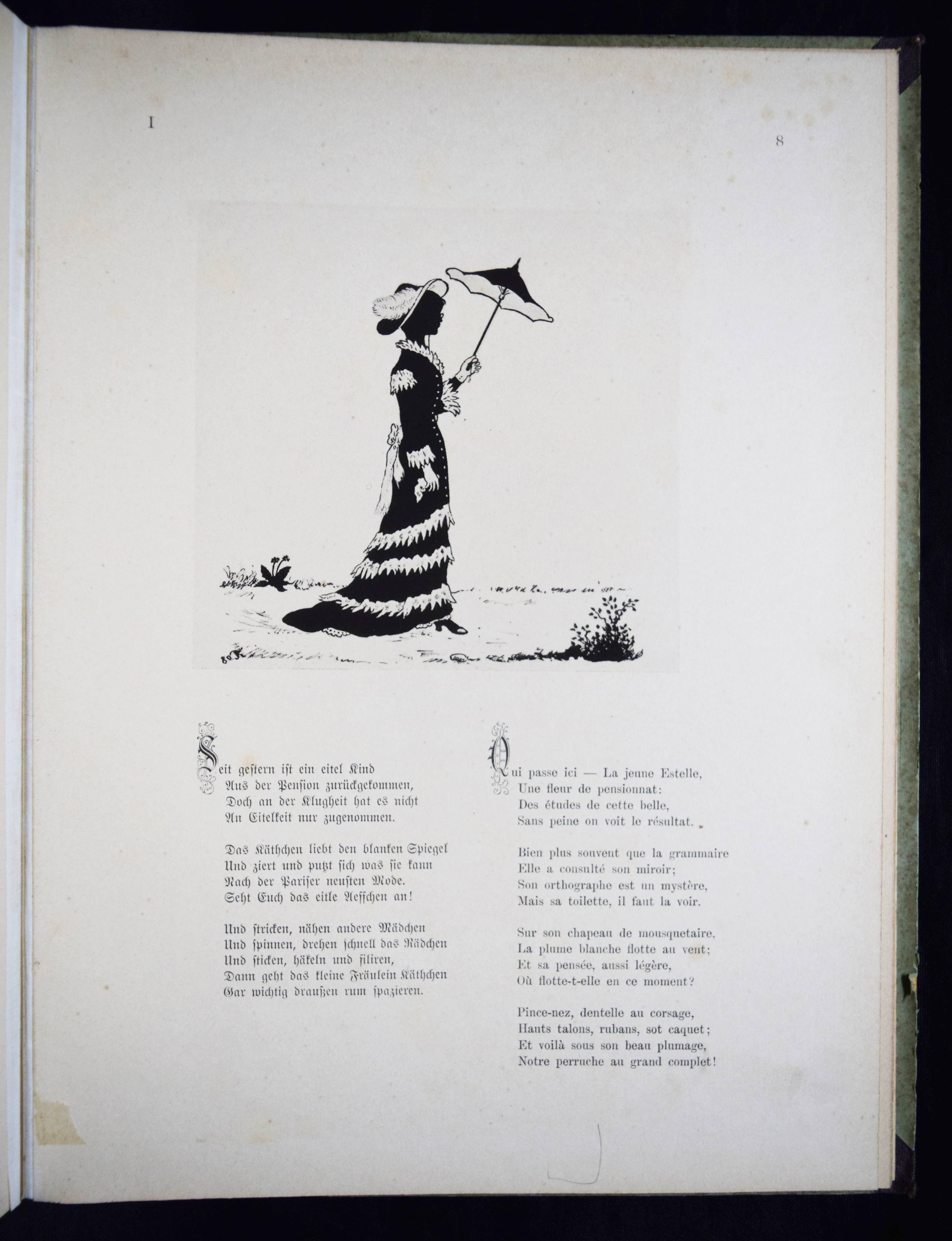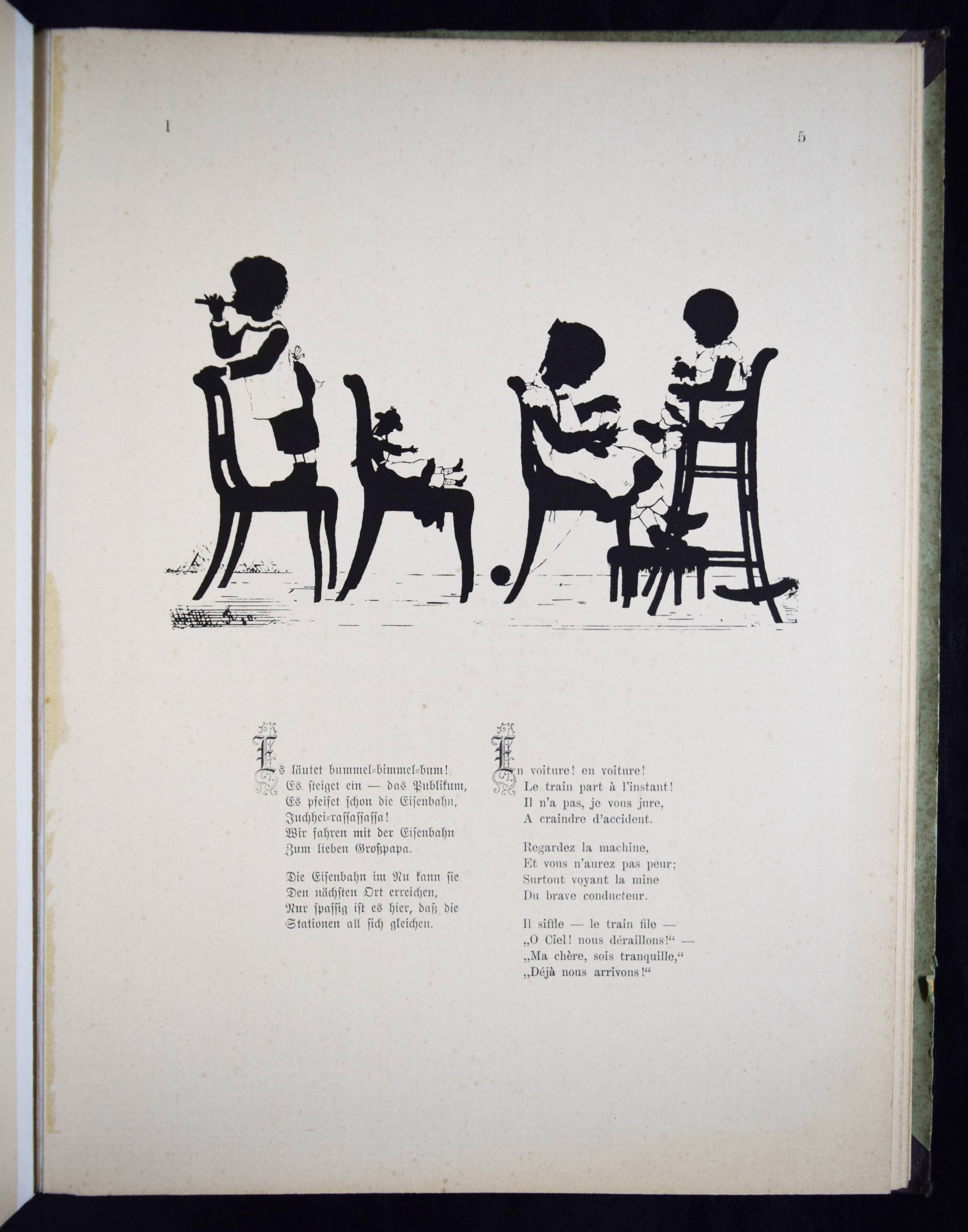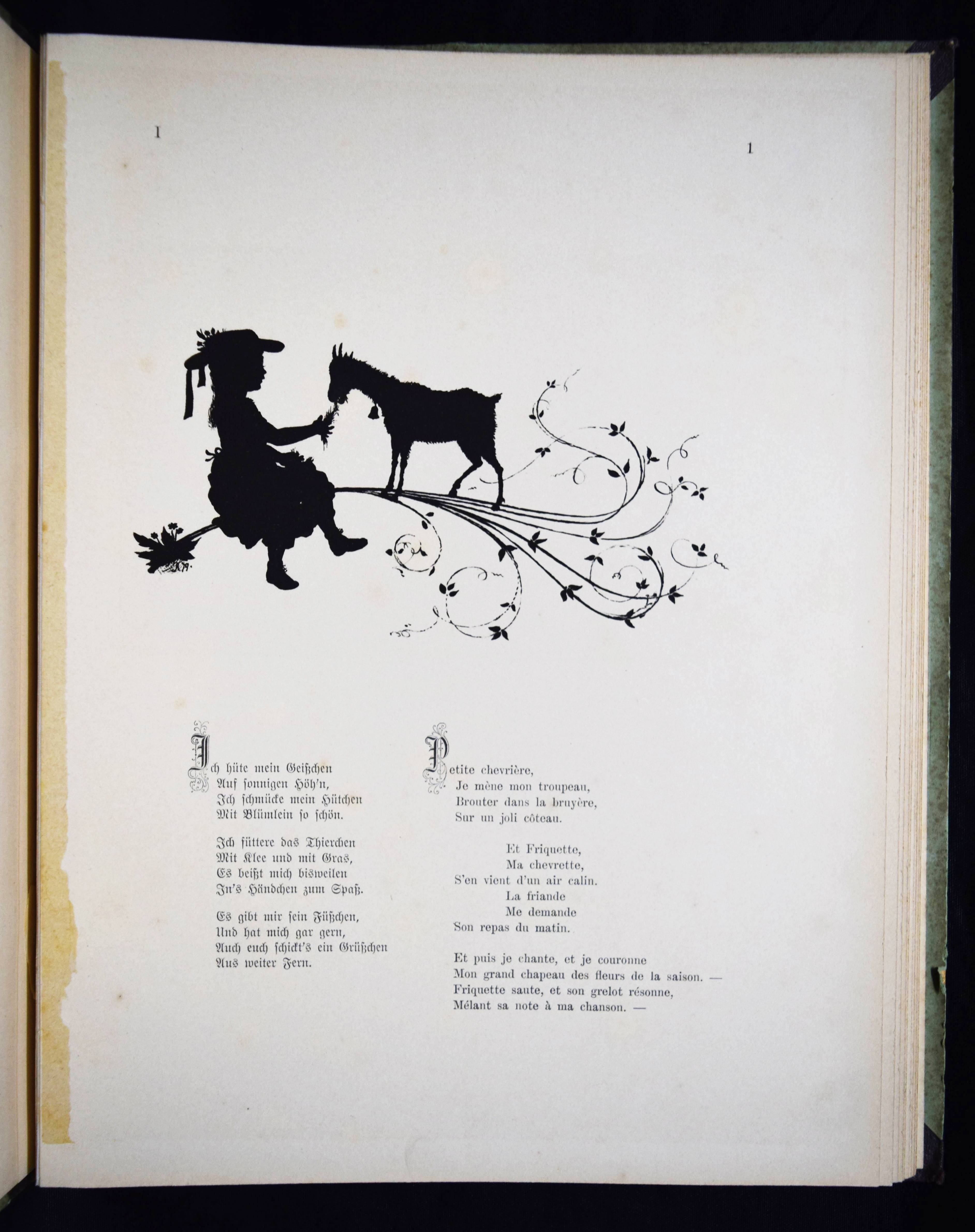 Regnier, Ferdinand. Die kleine Welt. Original-Zeichnungen und Gedichte. I. Band (von 3). Trier, Verlag der Paulinus-Druckerei o. J. (1883). 4°. Titel u. 10 Tafeln mit 9 Scherenschnitt-Illustrationen u. 1 Illustration in Lichtdruck. Illustr. OHln. Ries 796, 1. u. S. 201 (Anm. zu Band II u. III). Nicht bei Weber, Schwarze Kunst im Buch. – Erste Ausgabe, sehr selten. – Die Bände II und III enthalten keine Scherenschnitt-Illustrationen sondern „helle Lichtdrucke“. – F. Regnier (biogr. Daten unbekannt) lebte vermutlich in Nürnberg. – Deckel etwas braunfleckig u. berieben, papierbedingt etwas gebräunt, gutes sauberes Exemplar.