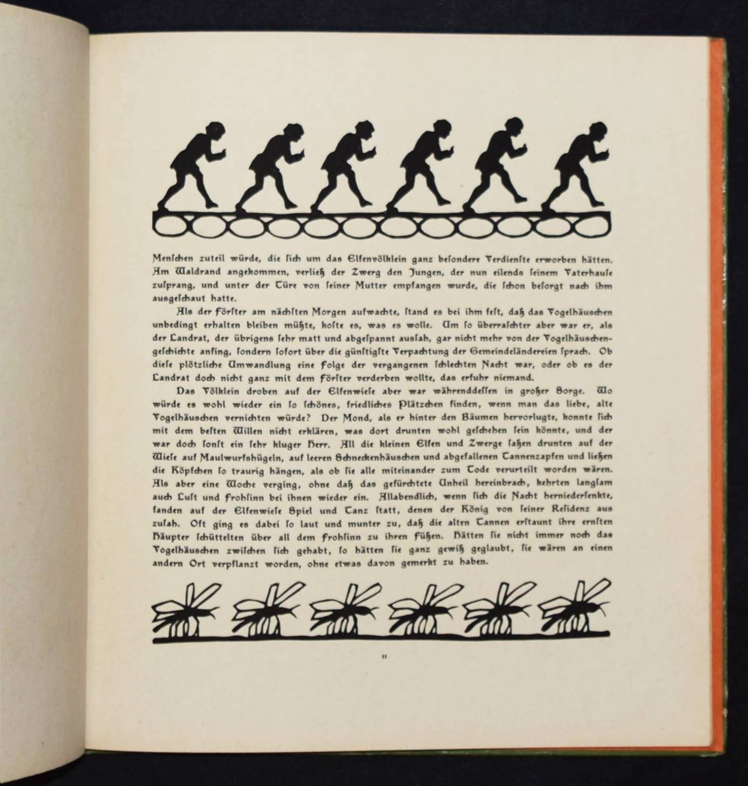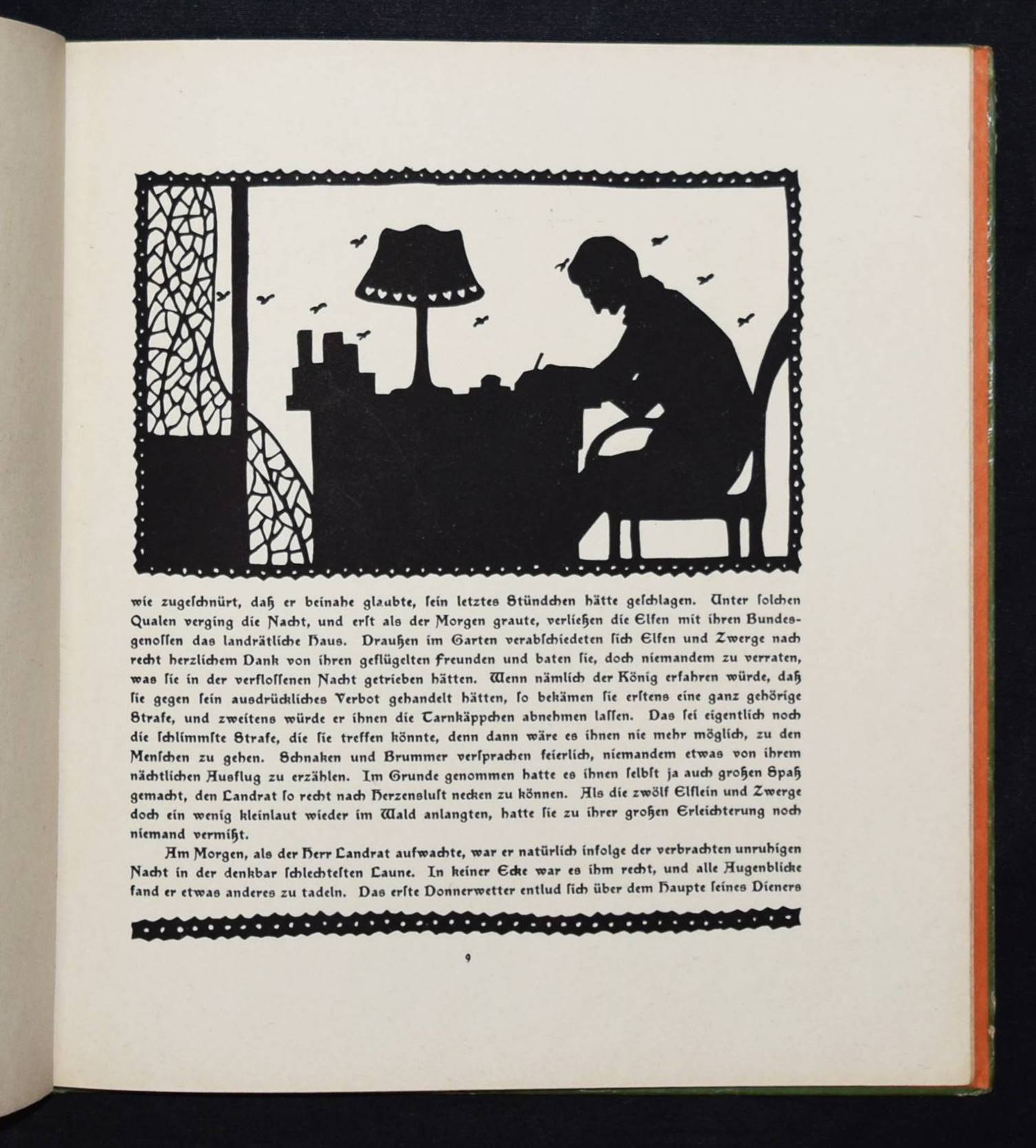 Kempf, Rose. Das Vogelhäuschen. Ein neues Märchen für Kinder. Mit Scherenschnitten von Else Bückert. Stuttgart, Loewes Verlag Ferdinand Carl o. J. (1919). 4°. 16 S. mit Illustrationen nach Scherenschnitten. Farbig illustr. OPbd. Klotz 3330/1. Weber, Schwarze Kunst im Buch S. 22. – Erste Ausgabe. – Rücken alt mit Lederstreifen überklebt, Deckel angestaunt und etwas berieben, gutes sauberes Exemplar.