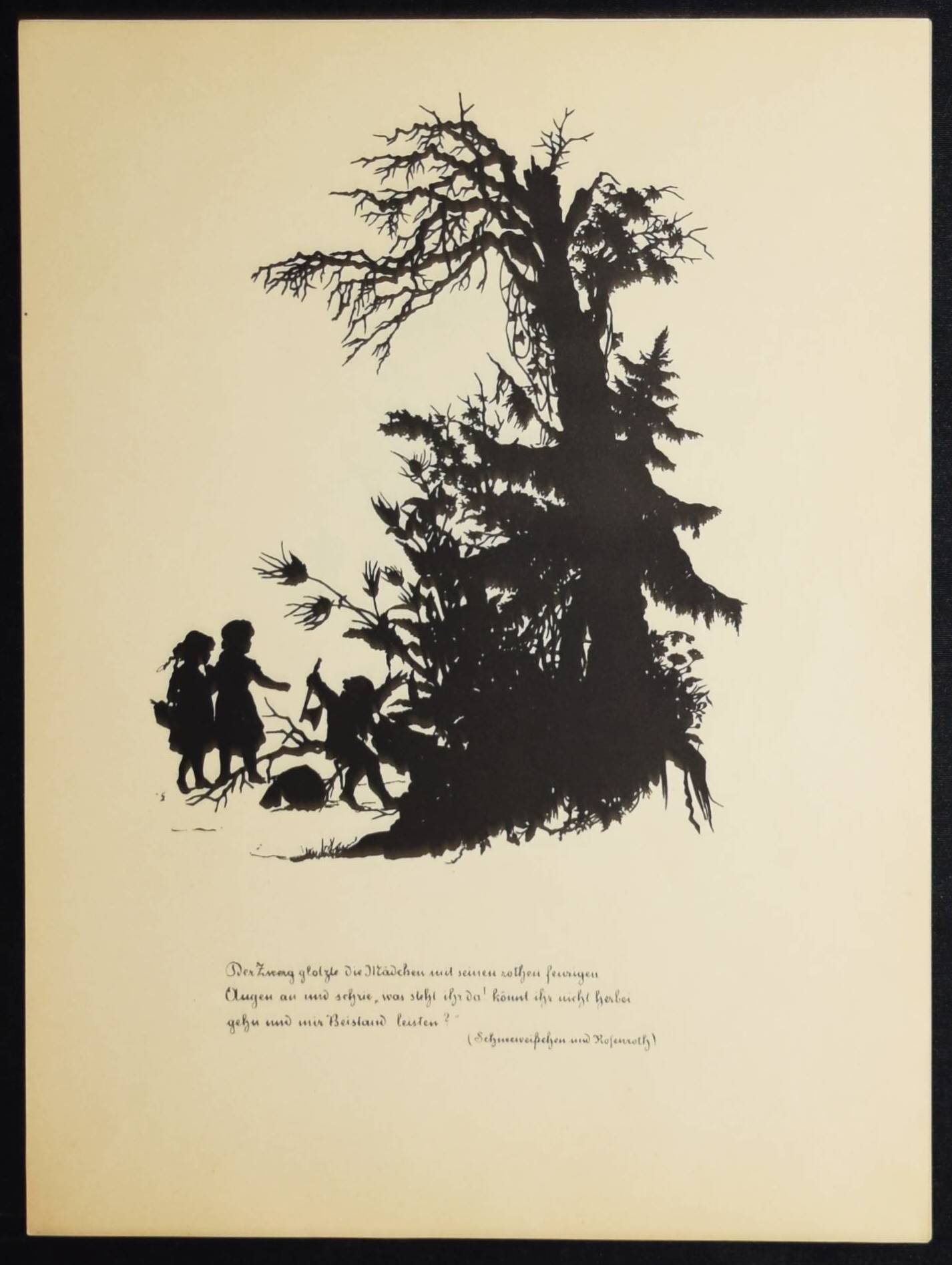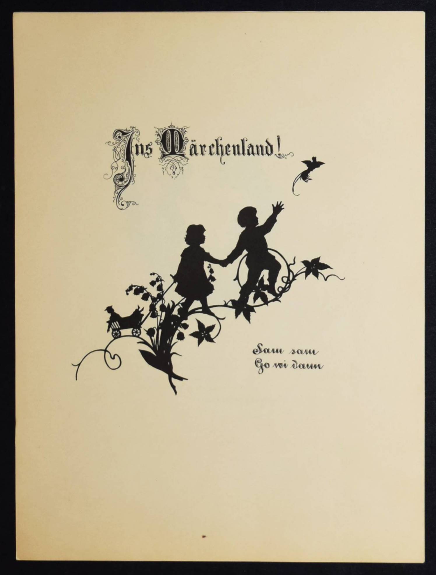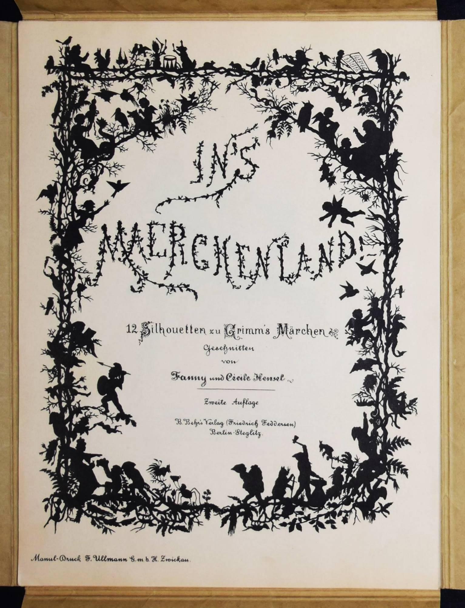 Grimm, (Jakob u. Wilhelm). Ins Märchenland. 12 Scherenschnitte zu Grimm’s Märchen von Fanny und Cecile Hensel. 2. Aufl. Berlin, Leipzig, B. Behrs 1918. 4°. [12] Bl. mit illustr. Titel u. Scherenschnitt-Illustrationen in Manul-Druck. Illustr. Orig.-Flügelmappe. Vgl. Ries 587, 1 u. Rümann 654 (beide erste Ausgabe von 1879). Nicht bei Weber, Schwarze Kunst im Buch. – Die erste Ausgabe erschien bereits 1879. – Fanny Hensel (geb. Mendelssohn-Bartholdy, 1805-1847), diletierende Künstlerin, war die Schwester des Komponisten Felix Mendelssohn-Bartholdy. Cecile Mendelssohn-Bartholdy (geb. Jeanrenaud) hier irrig als C. Hensel bezeichnet, war die Schwägerin von Fanny Hensel. – Sehr schönes sauberes Exemplar.
