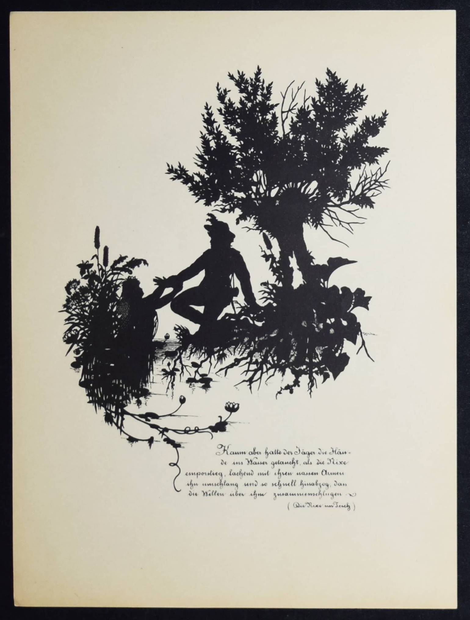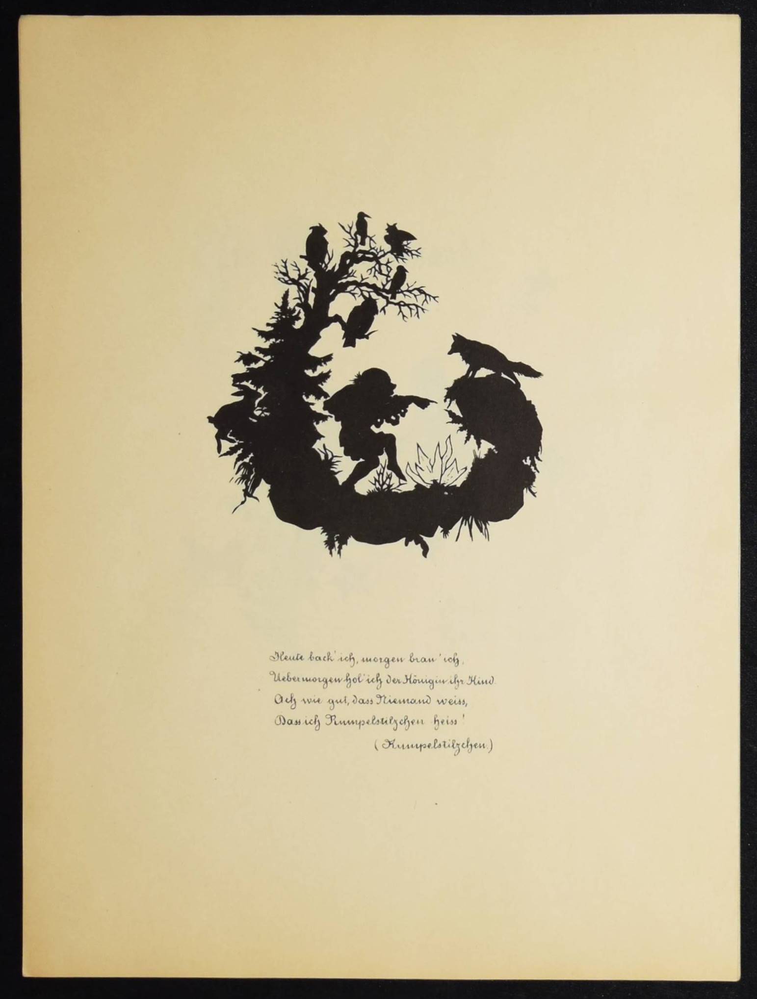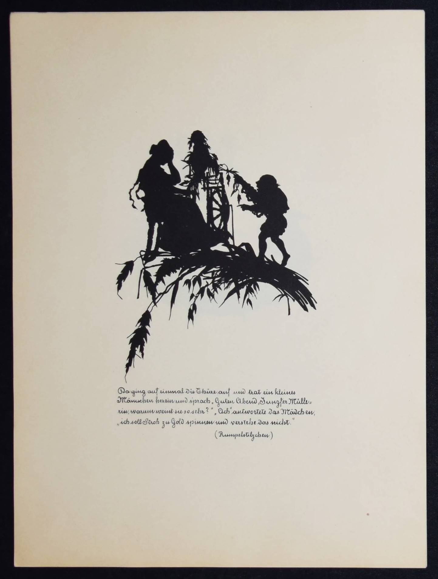 Grimm, (Jakob u. Wilhelm). Ins Märchenland. 12 Scherenschnitte zu Grimm’s Märchen von Fanny und Cecile Hensel. 2. Aufl. Berlin, Leipzig, B. Behrs 1918. 4°. [12] Bl. mit illustr. Titel u. Scherenschnitt-Illustrationen in Manul-Druck. Illustr. Orig.-Flügelmappe. Vgl. Ries 587, 1 u. Rümann 654 (beide erste Ausgabe von 1879). Nicht bei Weber, Schwarze Kunst im Buch. – Die erste Ausgabe erschien bereits 1879. – Fanny Hensel (geb. Mendelssohn-Bartholdy, 1805-1847), diletierende Künstlerin, war die Schwester des Komponisten Felix Mendelssohn-Bartholdy. Cecile Mendelssohn-Bartholdy (geb. Jeanrenaud) hier irrig als C. Hensel bezeichnet, war die Schwägerin von Fanny Hensel. – Sehr schönes sauberes Exemplar.