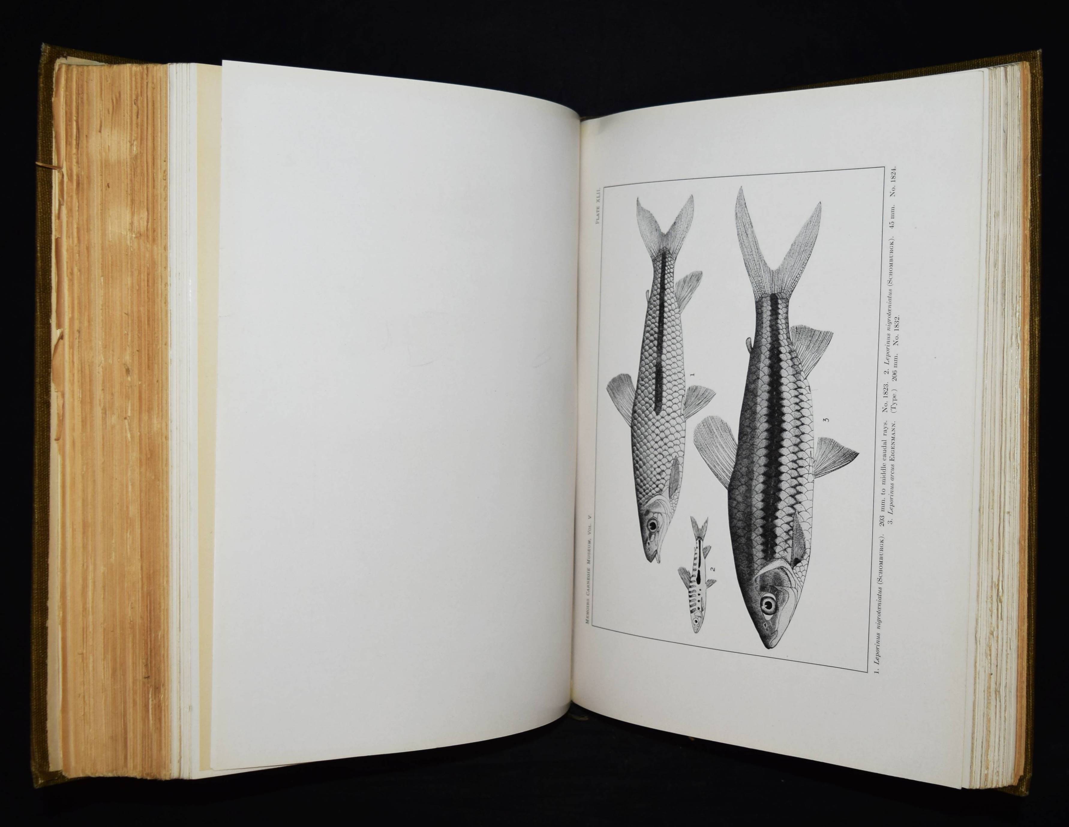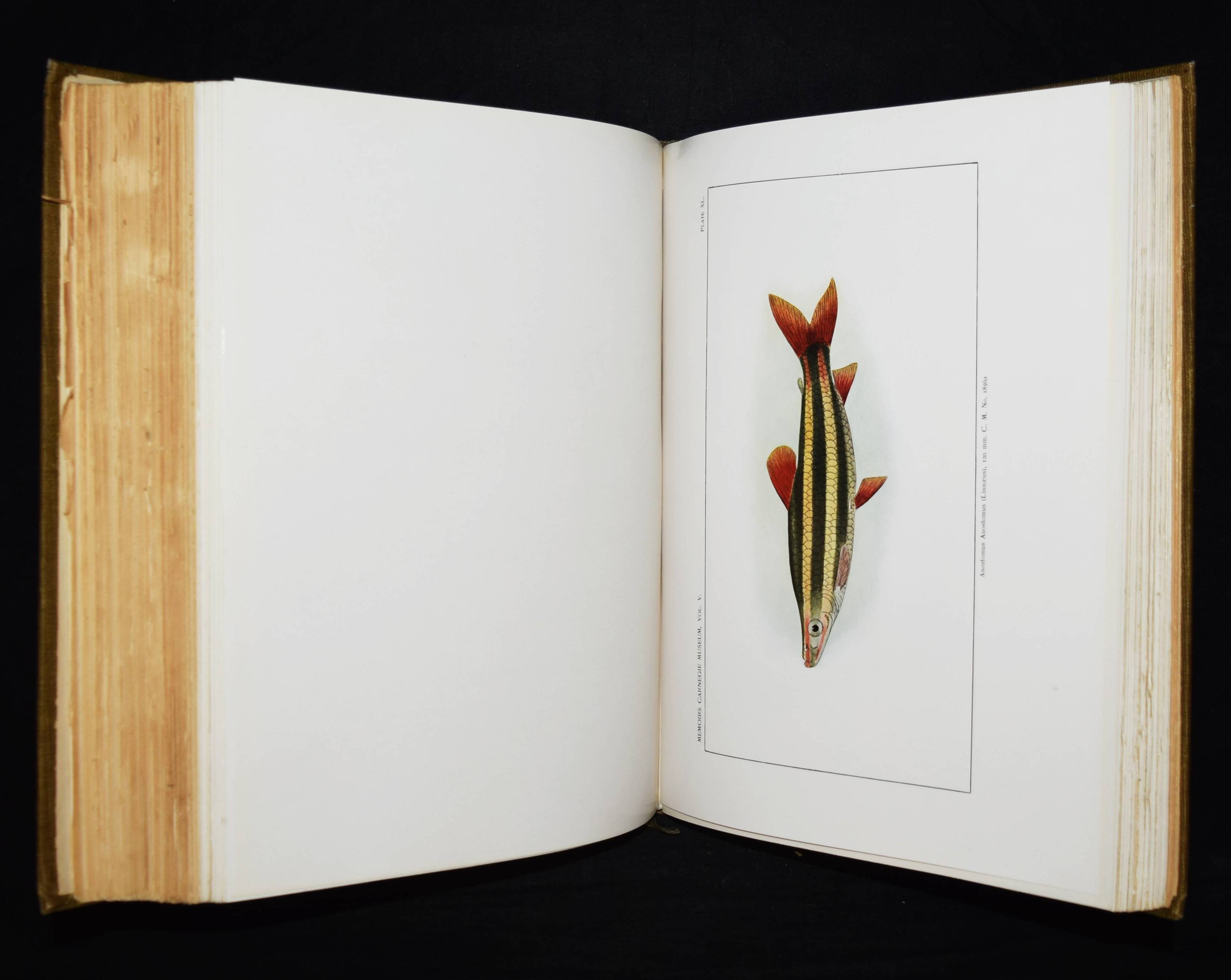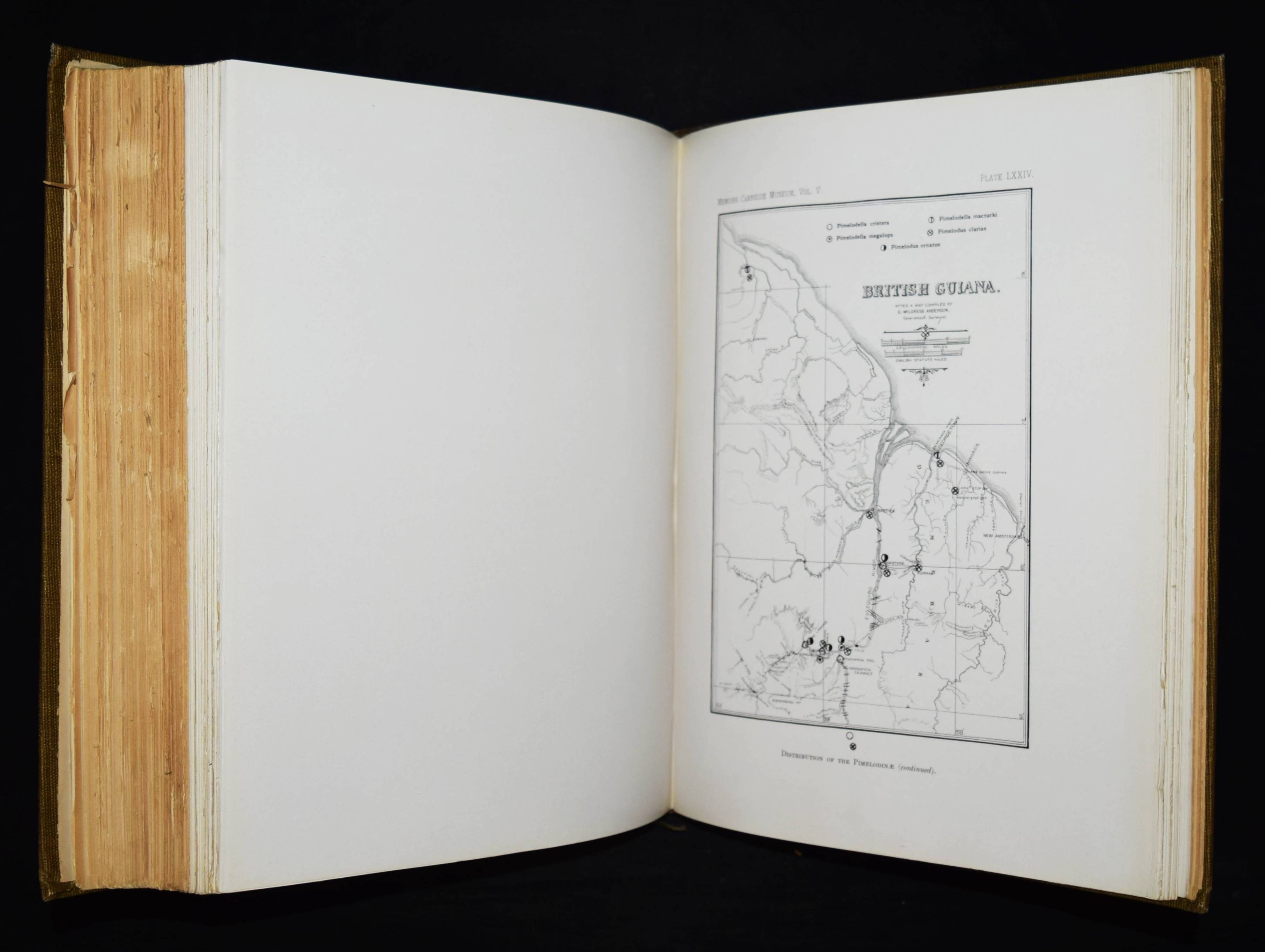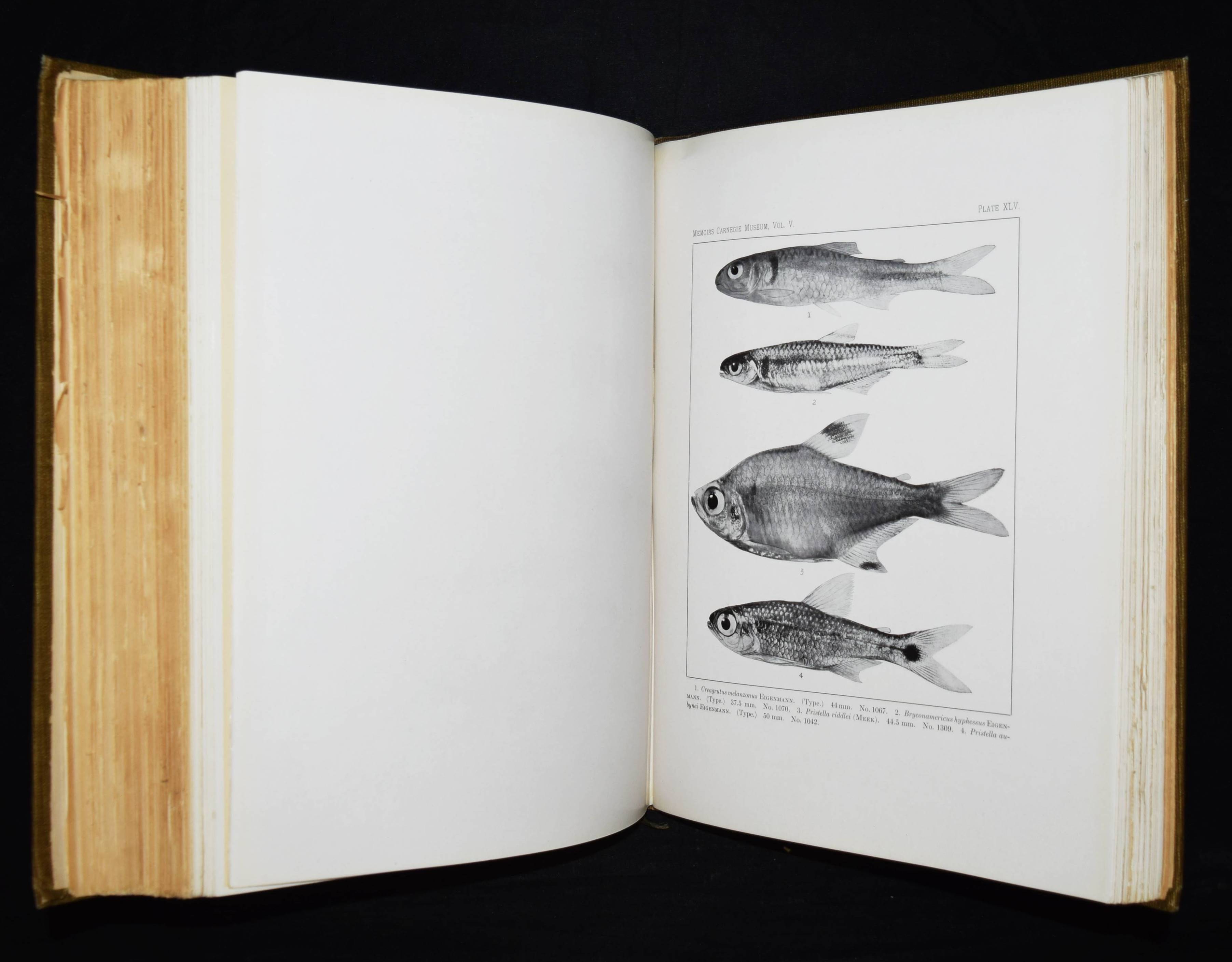 Holland, W(illiam) J(acob, Ed.). Memoires of the Carnegie Museum. Vol(ume) V. (C(arl) H(enry) Eigenmann. The freshwater fishes of British Guiana, including a study of the ecological grouping of species and the relation of the fauna of the plateau to that of the lowlands). Pittsburgh, Carnegie Institute 1912. Folio (34 x 28 cm.). [1] w. Bl., XXII, 578 S. mit Frontispiz, zahlr. Abb. u. 103 Tafeln. OLn. mit goldgepr. Rückentitel. Dean, Fishes I, 595. – Erste und einzige Ausgabe, selten. – Hauptwerk des bedeutenden US-amerik. Ichthyologen C. H. Eigenmann (1863-1927), „der zusammen mit seiner Frau Rosa Smith Eigenmann mehrere hundert Fischarten, vorrangig aus Nord- und Südamerika erstmals beschrieb, von denen auch einige nach ihm benannt wurden. … Nachdem Eigenmann in den Jahren 1906/07 Gastdozent an der Albert-Ludwigs-Universität Freiburg gewesen war, wurde er 1908 Dekan der Hochschule für Aufbaustudien in Indiana. Im selben Jahr sicherte er sich vom Carnegie Museums of Pittsburgh die Unterstützung einer Forschungsreise nach Südamerika und brach im September 1908 zur Carnegie British Guiana Expedition auf. Er kehrte mit 25.000 Exemplaren zurück, die später die Basis für 128 neue Spezies sowie 28 neue Gattungen bildeten. Er unternahm weitere Reisen nach Kolumbien (1912) und in die Anden (1918). … Später schrieb Carl Eigenmann hauptsächlich Berichte über seine Expeditionen und unterstützte jüngere Kollegen bei der Planung und Durchführung eigener Forschungsreisen. 1917 wurde er in die American Philosophical Society und 1923 in die National Academy of Sciences aufgenommen“ (Wikipedia). – Rücken etwas aufgehellt, papierbedingt stellenweise etwas gebräunt, sehr gutes Exemplar.