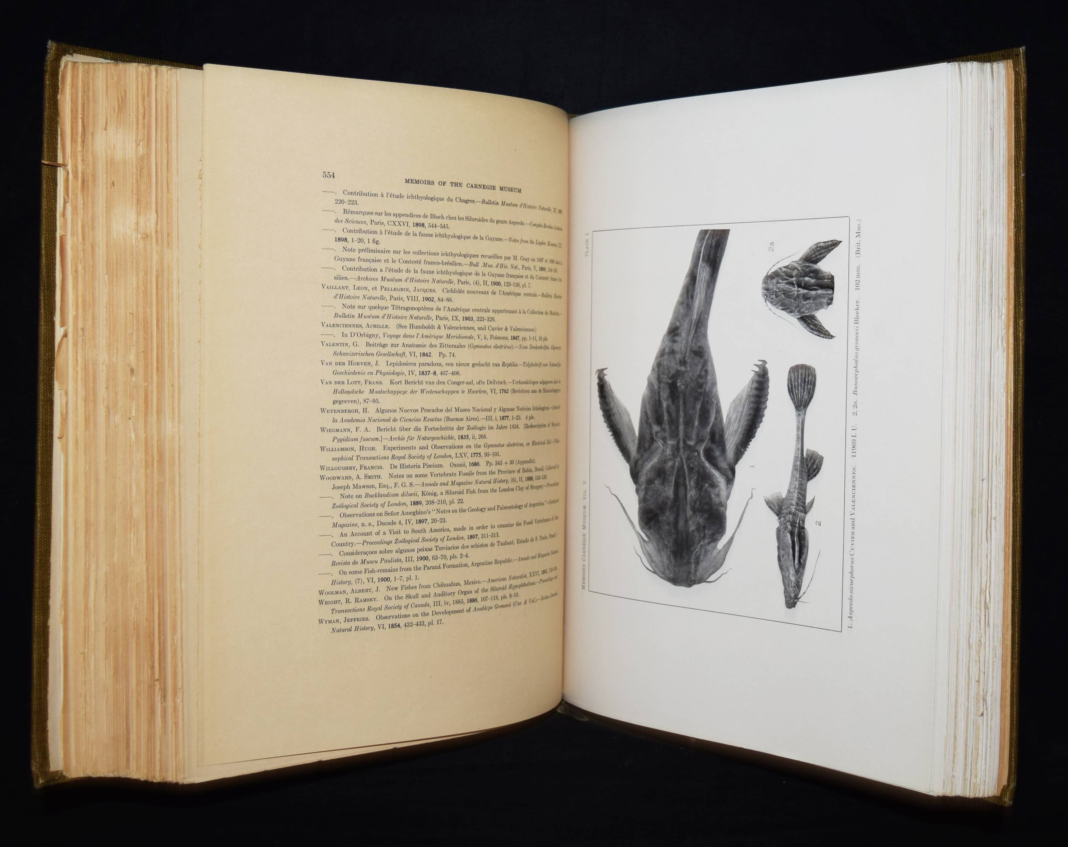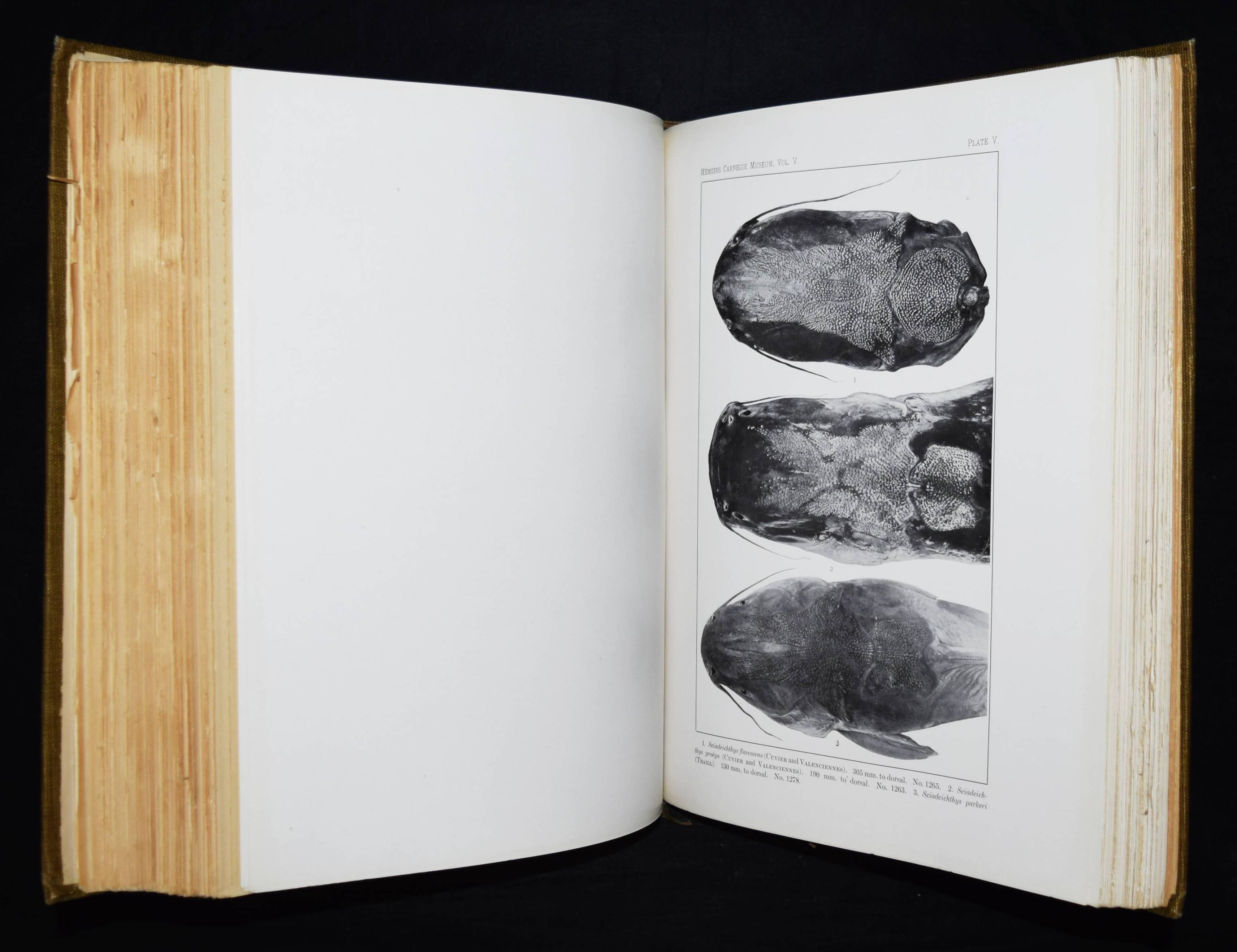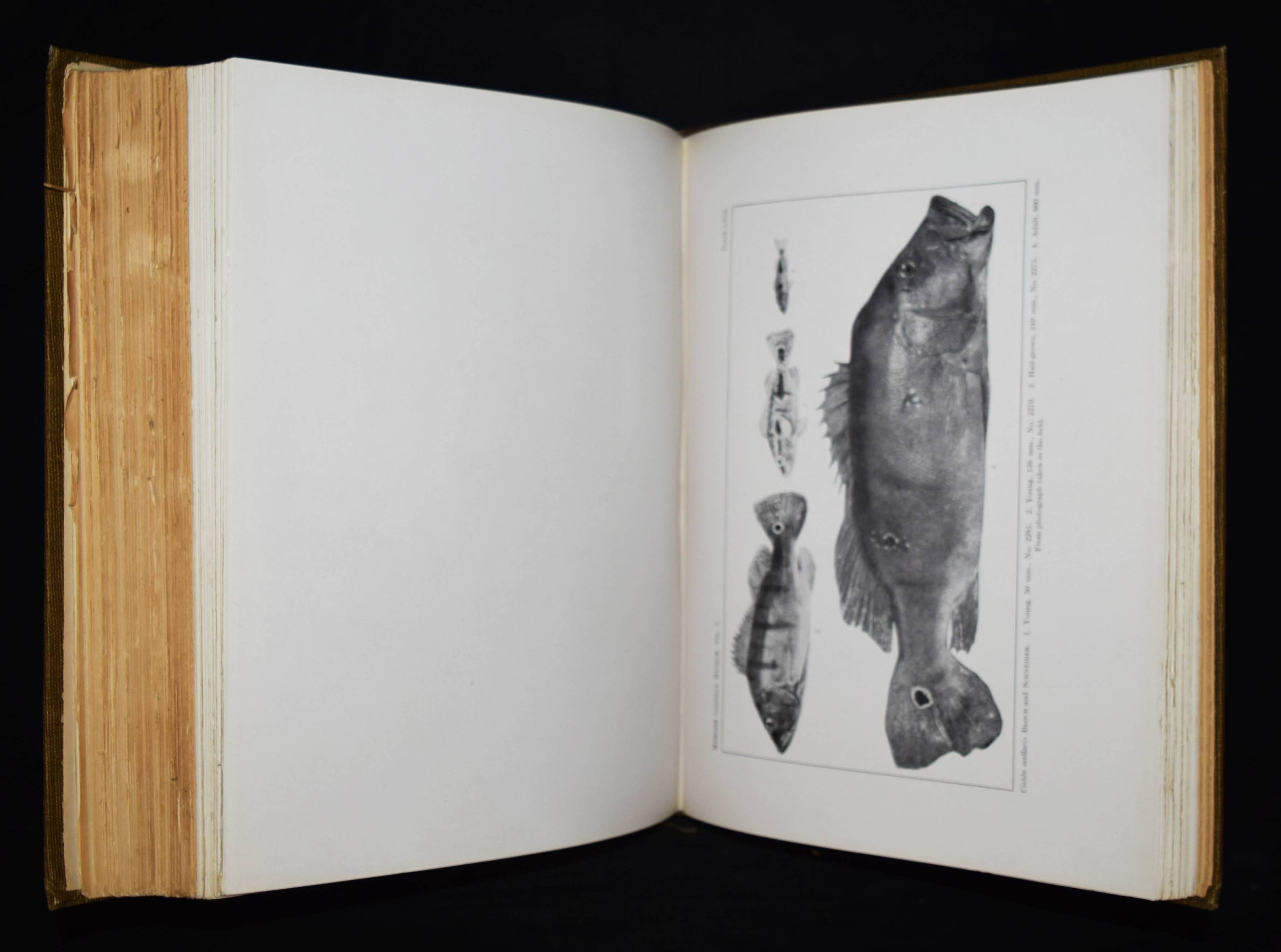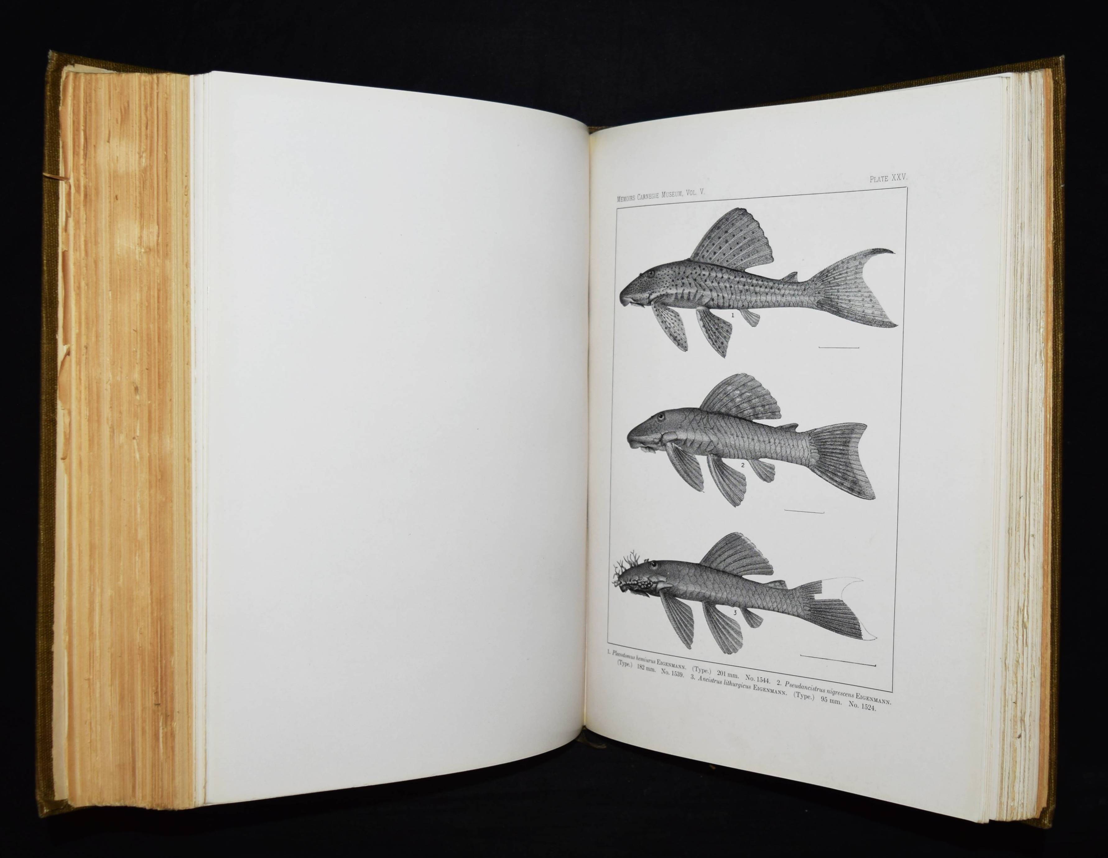 Holland, W(illiam) J(acob, Ed.). Memoires of the Carnegie Museum. Vol(ume) V. (C(arl) H(enry) Eigenmann. The freshwater fishes of British Guiana, including a study of the ecological grouping of species and the relation of the fauna of the plateau to that of the lowlands). Pittsburgh, Carnegie Institute 1912. Folio (34 x 28 cm.). [1] w. Bl., XXII, 578 S. mit Frontispiz, zahlr. Abb. u. 103 Tafeln. OLn. mit goldgepr. Rückentitel. Dean, Fishes I, 595. – Erste und einzige Ausgabe, selten. – Hauptwerk des bedeutenden US-amerik. Ichthyologen C. H. Eigenmann (1863-1927), „der zusammen mit seiner Frau Rosa Smith Eigenmann mehrere hundert Fischarten, vorrangig aus Nord- und Südamerika erstmals beschrieb, von denen auch einige nach ihm benannt wurden. … Nachdem Eigenmann in den Jahren 1906/07 Gastdozent an der Albert-Ludwigs-Universität Freiburg gewesen war, wurde er 1908 Dekan der Hochschule für Aufbaustudien in Indiana. Im selben Jahr sicherte er sich vom Carnegie Museums of Pittsburgh die Unterstützung einer Forschungsreise nach Südamerika und brach im September 1908 zur Carnegie British Guiana Expedition auf. Er kehrte mit 25.000 Exemplaren zurück, die später die Basis für 128 neue Spezies sowie 28 neue Gattungen bildeten. Er unternahm weitere Reisen nach Kolumbien (1912) und in die Anden (1918). … Später schrieb Carl Eigenmann hauptsächlich Berichte über seine Expeditionen und unterstützte jüngere Kollegen bei der Planung und Durchführung eigener Forschungsreisen. 1917 wurde er in die American Philosophical Society und 1923 in die National Academy of Sciences aufgenommen“ (Wikipedia). – Rücken etwas aufgehellt, papierbedingt stellenweise etwas gebräunt, sehr gutes Exemplar.