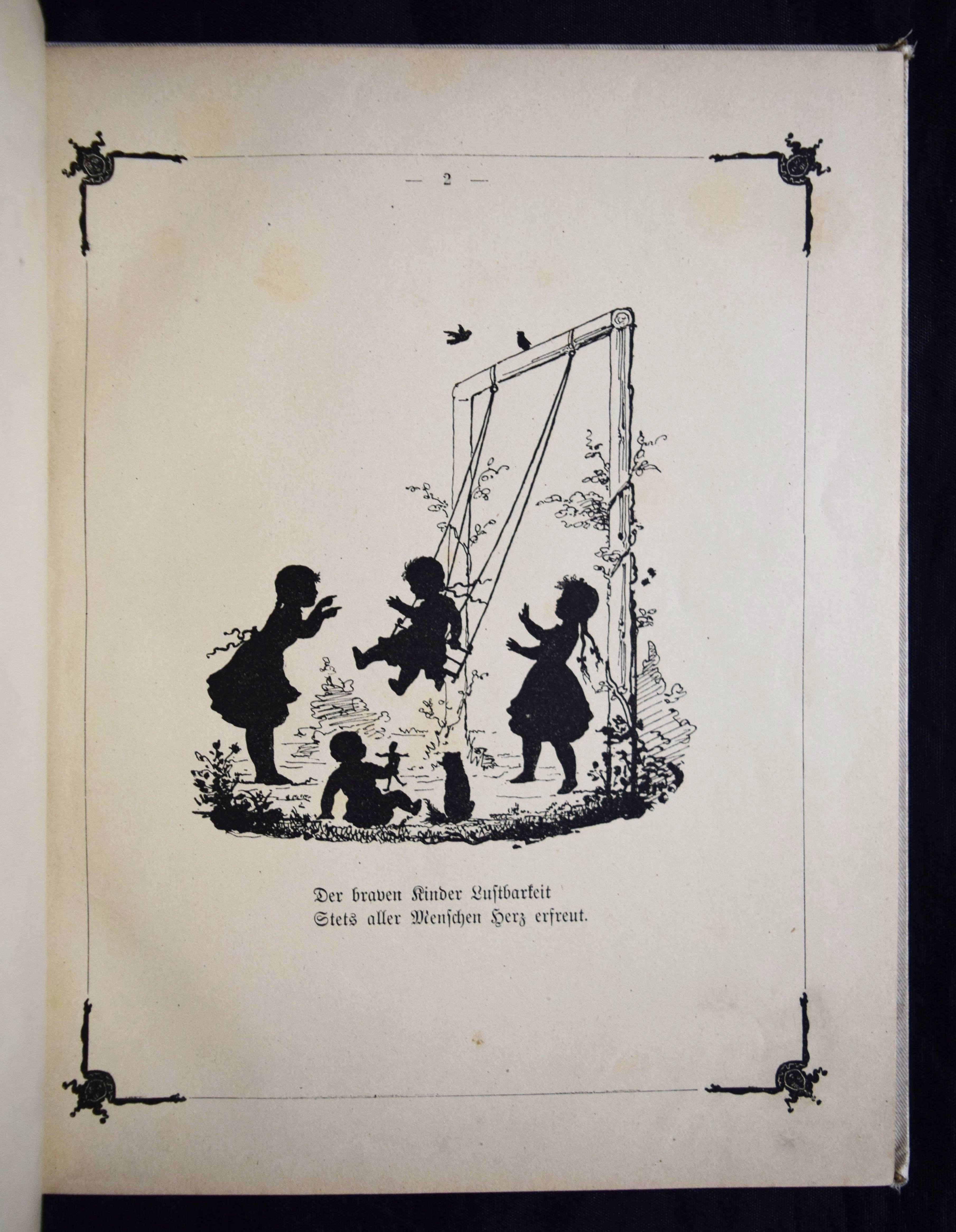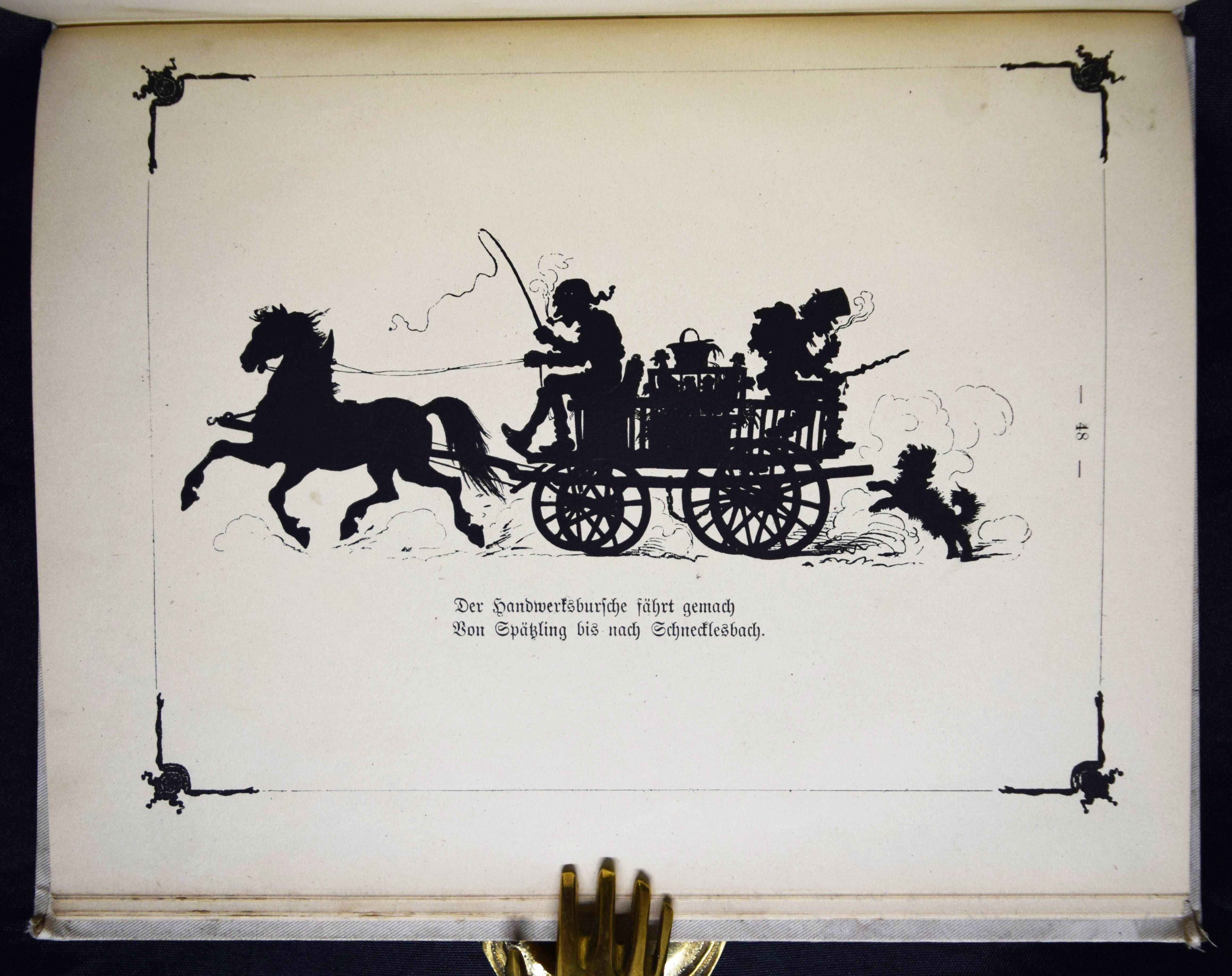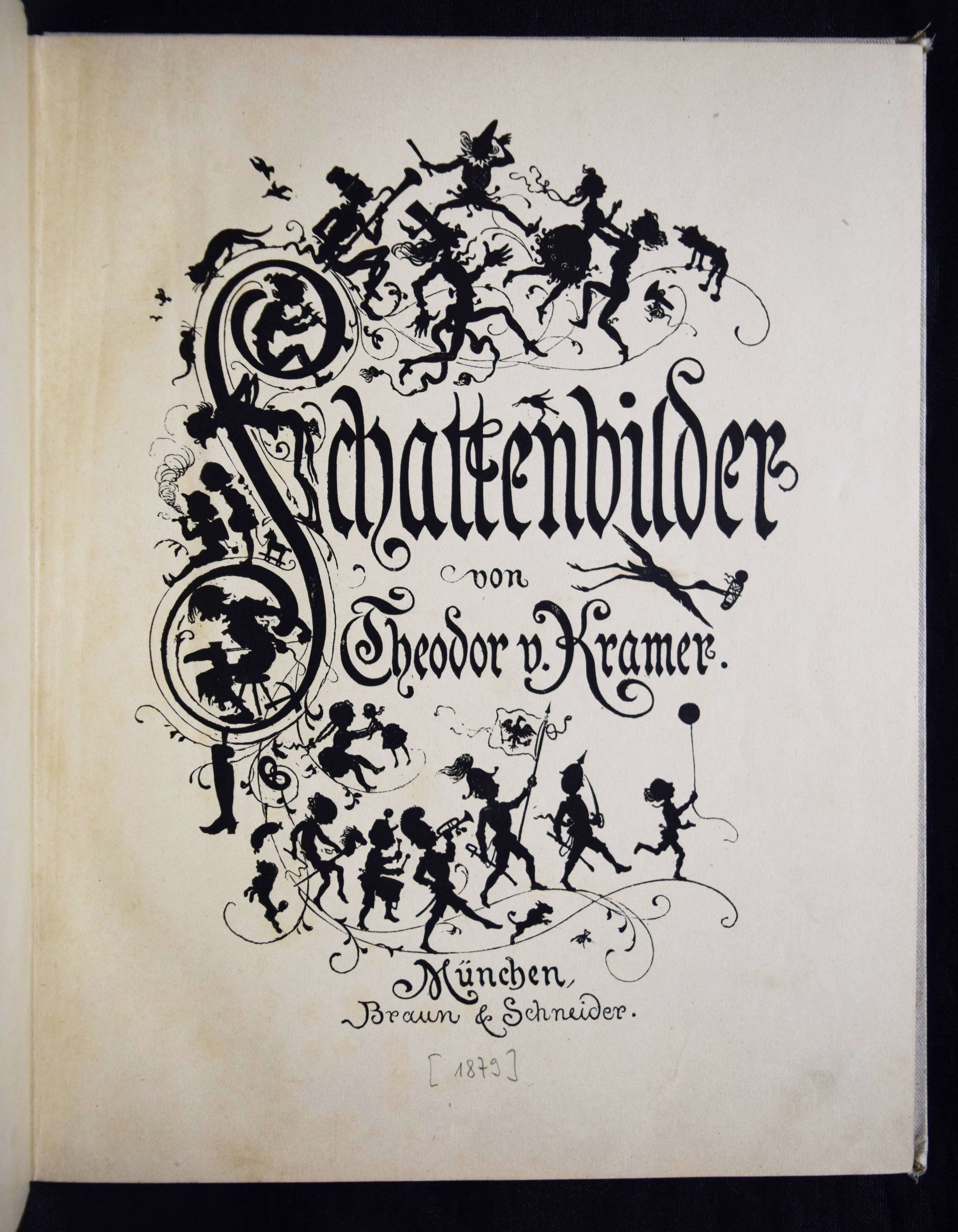 Kramer, Theodor v. Schattenbilder. München, Braun & Schneider o. J. (1879). Gr.-8°. Illustr. Titel, 62 S. mit Scherenschnitt-Illustrationen und Versen. Illustr. OLn. mit schwarzgepr. Rücken- u. Deckeltitel. Ries 657,1. Nicht bei Weber, Schwarze Kunst im Buch. – Erste Ausgabe. – Einband etwas angestaubt, gutes sauberes Exemplar.