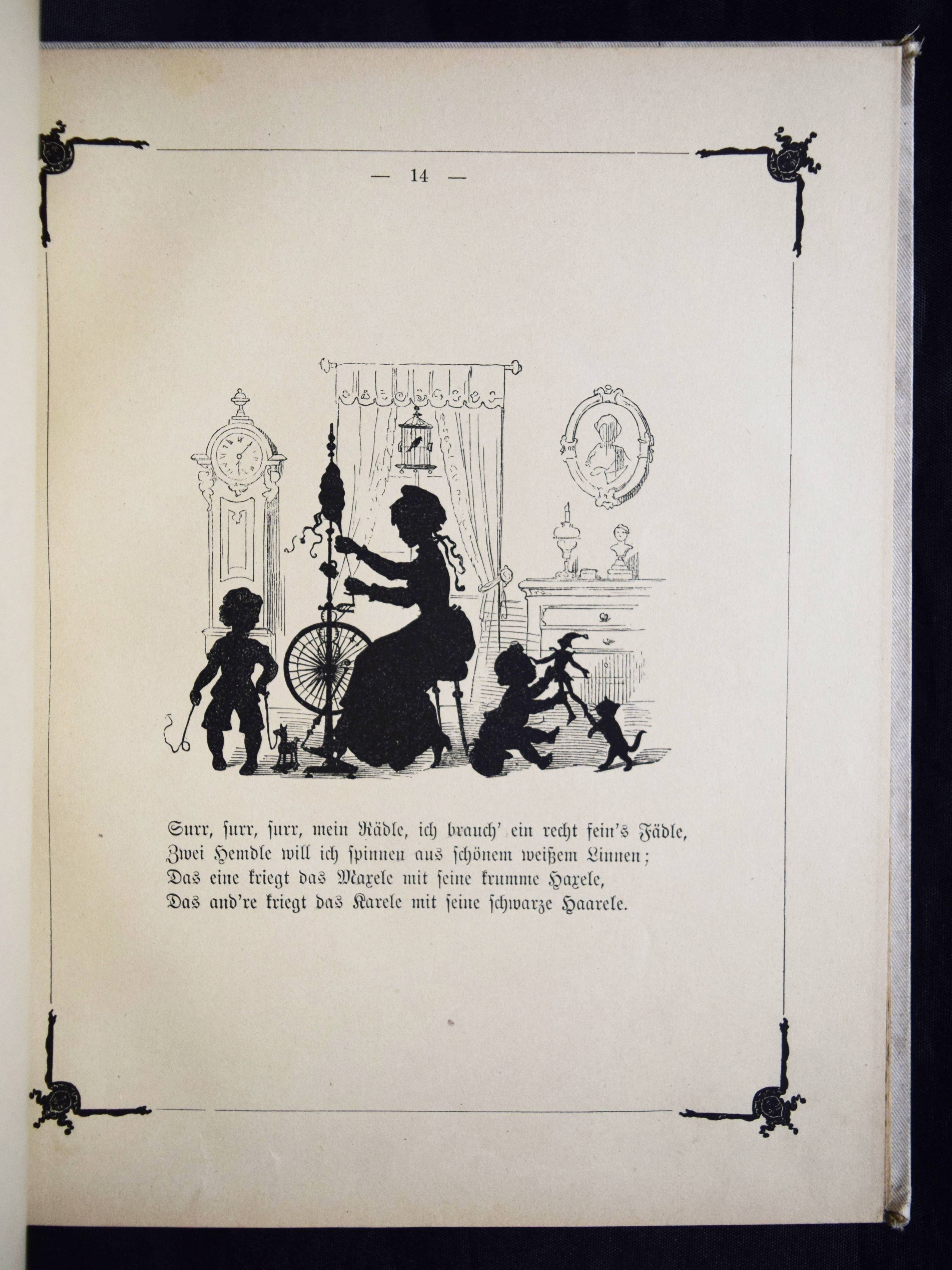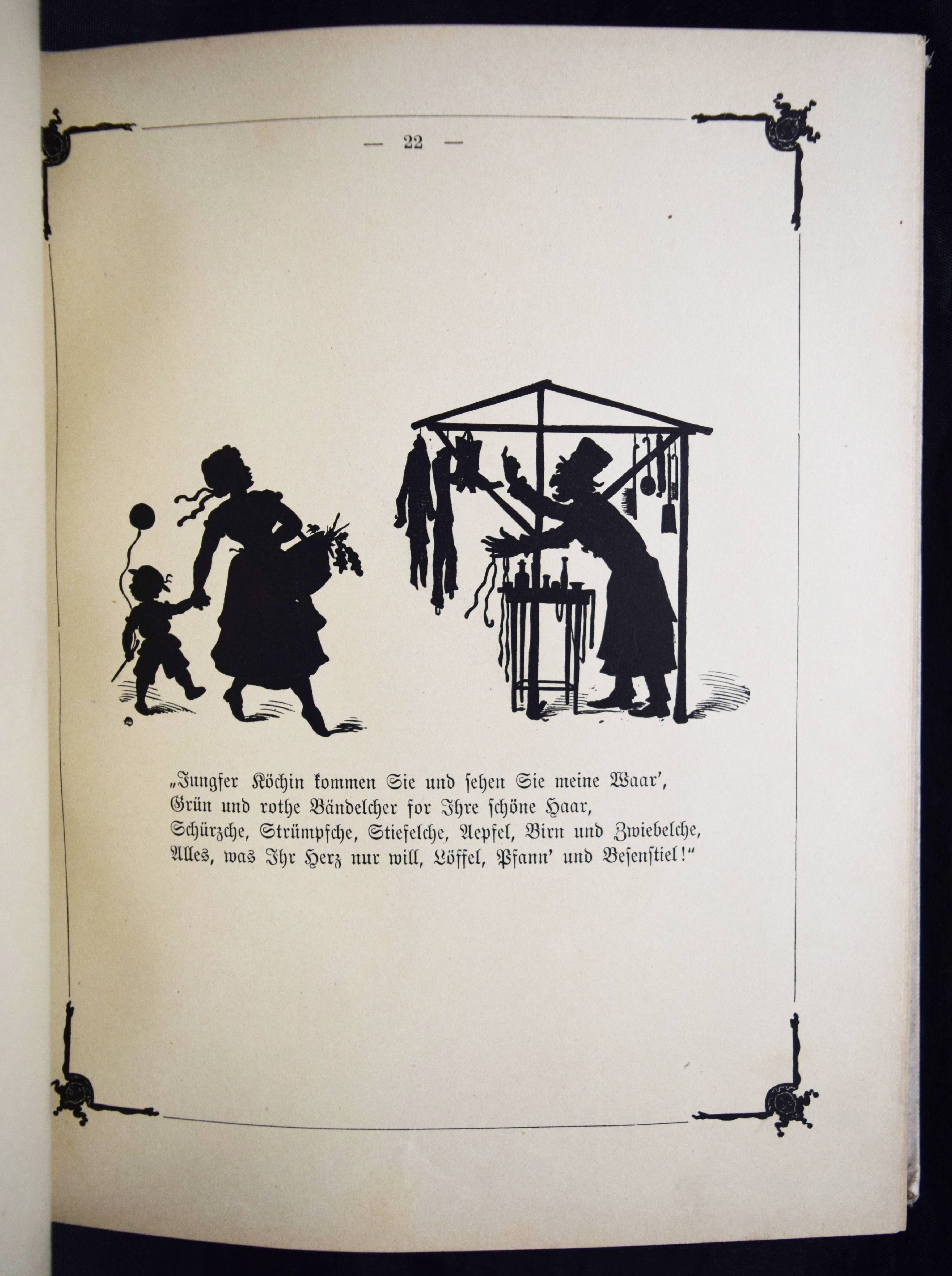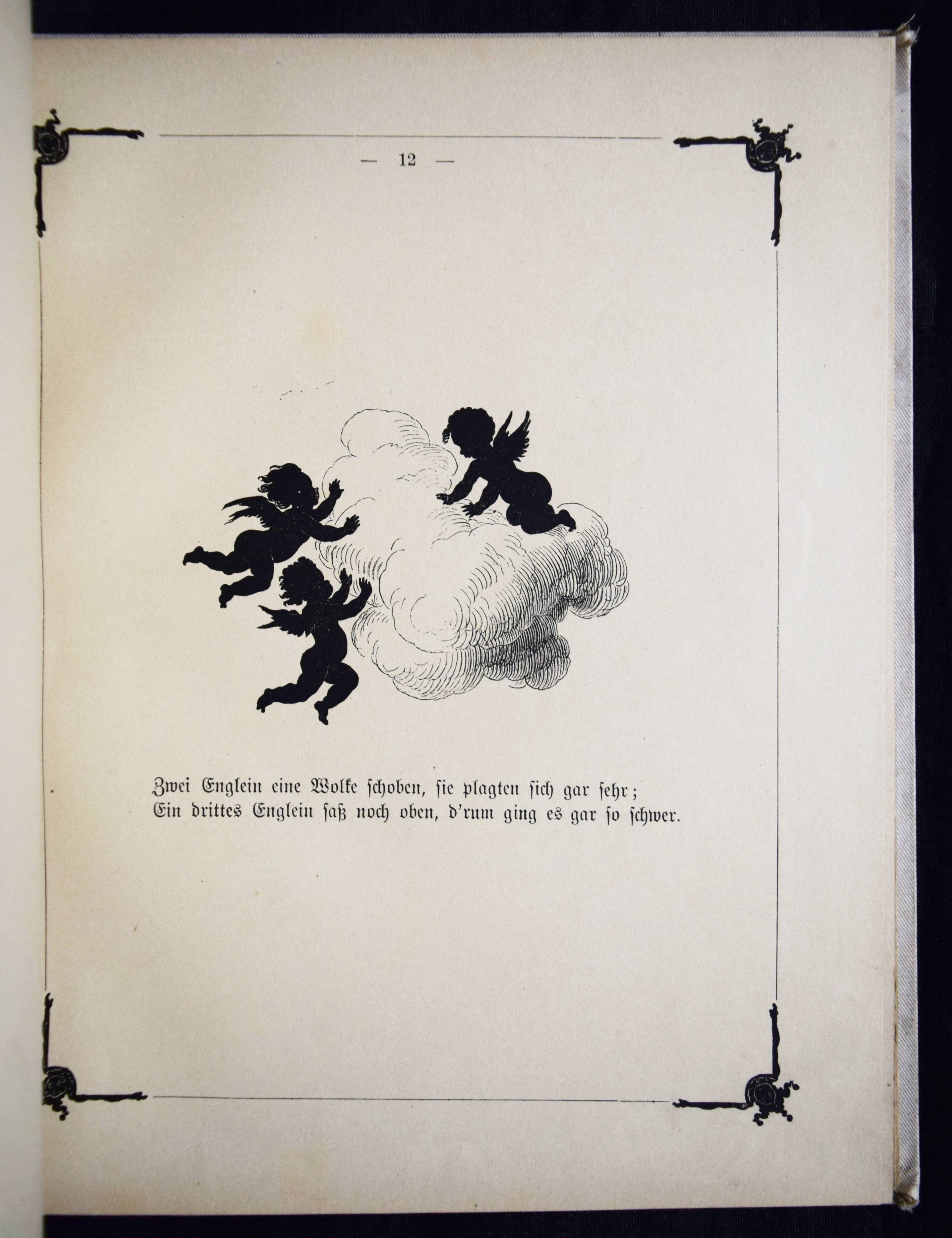 Kramer, Theodor v. Schattenbilder. München, Braun & Schneider o. J. (1879). Gr.-8°. Illustr. Titel, 62 S. mit Scherenschnitt-Illustrationen und Versen. Illustr. OLn. mit schwarzgepr. Rücken- u. Deckeltitel. Ries 657,1. Nicht bei Weber, Schwarze Kunst im Buch. – Erste Ausgabe. – Einband etwas angestaubt, gutes sauberes Exemplar.