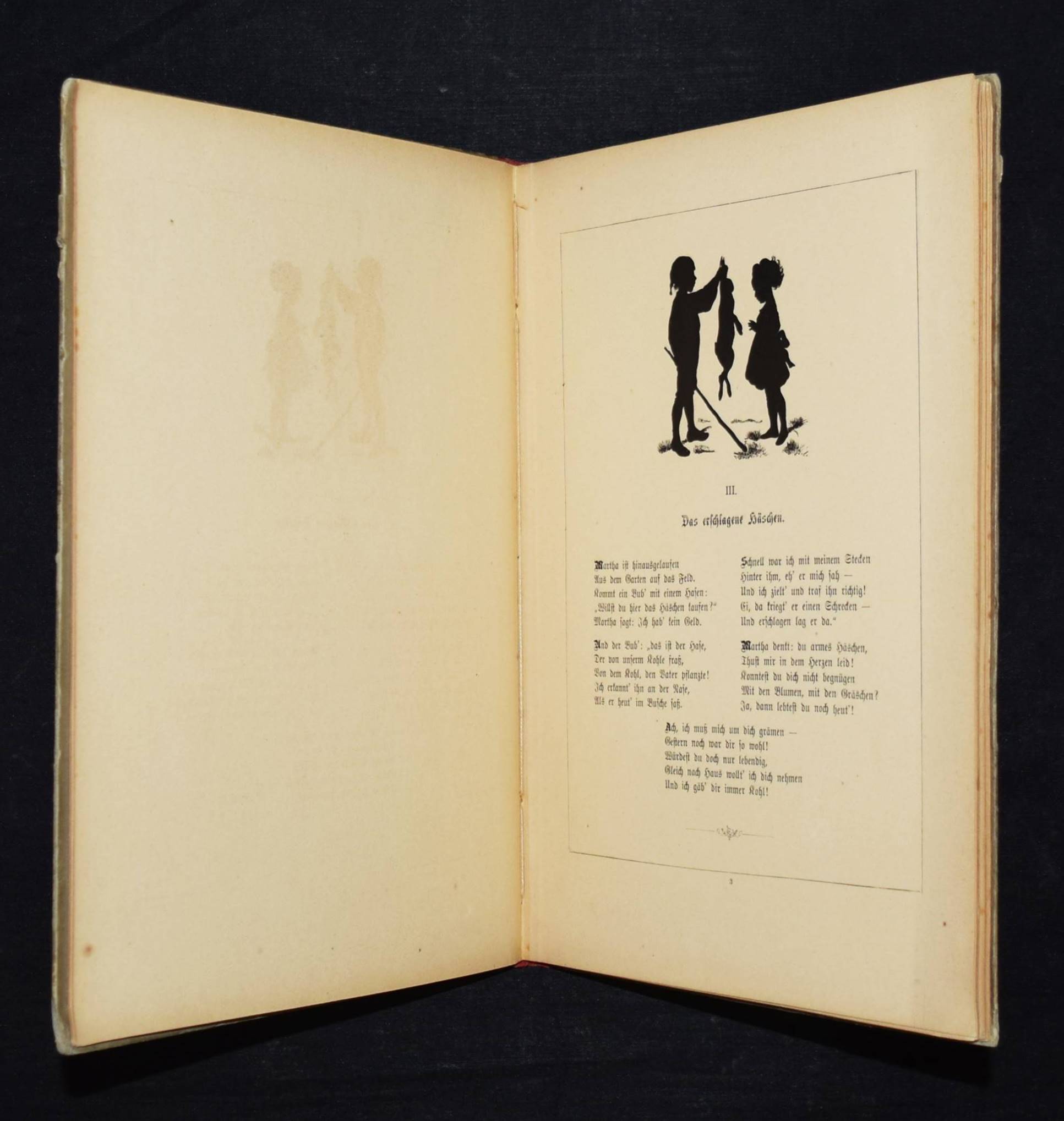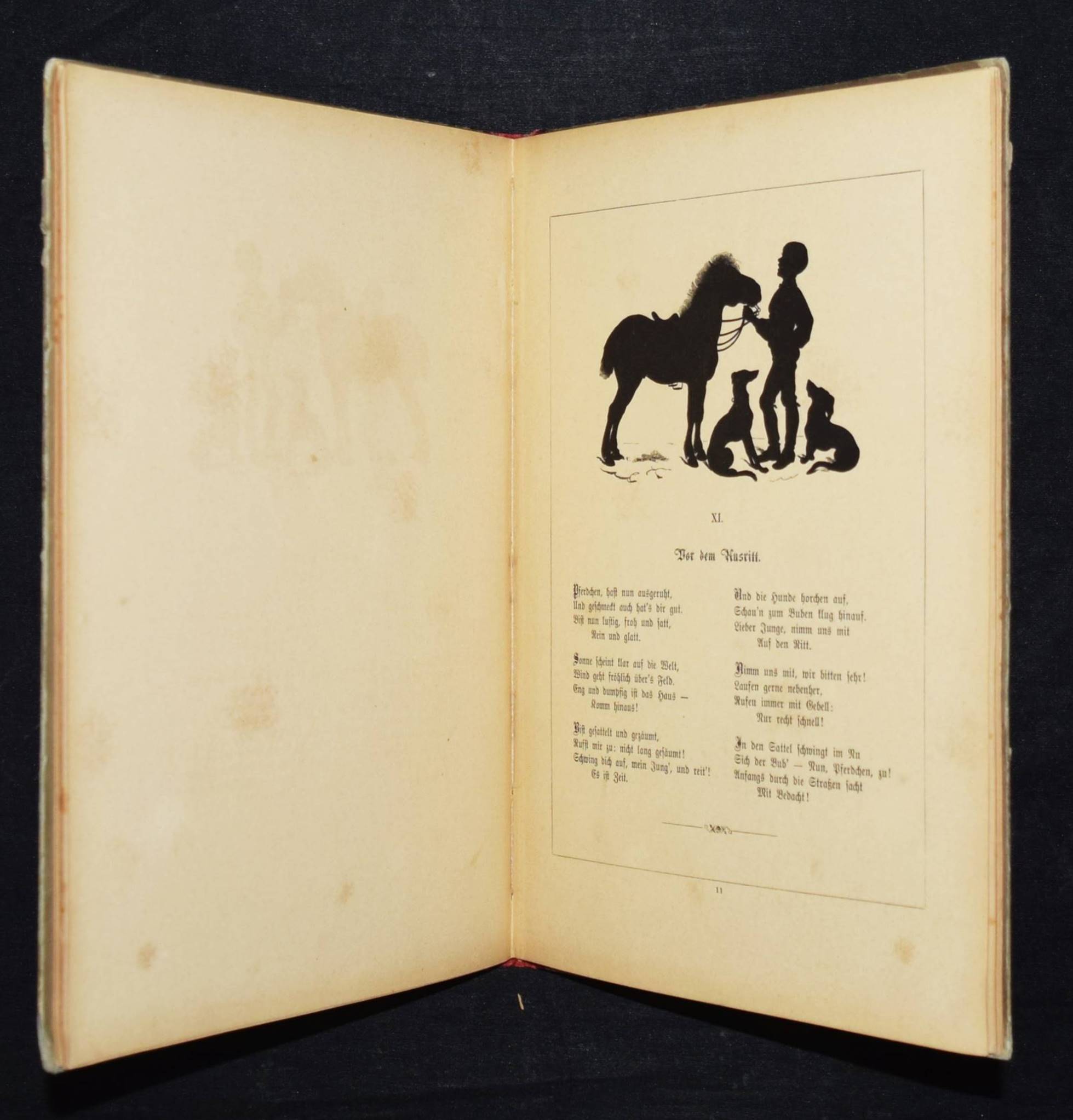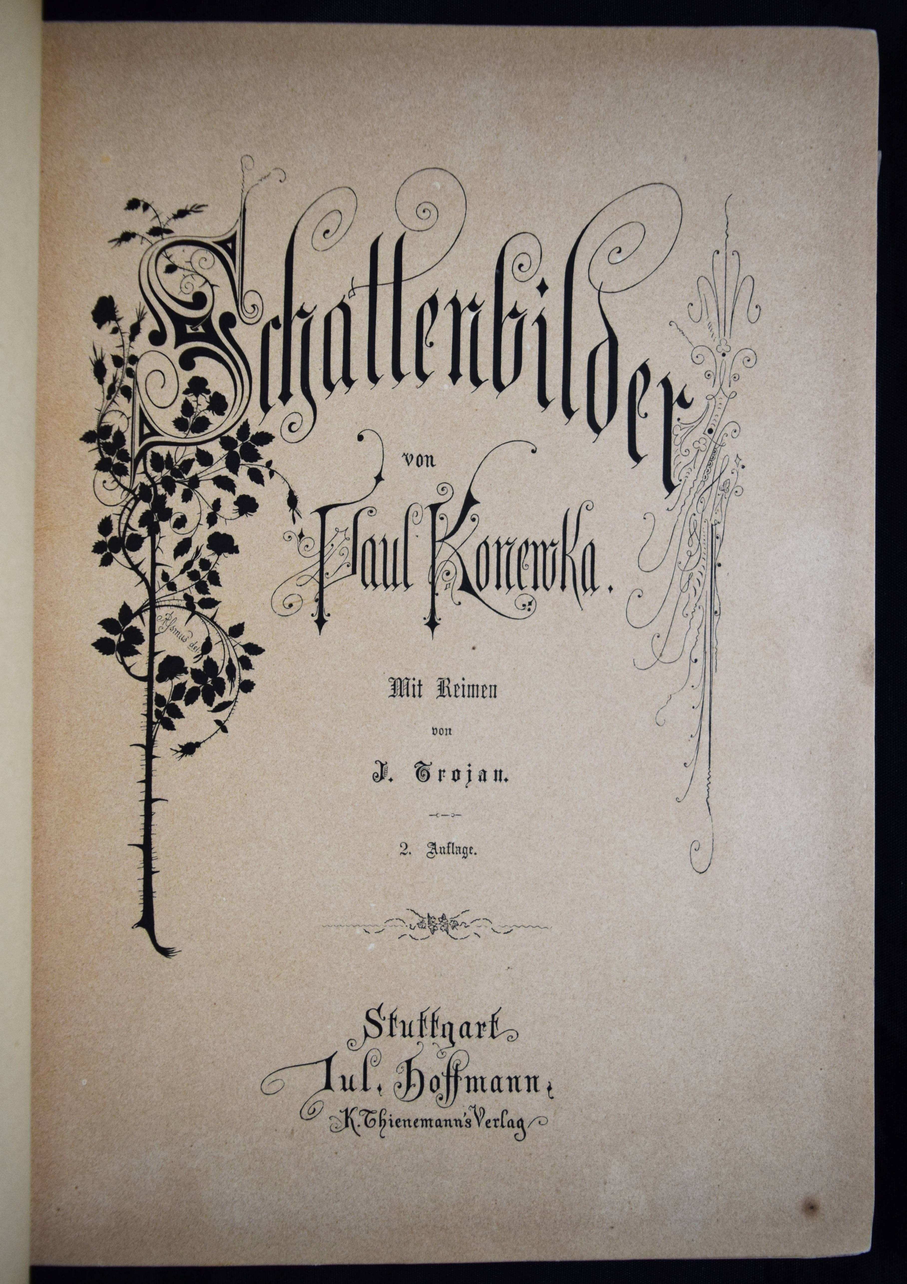 Konewka, Paul. Schattenbilder. Mit Reimen von J(ohannes) Trojan. 2. Aufl. Stuttgart, Jul. Hoffmann, K. Thienemann’s Verlag o. J. (1871). 4°. Illustr. Titel, 20 S. mit Scherenschnitt-Illustrationen. Illustr. OHln. Bilderwelt 358. Hauswedell 1287. LKJ II, 240 ff. u. III, 569 ff. Ries 653, 2. Rümann 1132. Seebaß II, 2071. Stuck-Villa I, 280. Weber, Schwarze Kunst im Buch S. 38 ff. Wegehaupt IV, 2259. – „Paul Konewka (1840-1871), (der Schwager von J. Trojan), wird heute als der bedeutendste Silhouettenschneider und -illustrator des 19. Jahrhunderts angesehen“ (H. Müller in LKJ). – 1907 erschien eine Neuausgabe mit „neuen Versen“ von Ferdinand Avenarius. – Deckel angestaubt und leicht fleckig, Innengelenke angeplatzt, gutes Exemplar.