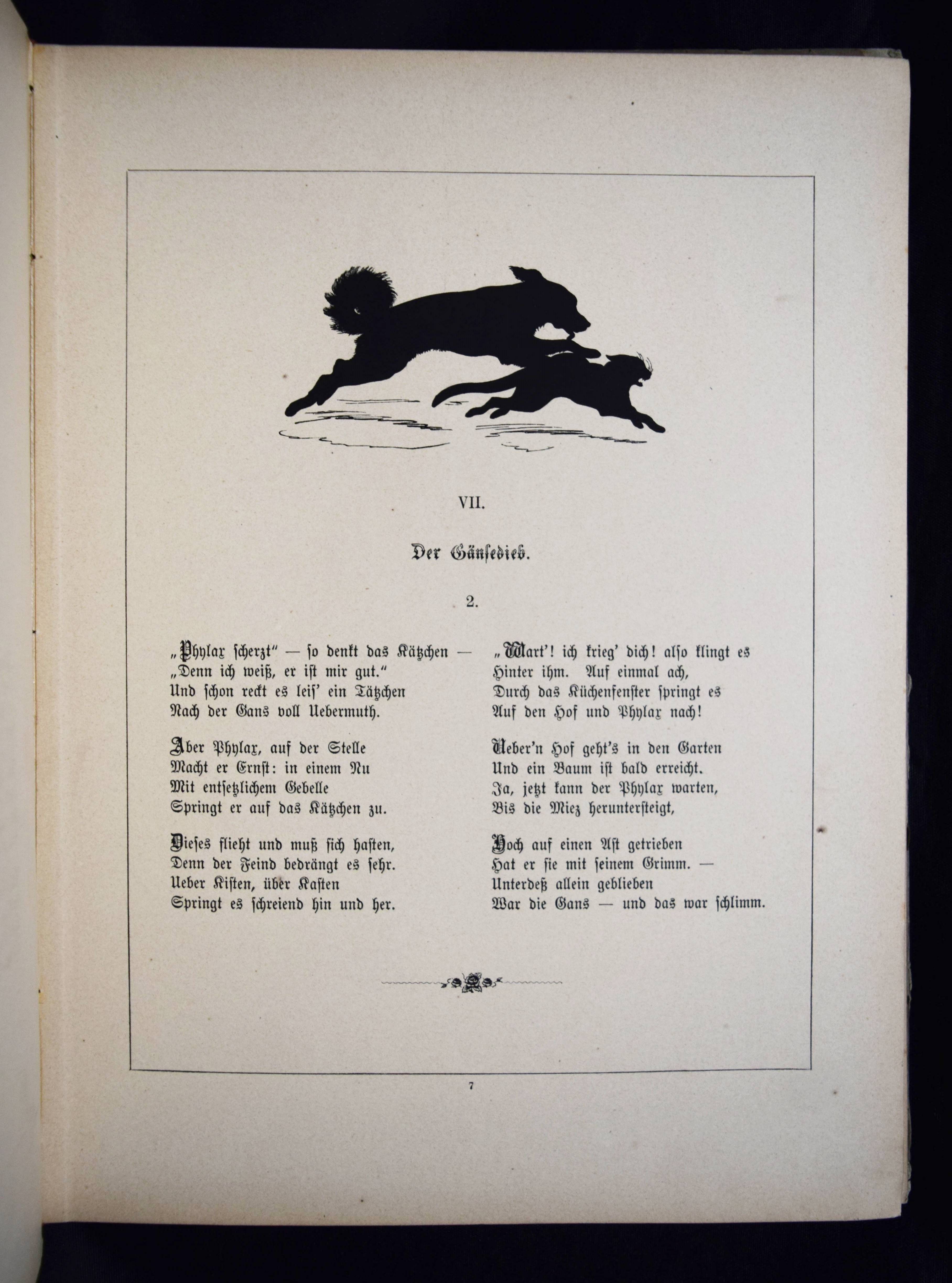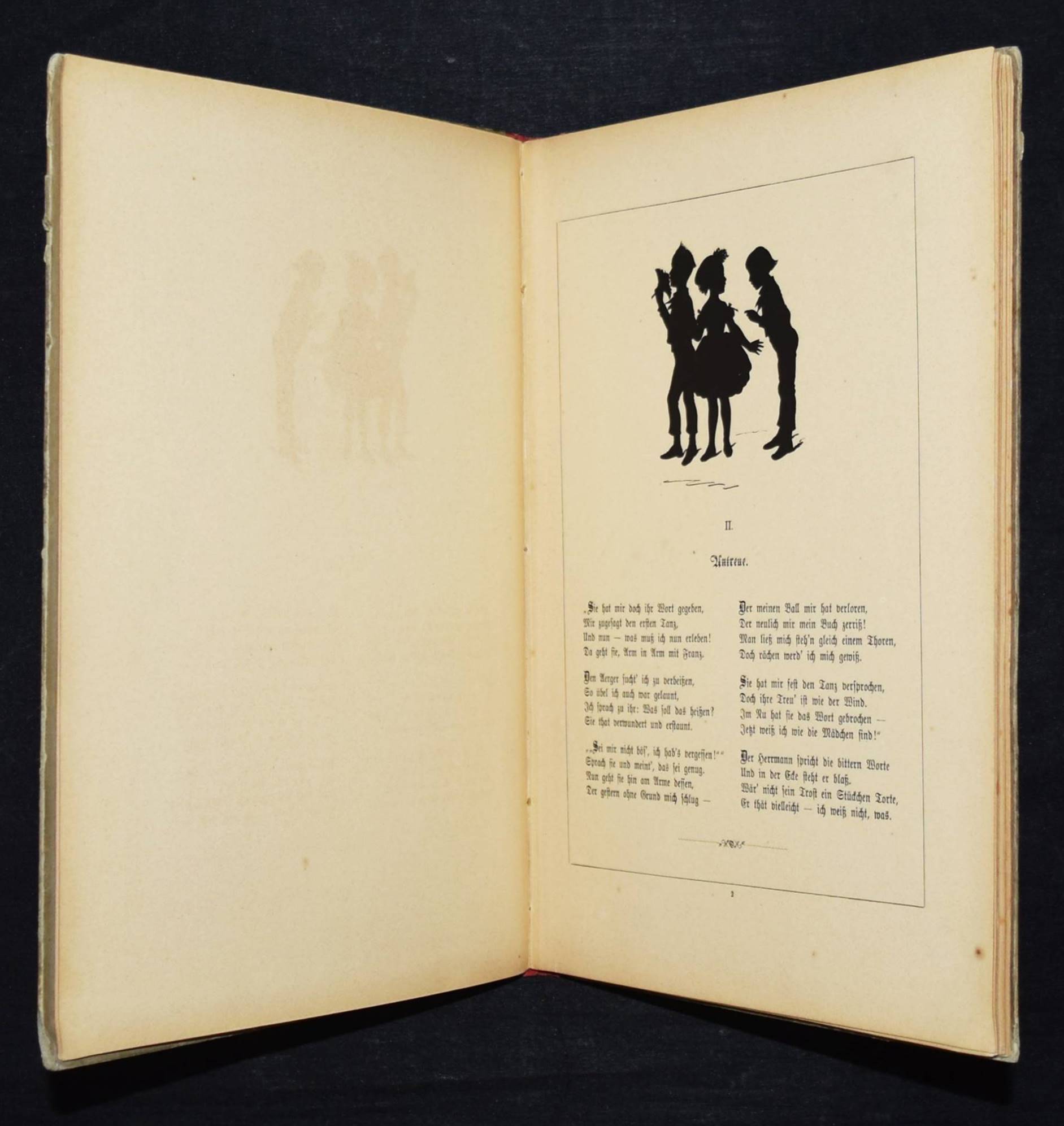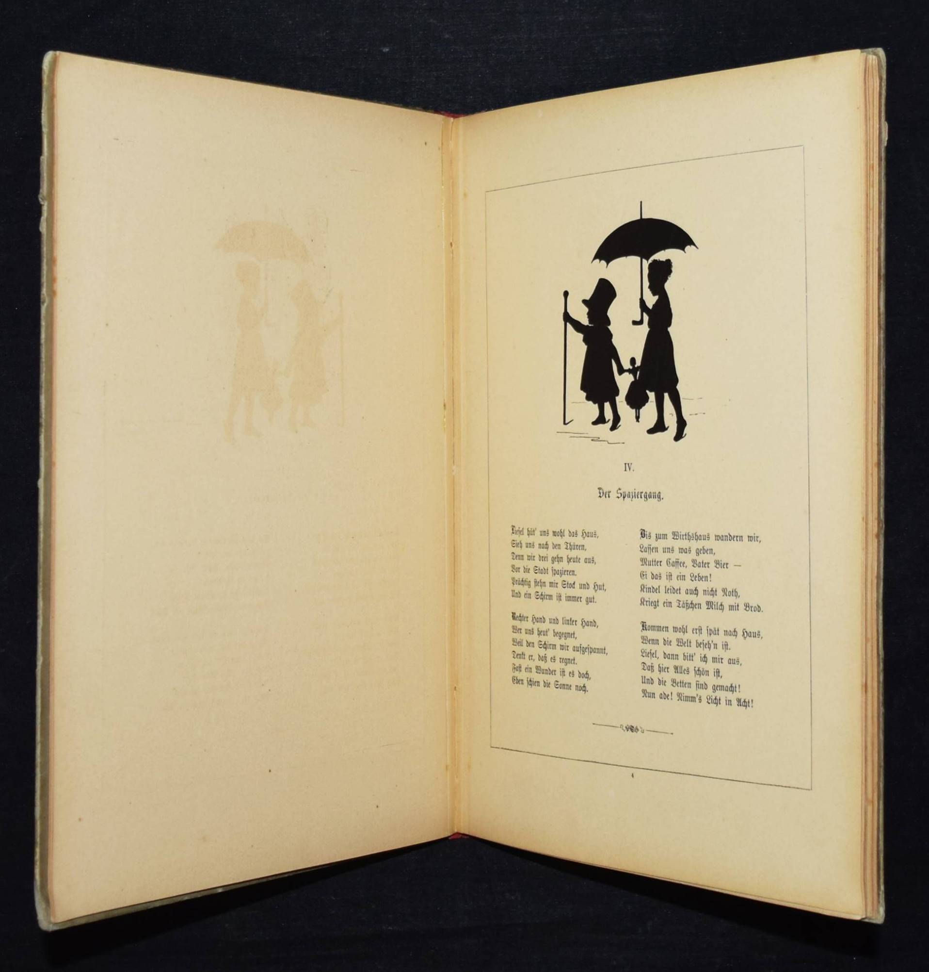 Konewka, Paul. Schattenbilder. Mit Reimen von J(ohannes) Trojan. 2. Aufl. Stuttgart, Jul. Hoffmann, K. Thienemann’s Verlag o. J. (1871). 4°. Illustr. Titel, 20 S. mit Scherenschnitt-Illustrationen. Illustr. OHln. Bilderwelt 358. Hauswedell 1287. LKJ II, 240 ff. u. III, 569 ff. Ries 653, 2. Rümann 1132. Seebaß II, 2071. Stuck-Villa I, 280. Weber, Schwarze Kunst im Buch S. 38 ff. Wegehaupt IV, 2259. – „Paul Konewka (1840-1871), (der Schwager von J. Trojan), wird heute als der bedeutendste Silhouettenschneider und -illustrator des 19. Jahrhunderts angesehen“ (H. Müller in LKJ). – 1907 erschien eine Neuausgabe mit „neuen Versen“ von Ferdinand Avenarius. – Deckel angestaubt und leicht fleckig, Innengelenke angeplatzt, gutes Exemplar.