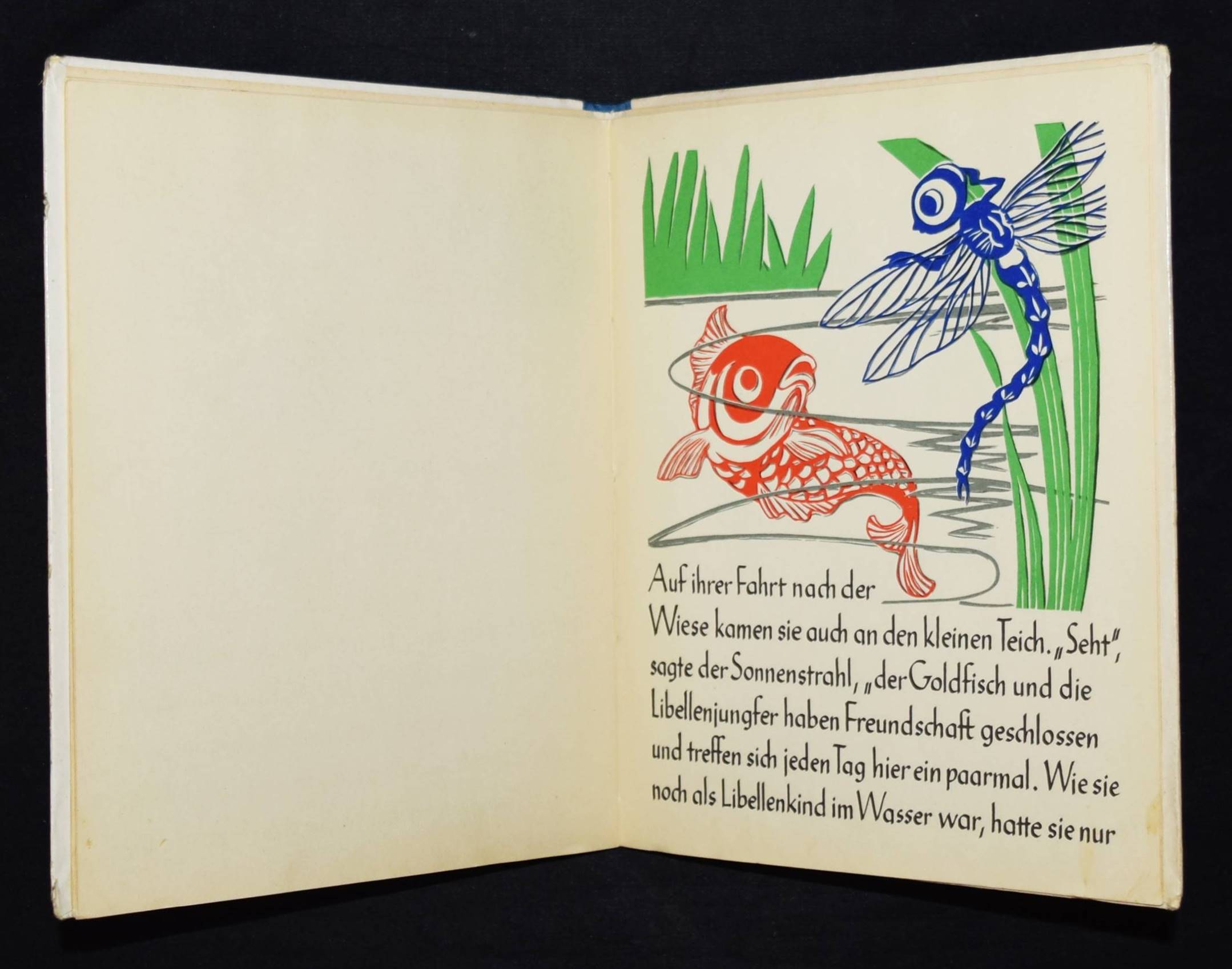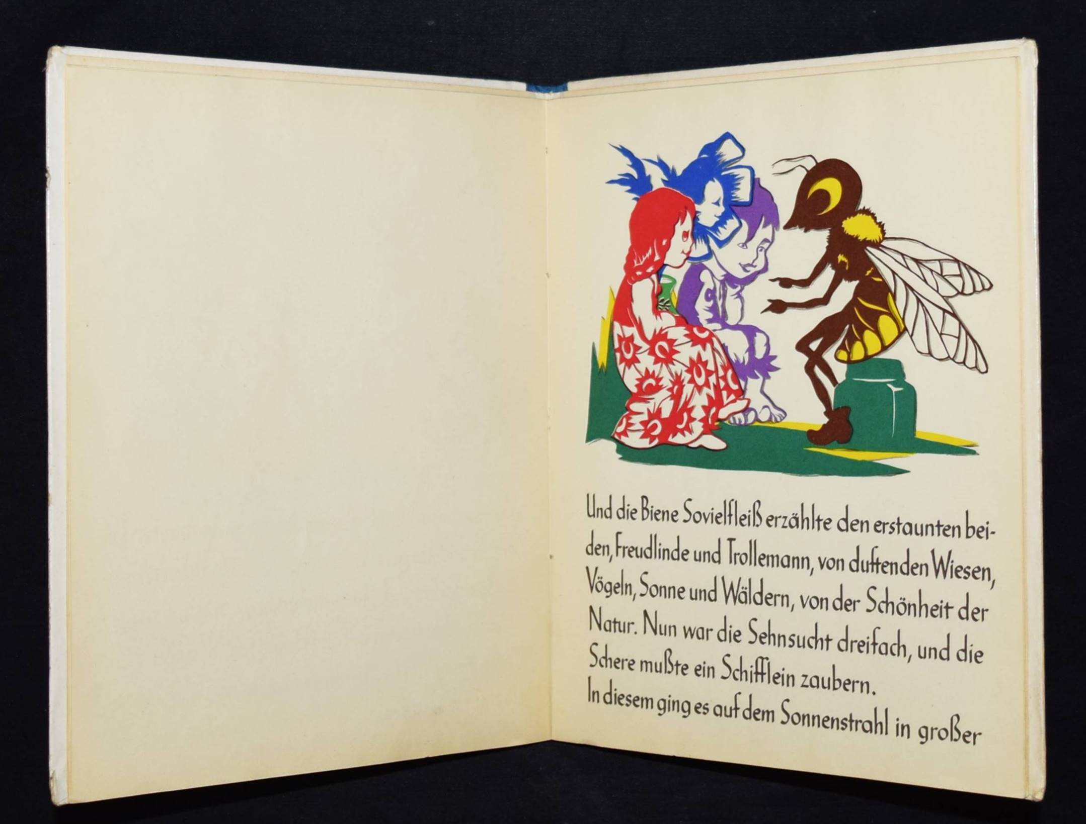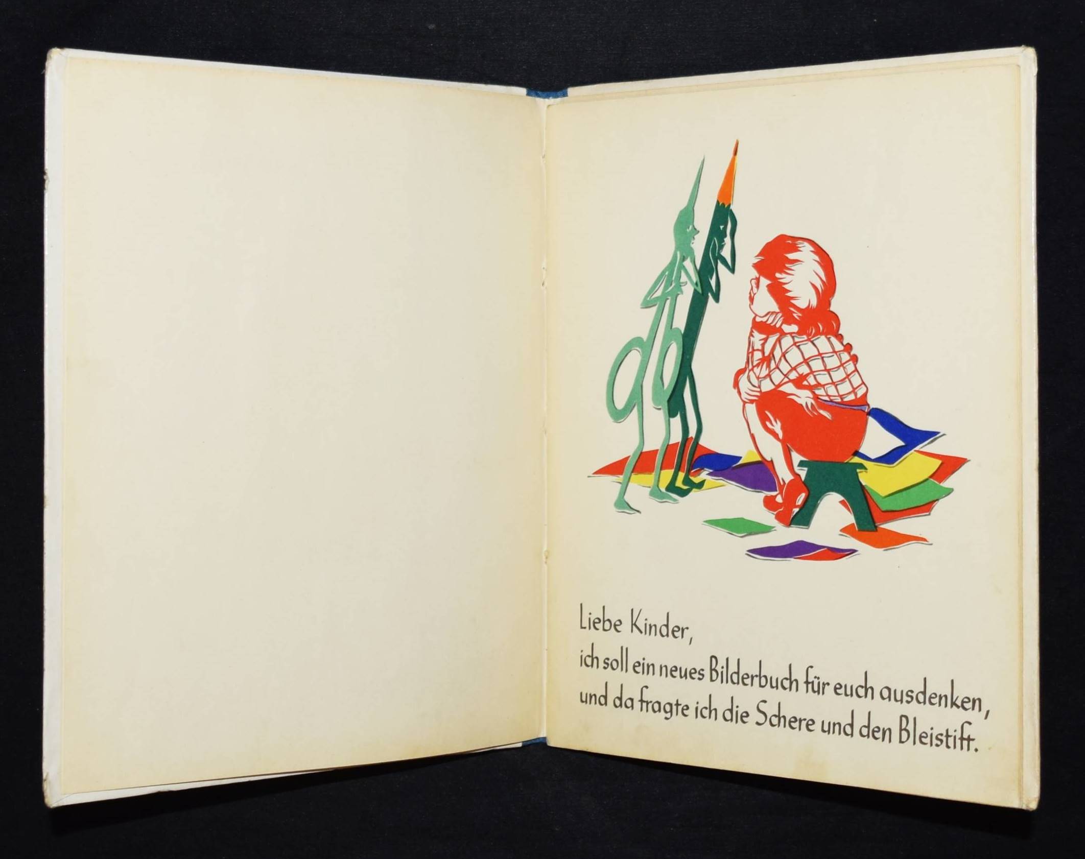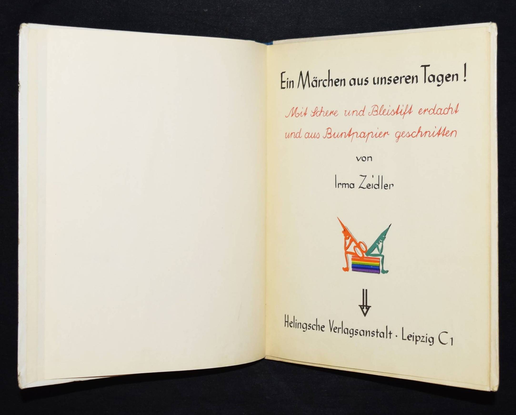Zeidler, Irma. Ein Märchen aus unseren Tagen! Mit Schere und Bleistift erdacht und aus Buntpapier geschnitten. 1. – 15. Tsd. Leipzig, Heling (1957). Gr.-8°. [12] Bl. mit farbigen Illustrationen nach Scherenschnitten. Farbig illustr. OHln. Erste Ausgabe. – Bindung etwas gelockert, gutes Exemplar.