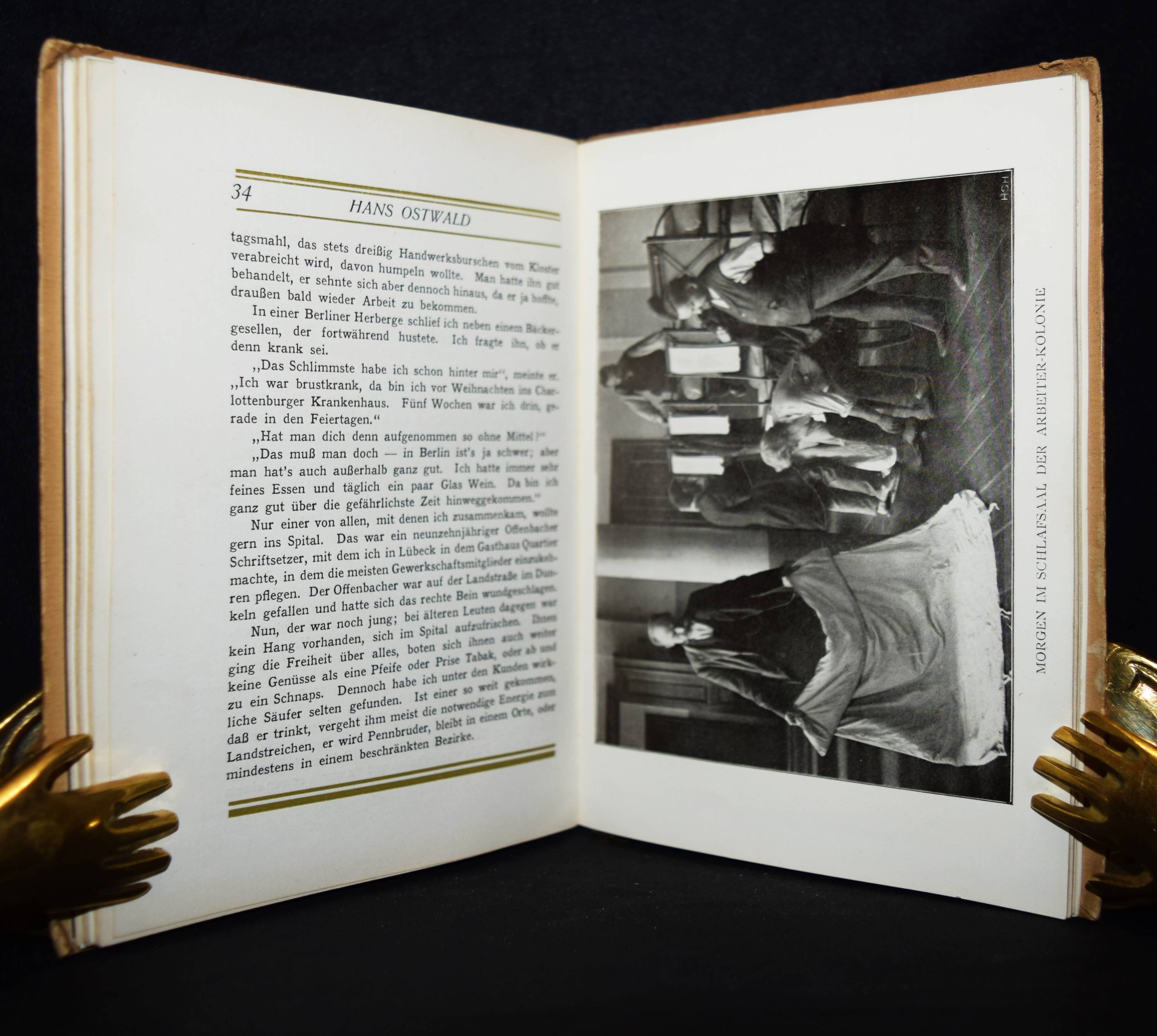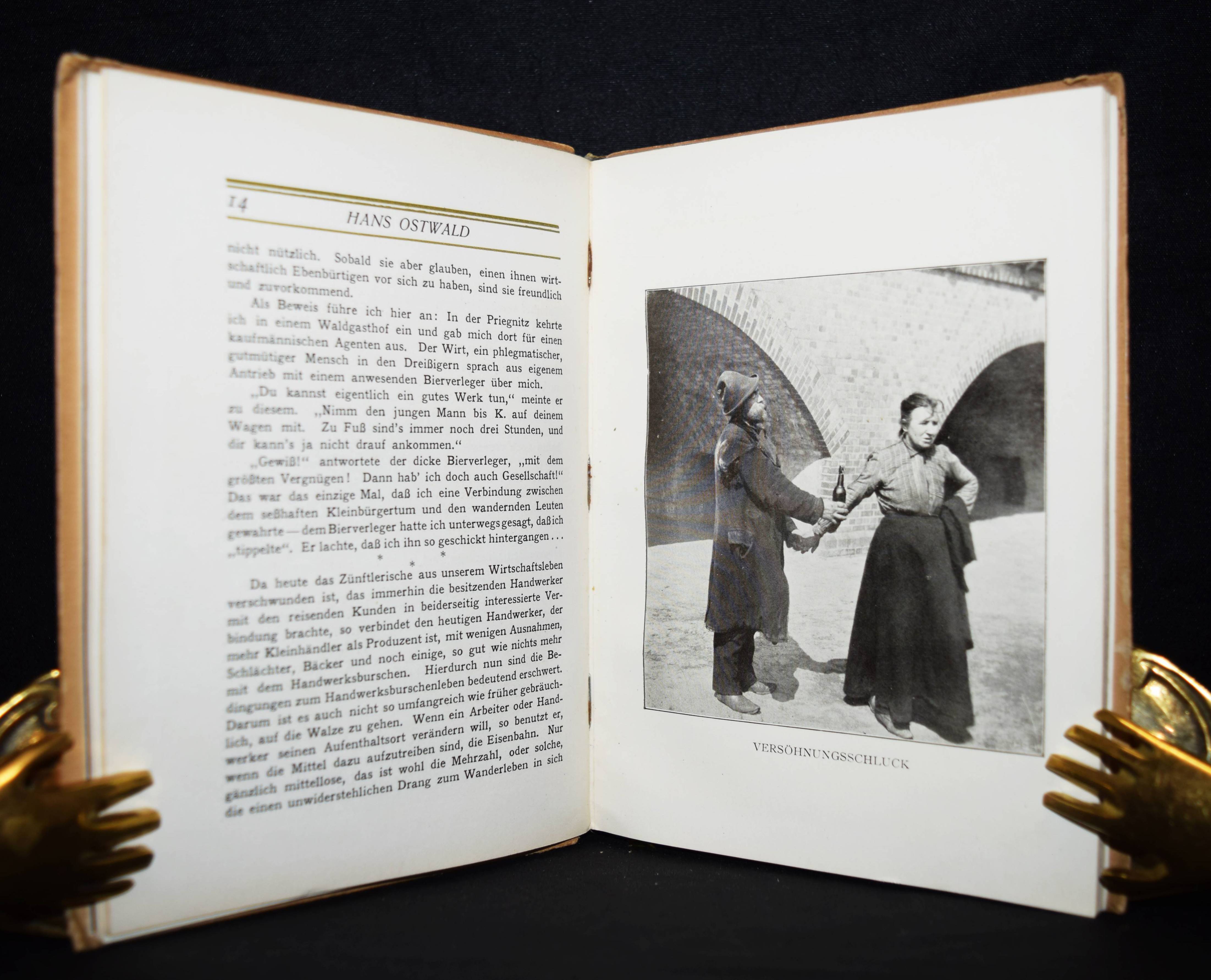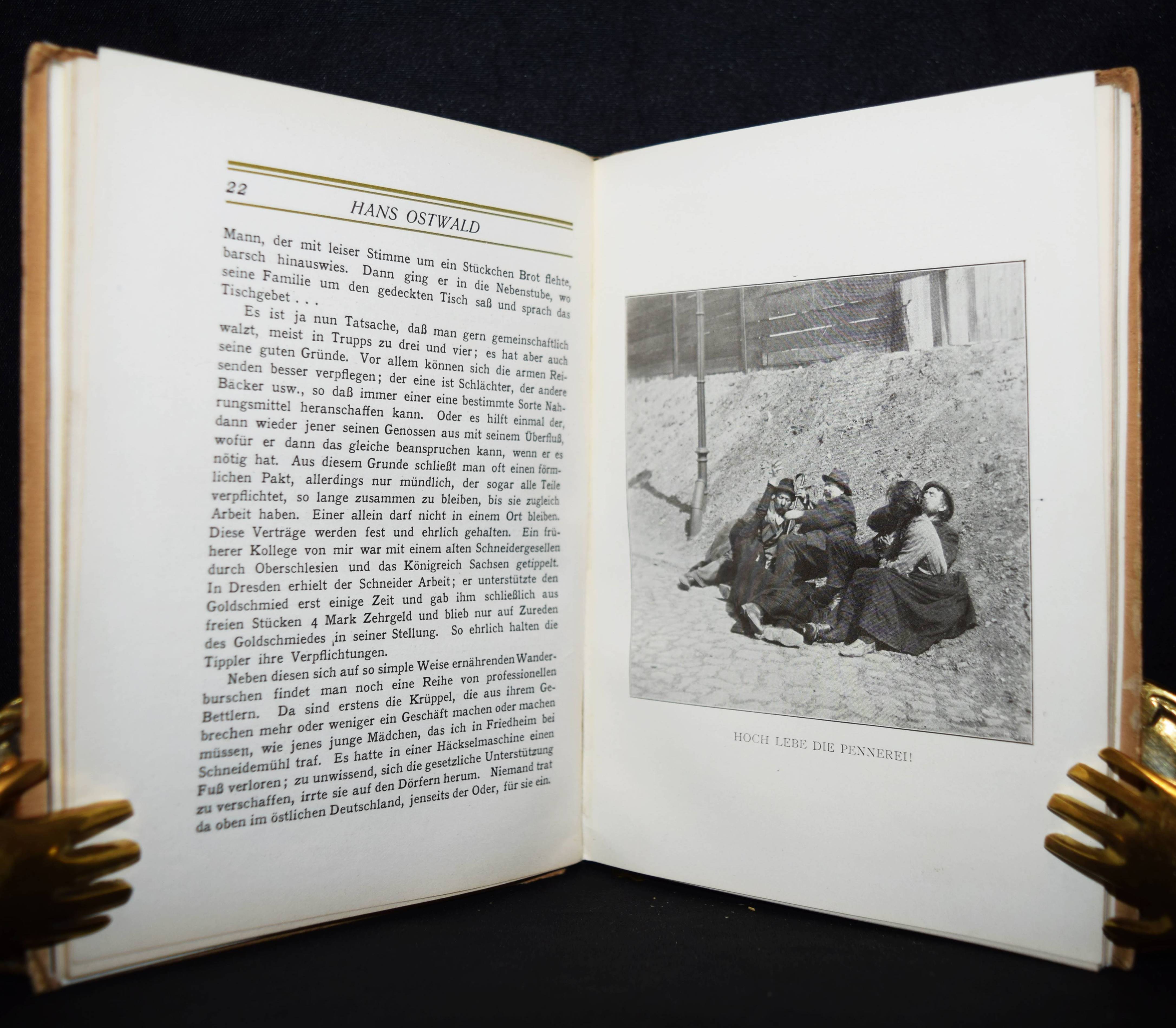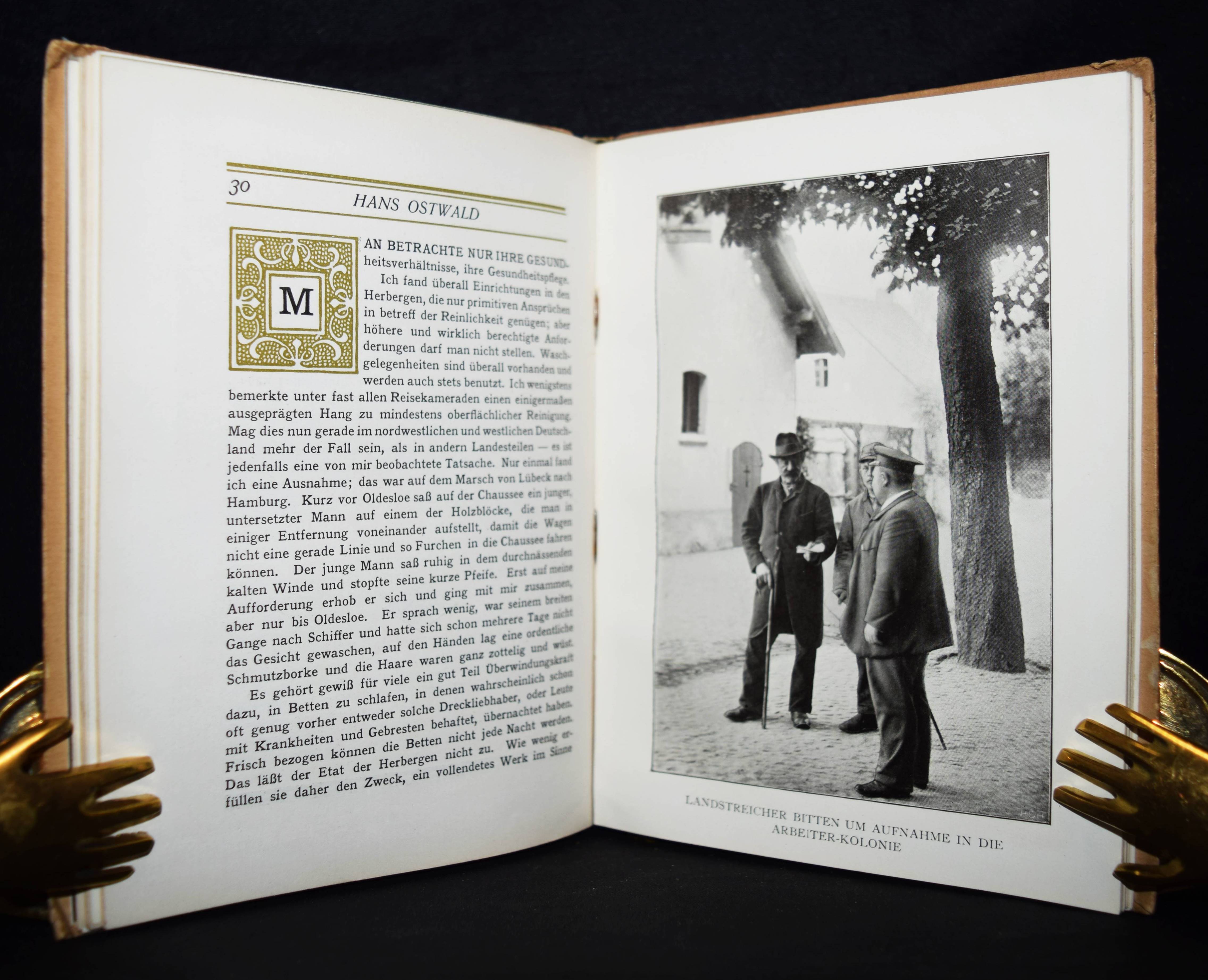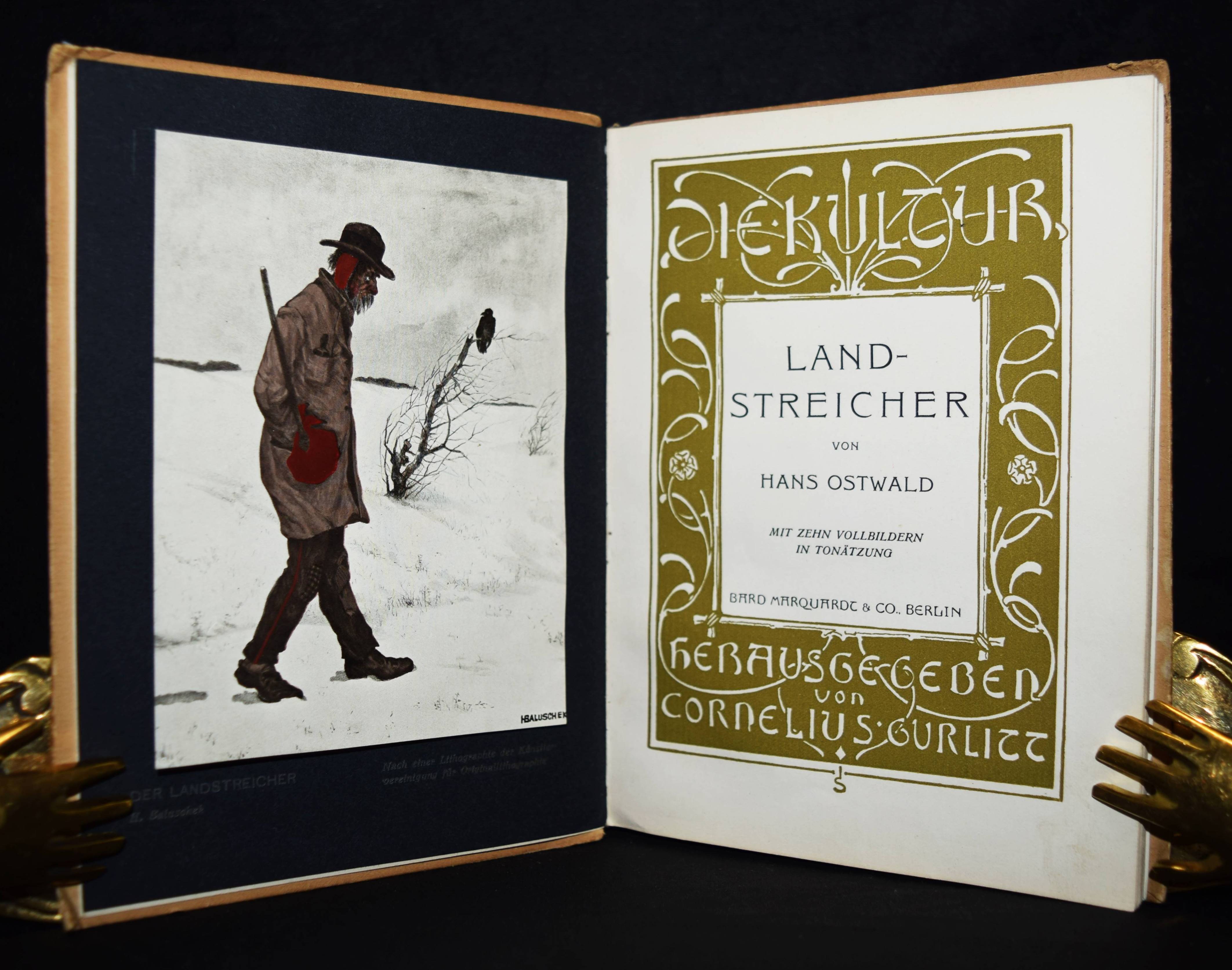 Ostwald, Hans. Landstreicher. (Eine kulturhistorische Darstellung). Berlin, Marquardt & Co. o. J. (1906). Kl.-8°. 66 S., [1] Bl. mit mont. farb. Frontispiz u. 10 Tafeln. OPbd. mit Rücken- u. Deckeltitel. (Die Kultur, herausgegeben von Cornelius Gurlitt, Band 8). NDB XIX, 634. – Erste Ausgabe. – „O. lernte wie sein Bruder Gustav den Beruf des Goldschmieds. 1894 ging er auf Wanderschaft, die ihn bis nach Riga führte zu Verwandten, die dort Kaufleute waren. 1896/97 arbeitete er in Leipzig als Redakteur der Leipziger Volkszeitung; der Kontakt mit Wilhelm Ostwald (1853–1932) und dessen Kreis vermittelte ihm moderne wissenschaftliche Sichtweisen und Rüstzeug für sozialreformerische Vorstellungen. Nach Berlin zurückgekehrt, arbeitete er seit 1898 als Redakteur der linksliberalen „Welt am Montag“. Der Mitredakteur und Freund Felix Holländer vermittelte Kontakte zum Friedrichshagener Dichterkreis. Später gehörte O. zum Kreis der Neuen Gemeinschaft um die Brüder Hart. Auf Anregung Holländers veröffentlichte O. 1900 mit dem Roman „Vagabonden“ („Vagabunden“, Neuausg. 1980; seit d. 3. Aufl. mit d. Untertitel „Ein autobiograph. Roman“) die literarische Verarbeitung seiner Erfahrungen „auf der Walz“. Der große Erfolg dieses Buches (und späterer Werke) ermöglichte ihm das Leben als freier Schriftsteller … Aus seinen Erfahrungen auf der Wanderschaft resultierte sein soziales Engagement für die Verbesserung der Lebenssituation der Landstreicher. O. übte heftige Kritik an den Einrichtungen der „Wanderfürsorge“ (Die Bekämpfung der Landstreicherei, 1903) und deren Überwachungssystem. Dabei ging es ihm nicht um die Abschaffung der „Walz“. Er entwickelte Ideen zu Arbeitsbeschaffungsprogrammen und engagierte sich bei der Initiierung von Siedlungsprojekten für Arbeitslose (1909 Gründung u. Vorsitz im „Komitee für innere soziale Kolonisation“), von denen einige 1911-16 verwirklicht werden konnten“ (Ralf Dose in NDB). – Rücken berieben und restauriert, Deckel etwas angestaubt, gutes Exemplar.