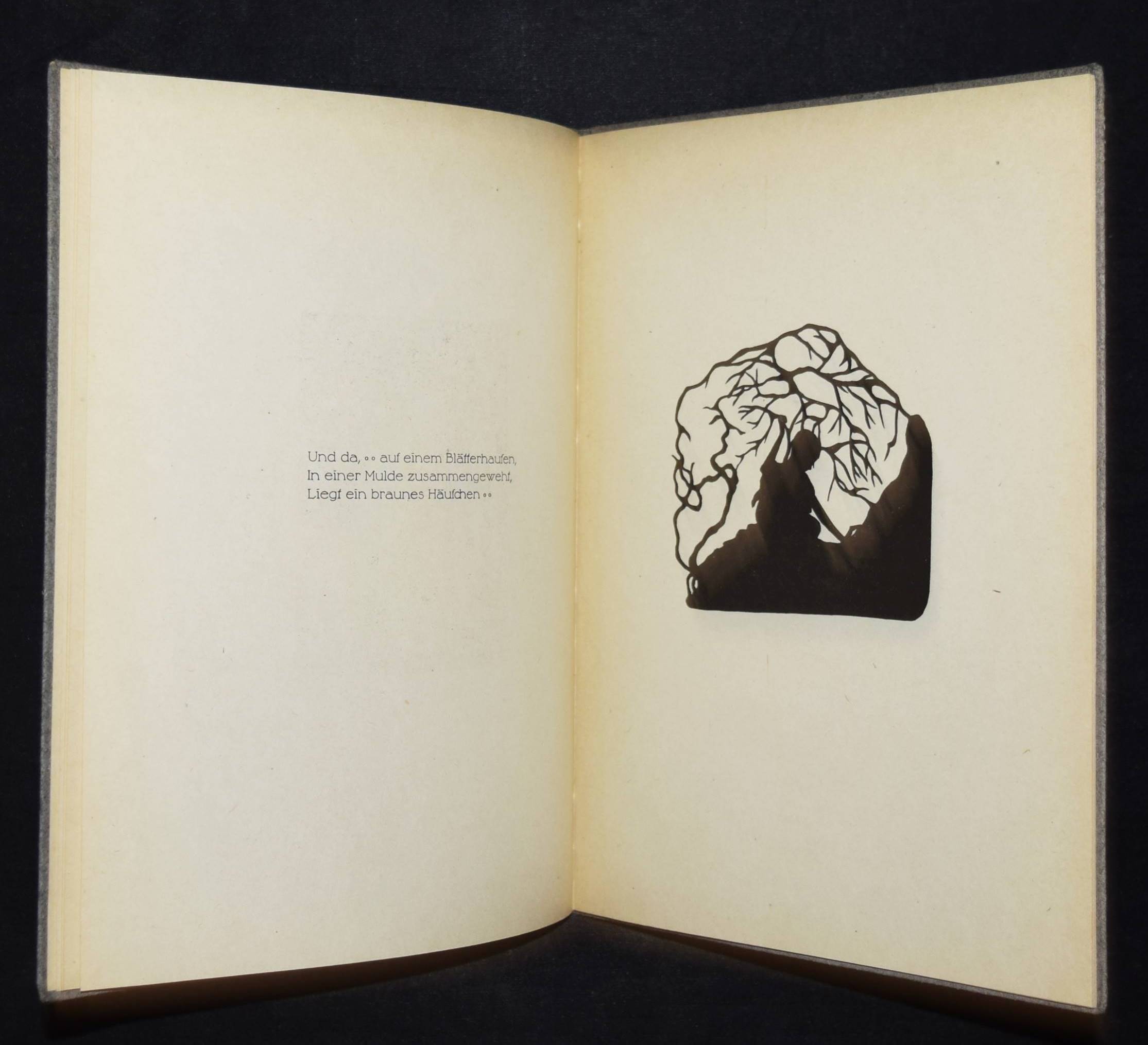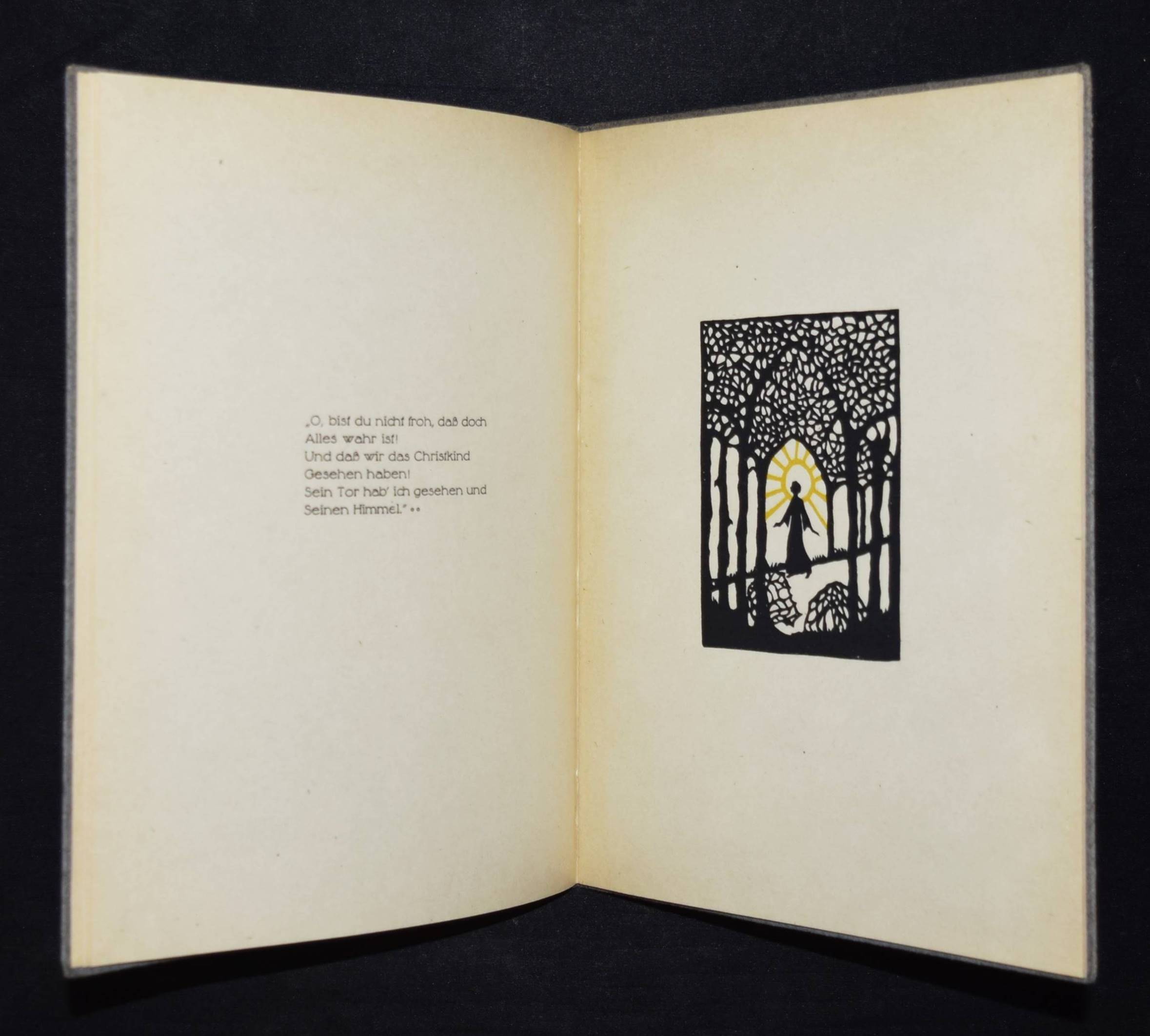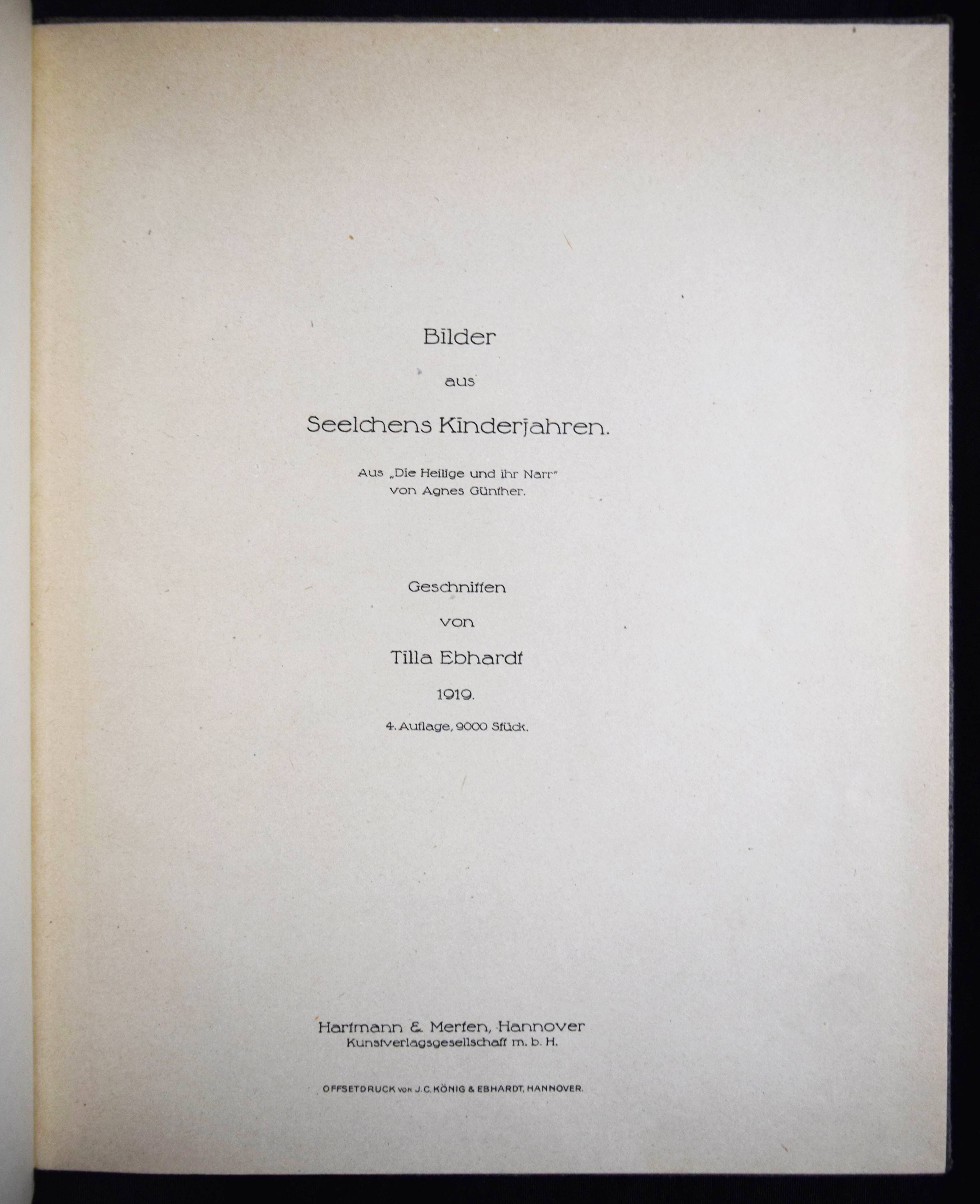 Günther, Agnes. Bilder aus Seelchens Kinderjahren. Aus „Die Heilige und ihr Narr“. Geschnitten von Tilla Ebhardt 1919. 4. Aufl. Hannover, Hartmann & Merten o. J. (um 1920). 4°. [26] S. mit Scherenschnitt-Illustrationen. OPbd. mit goldgepr. Deckelvignette. Weber, Schwarze Kunst im Buch S. 25. – Rücken etwas aufgehellt, sehr gutes Exemplar.