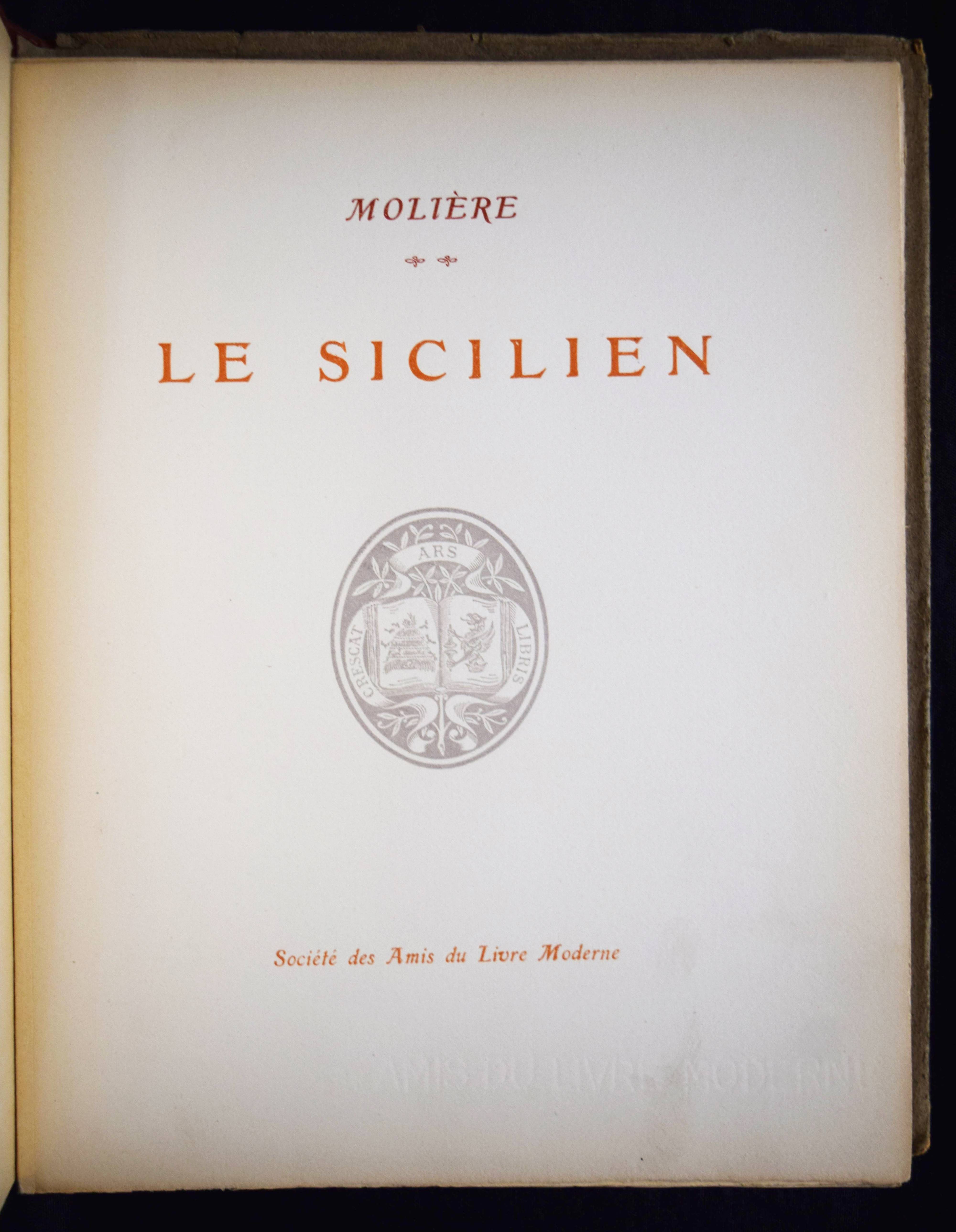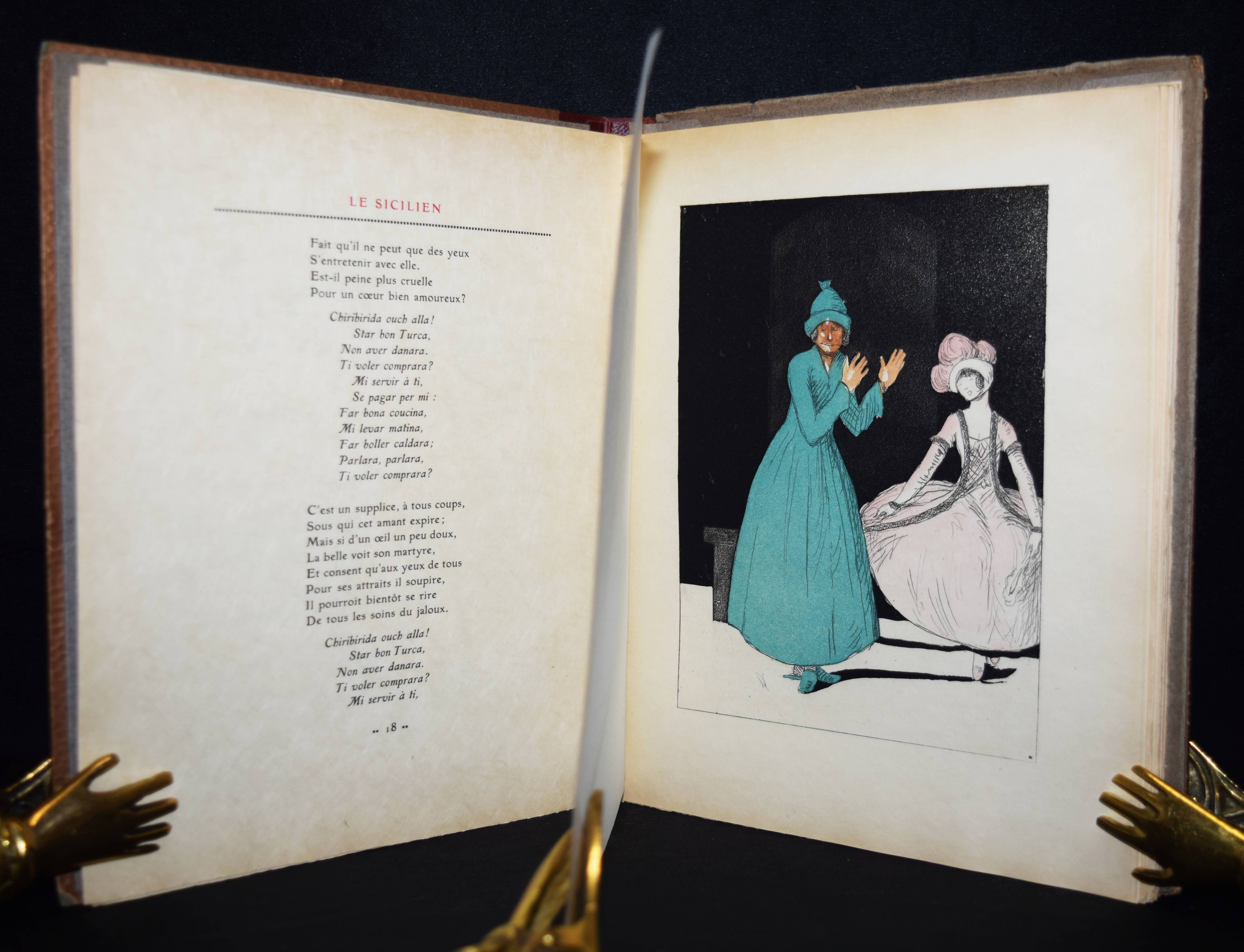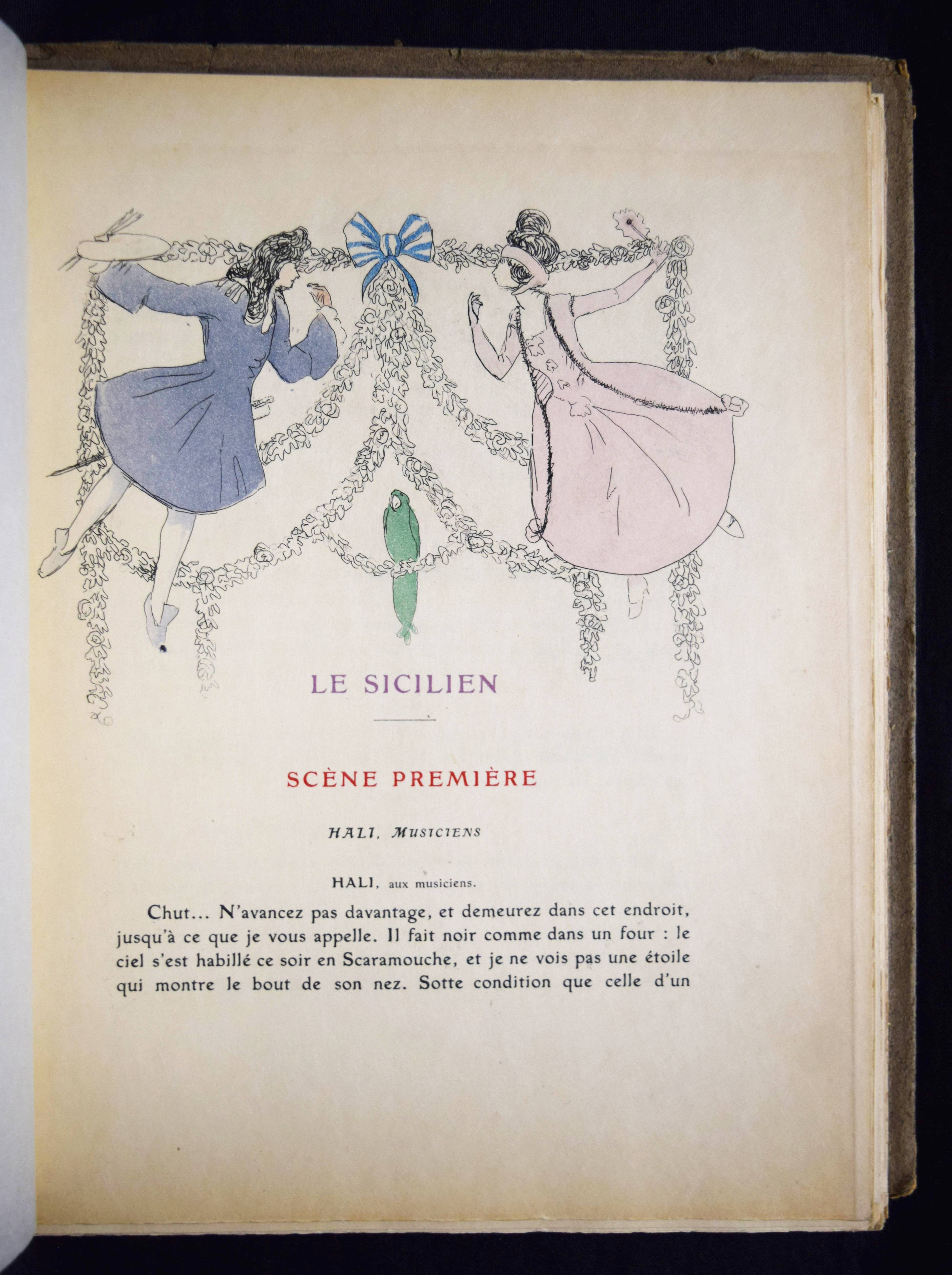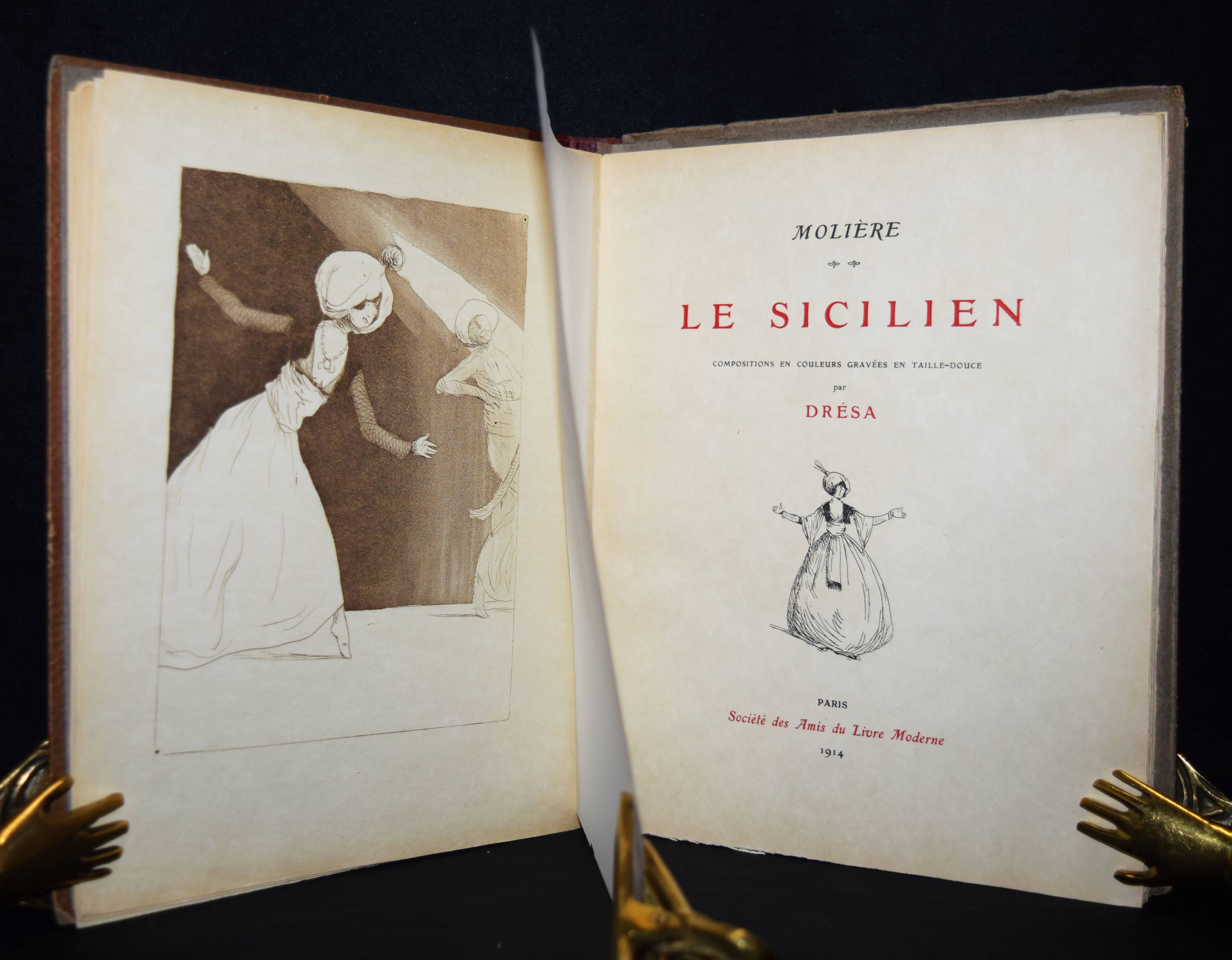 Molière (d. i. Jean-Baptiste Poquelin). Le Sicilien. Compositions en couleurs gravée en taille-douce par (Jacques) Drésa. Paris, Société des amis du livre moderne 1914. 8°. 38 S. u. 6 (5 ganzs.) farb. Aquatinta-Radierungen in jeweils 4 versch. Abzügen. Lose Bogen in OHln.-Flügelmappe mit goldgepr. Rückentitel. Monod 8294. – Eines von 125 Exemplaren (No. 10) für die Mitglieder der Société des amis du livre moderne auf Japan-Imperiale (GA 150 Exemplare). Mit der Suite der Radierungen in jeweils vier verschiedenen Zuständen. – J. Drésa (1869-1929), Professor an der Ecole des Beaux-Arts in Paris, arbeitete auch als Kostümdesigner und Bühnenbildner für das Théatre des Arts. „Einer der elegantesten und geschmackvollsten Zeichner des zeitgenössischen Paris“ (Thieme/Becker). – Rücken etwas aufgehellt, Deckel und Kanten etwas berieben, Schließbänder fehlen, sonst gut erhalten.